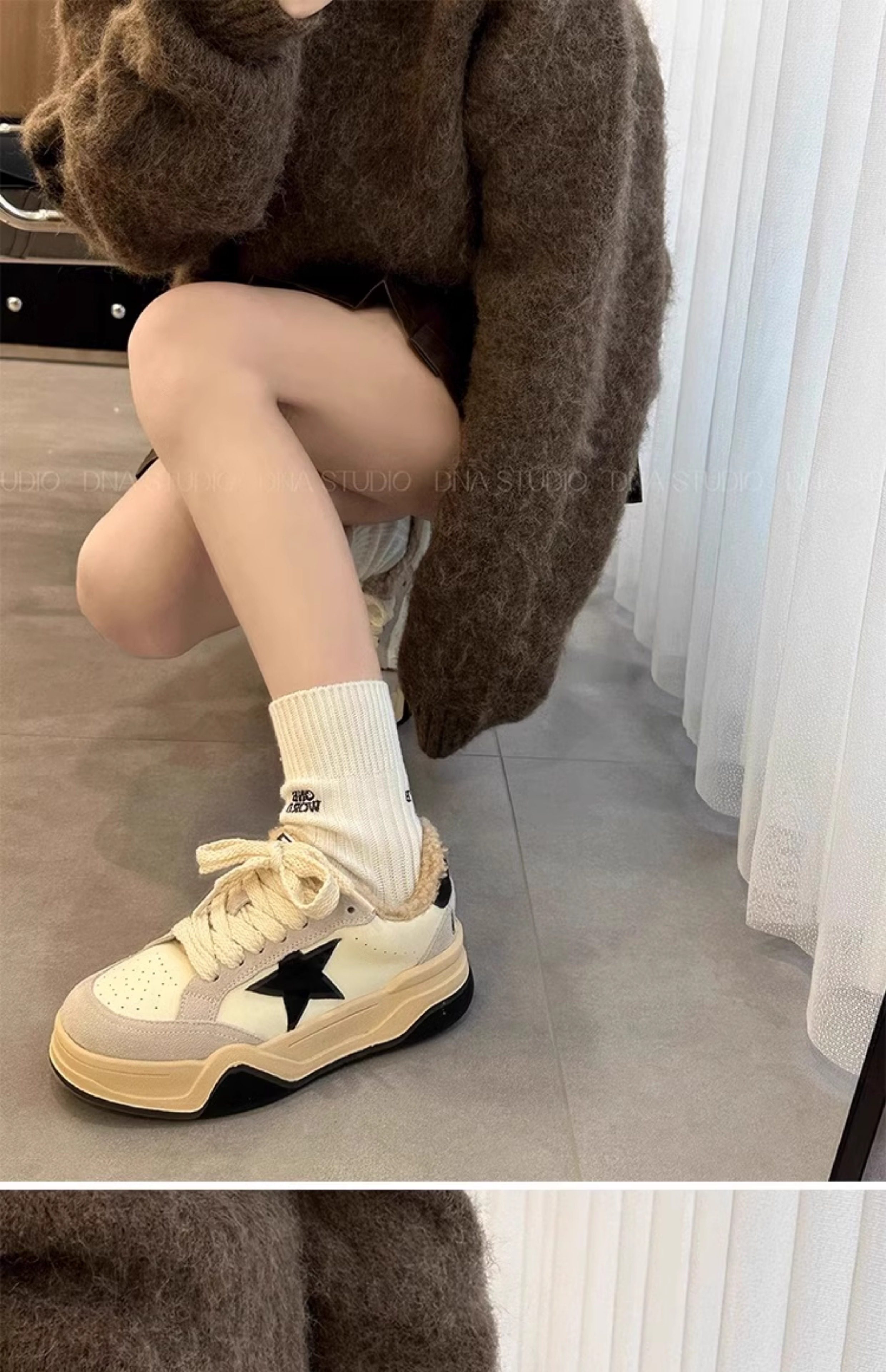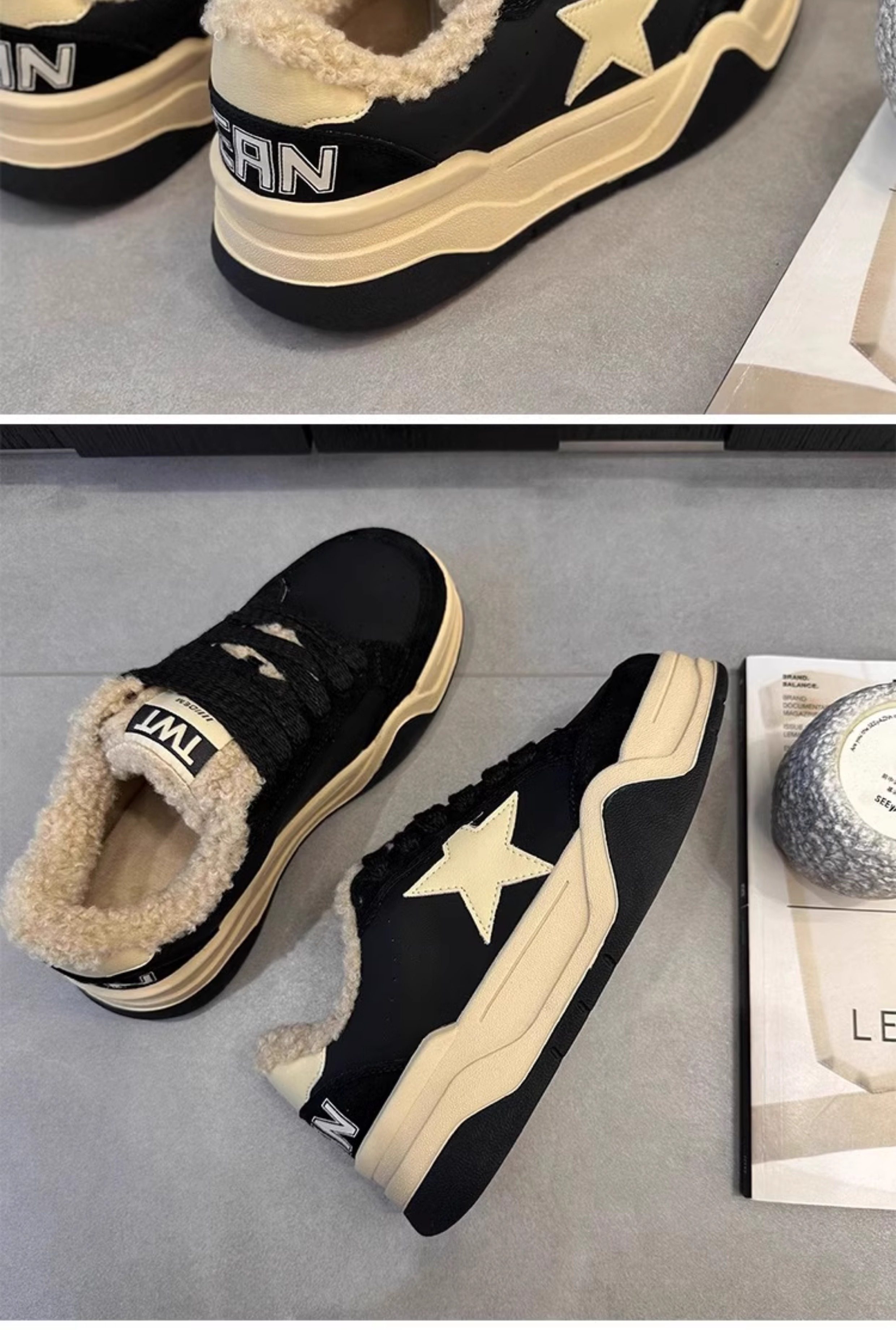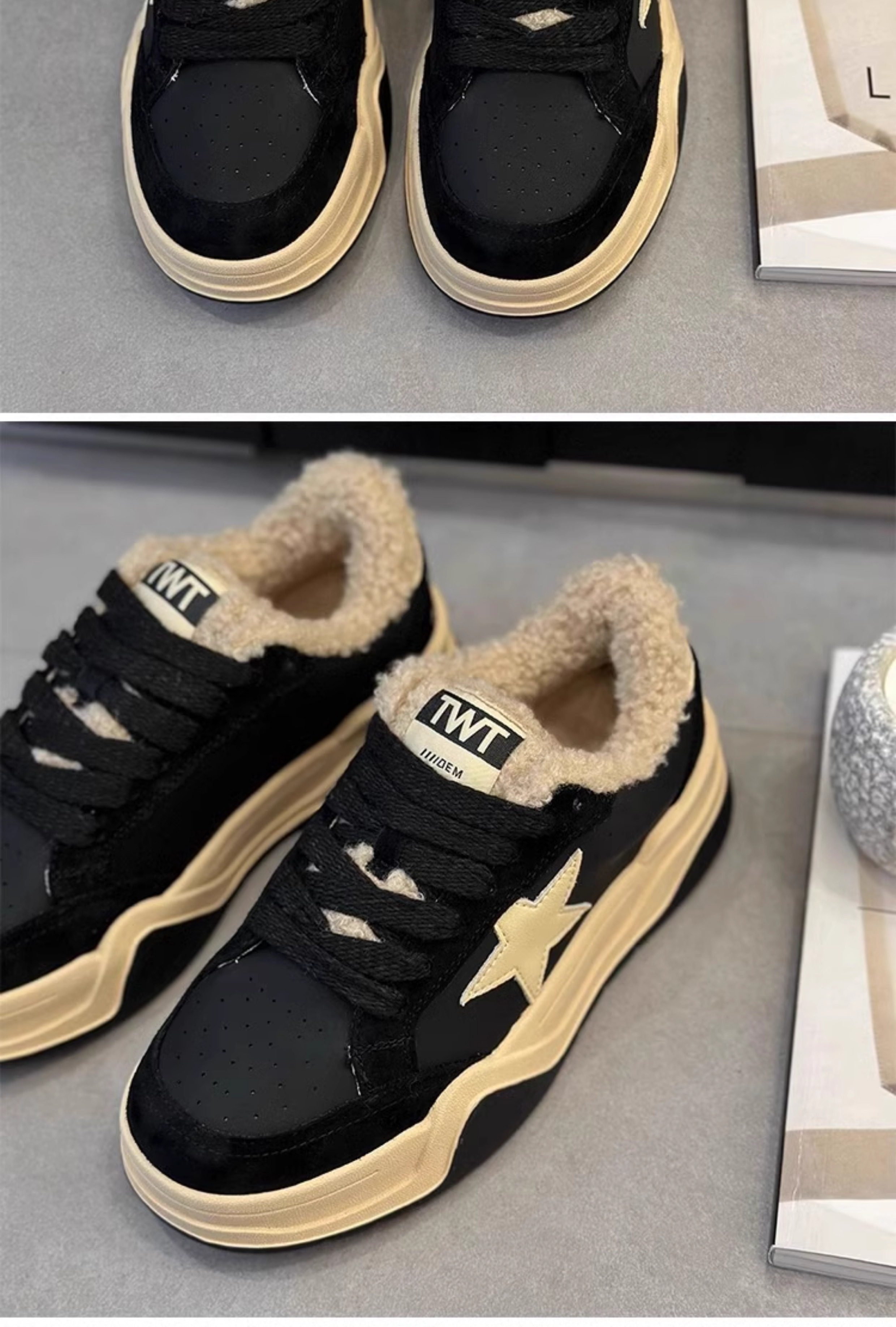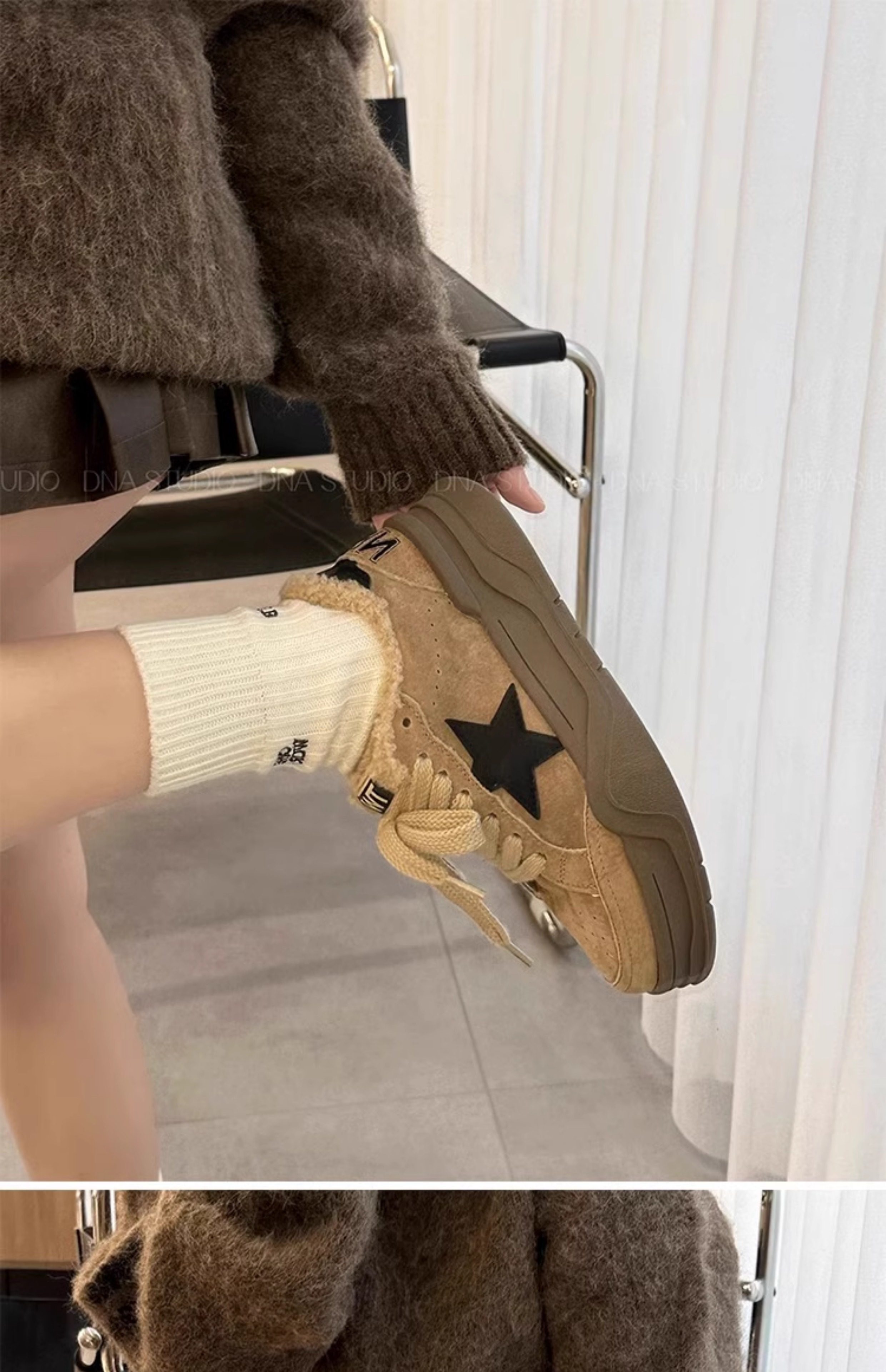 Hong Kong Thick-Soled Genuine Leather Plush Star Shoes for Women 2025 Winter Casual Sports Shoes Lace-Up Warm Sneakers Cotton Shoes for Women