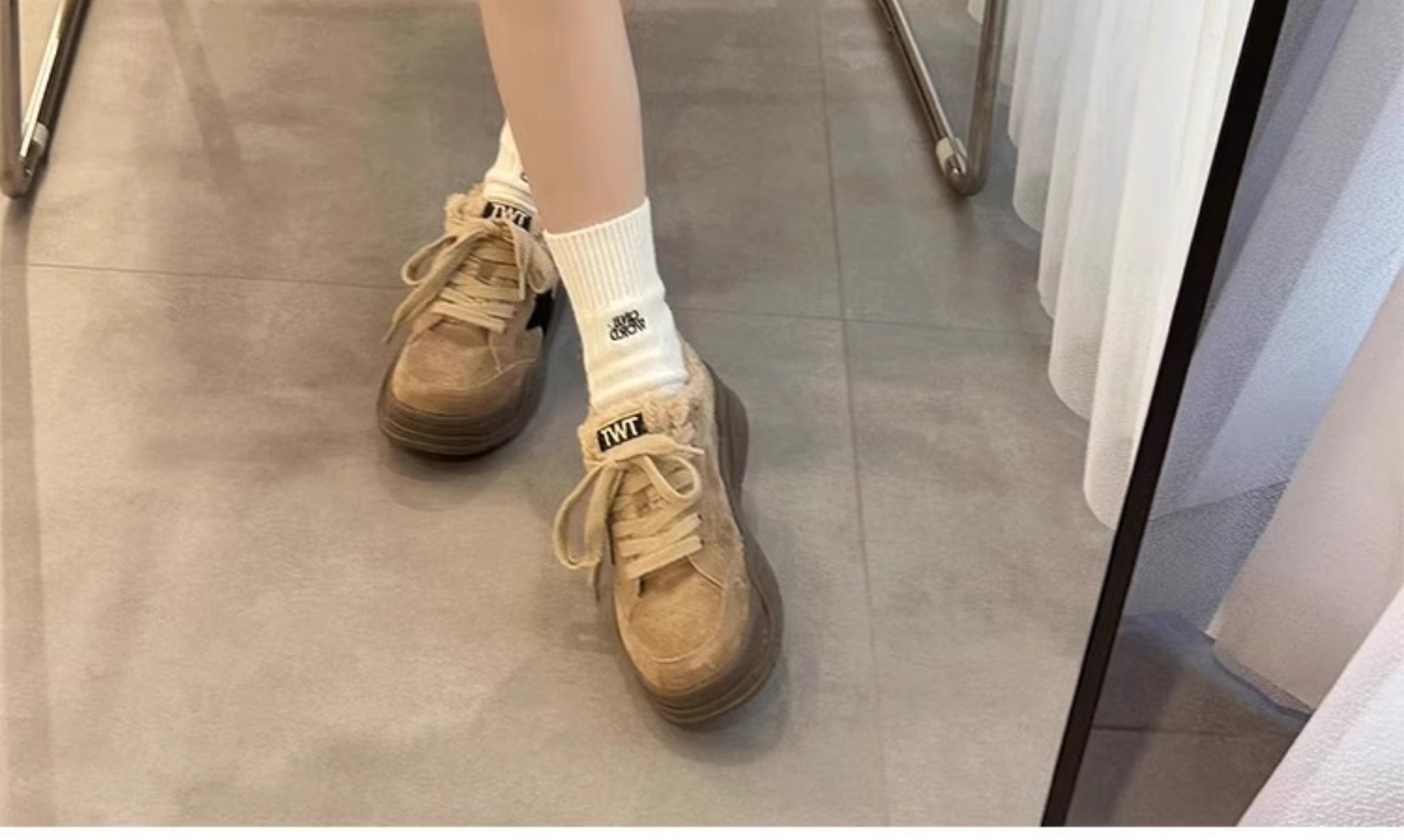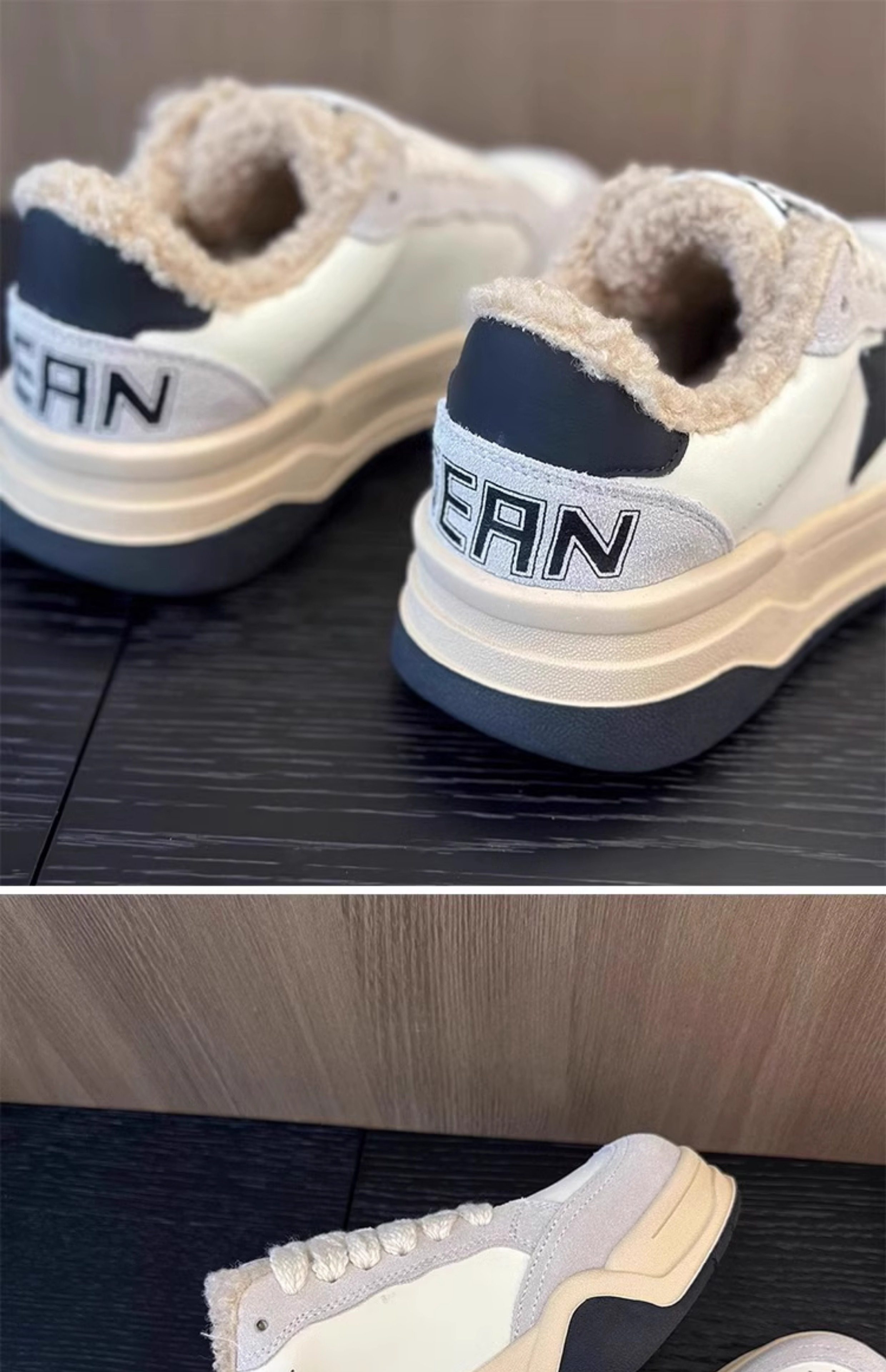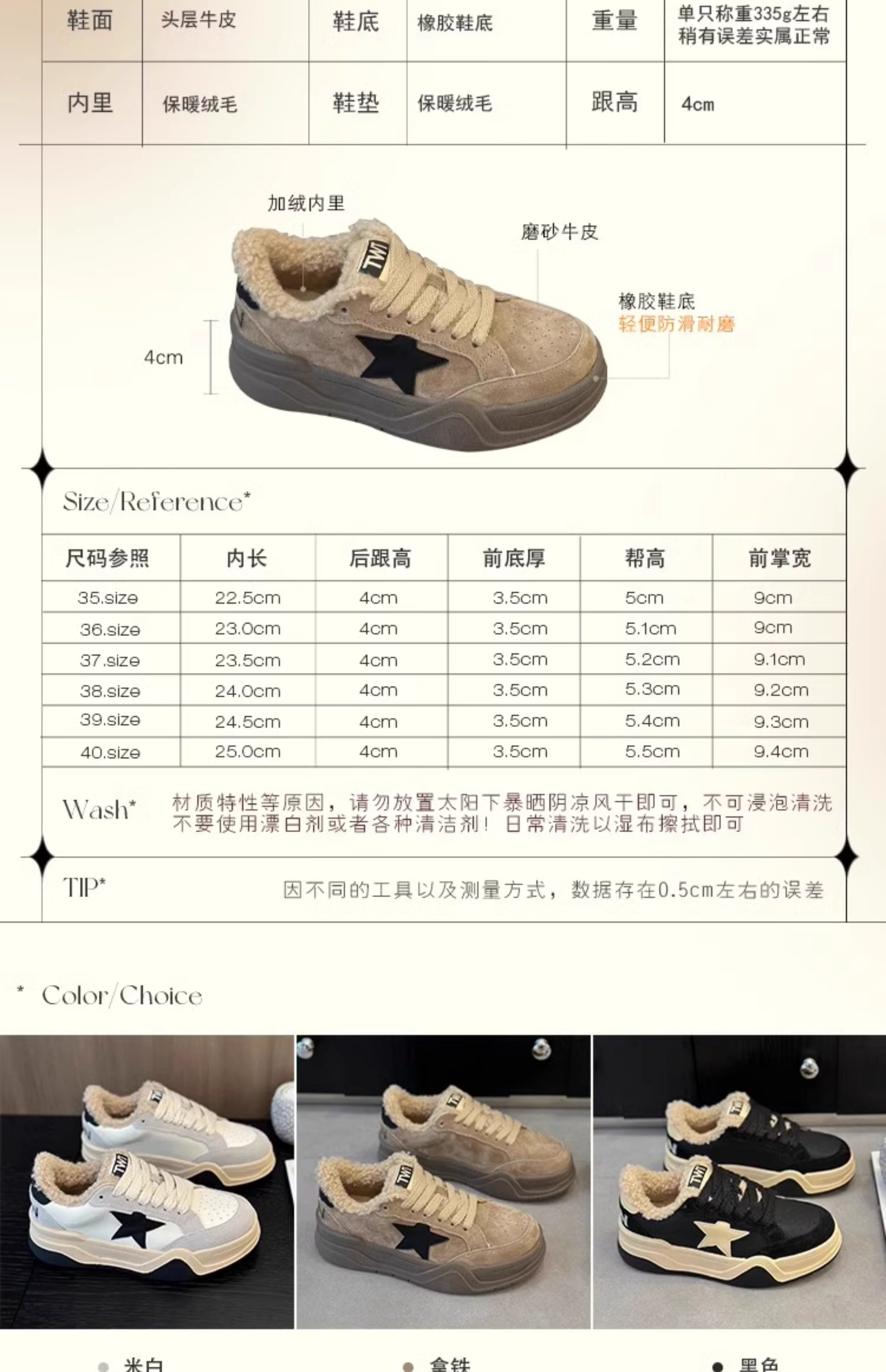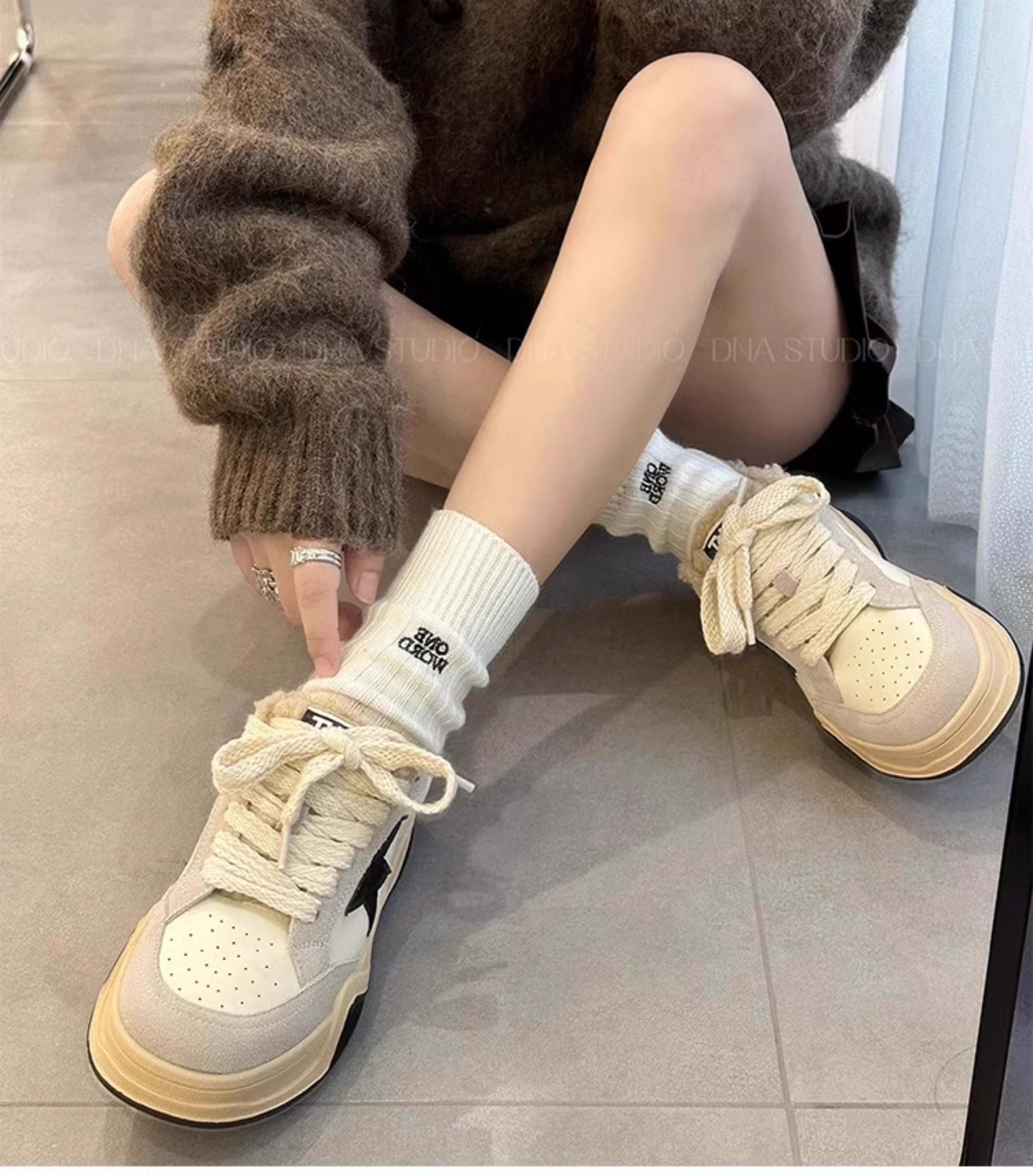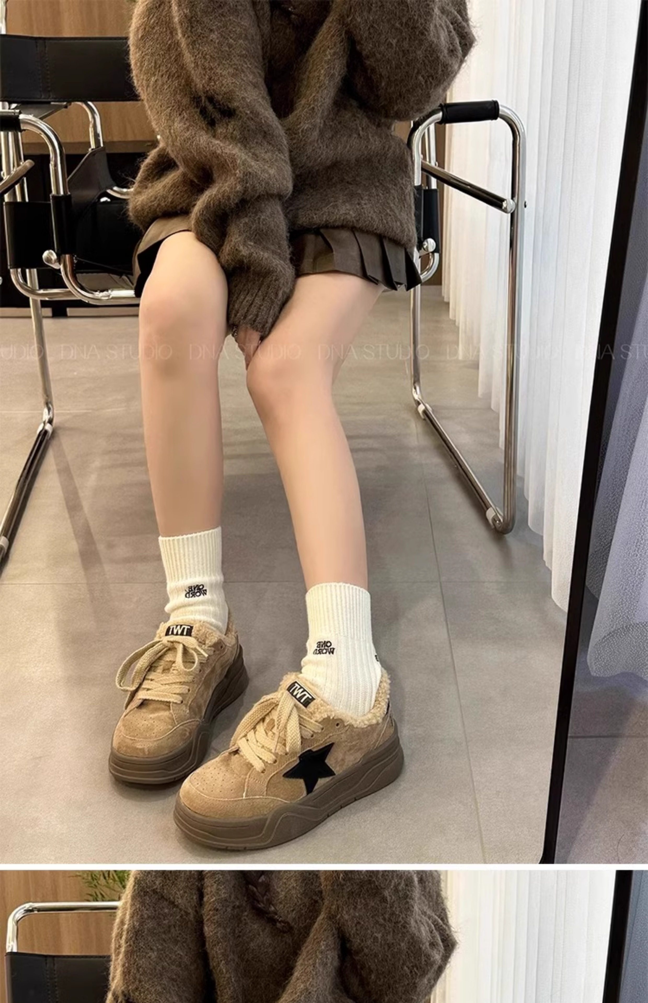 Hong Kong Thick-Soled Genuine Leather Plush Star Shoes for Women 2025 Winter Casual Sports Shoes Lace-Up Warm Sneakers Cotton Shoes for Women