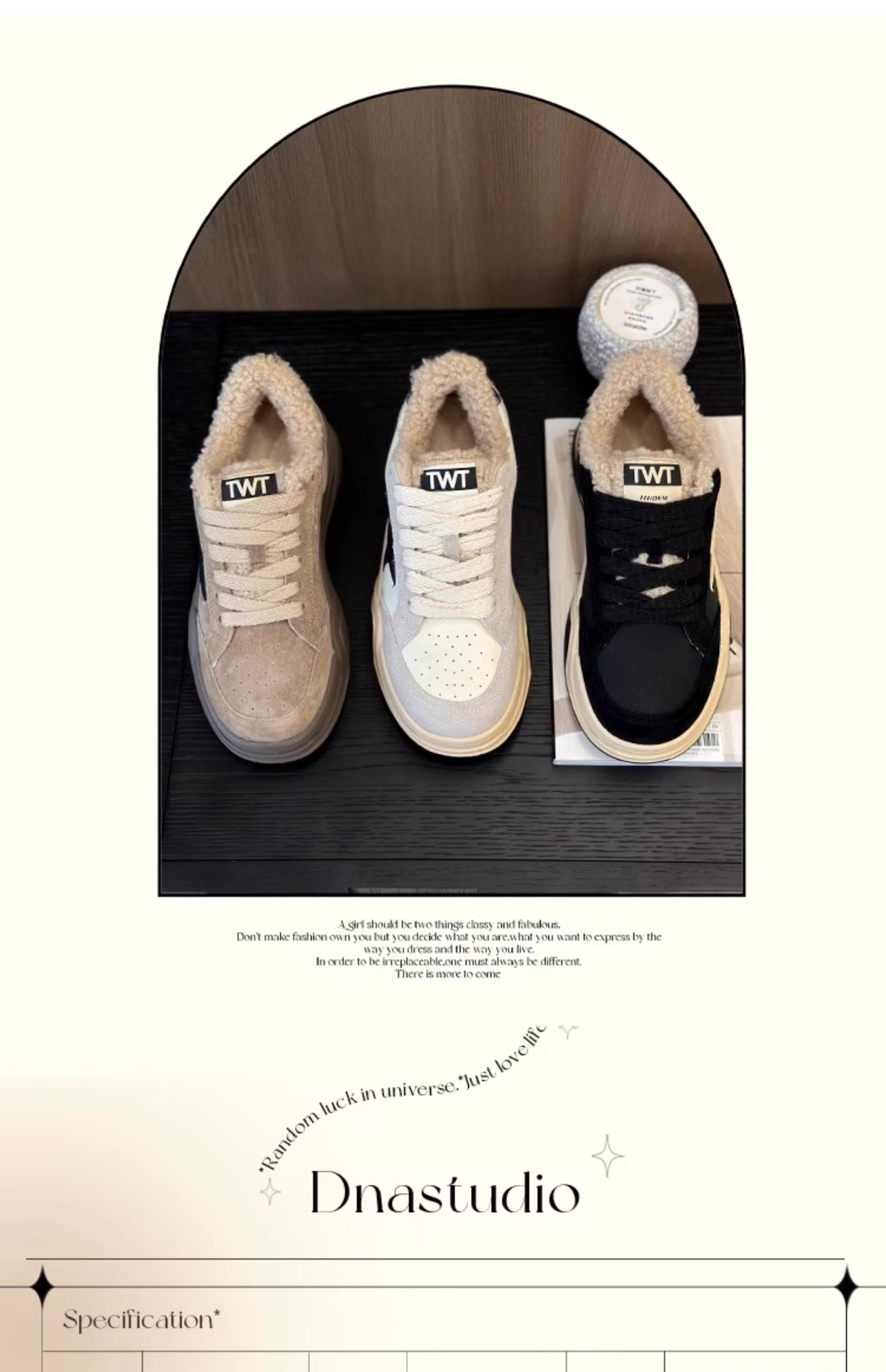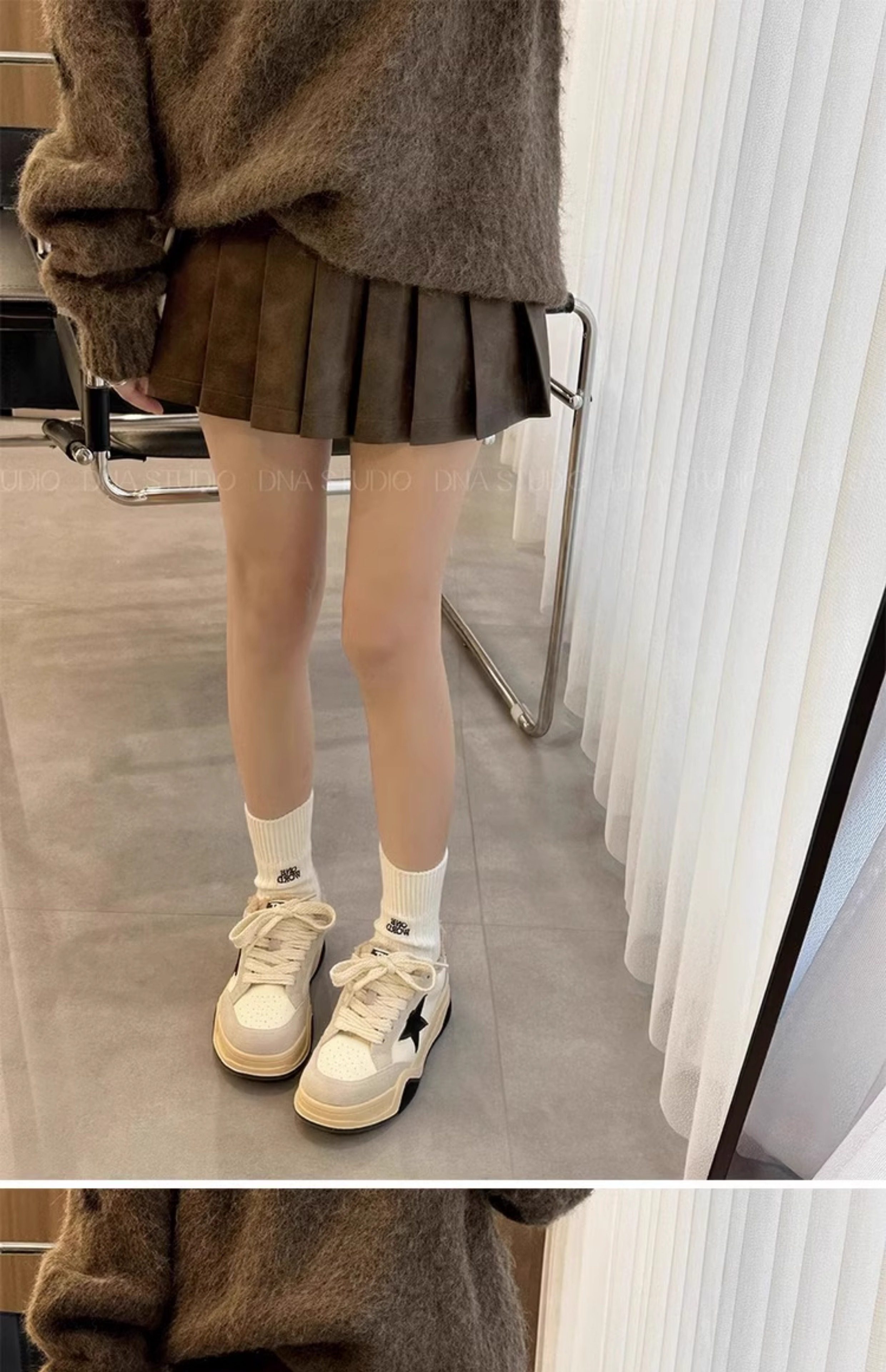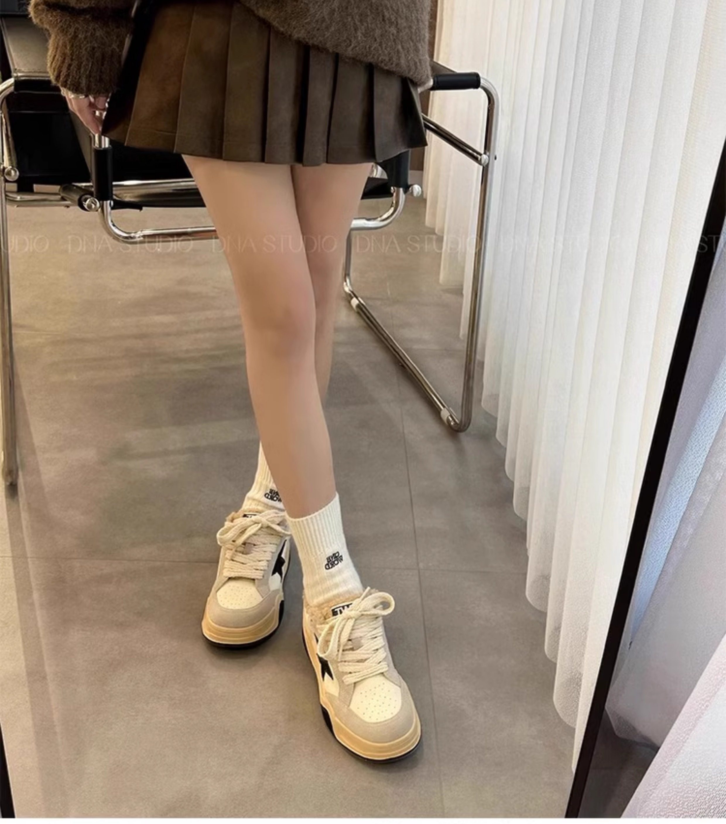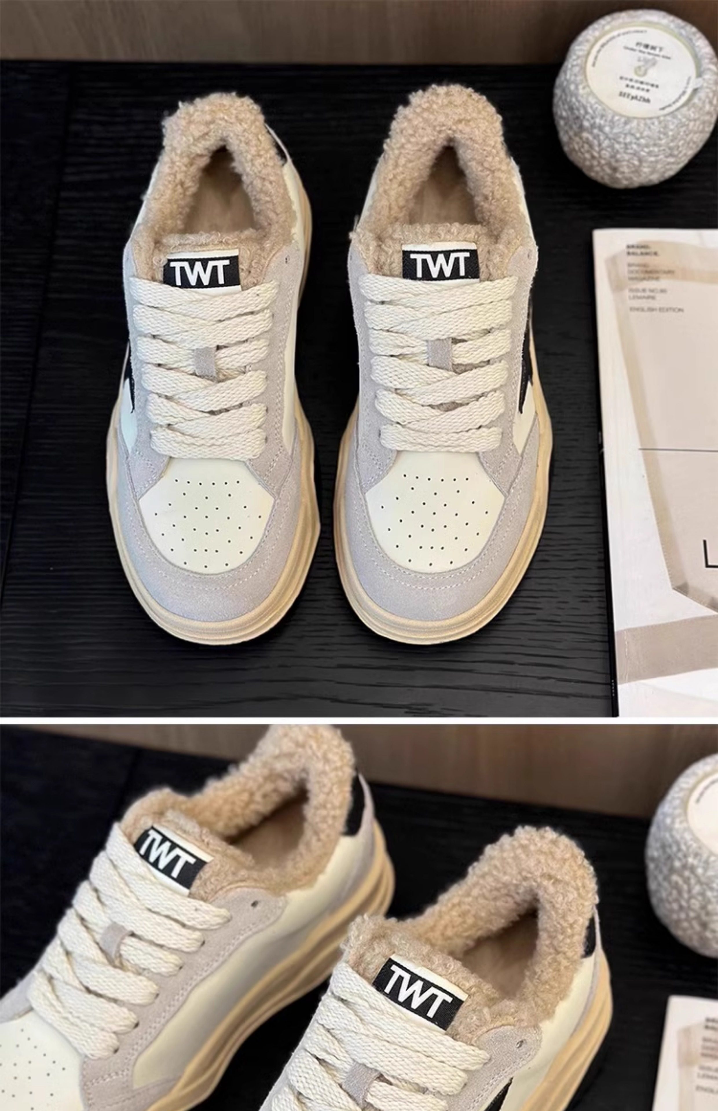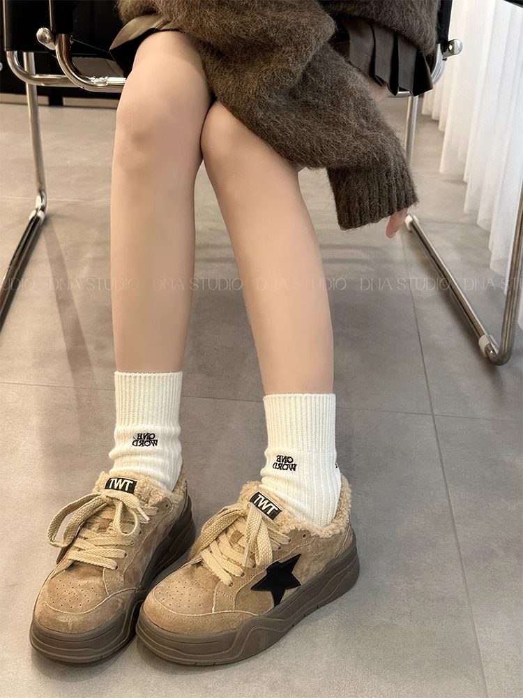 Hong Kong Thick-Soled Genuine Leather Plush Star Shoes for Women 2025 Winter Casual Sports Shoes Lace-Up Warm Sneakers Cotton Shoes for Women