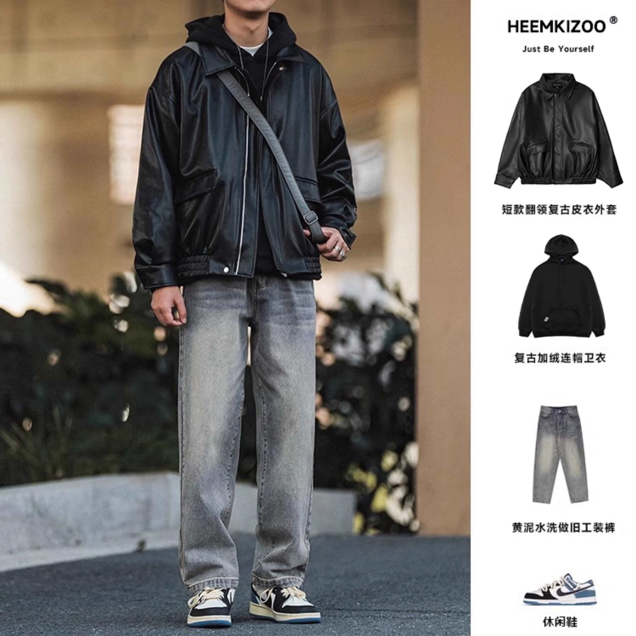 Heyma Qizuo American-Style Lapel Leather Short Jacket, Retro Spring and Autumn Style, Unisex Casual Melard Motorcycle Jacket