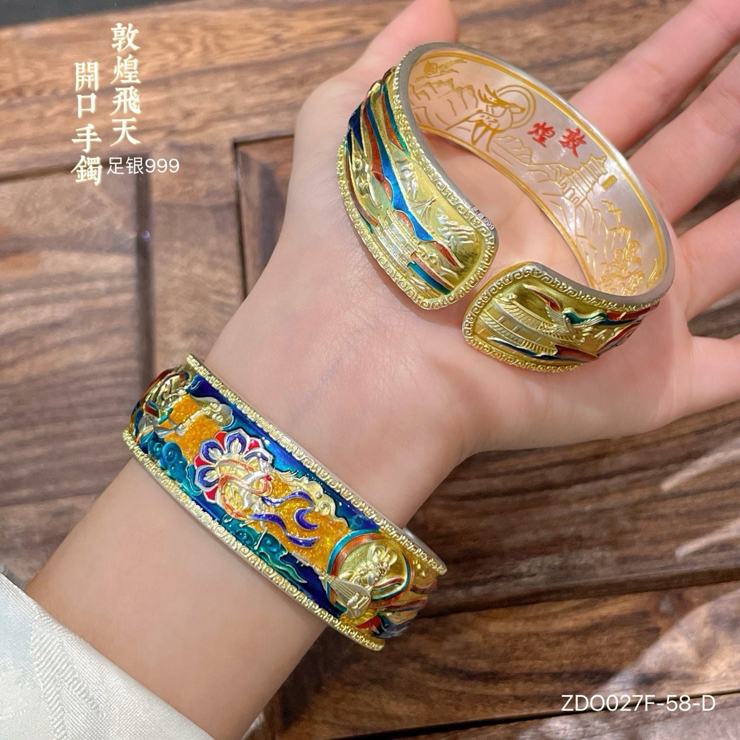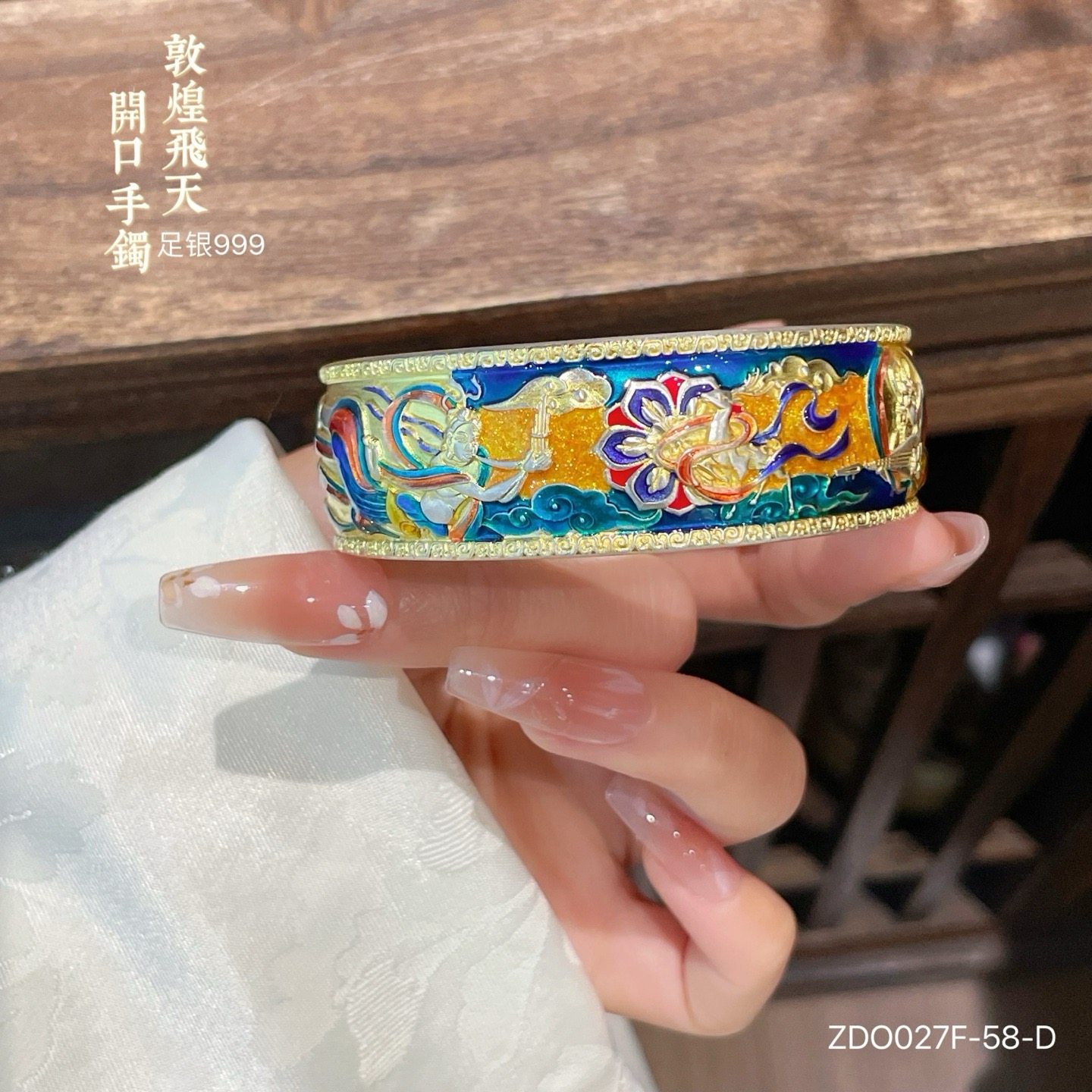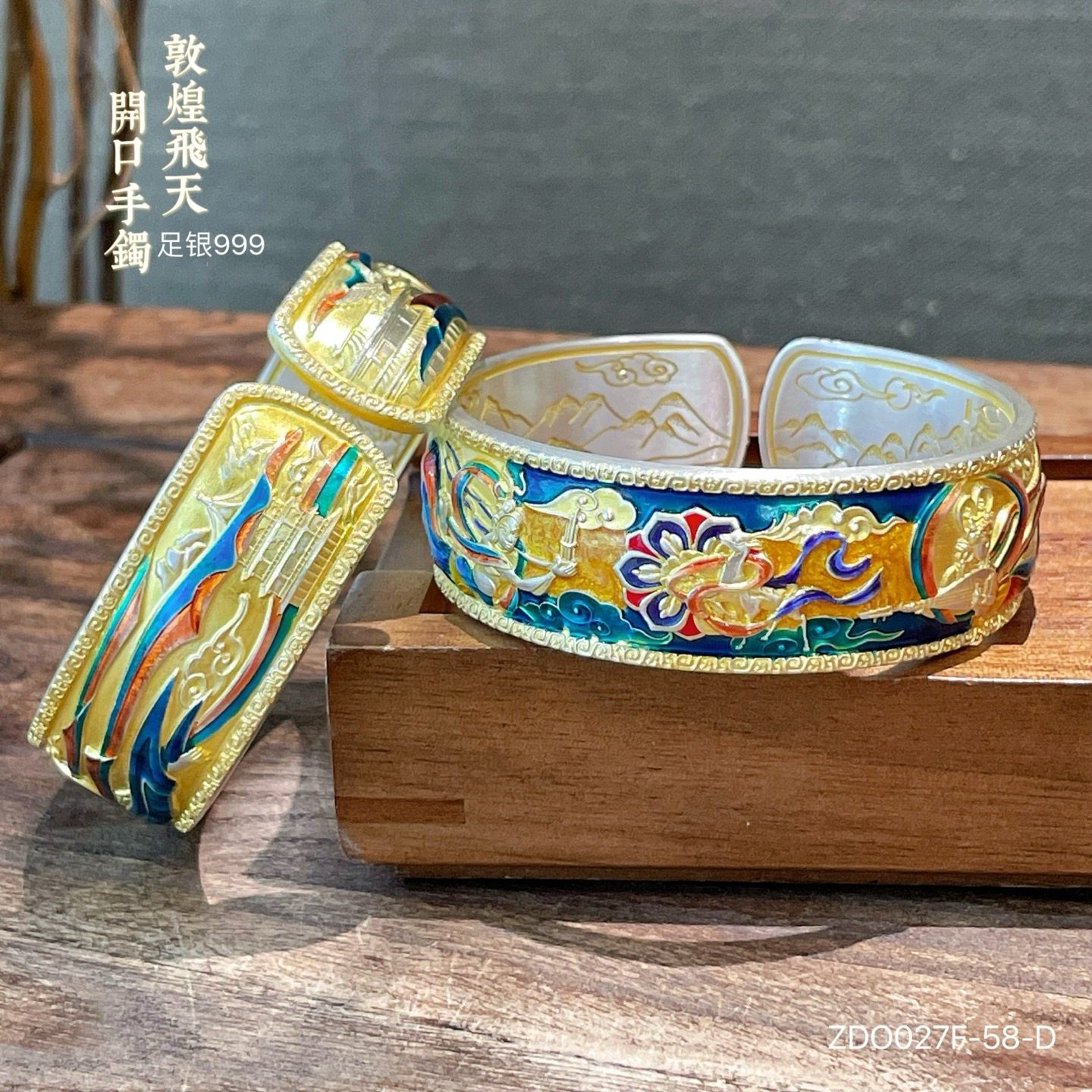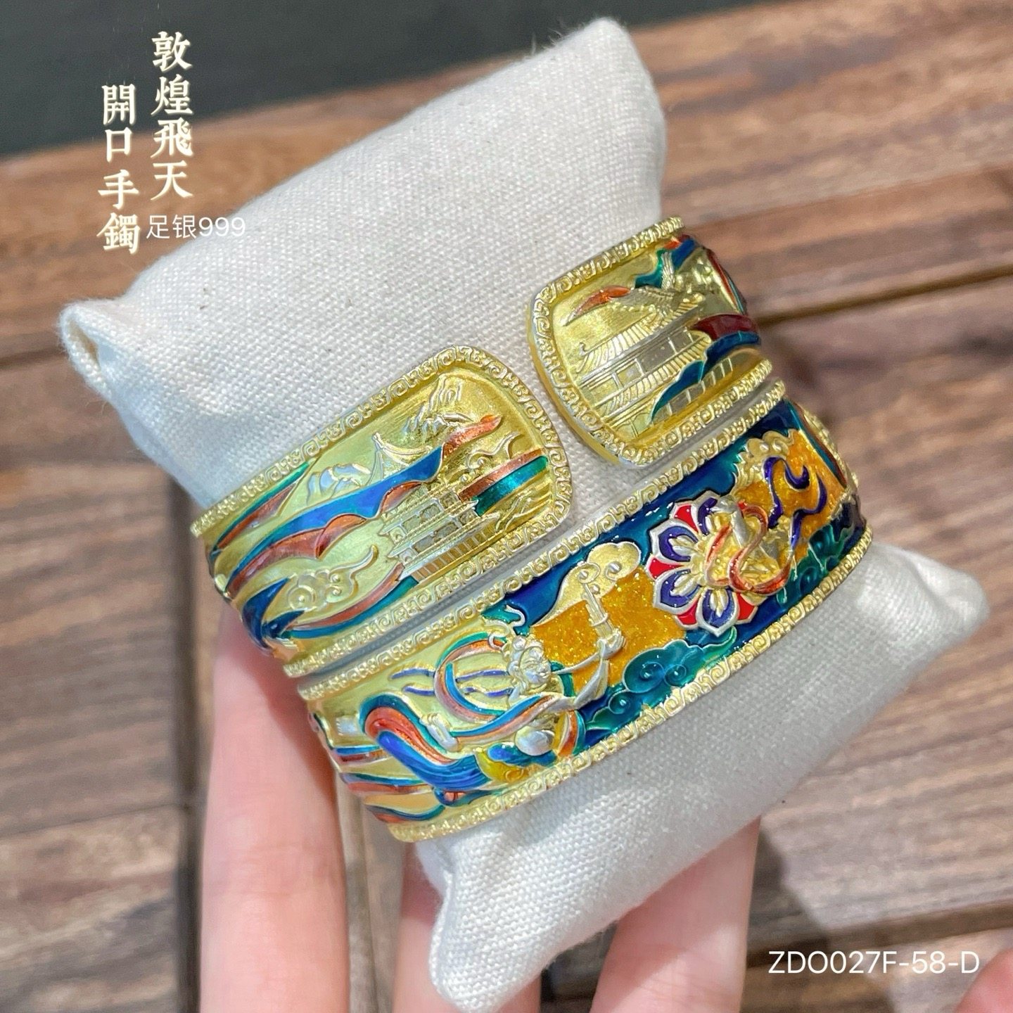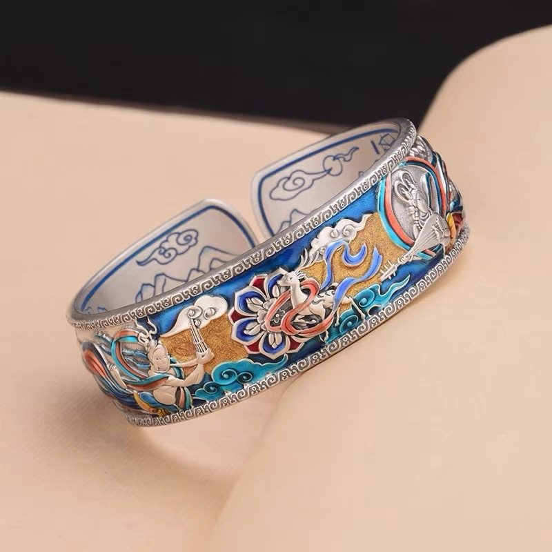 Dunhuang Flying Goddess 9999 Pure Silver Gold-Plated Enamel Open Bracelet for Women, New Chinese Style National Style Bracelet