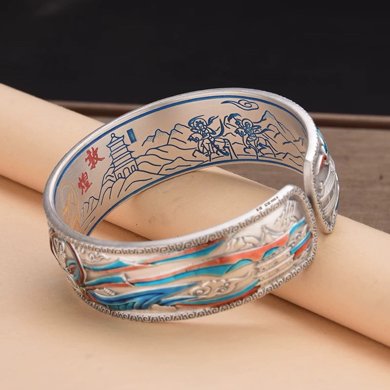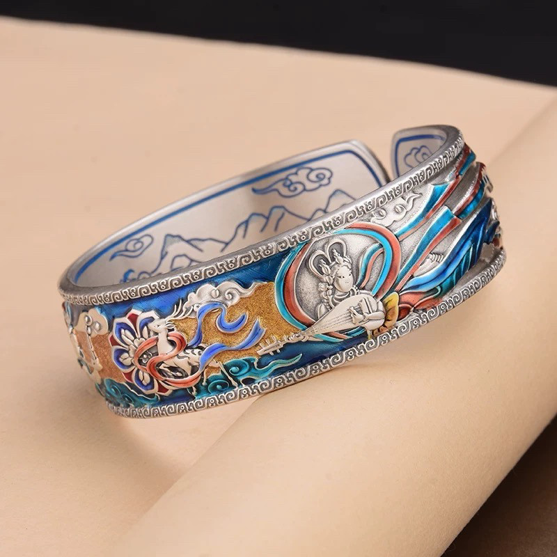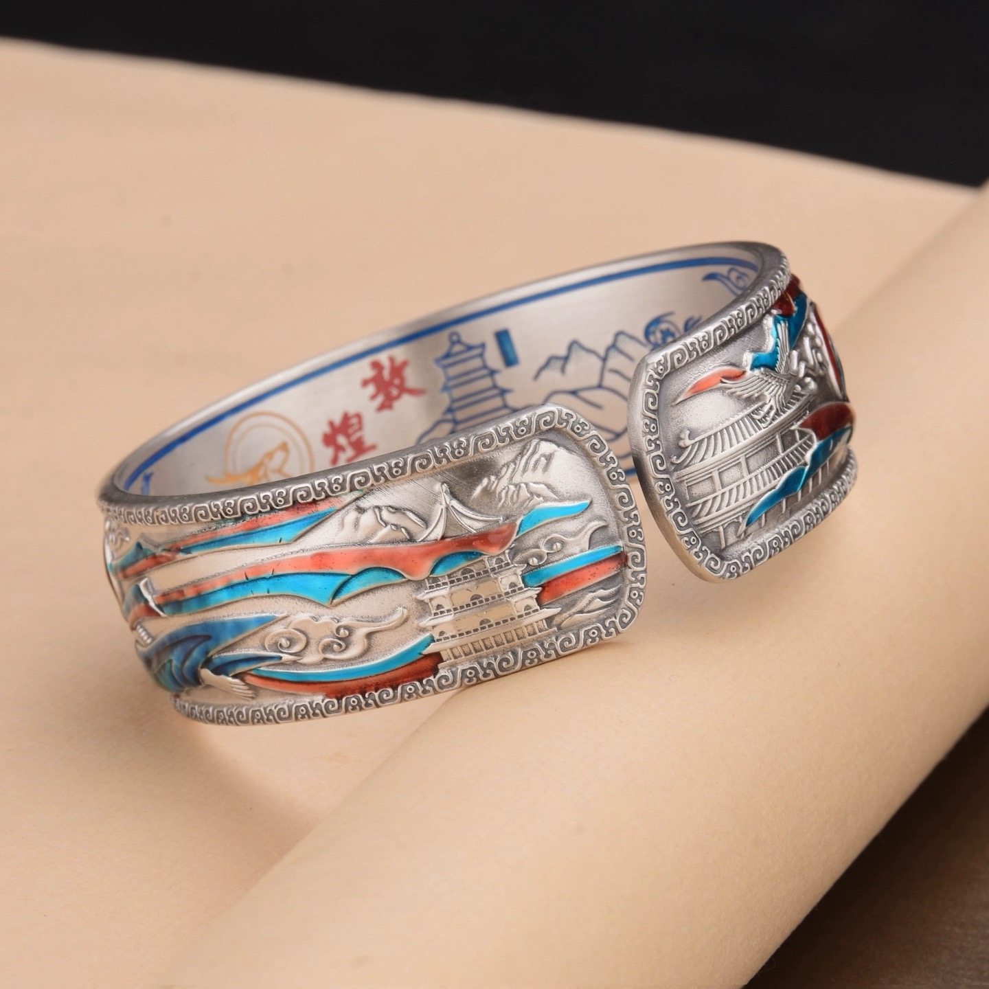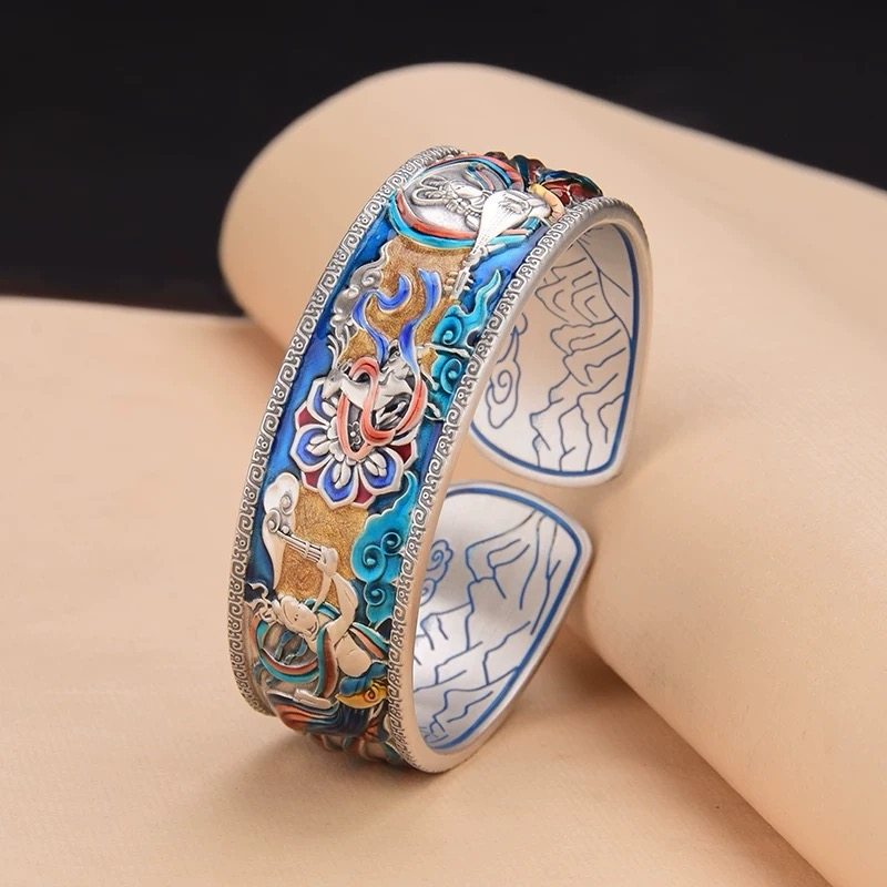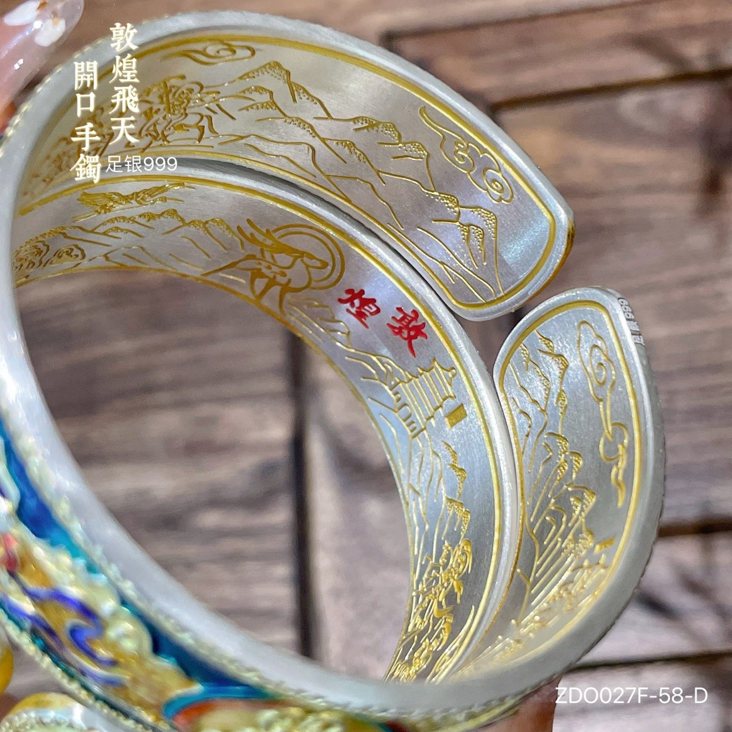 Dunhuang Flying Goddess 9999 Pure Silver Gold-Plated Enamel Open Bracelet for Women, New Chinese Style National Style Bracelet