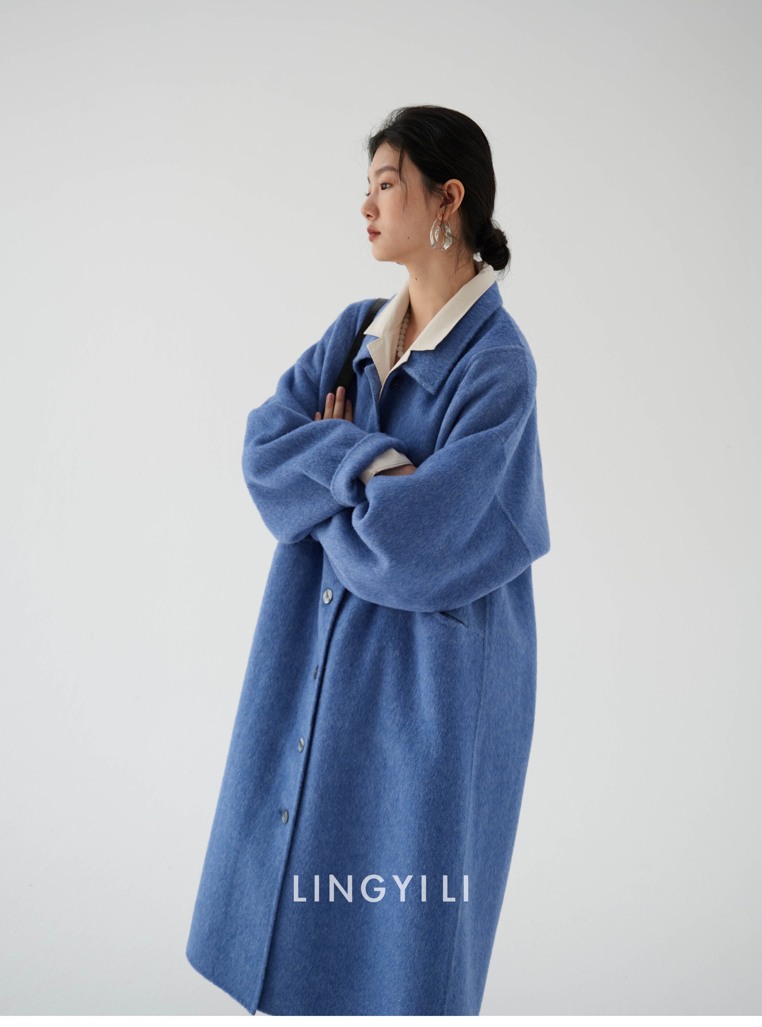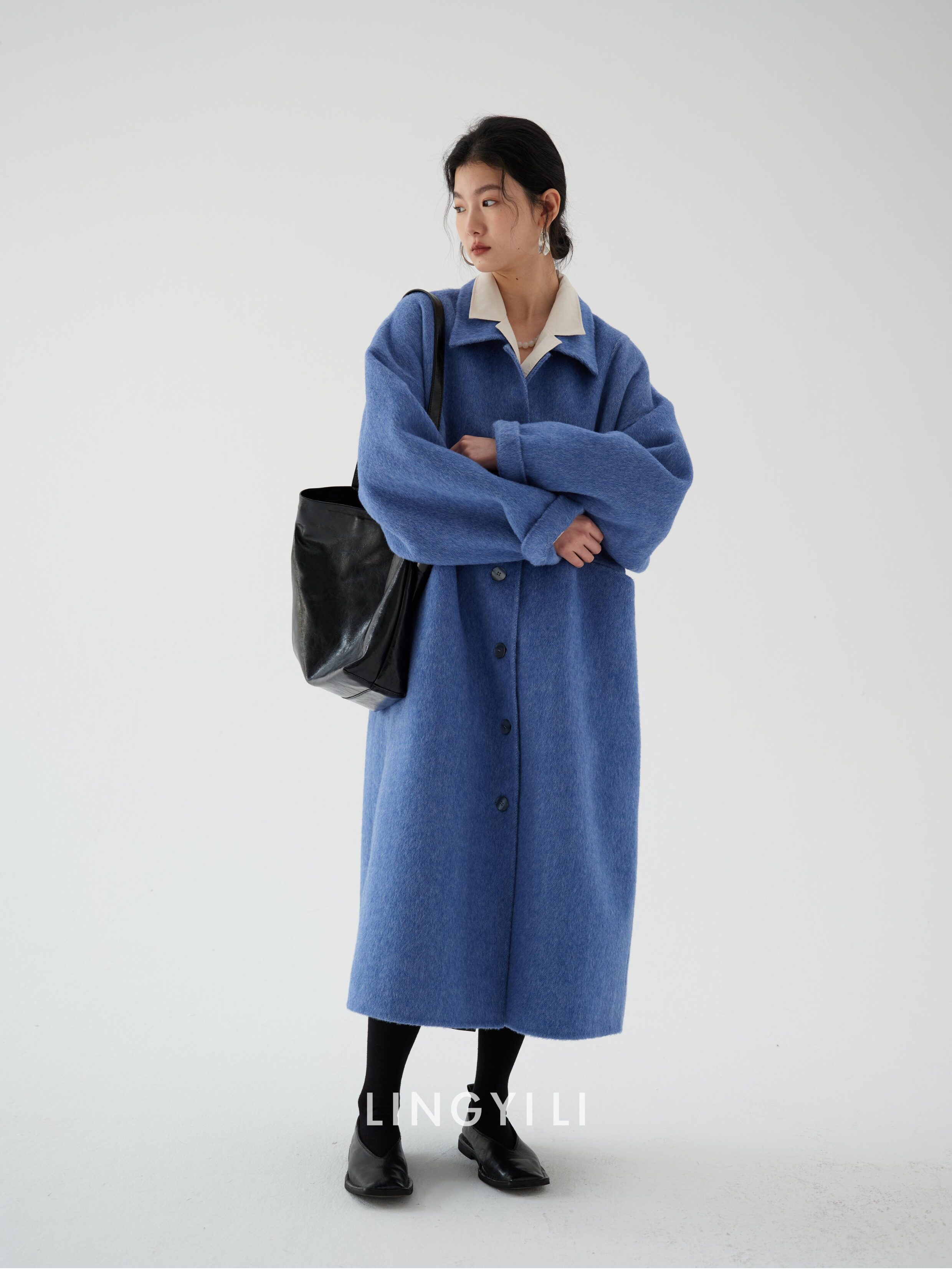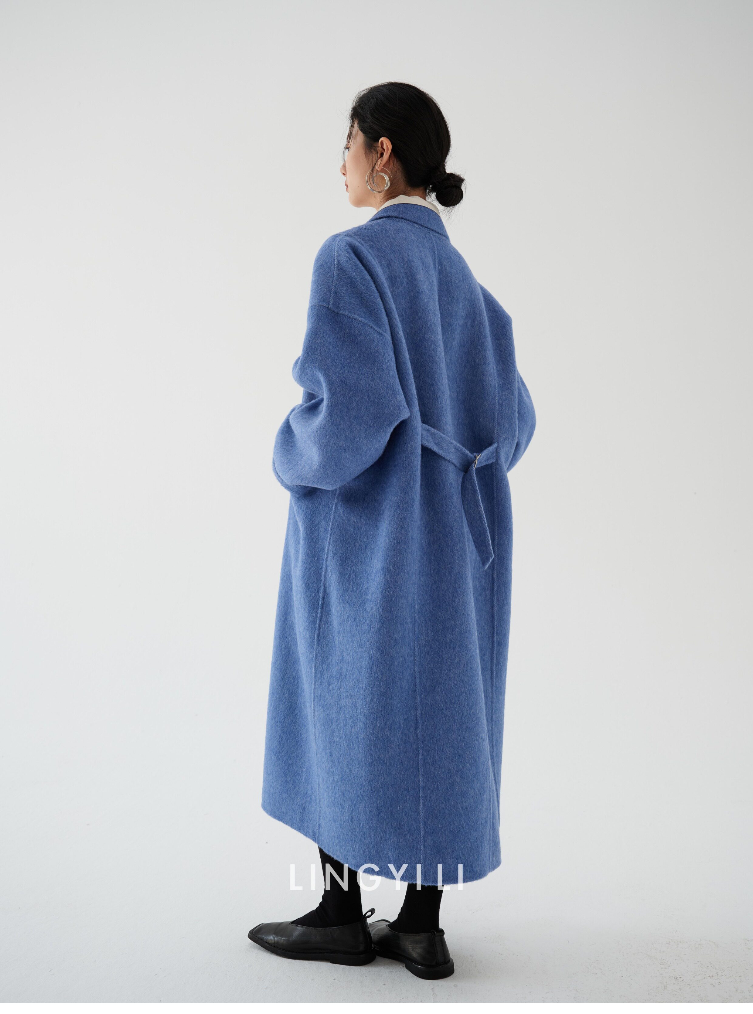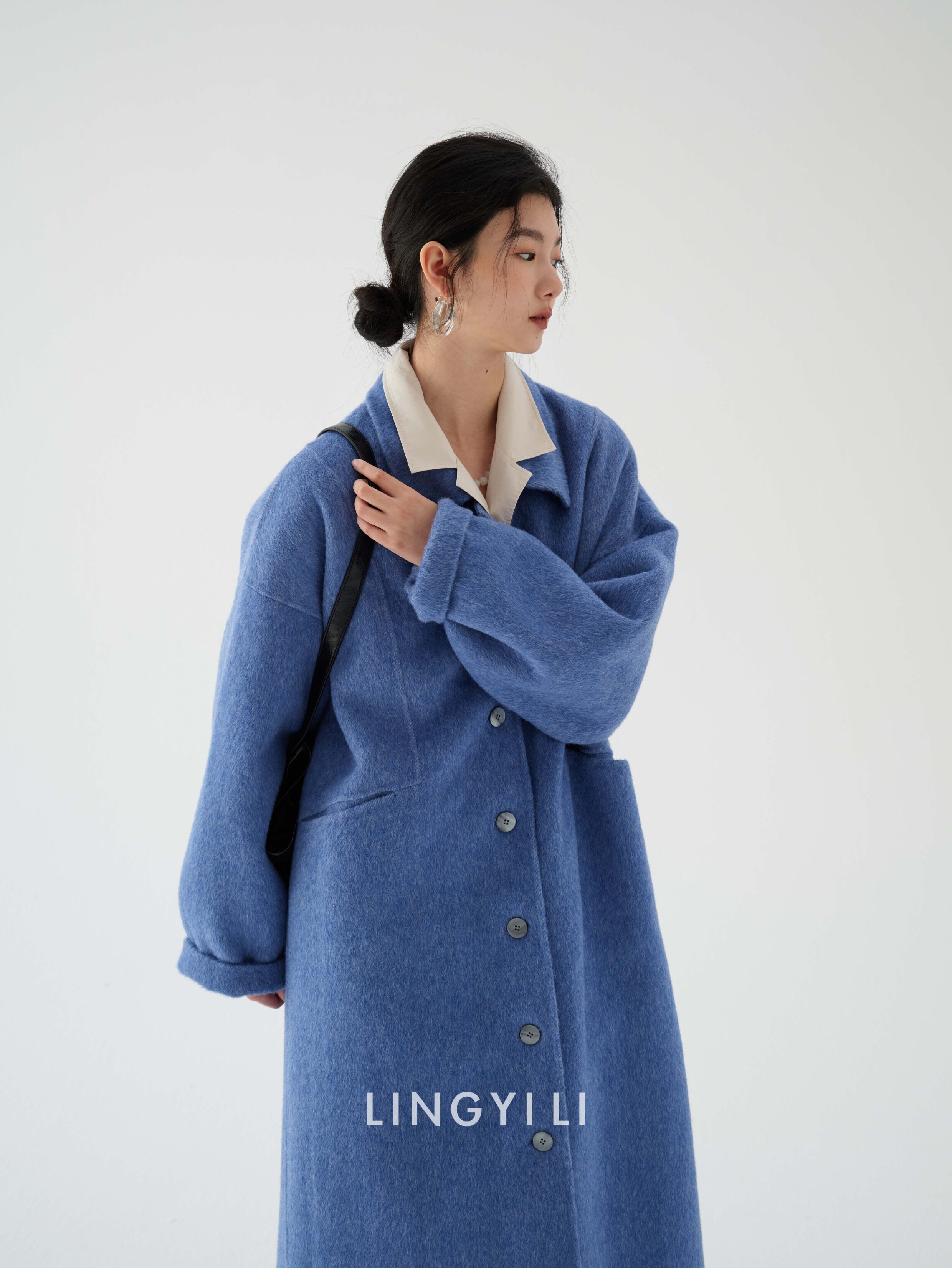Lingyili Winter Series Sea Blue Silk Rabbit Wool Blend Double-Sided Nylon Long Coat