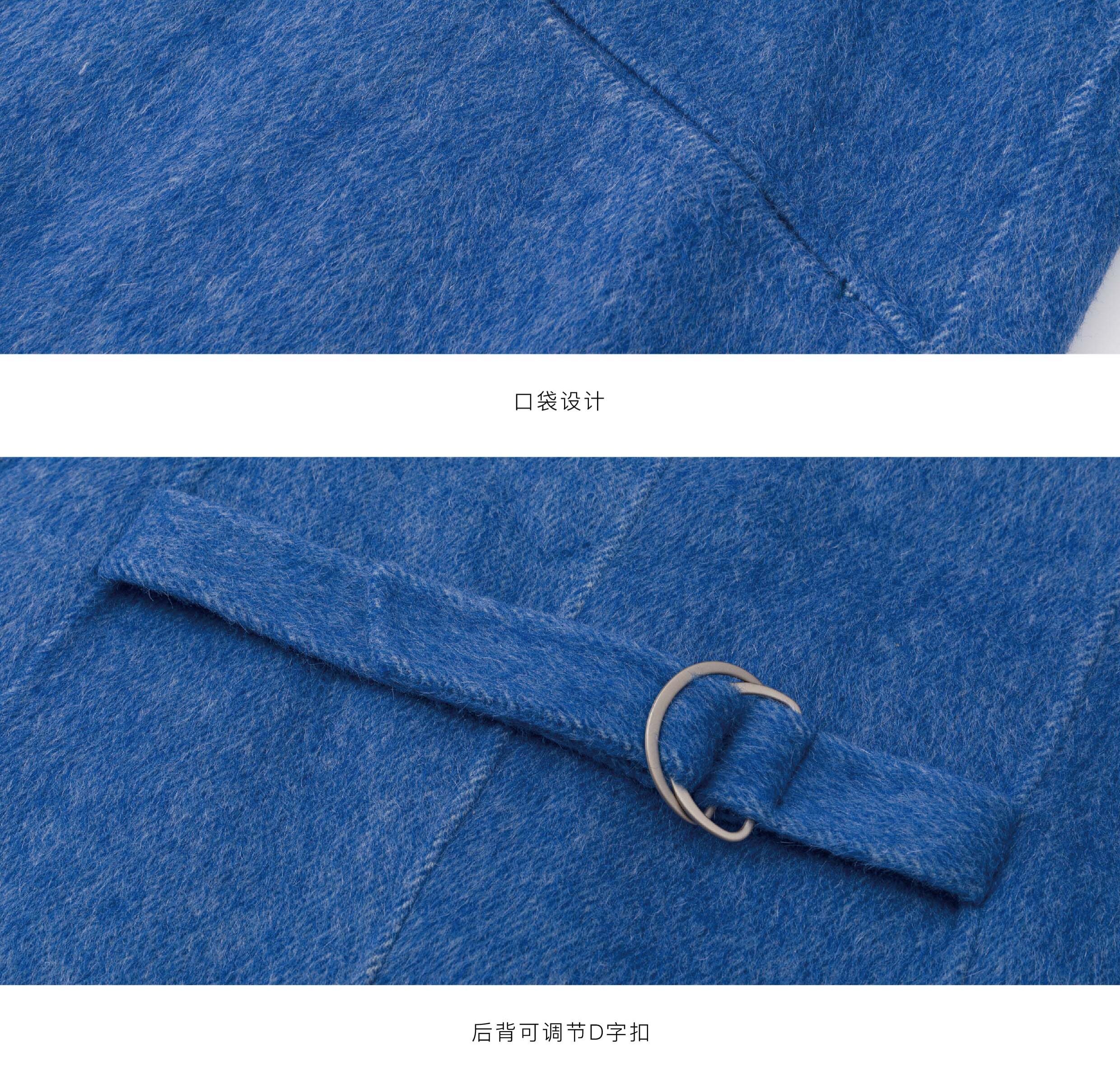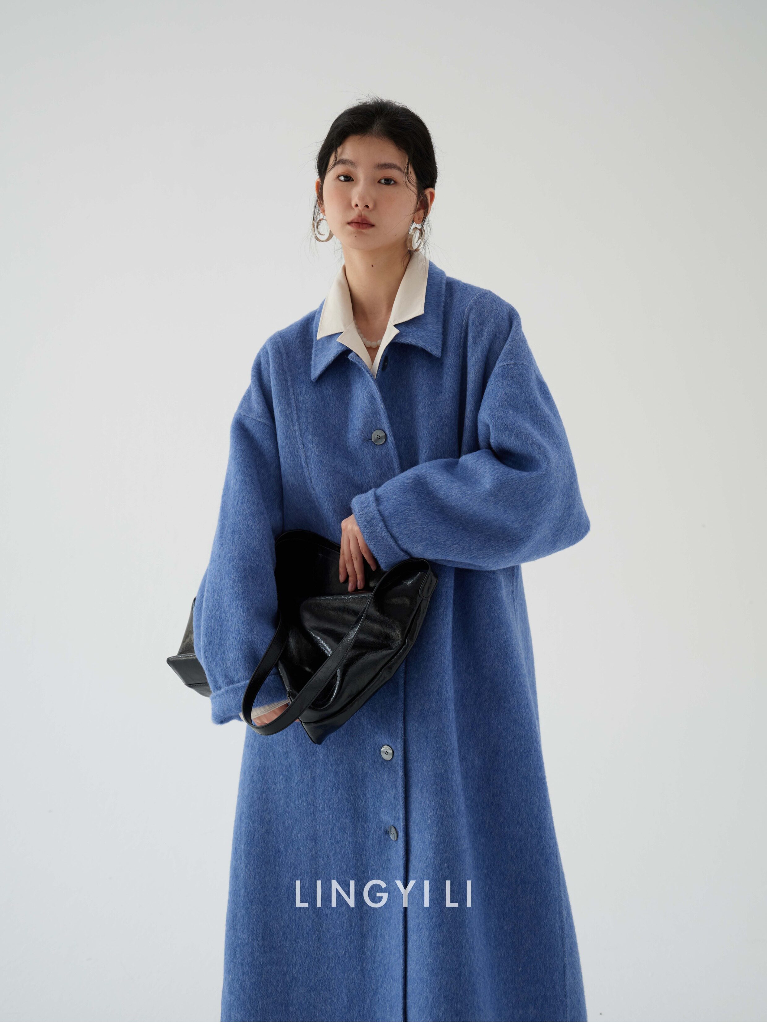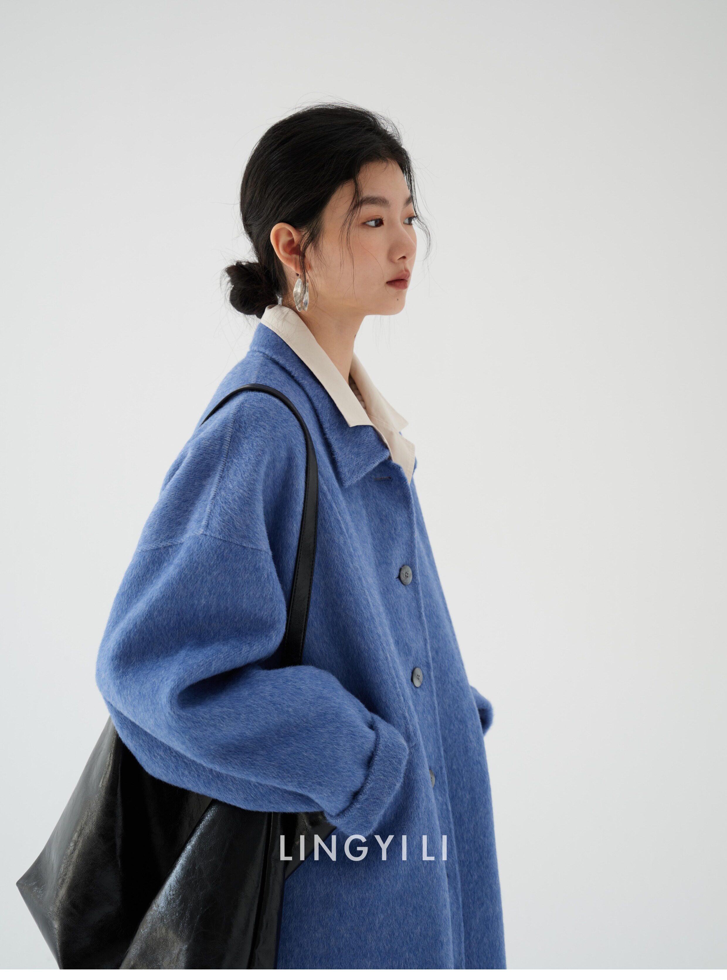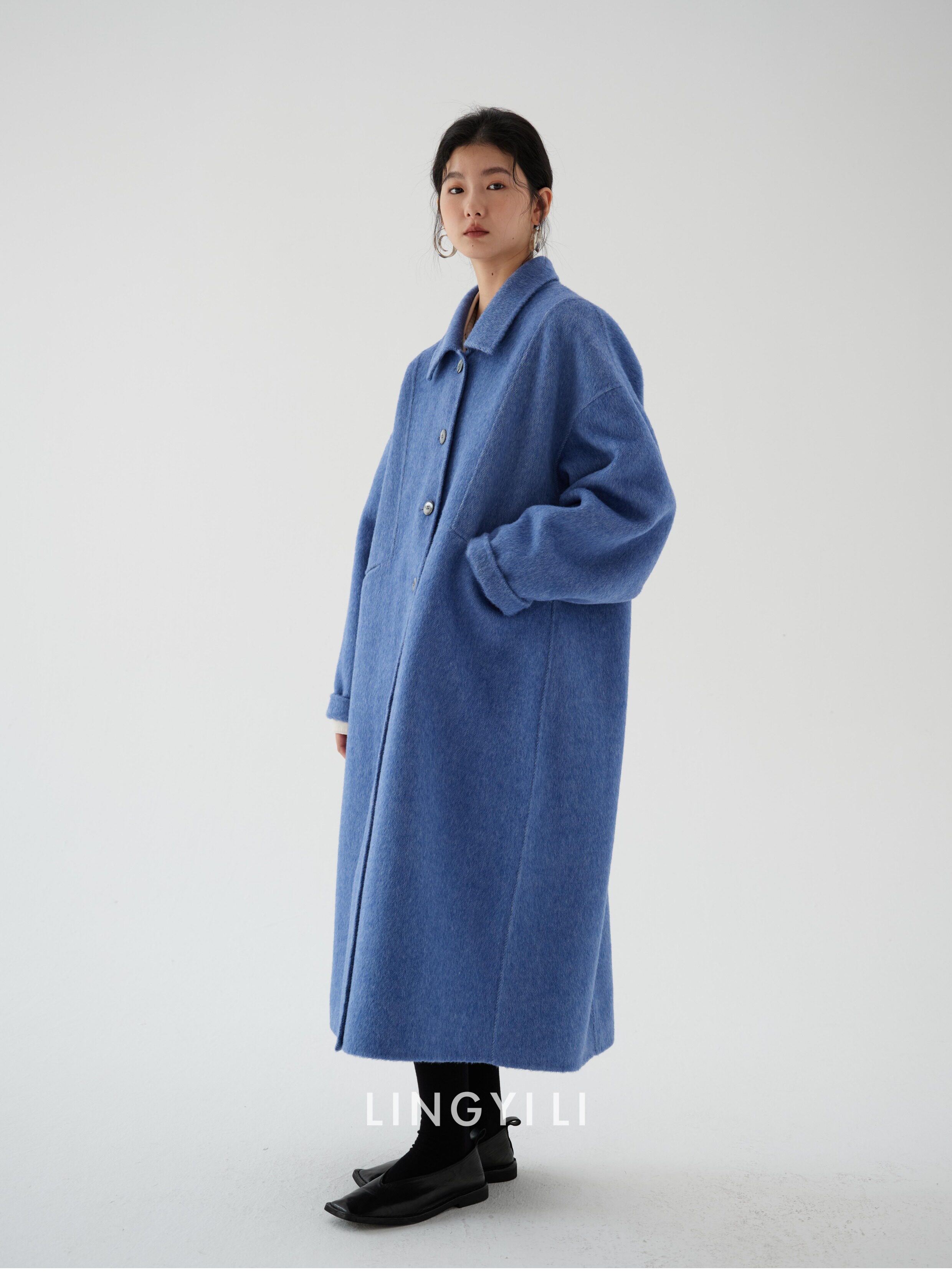 Lingyili Winter Series Sea Blue Silk Rabbit Wool Blend Double-Sided Nylon Long Coat