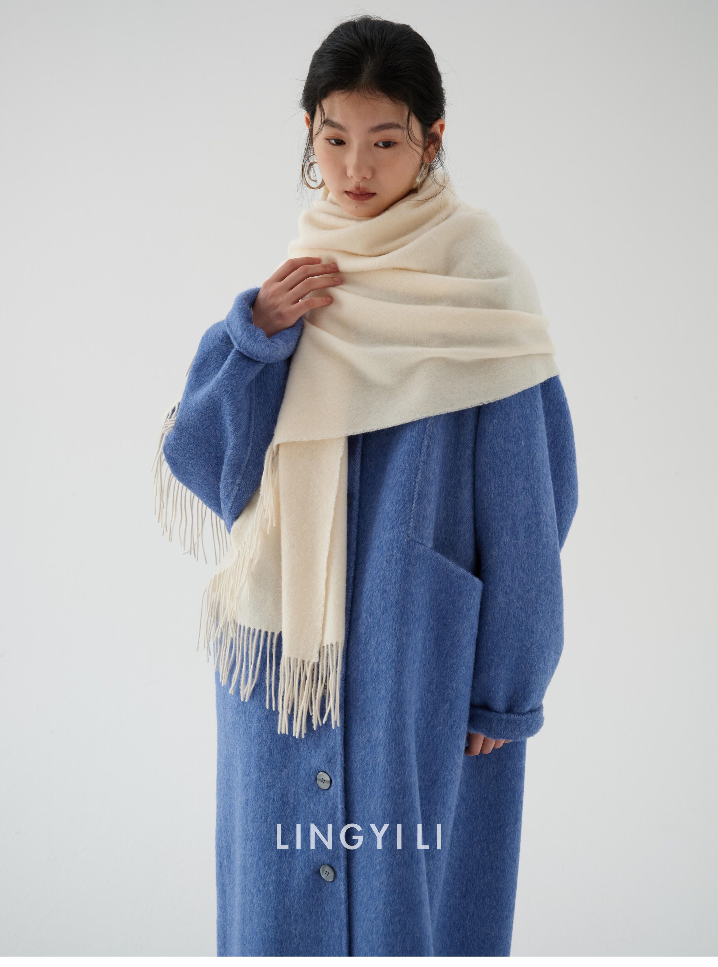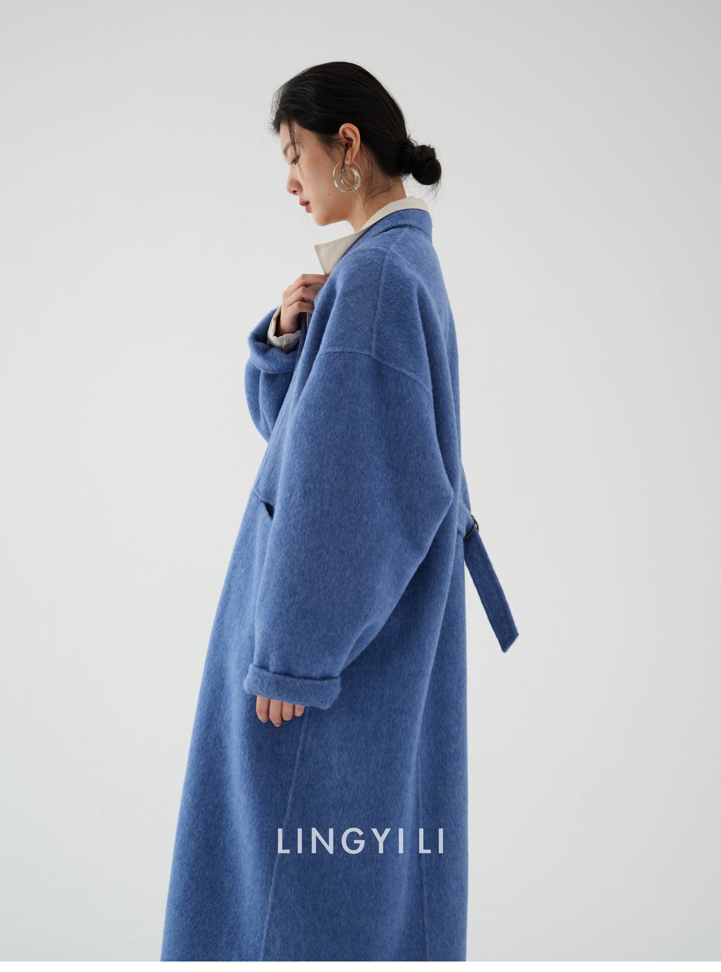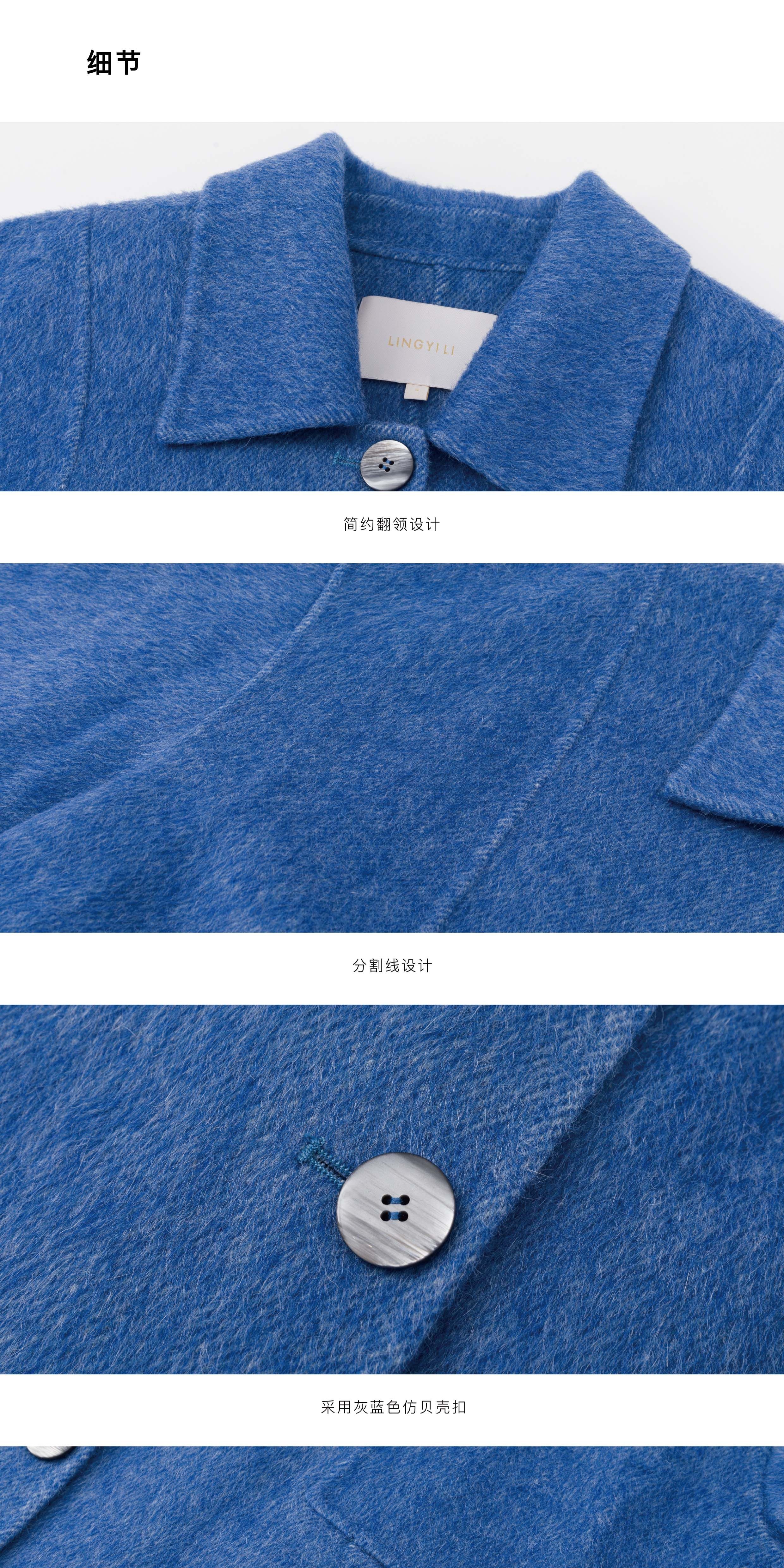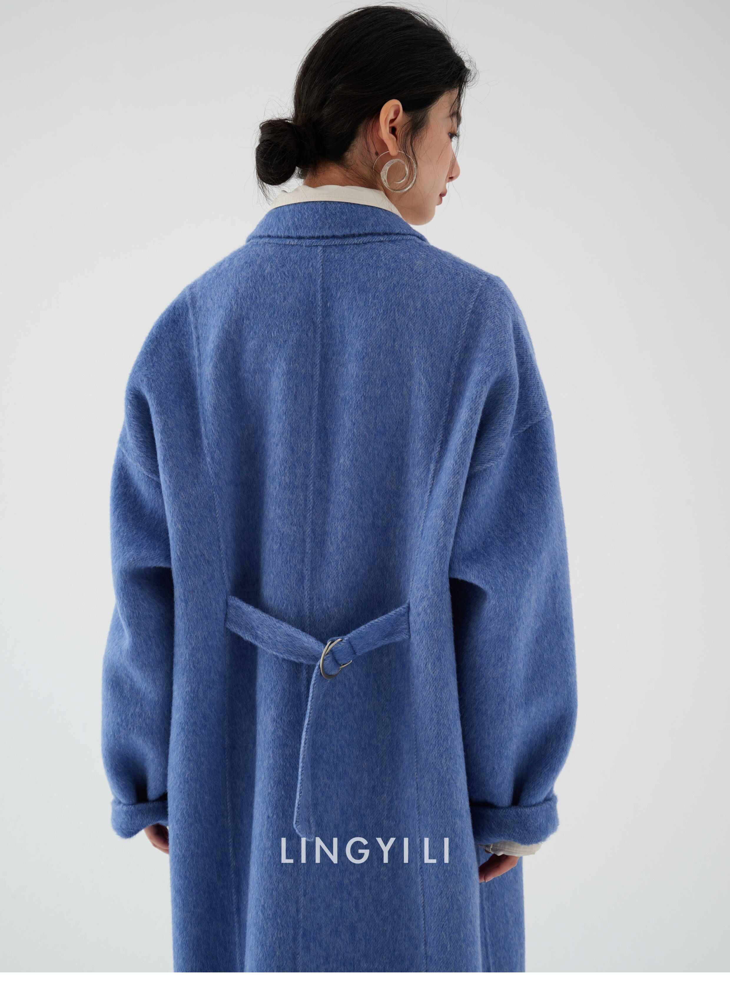 Lingyili Winter Series Sea Blue Silk Rabbit Wool Blend Double-Sided Nylon Long Coat