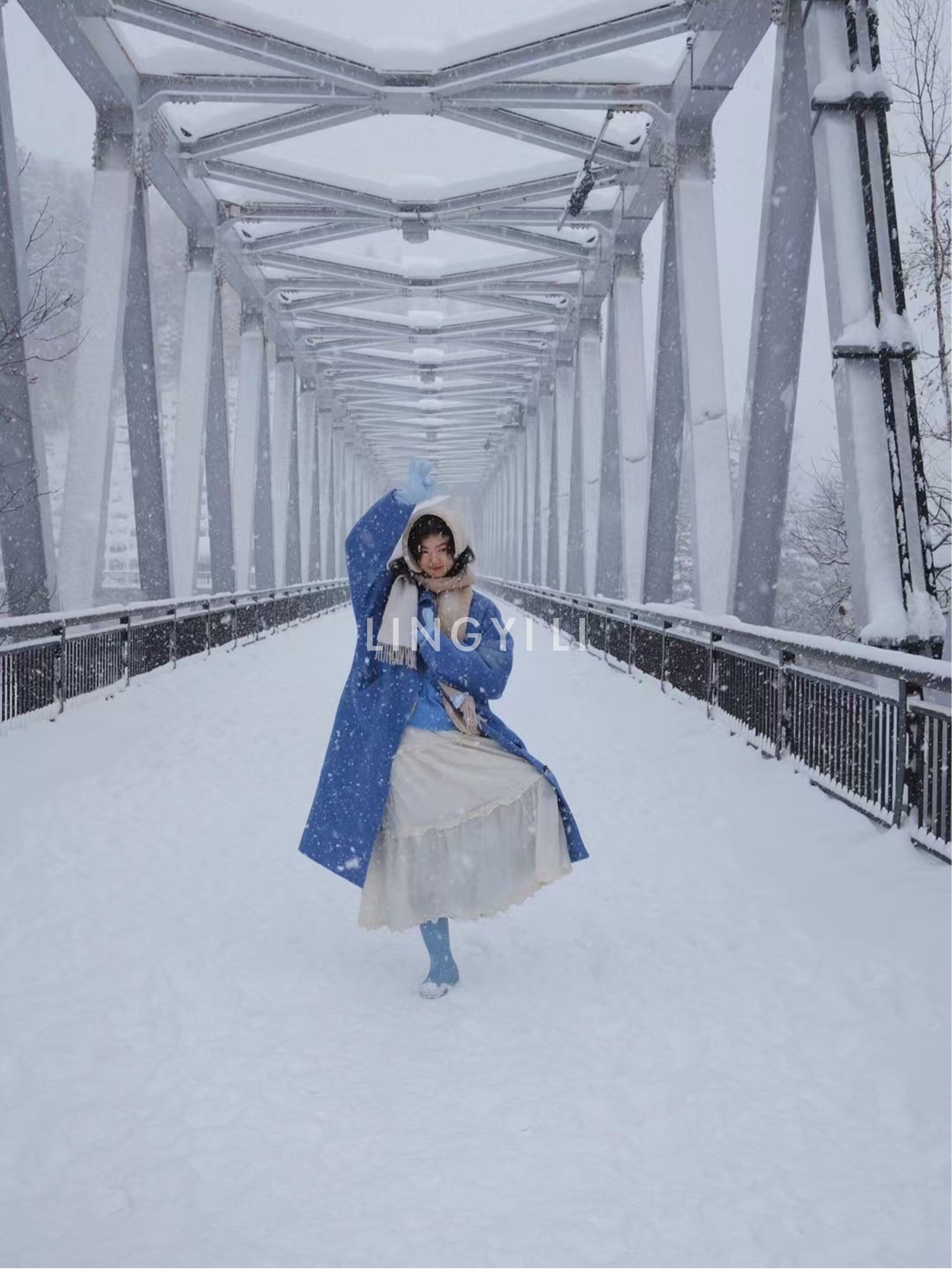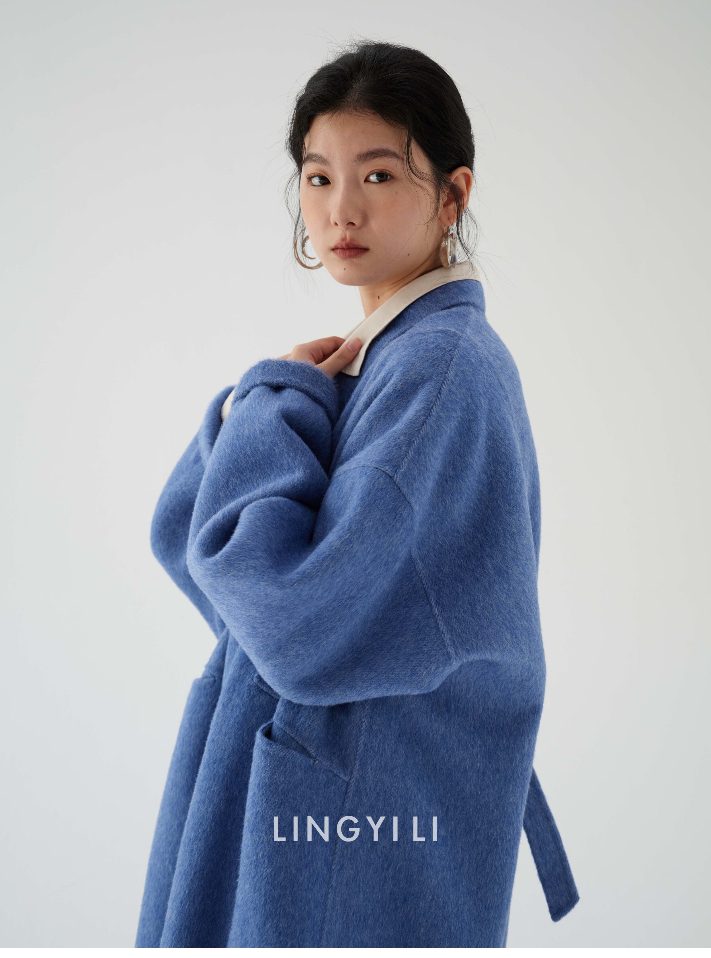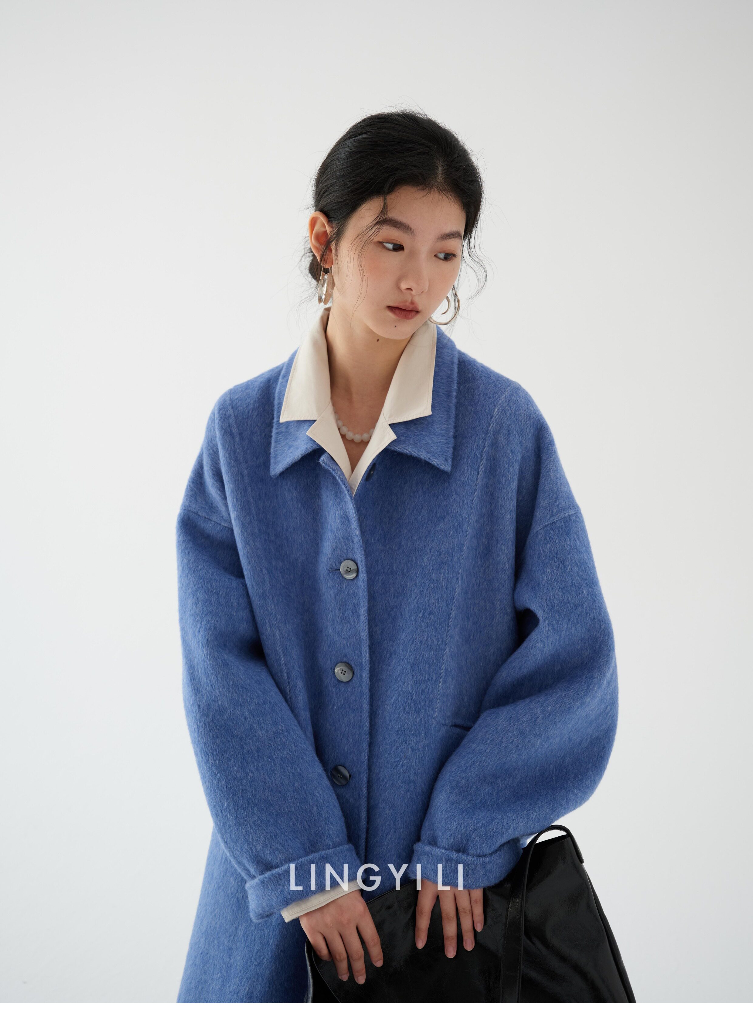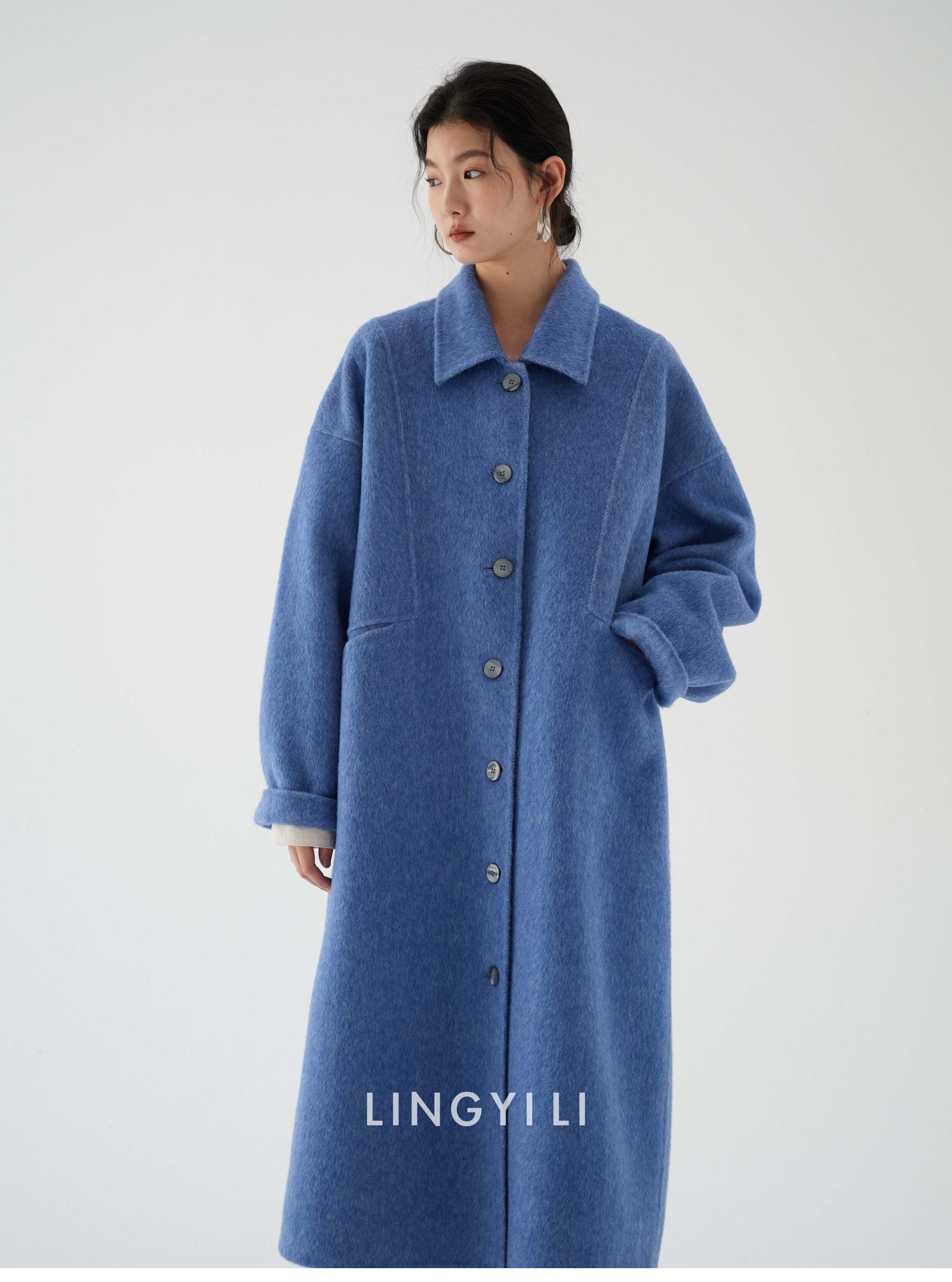 Lingyili Winter Series Sea Blue Silk Rabbit Wool Blend Double-Sided Nylon Long Coat