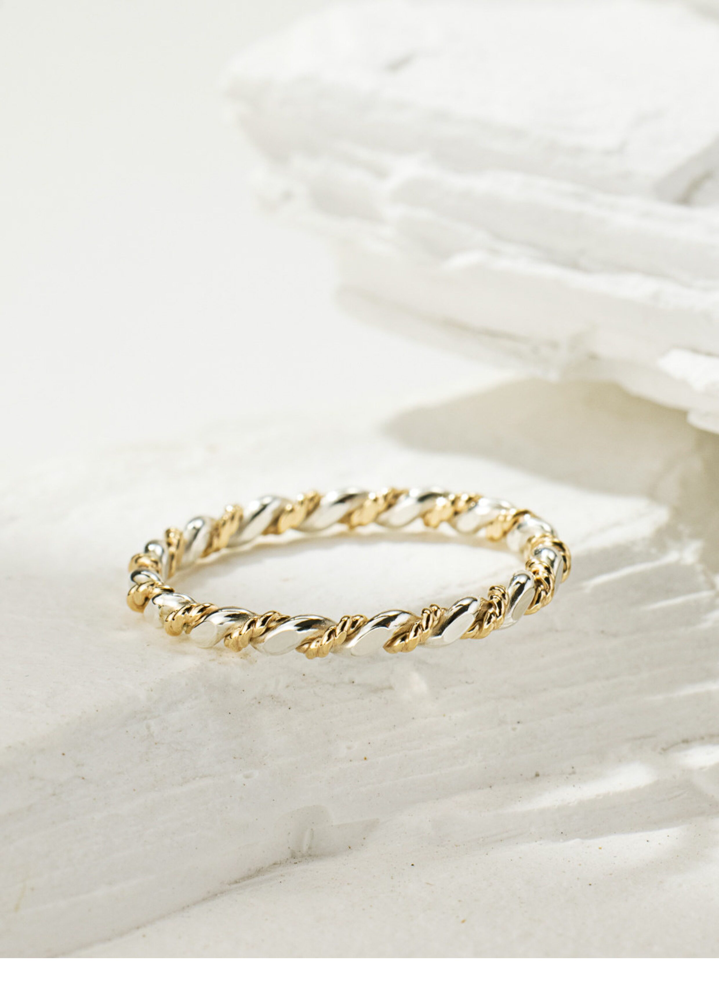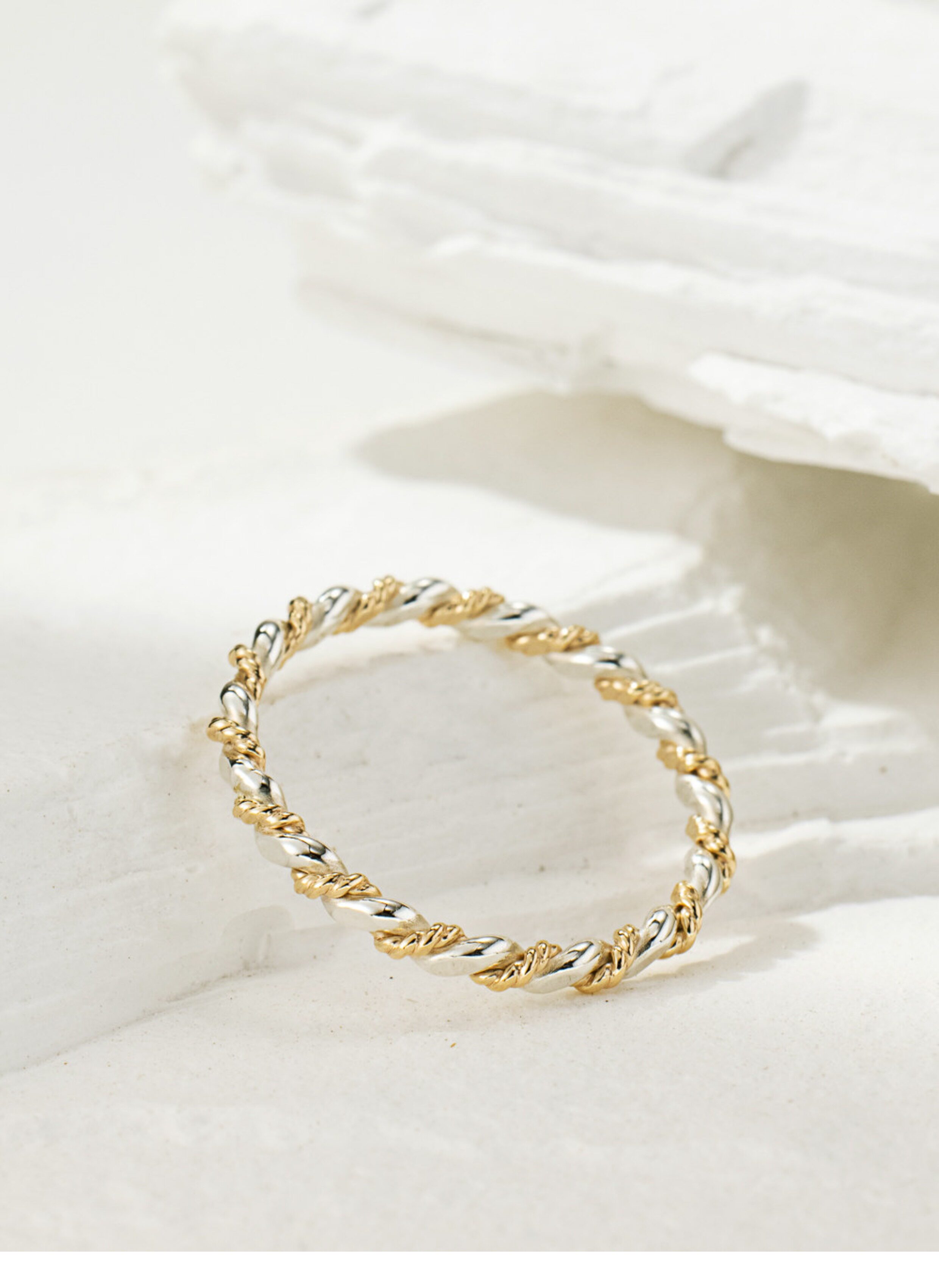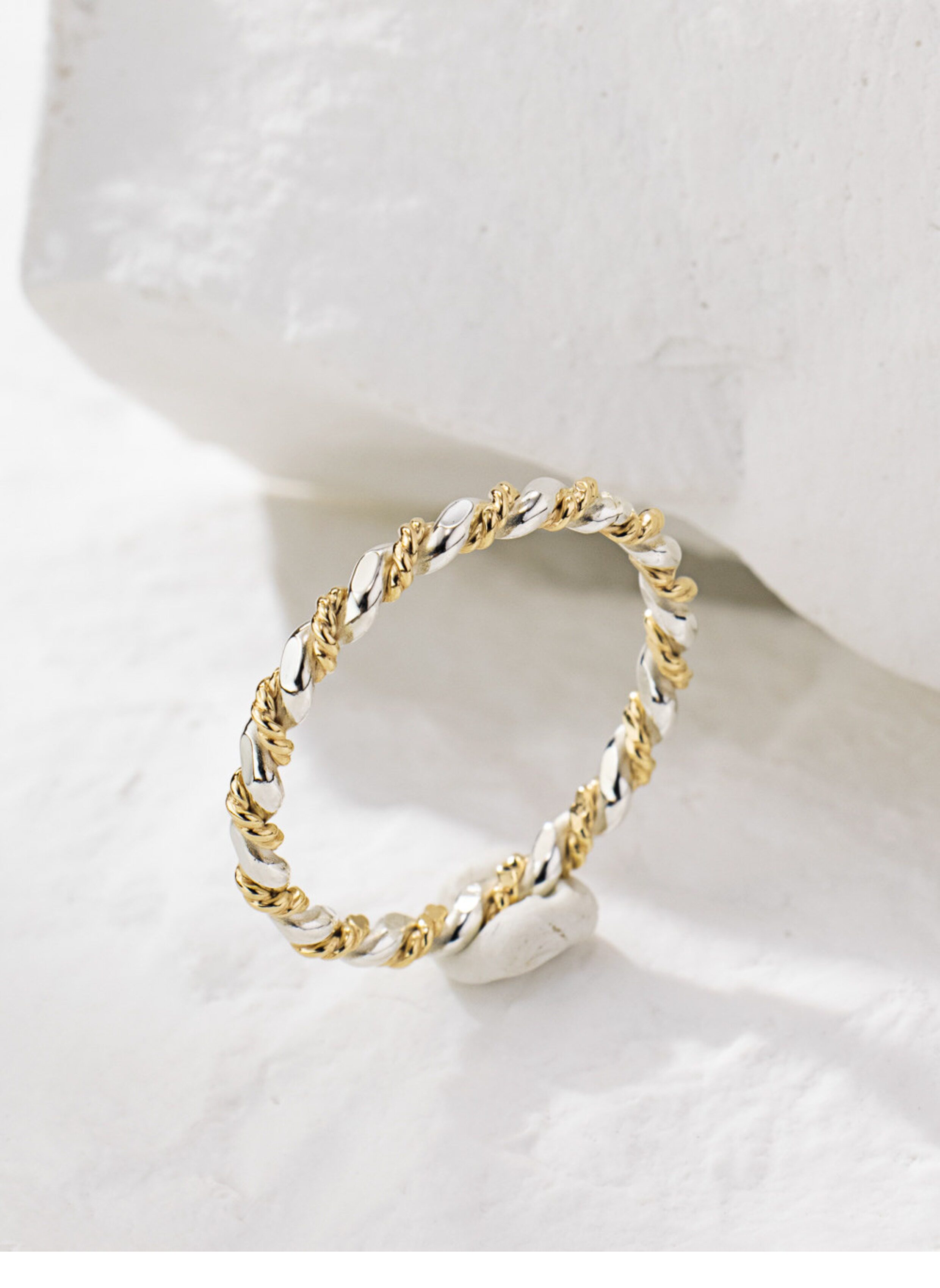 14K Gold-Plated S925 Sterling Silver Gold and Silver Contrasting Shiny Faceted Twist Ring for Women, European and American Niche High-End Style Tail Ring
