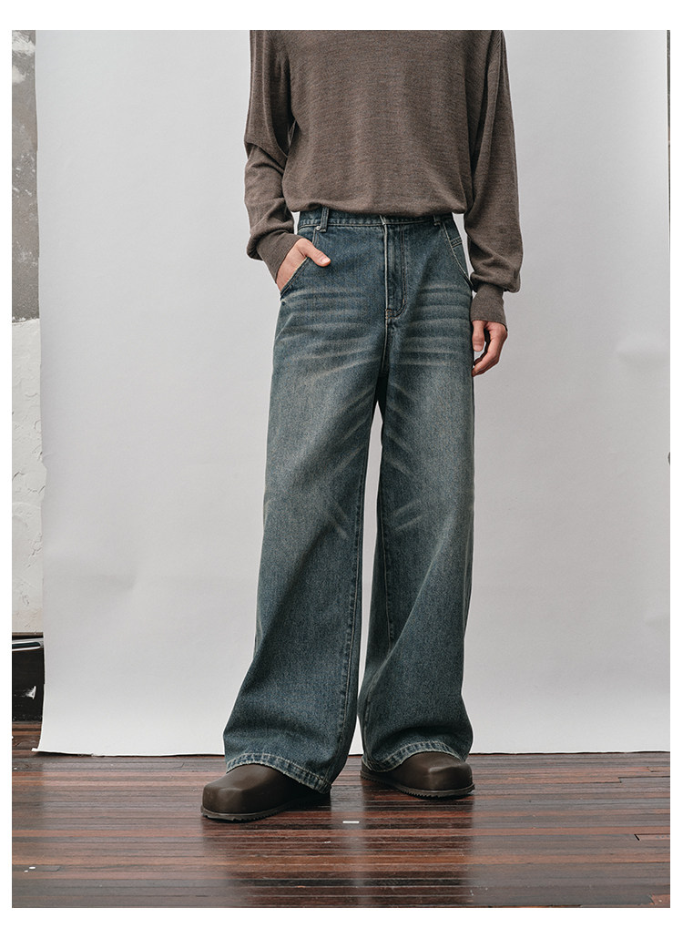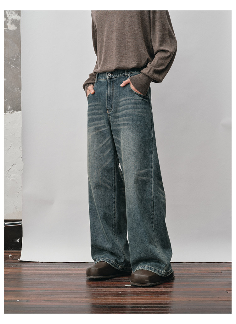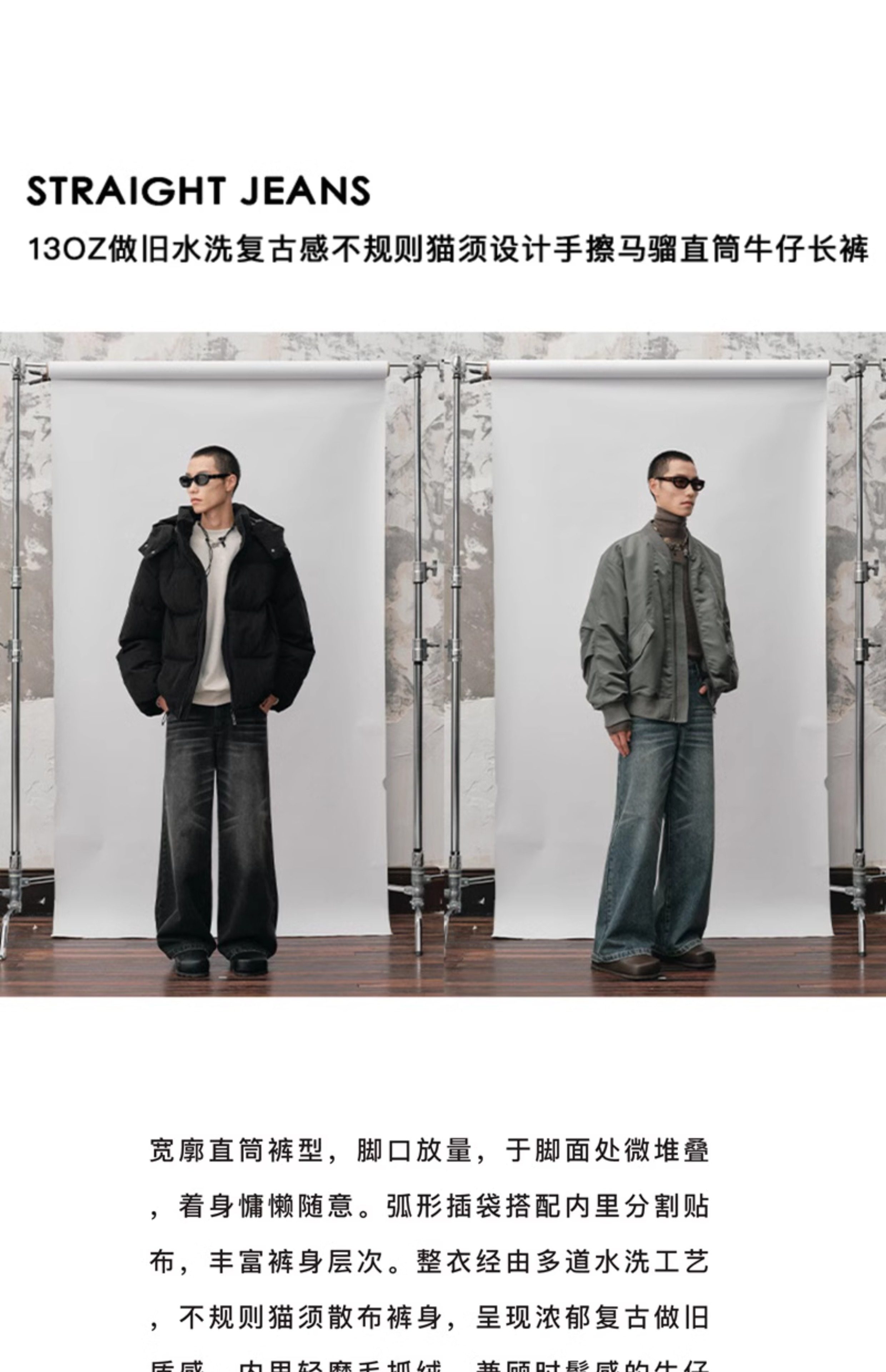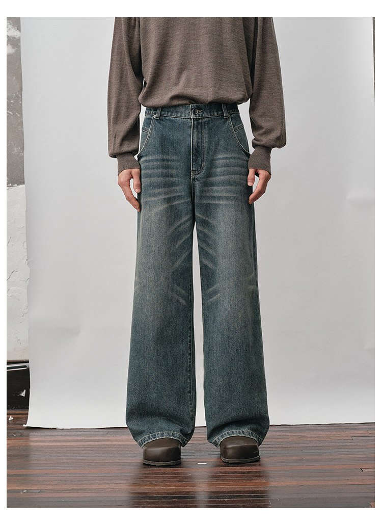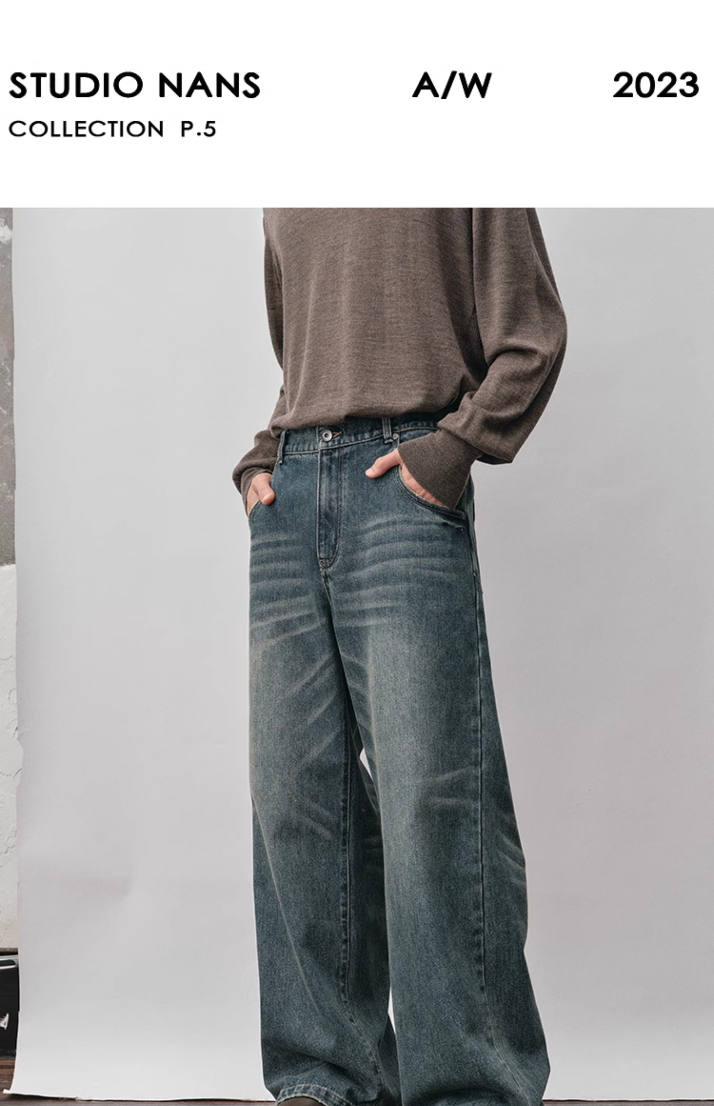 Nans Distressed Washed Whisker Design Hand-Rubbed Straight-Leg Denim Pants Ns7J19