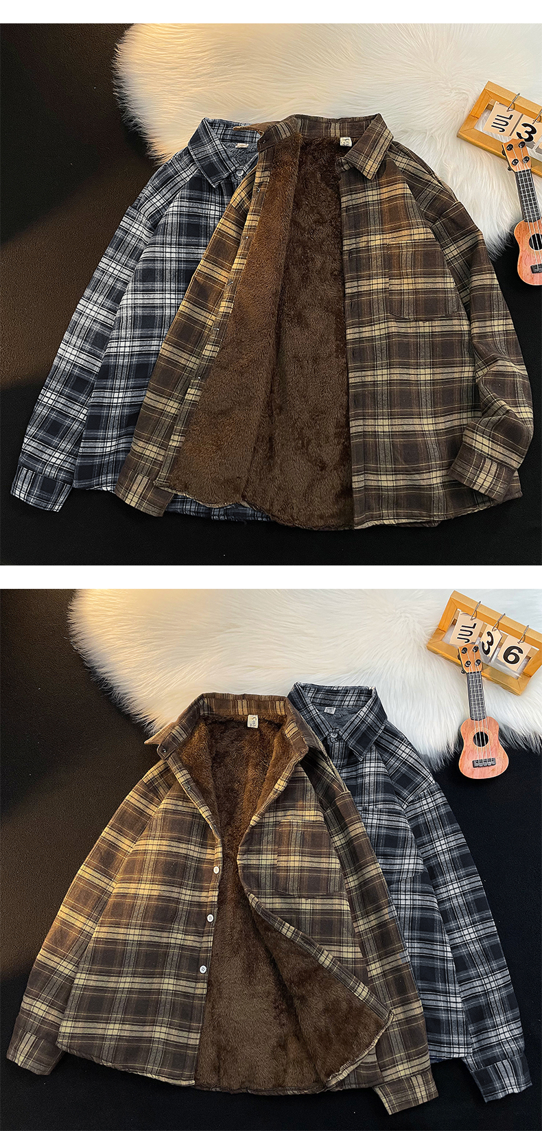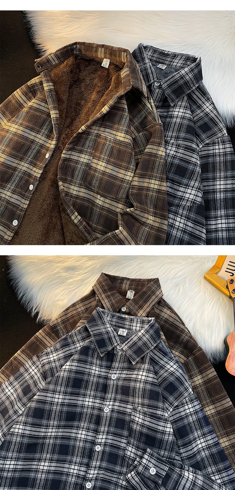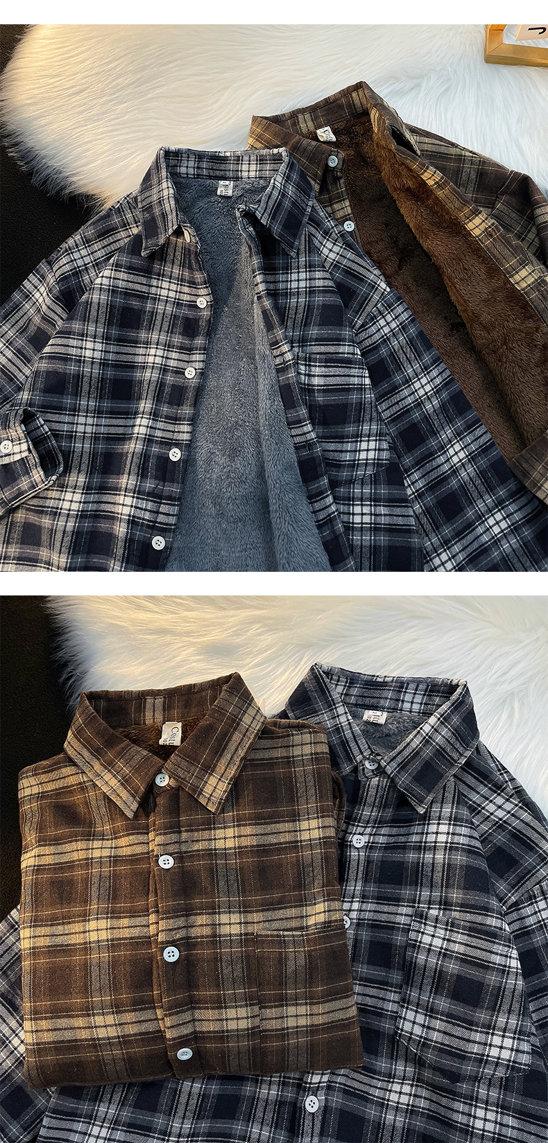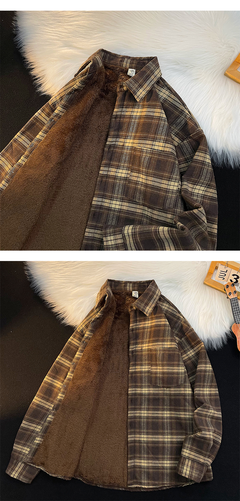 Autumn and Winter Fleece-Lined Thick Plaid Shirt for Men, Long-Sleeved, Japanese Retro Trendy Brand, Vintage Loose Casual Jacket