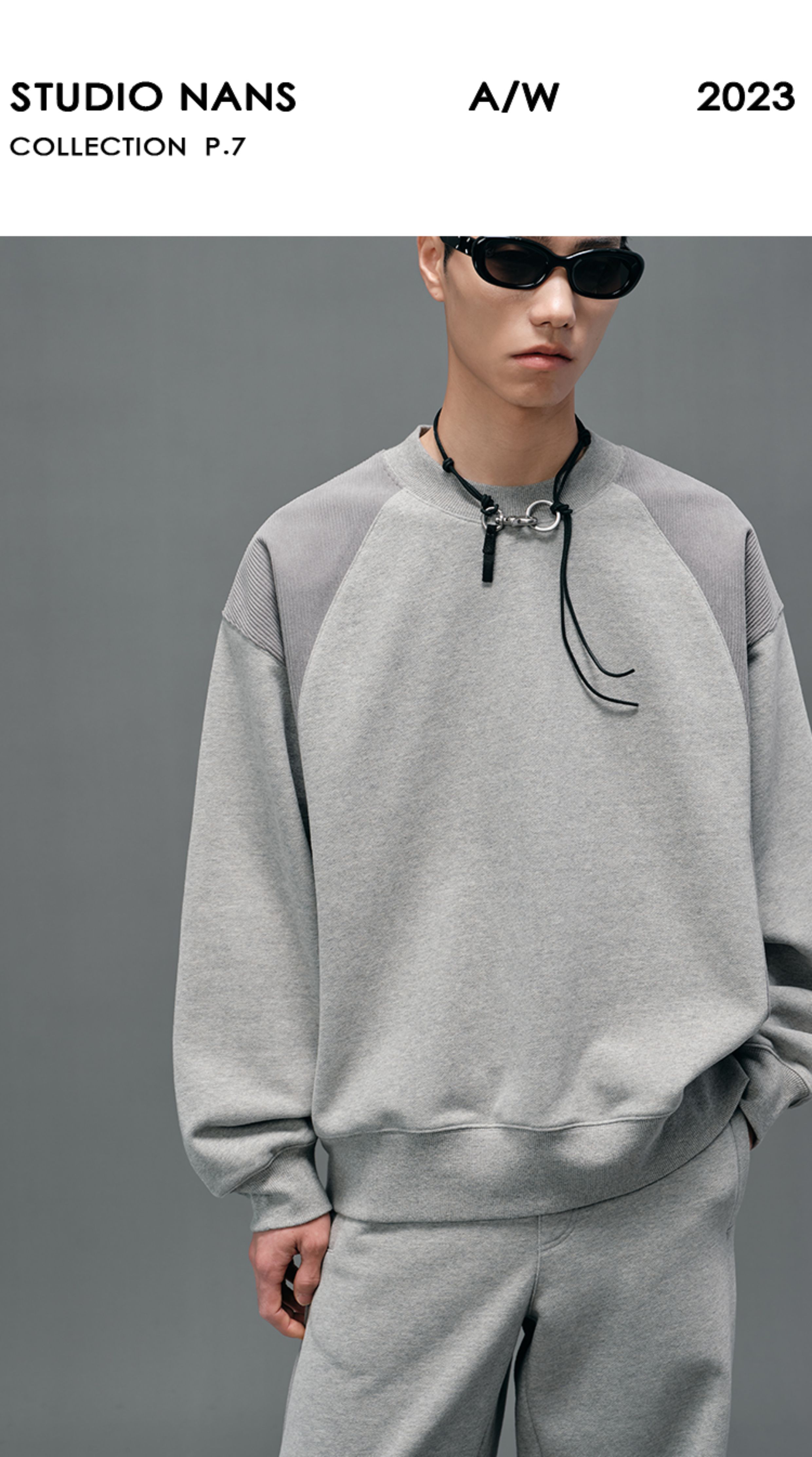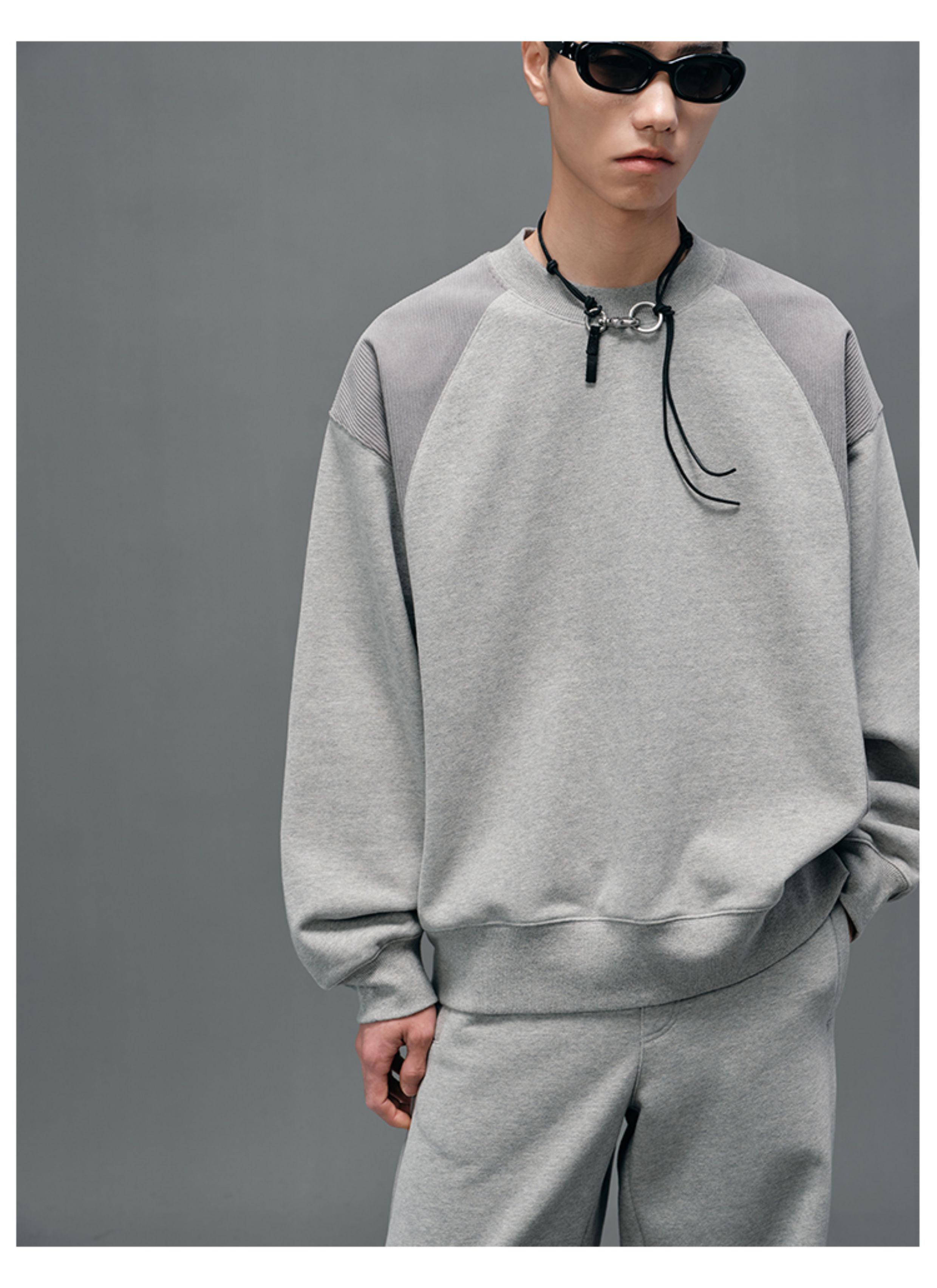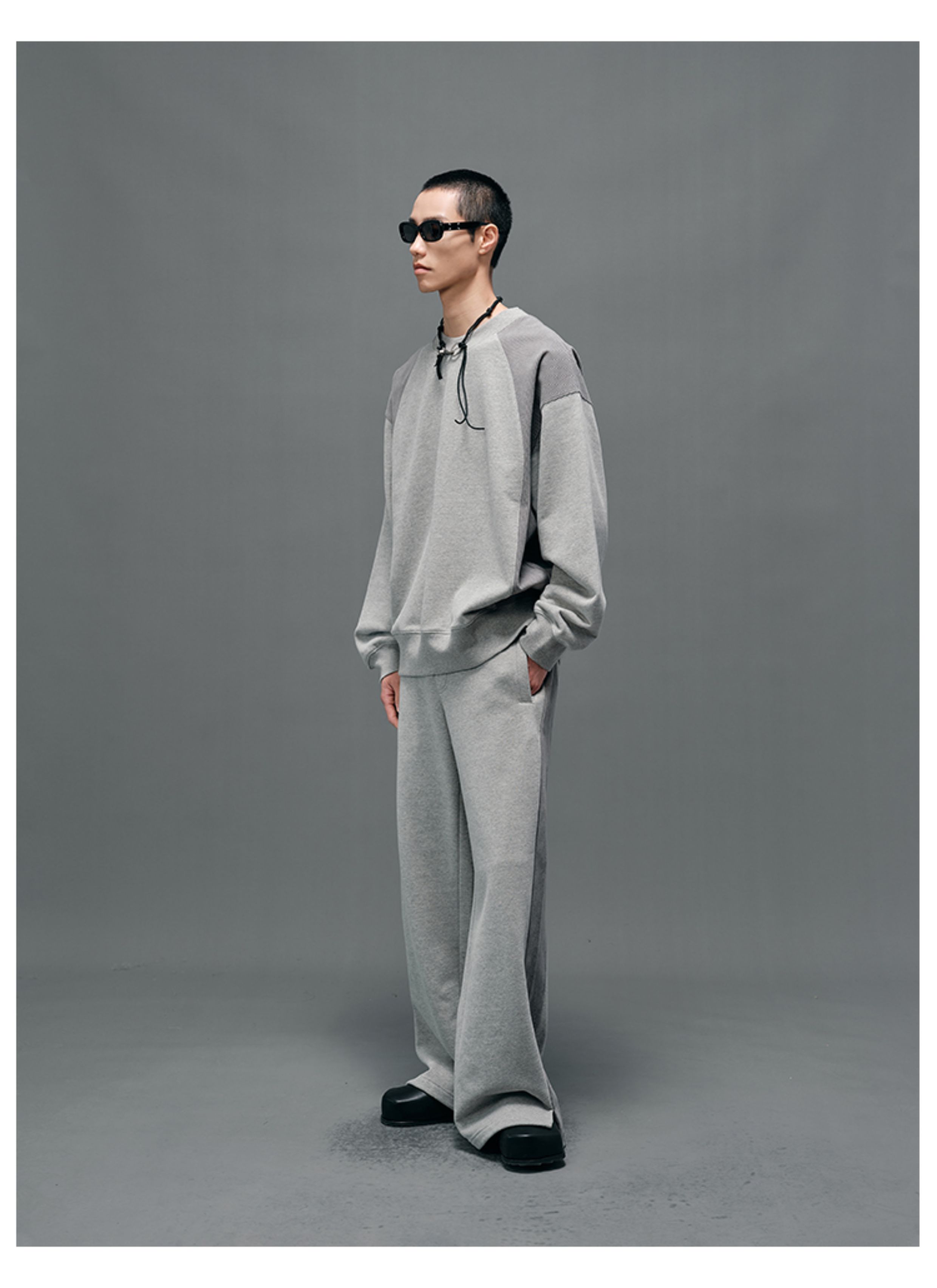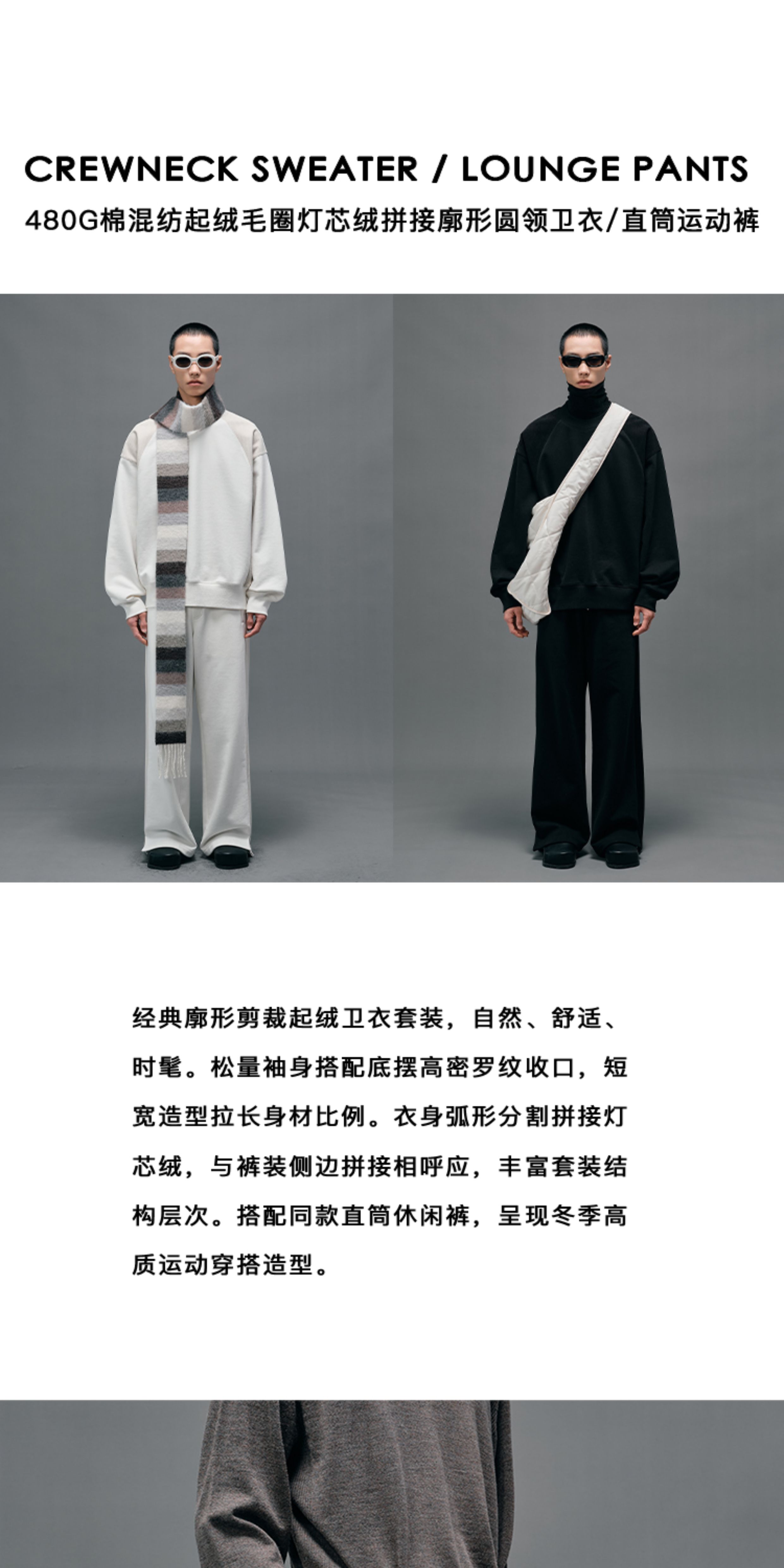 【Nans】480G Cotton Blend Fleece Terry Corduroy Patchwork Silhouette Crew Neck Sweatshirt/Straight-Leg Sweatpants