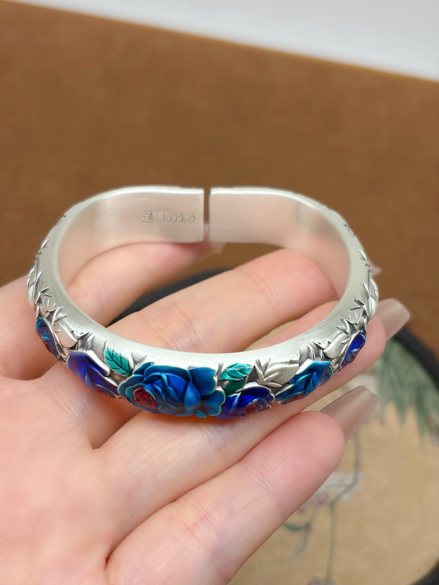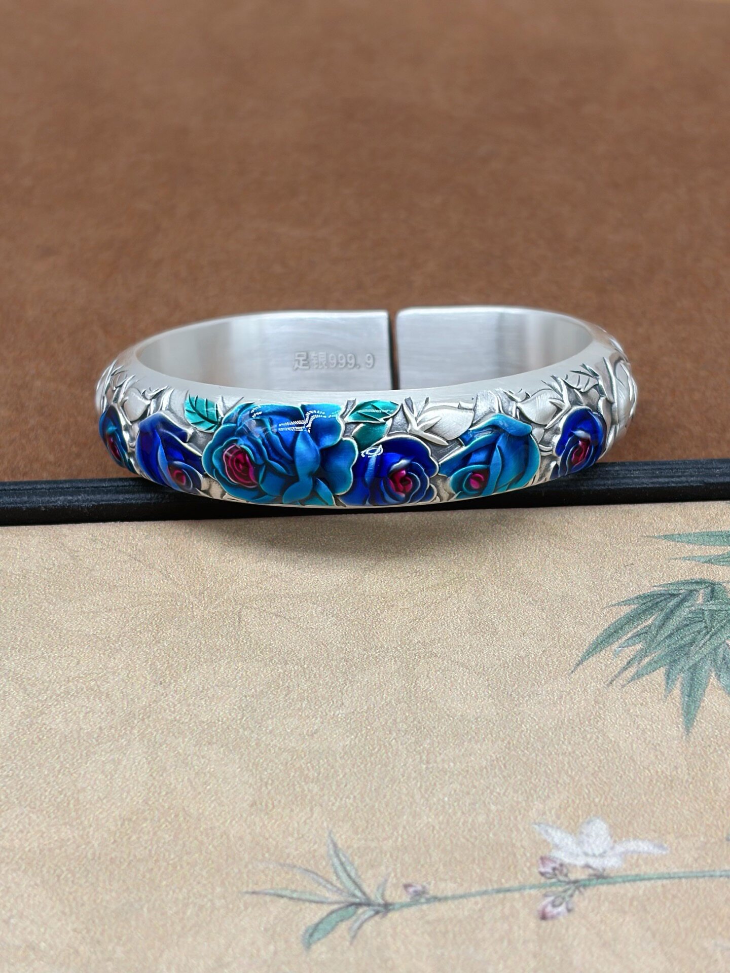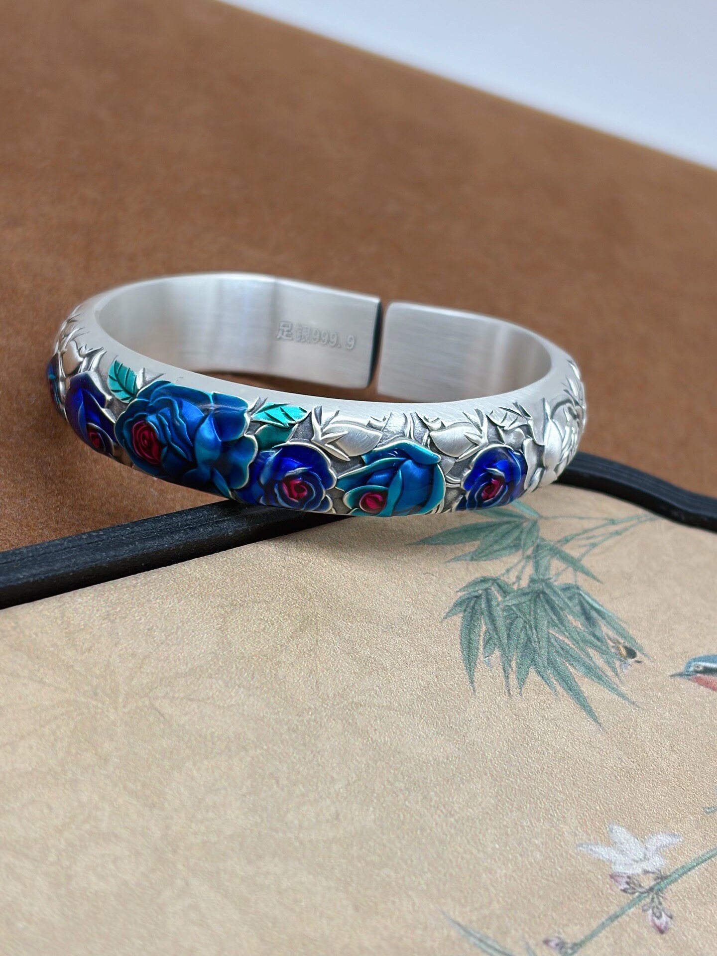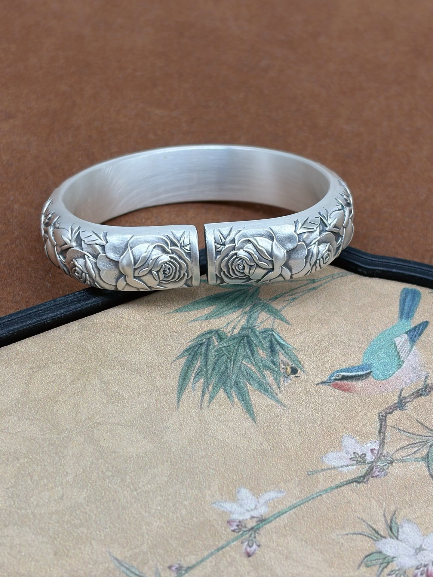 Vintage Rose Horseshoe Pure Silver 9999 Bracelet for Women, Embossed New Chinese Style High-End Open Bracelet