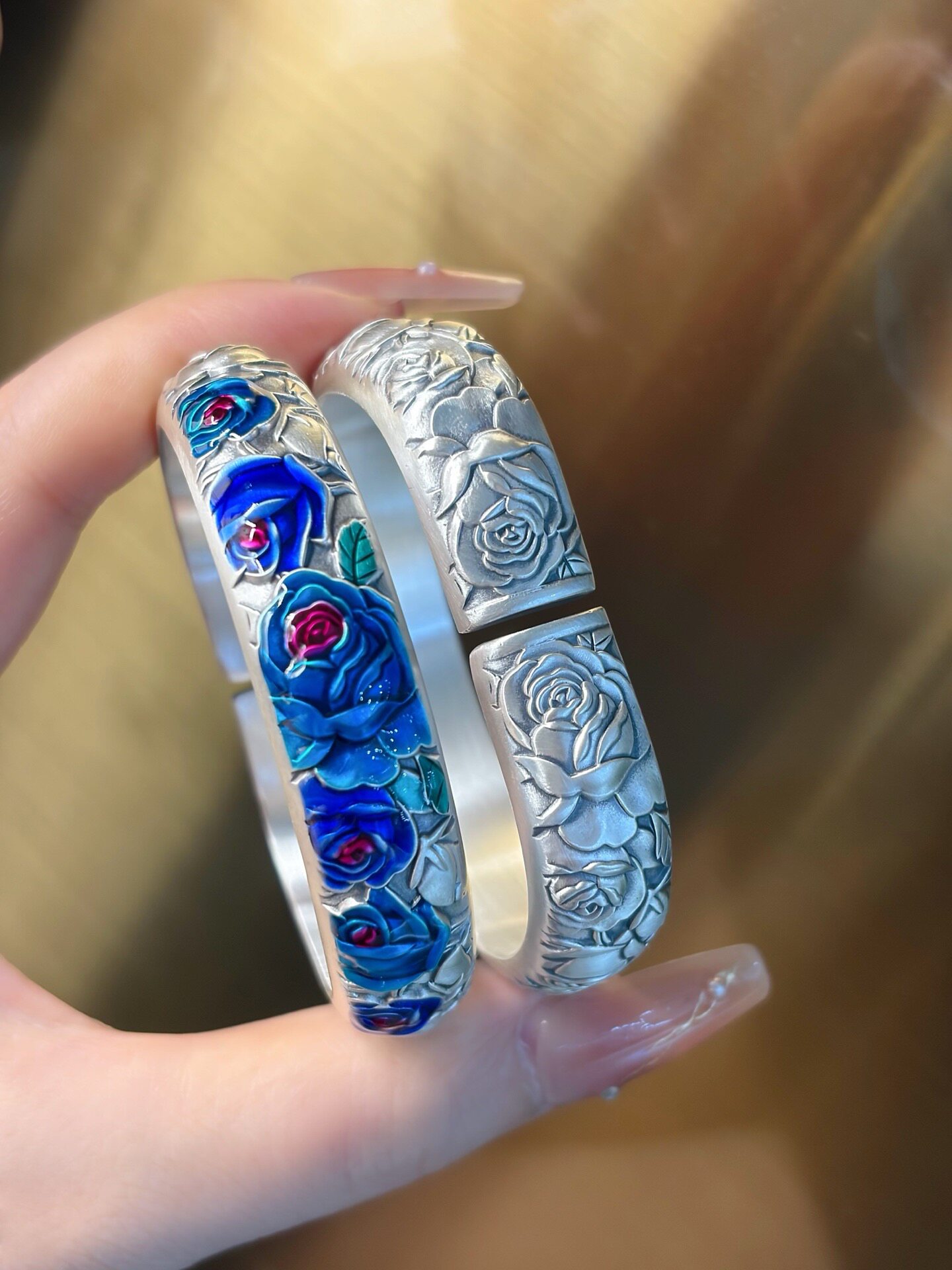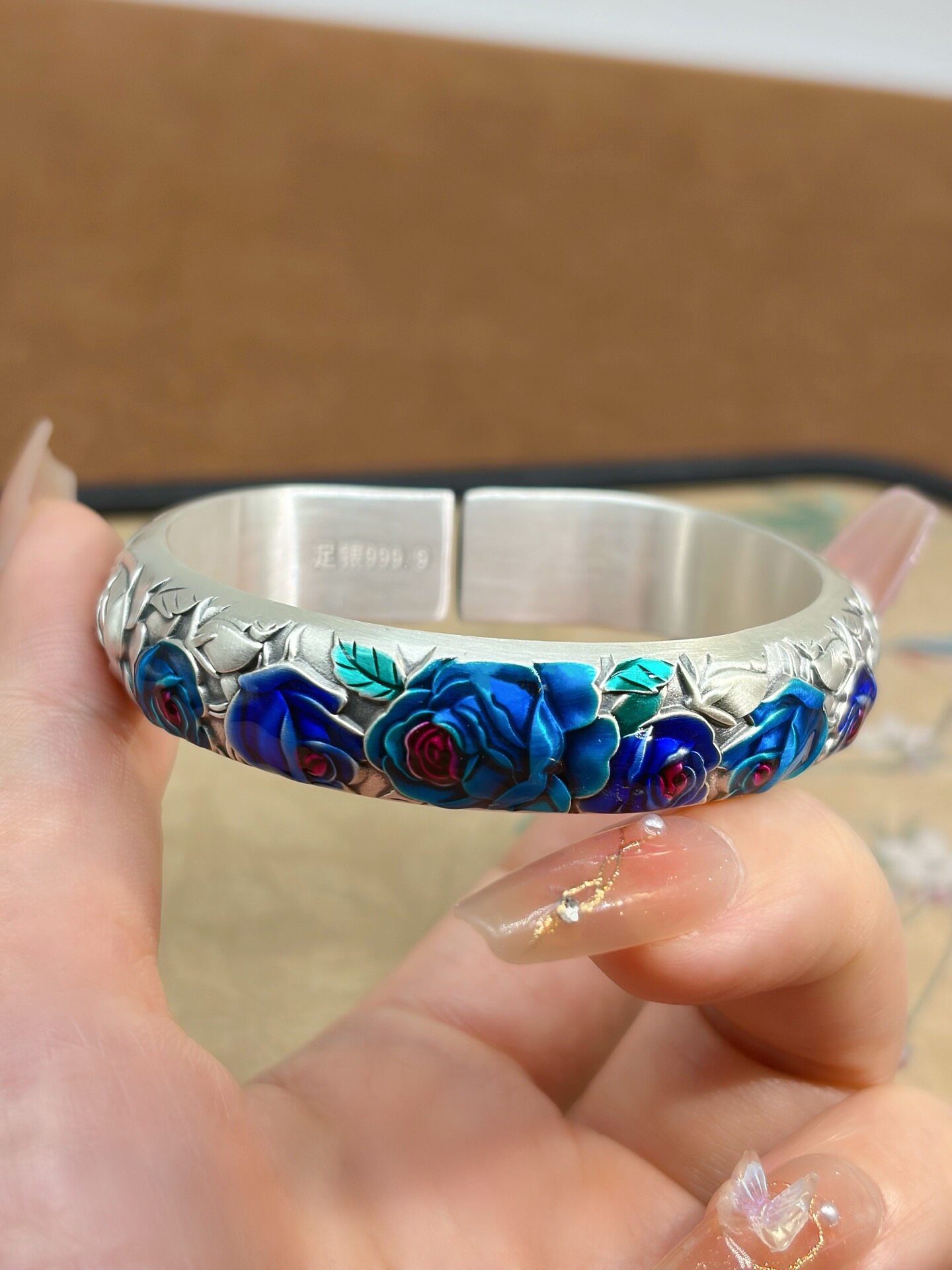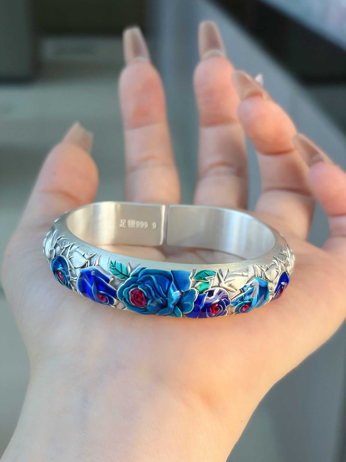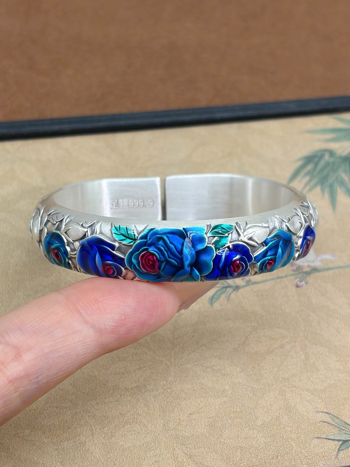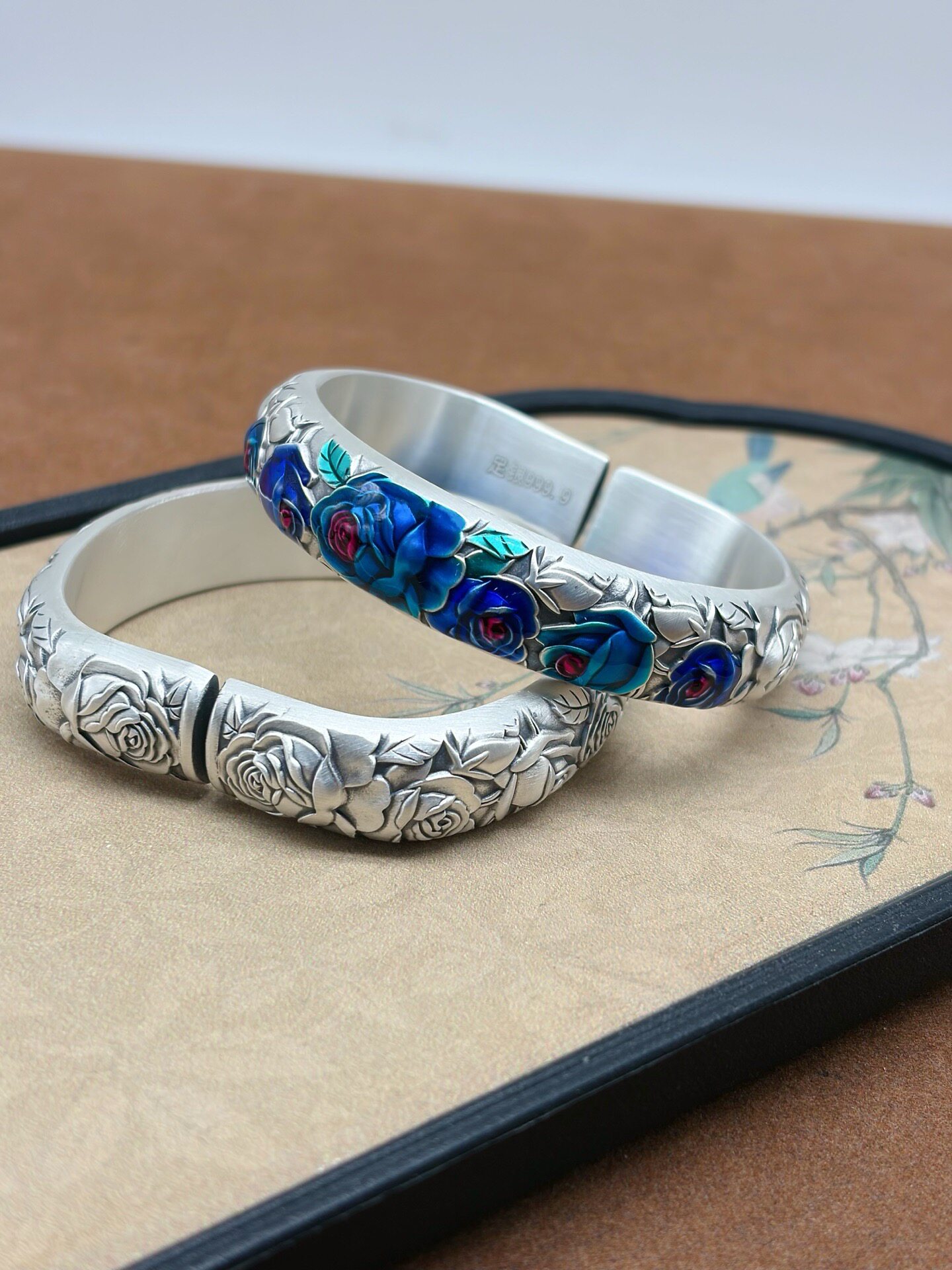 Vintage Rose Horseshoe Pure Silver 9999 Bracelet for Women, Embossed New Chinese Style High-End Open Bracelet