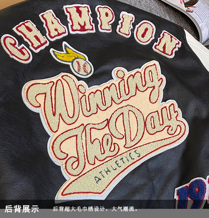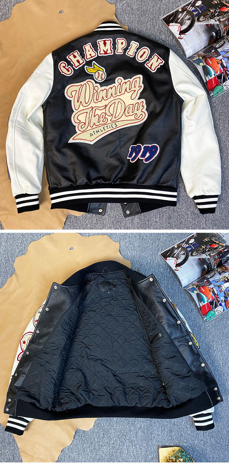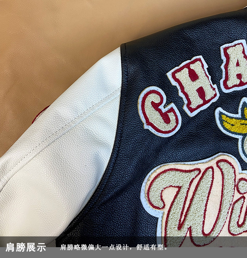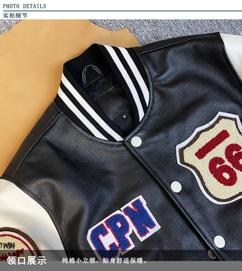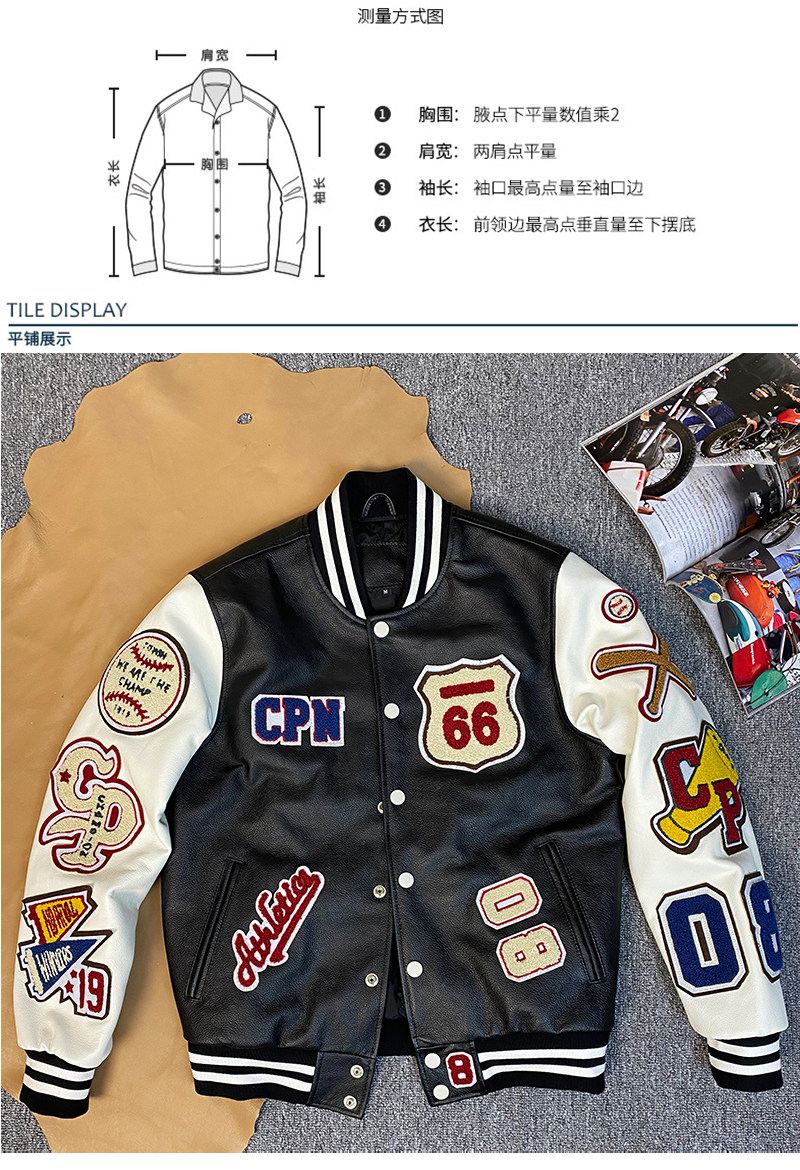 Autumn and Winter First-Layer Calfskin Baseball Jacket, Black and White Contrasting Genuine Leather Short Leather Jacket with Multiple Embroidery Details, Trendy Men's Coat