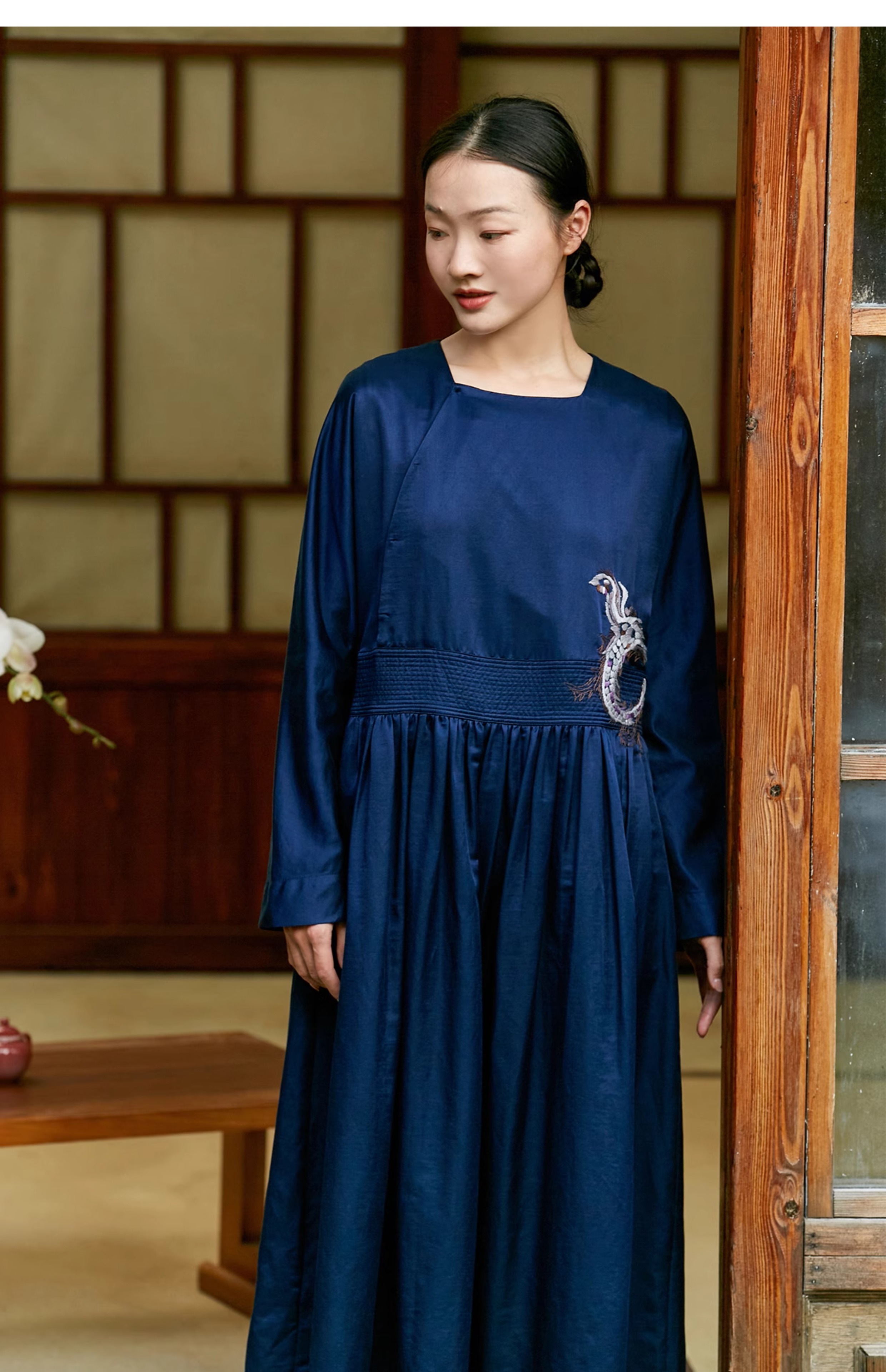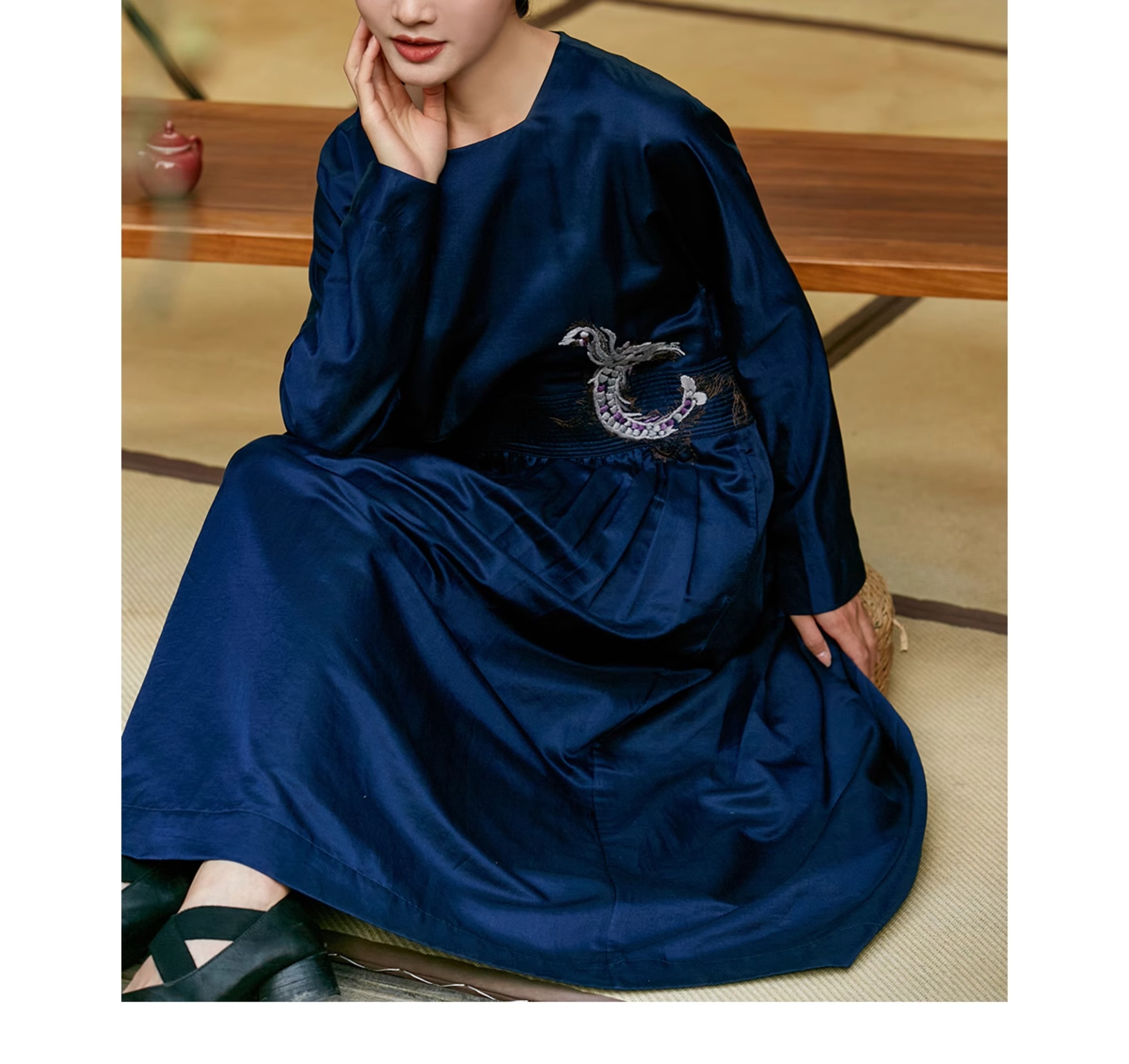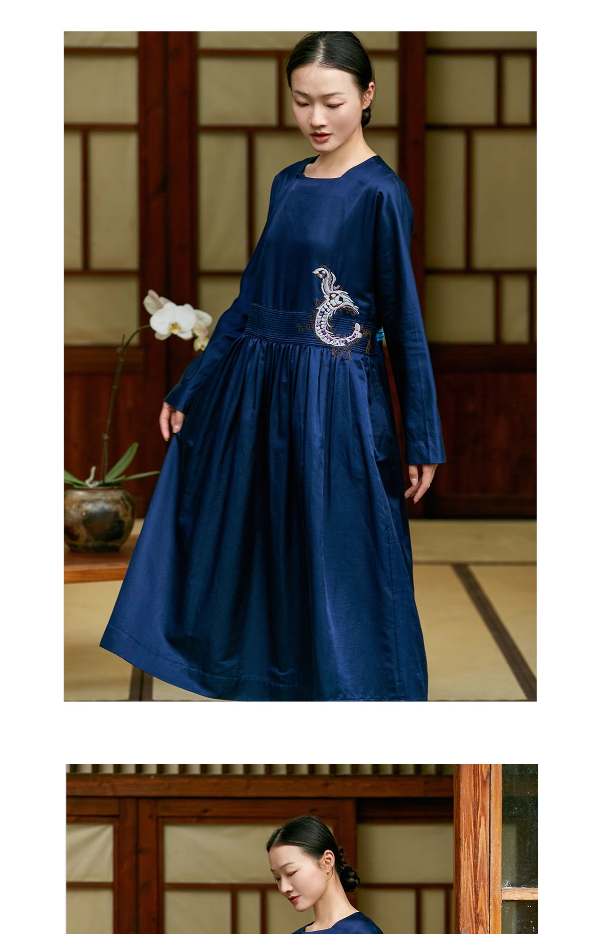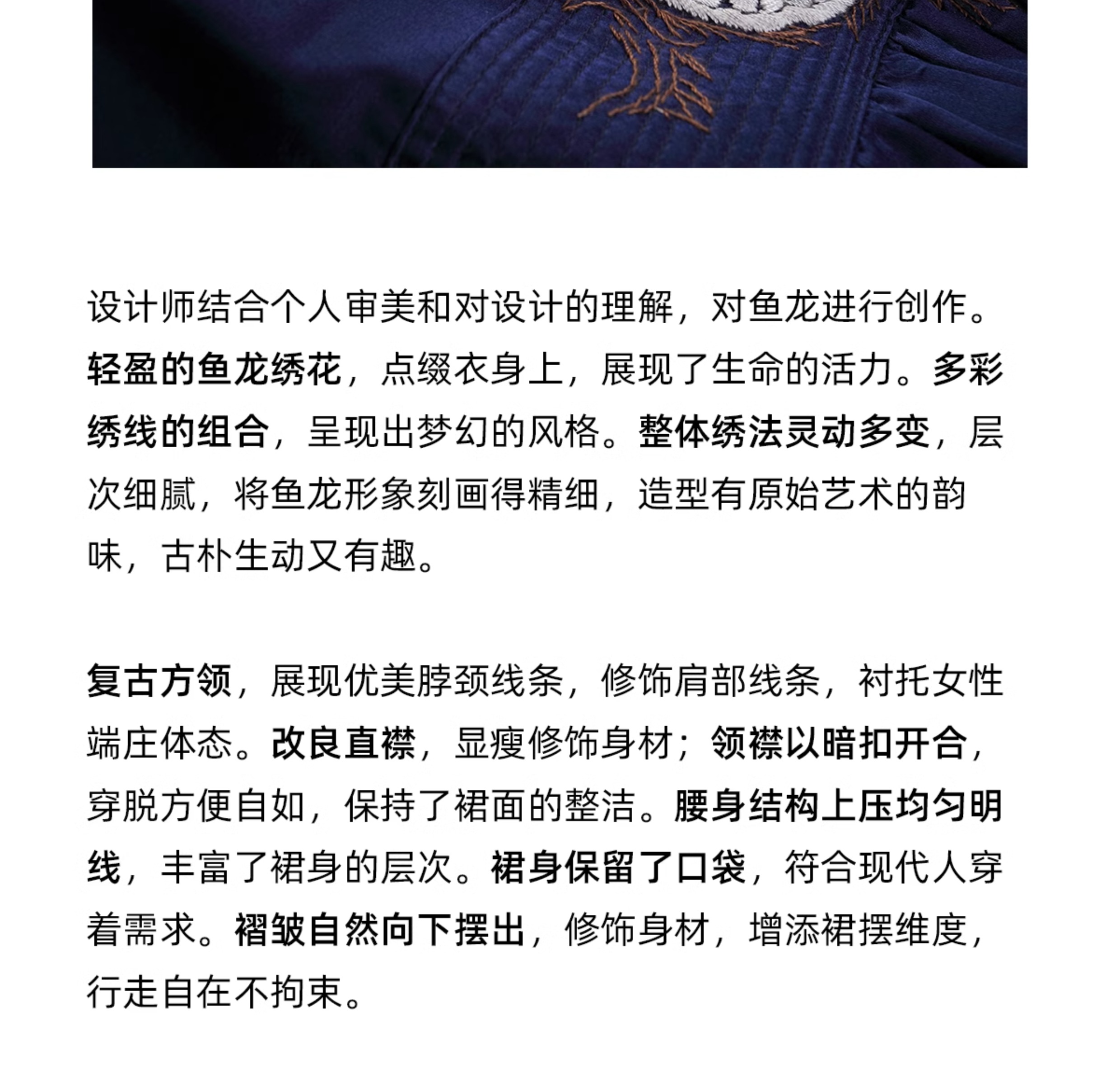 【Skimming the Sea】Jixiang Yuer's Original 19mm Silk Cotton Satin Fish and Dragon Embroidered Straight-Front Square-Neck Large Hem A-Line Dress