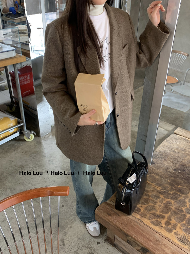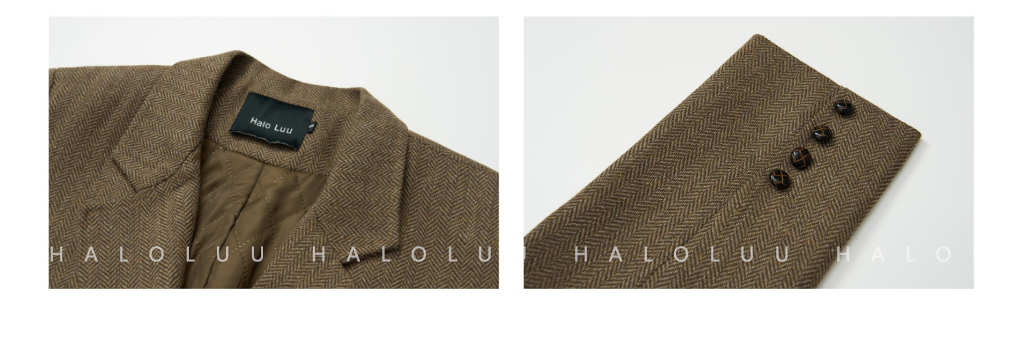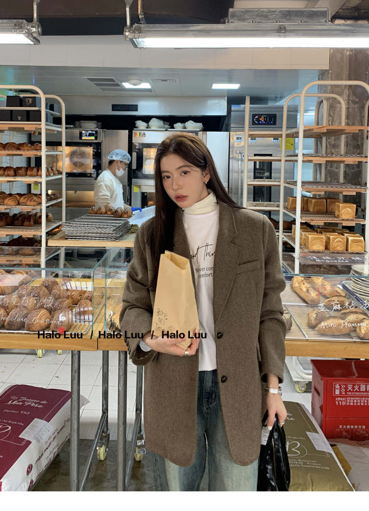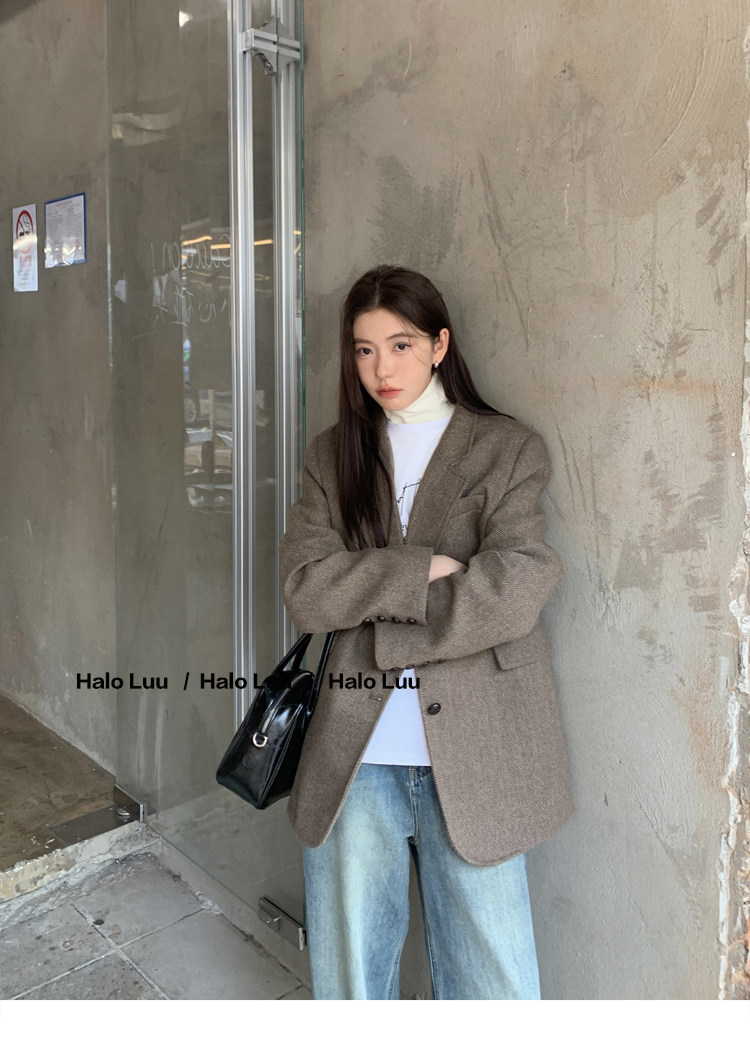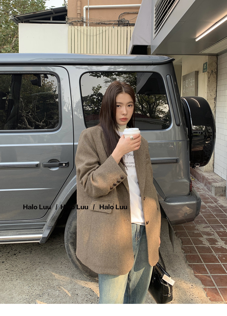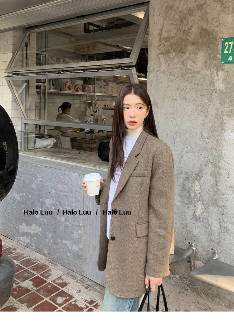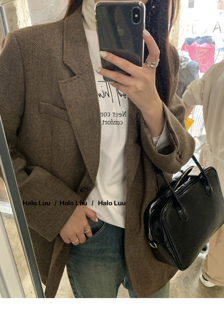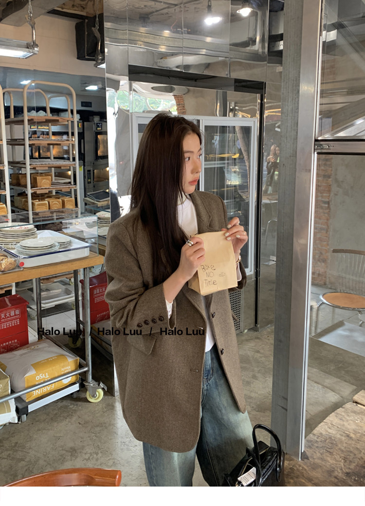 Halo Luu Herringbone Woolen Blazer for Women, Spring Korean Style Casual Brown High-End Wool Suit