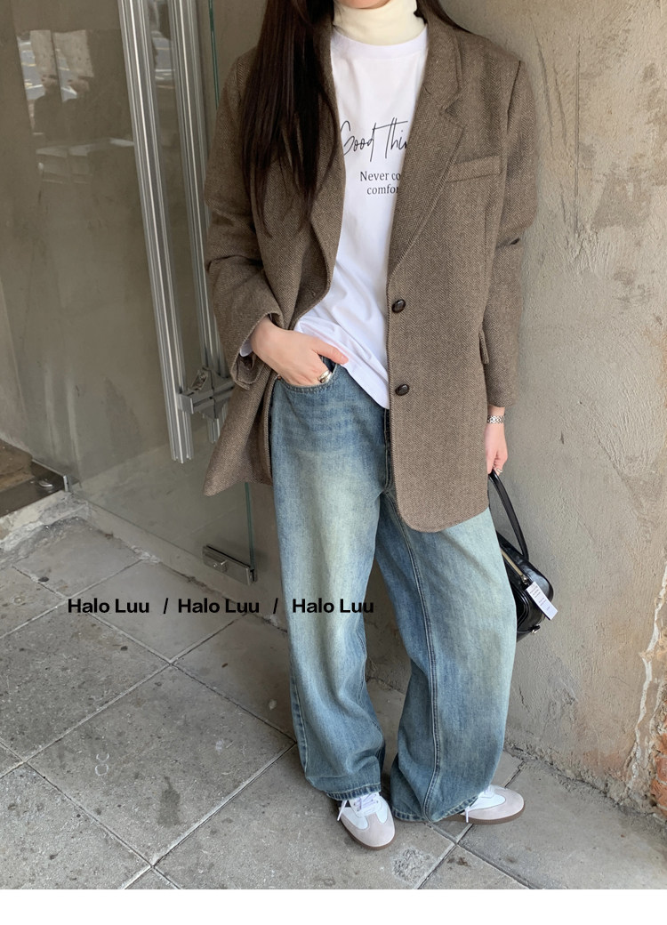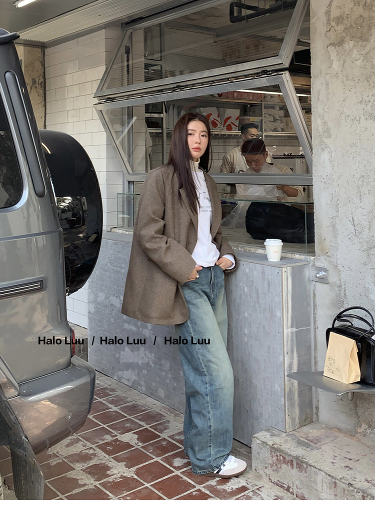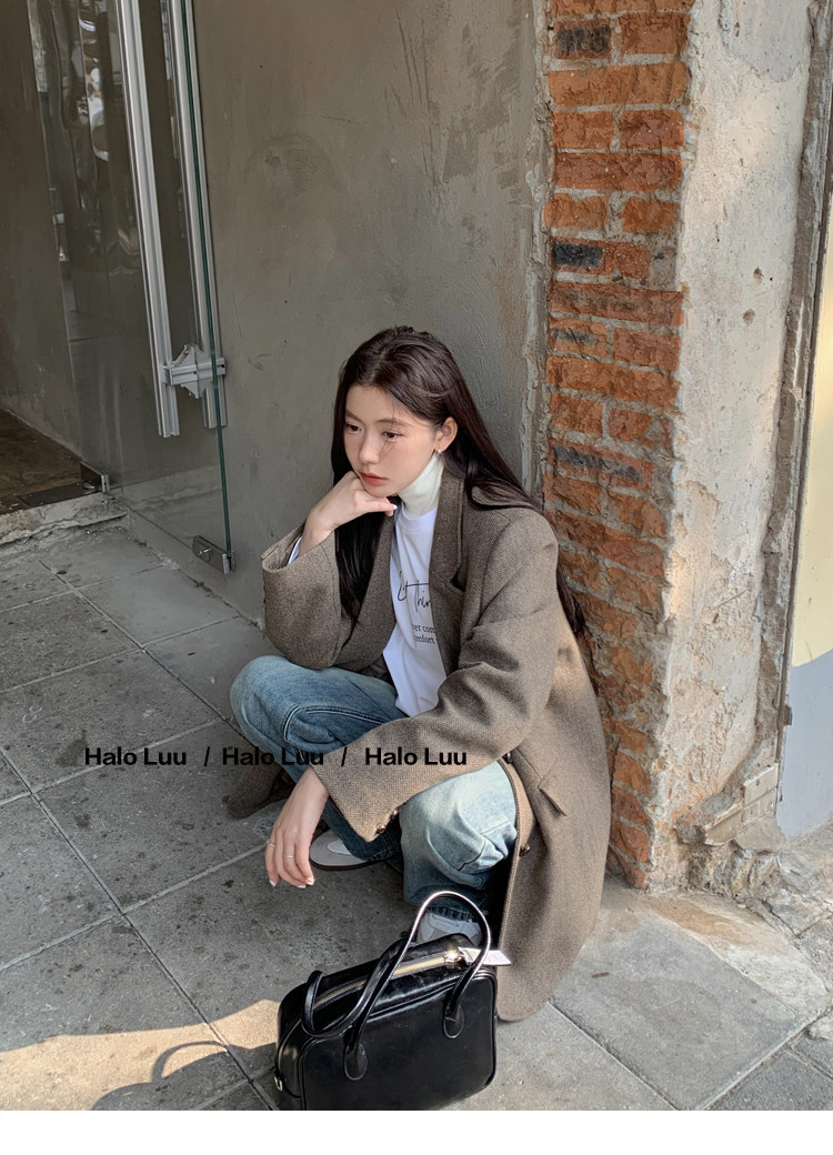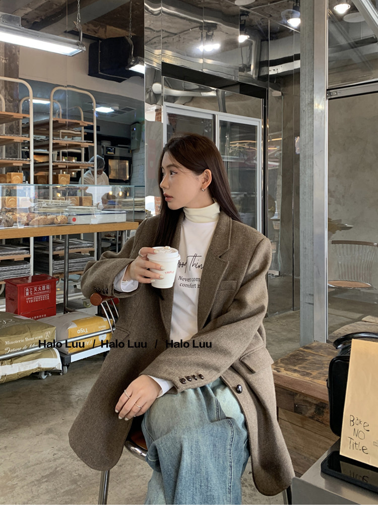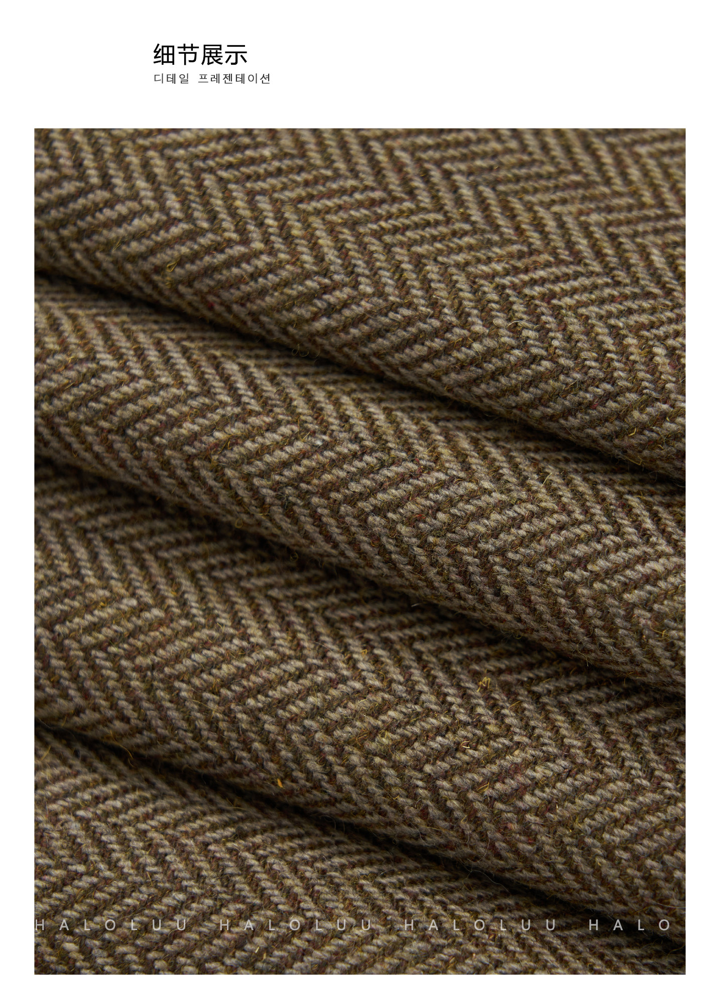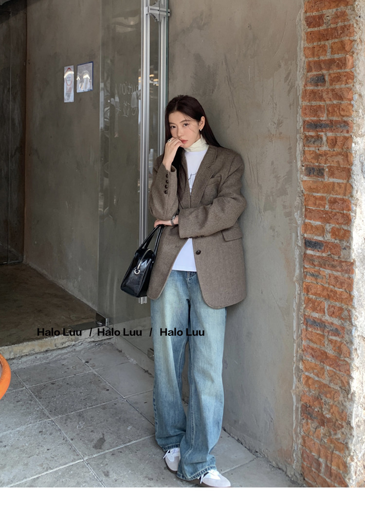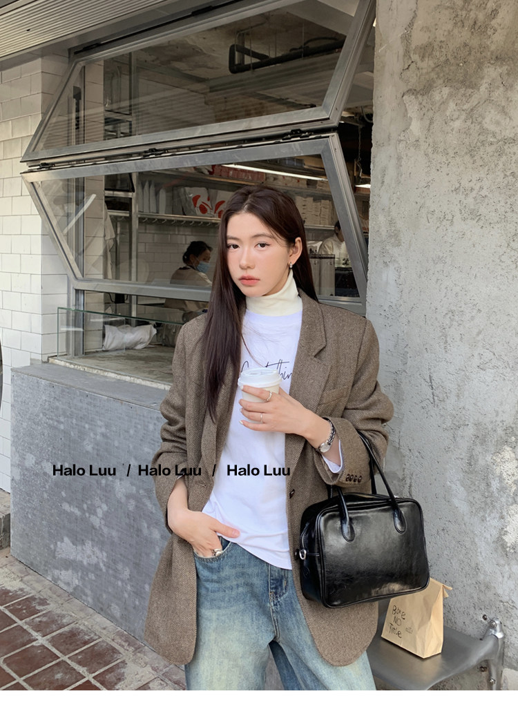 Halo Luu Herringbone Woolen Blazer for Women, Spring Korean Style Casual Brown High-End Wool Suit