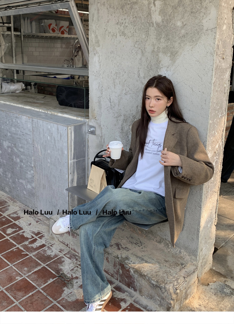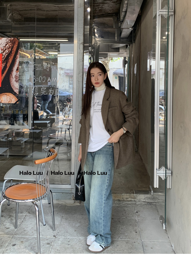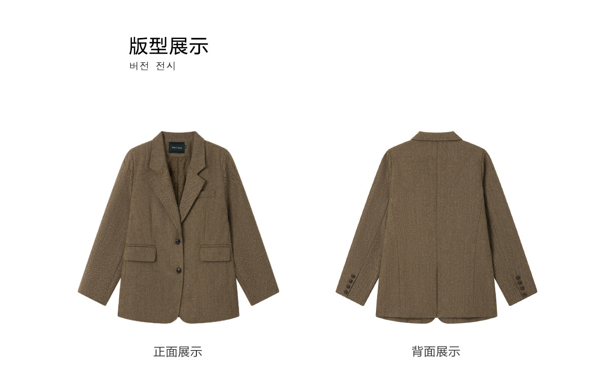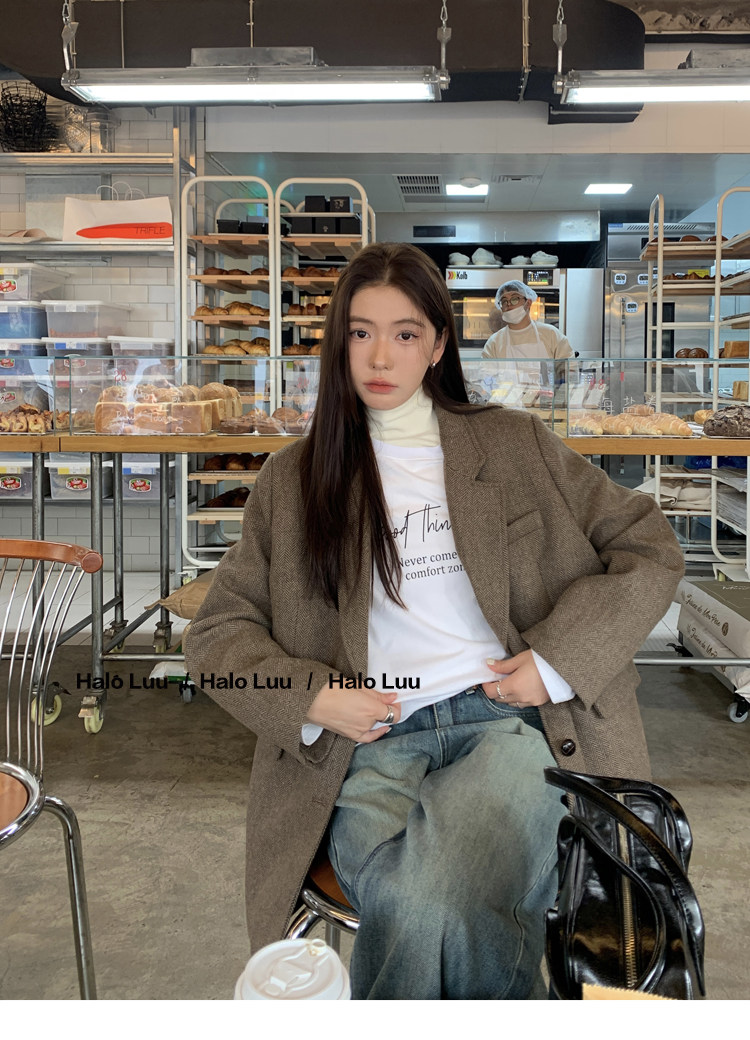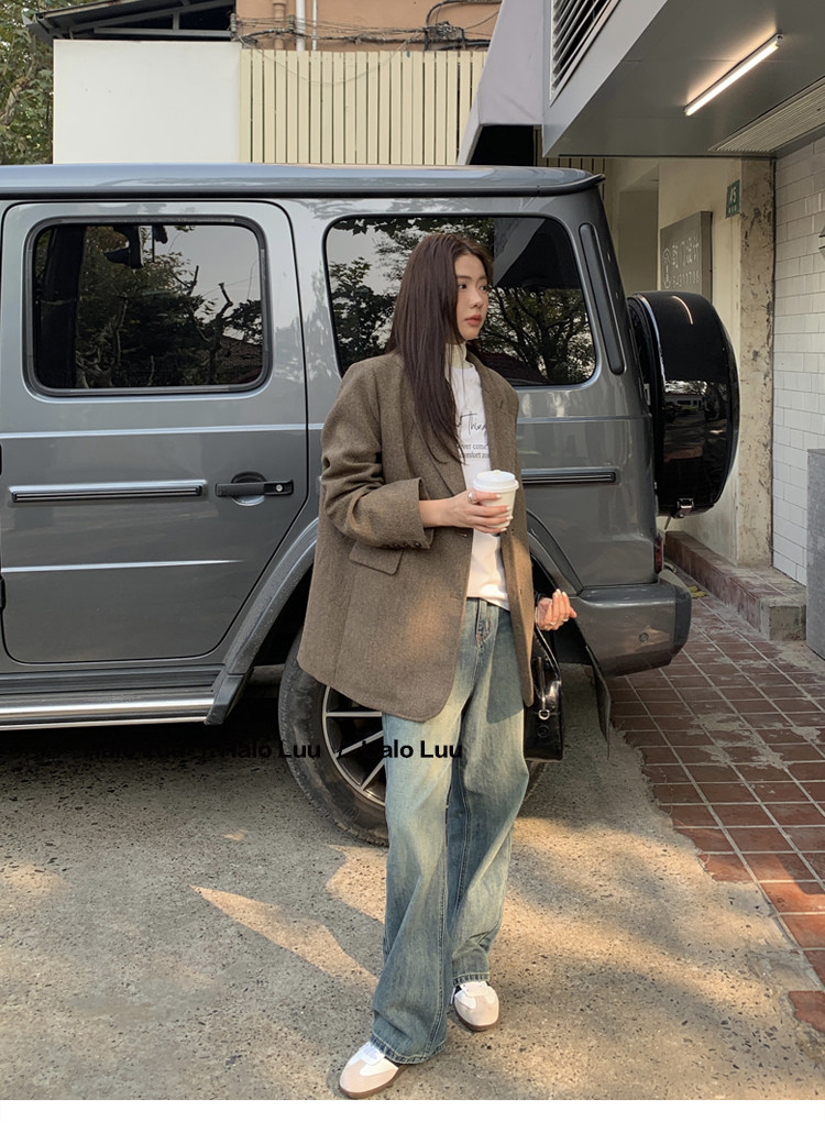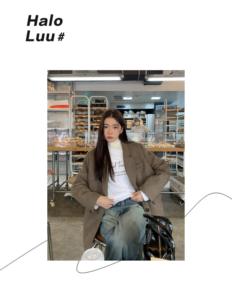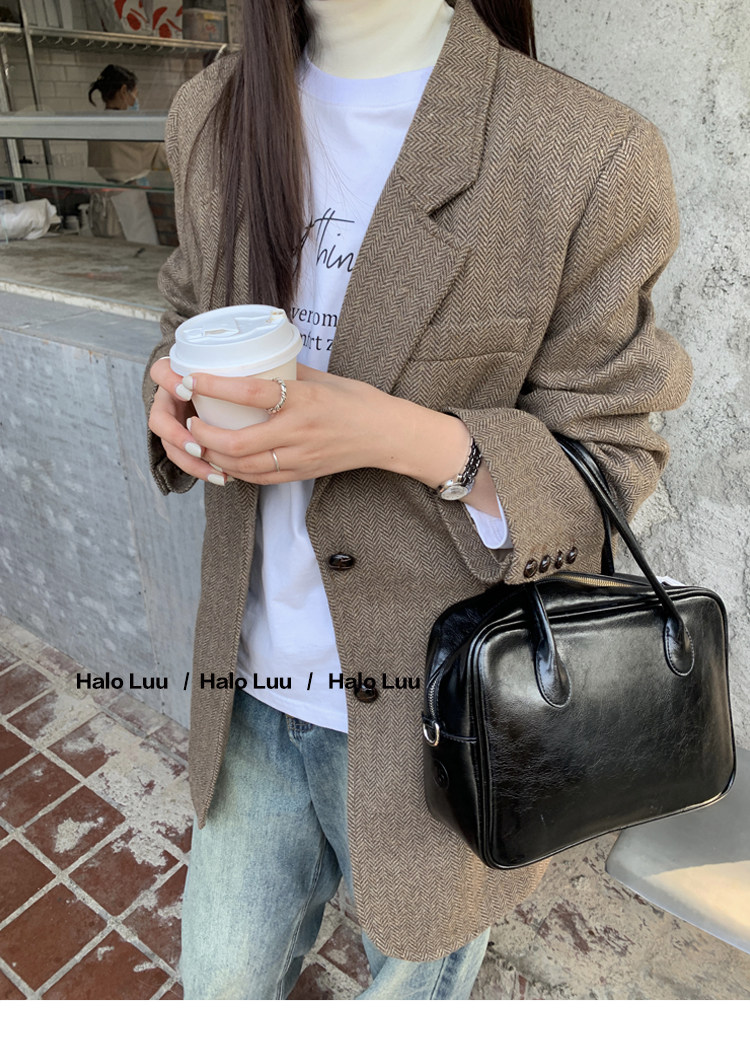 Halo Luu Herringbone Woolen Blazer for Women, Spring Korean Style Casual Brown High-End Wool Suit