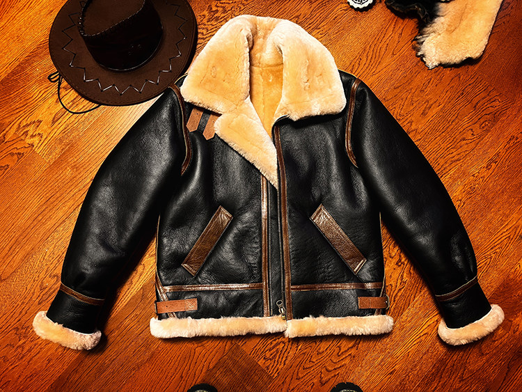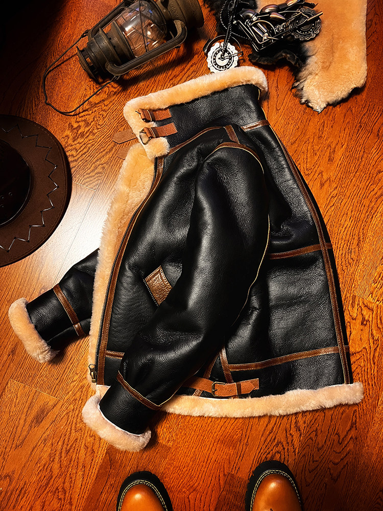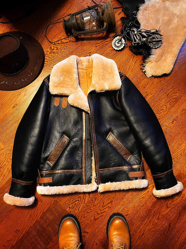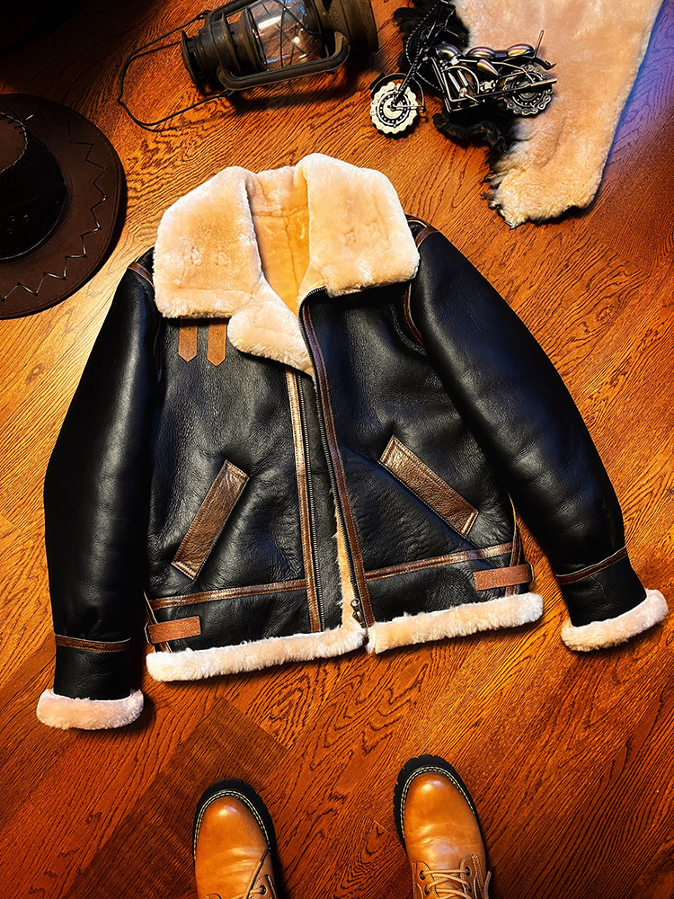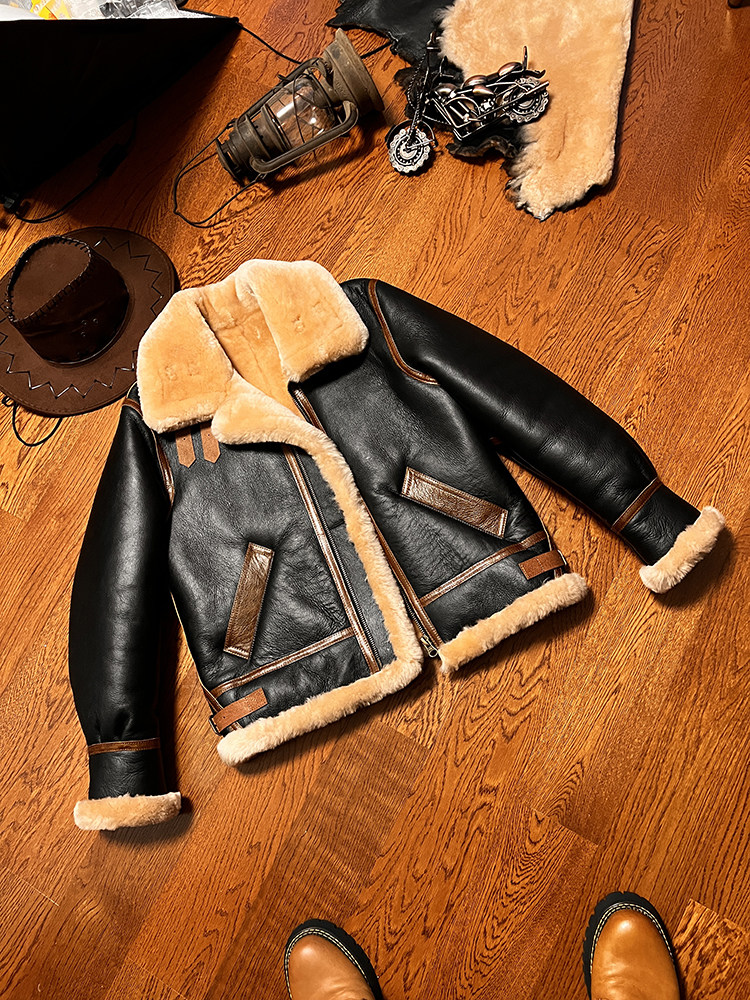 B3 Original Shearling Flight Suit Men's Lambskin Genuine Leather Motorcycle Short Jacket Fur Coat Thick