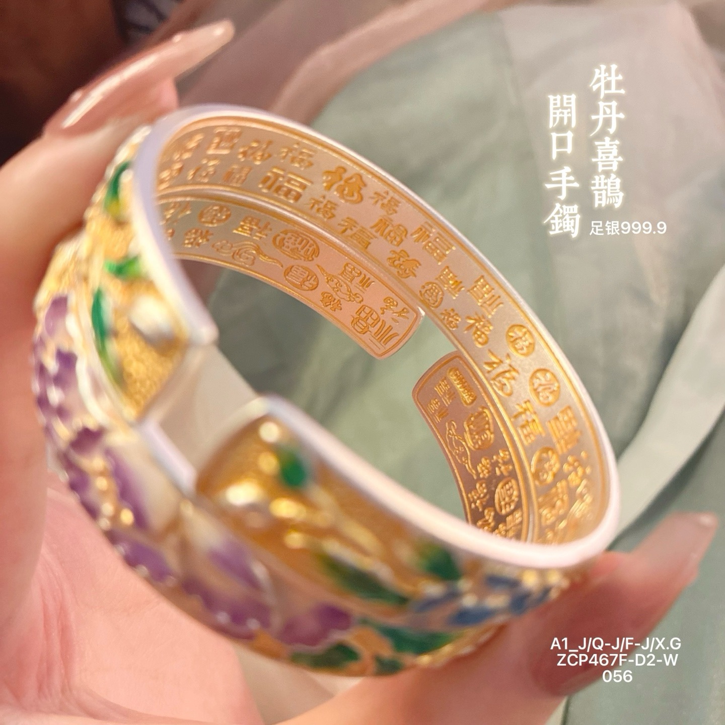 Silver 9999 Gold-Plated Open-Ended Pure Silver Enamel Bracelet for Women, New Chinese Style