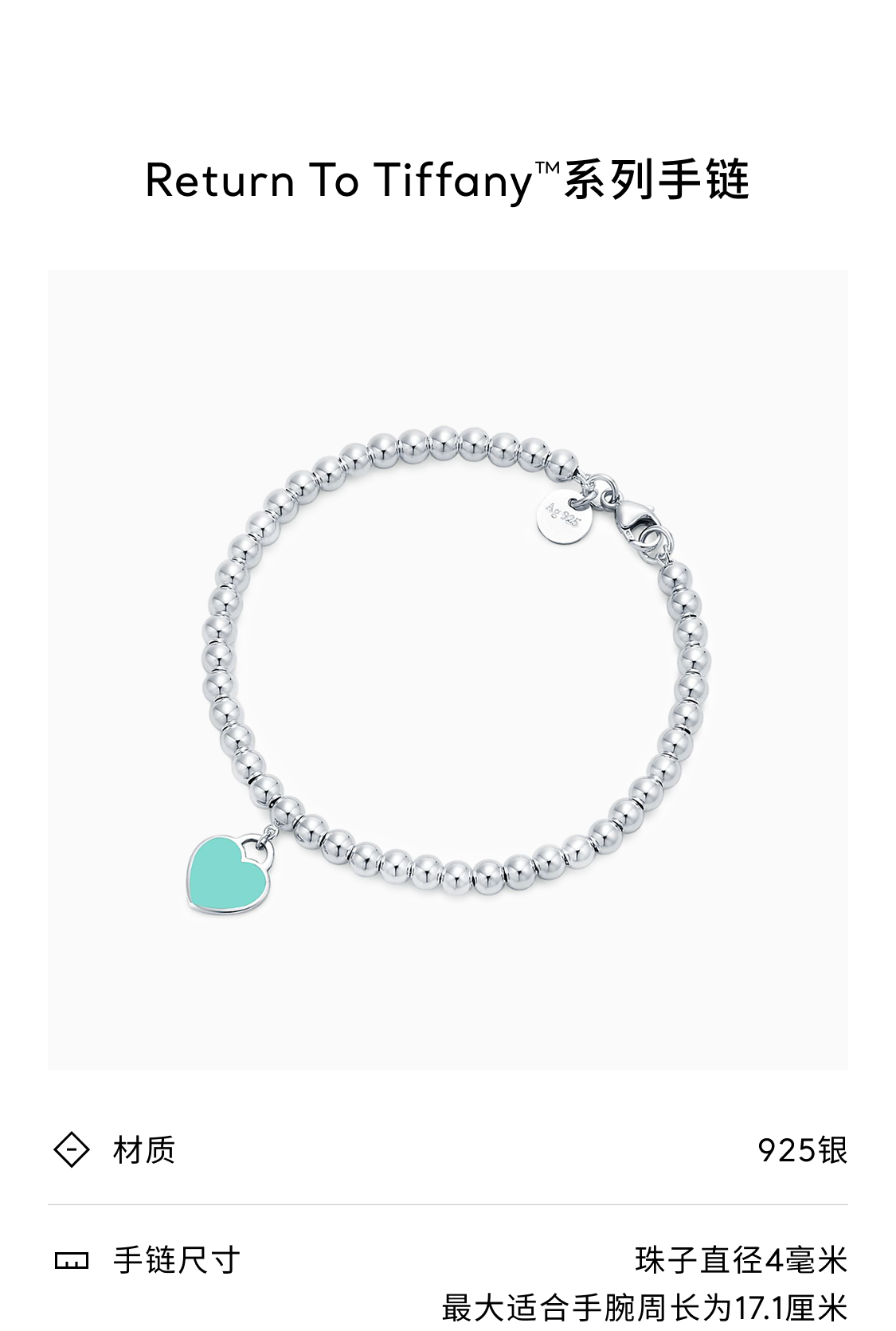 尺码:银 925 吊饰搭配 Tiffany Blue® 蒂芙尼蓝色珐琅;配珠式手链;醒目的 Tiffany Blue® 蒂芙尼蓝色珐琅吊饰延续了品牌自 1837 年创立以来的经典风格,打造了一抹鲜明的色彩