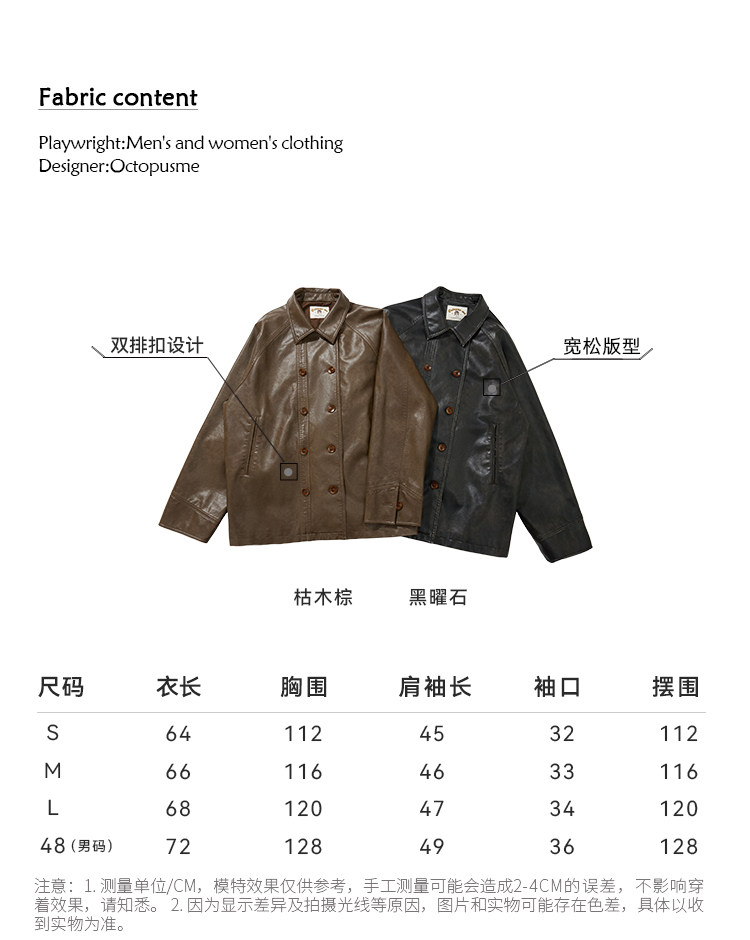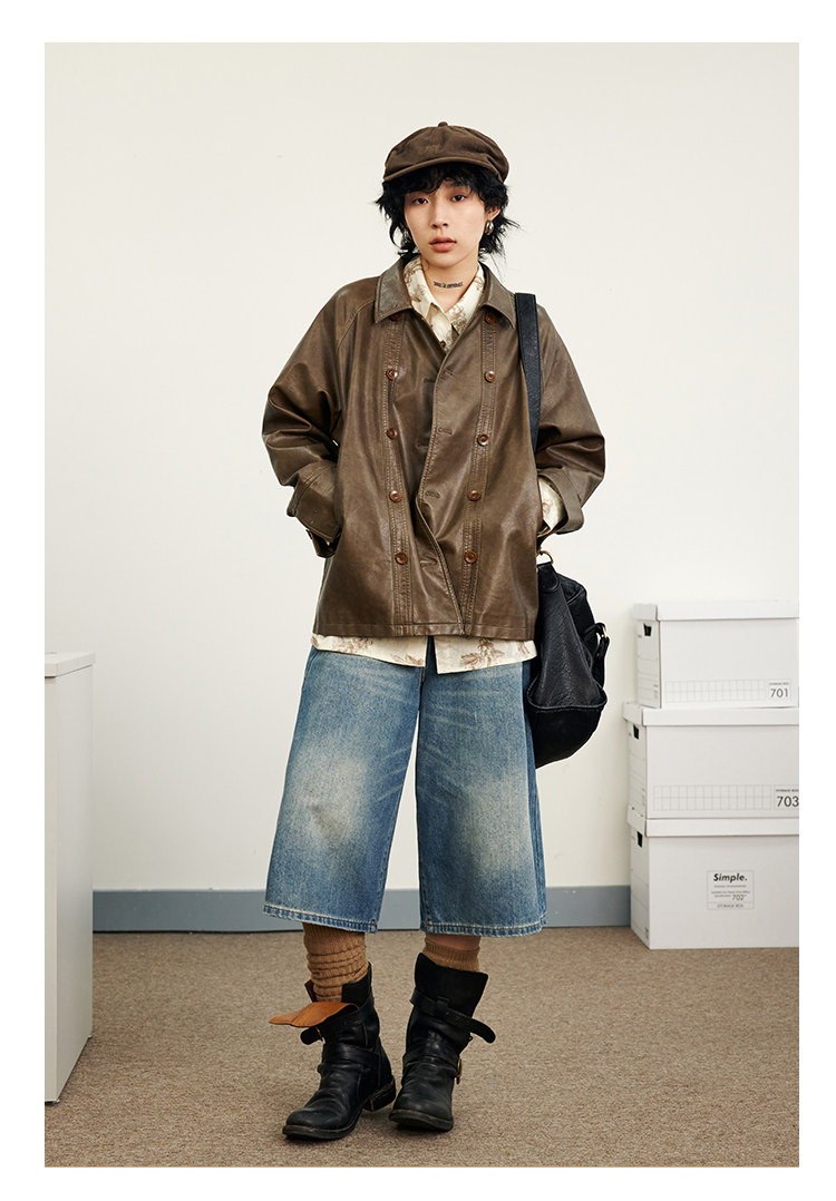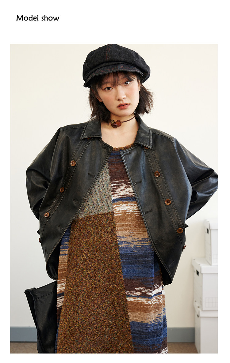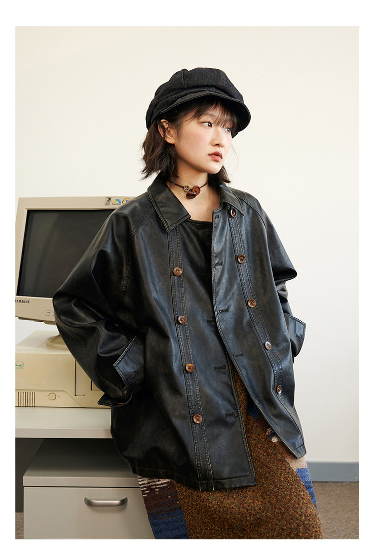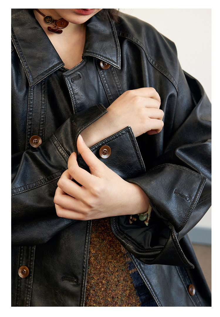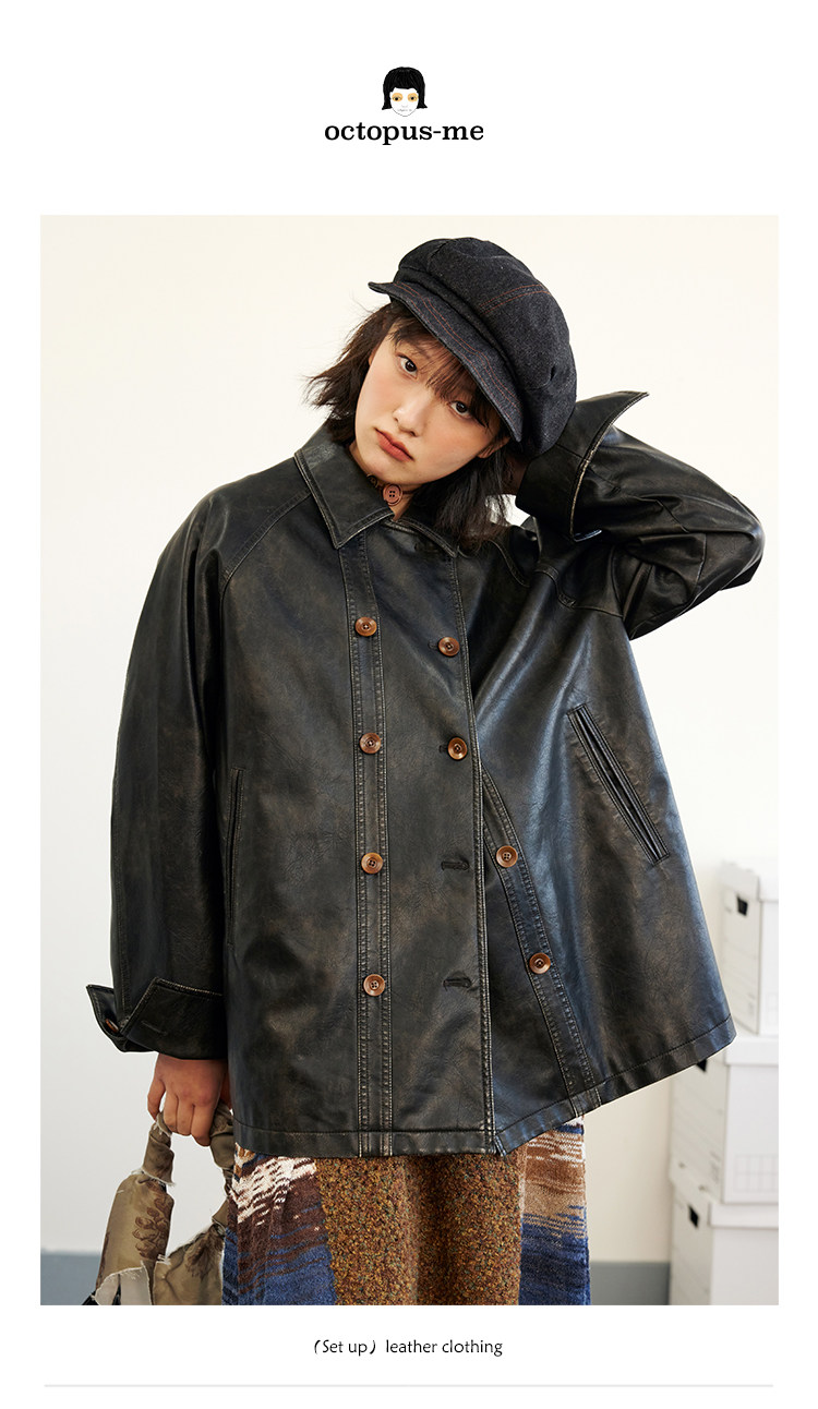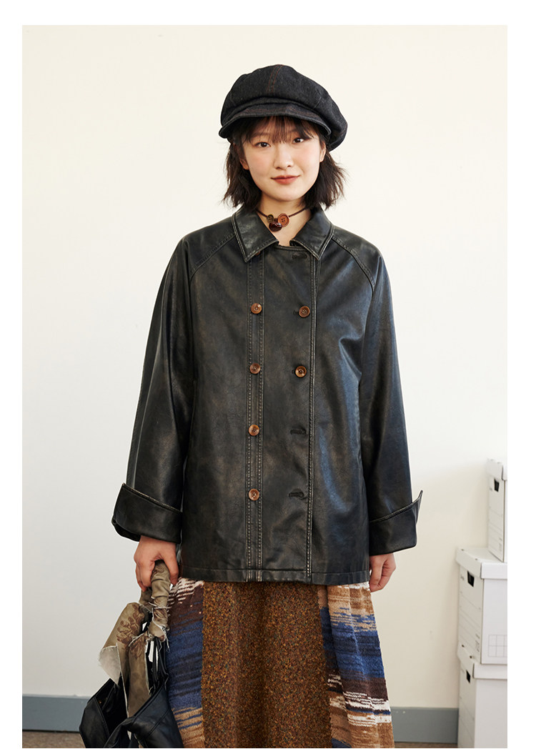 Octopusme Retro Distressed Black Leather Jacket for Women, Spring and Autumn Double-Breasted Biker Leather Jacket