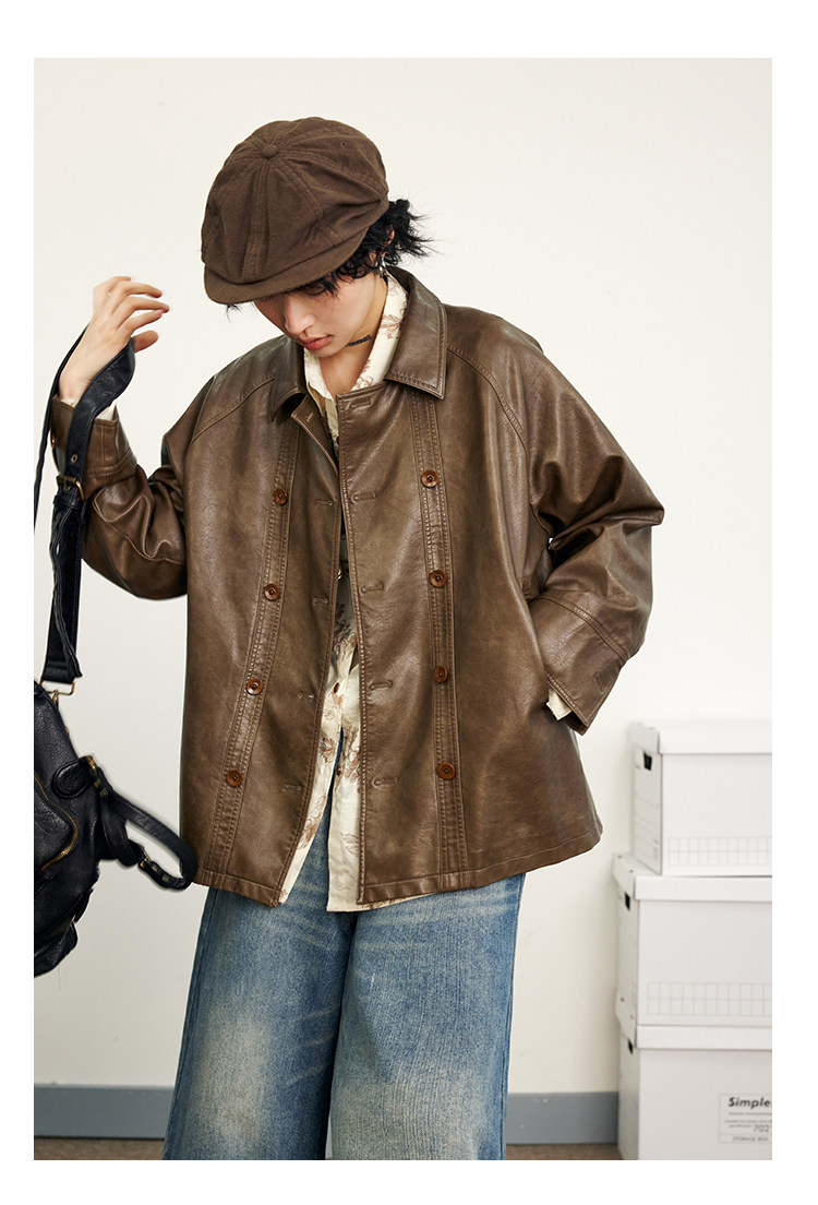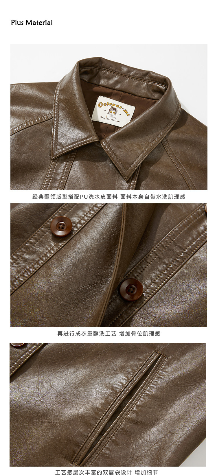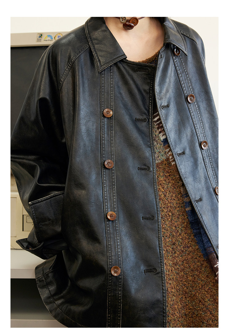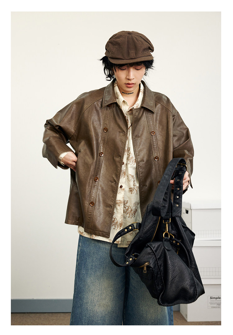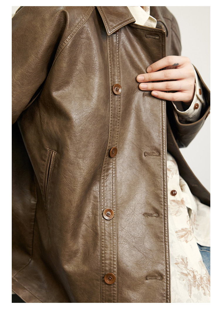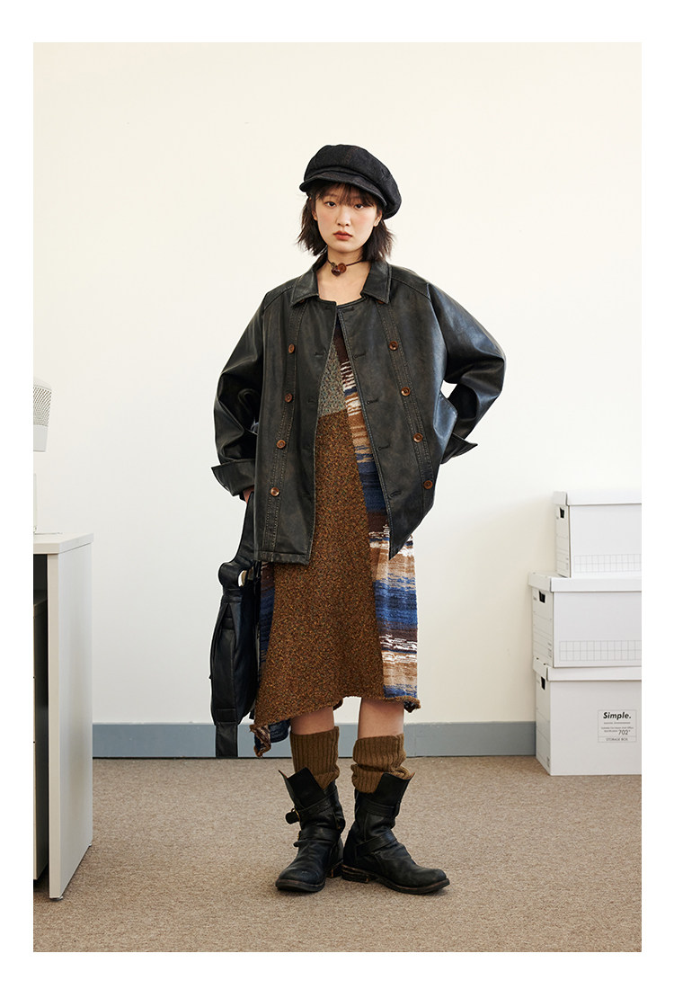 Octopusme Retro Distressed Black Leather Jacket for Women, Spring and Autumn Double-Breasted Biker Leather Jacket