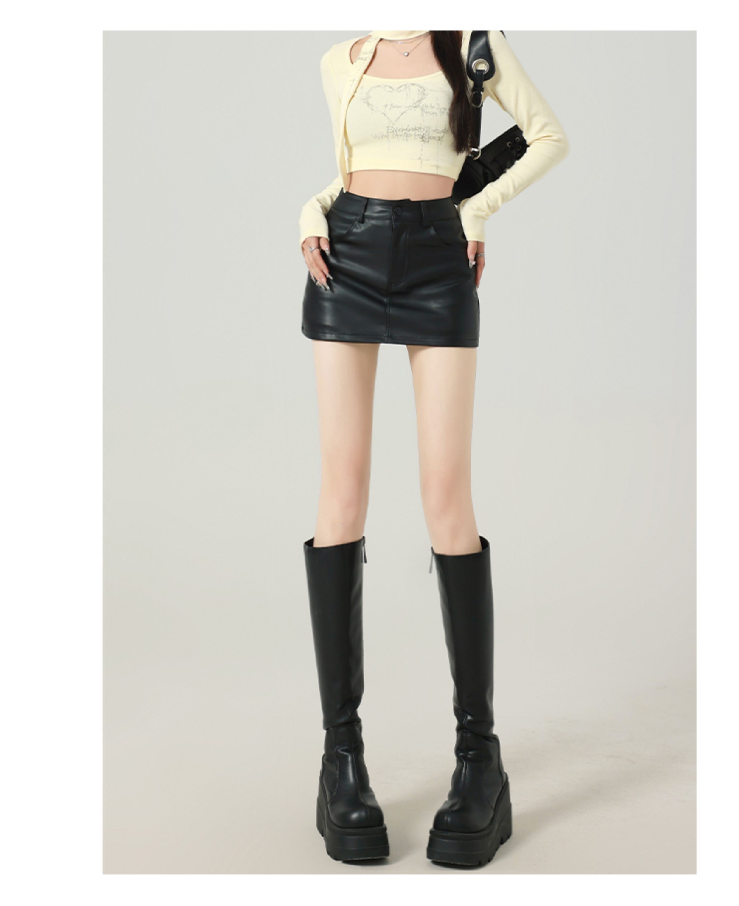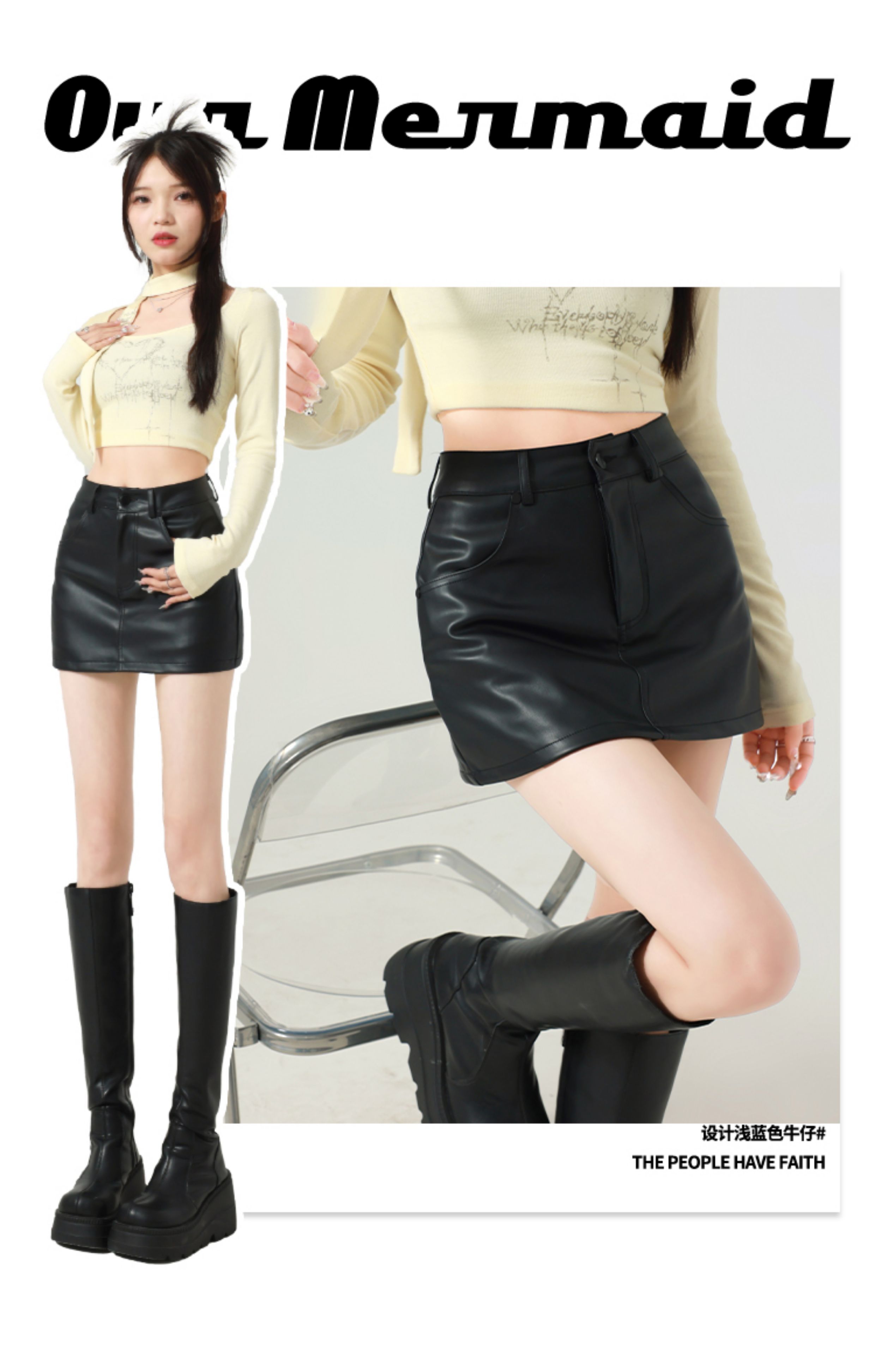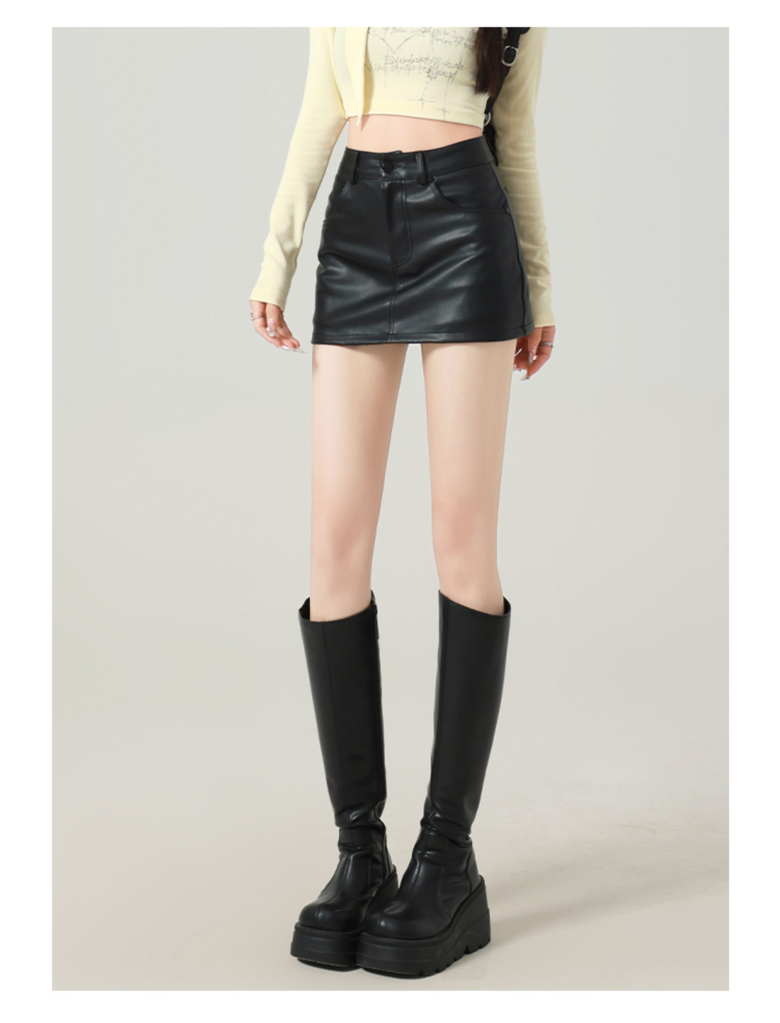 Black Pu Leather Skirt High-Waisted Half Skirt for Women 2025 Autumn New A-Line Lined Petite Hip-Hugging Short Skirt Pants