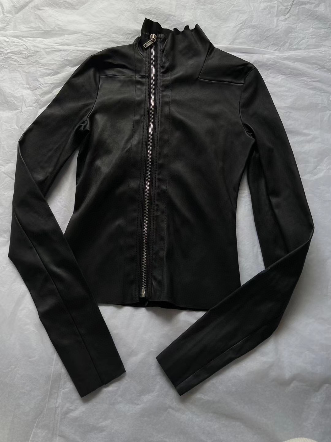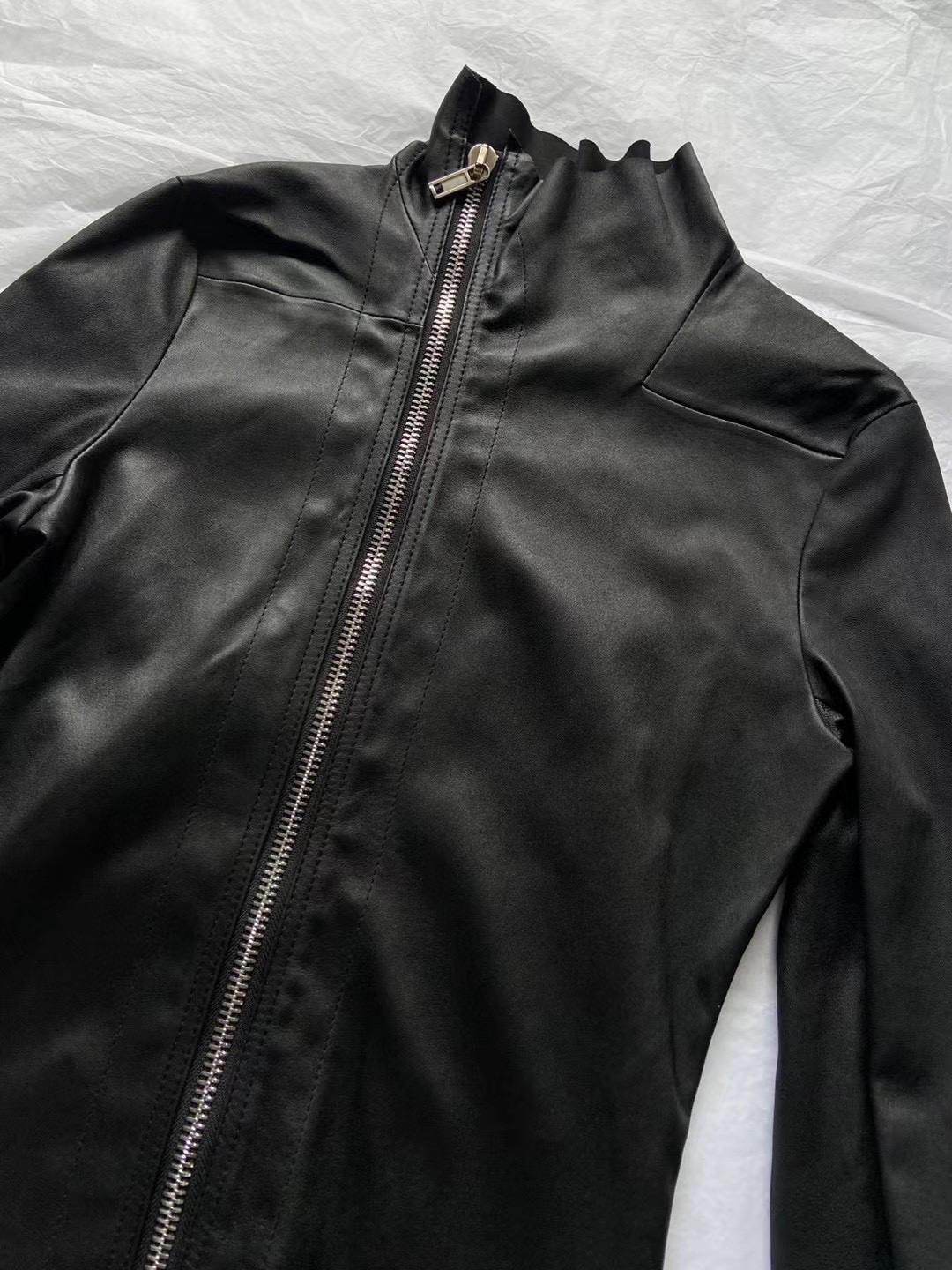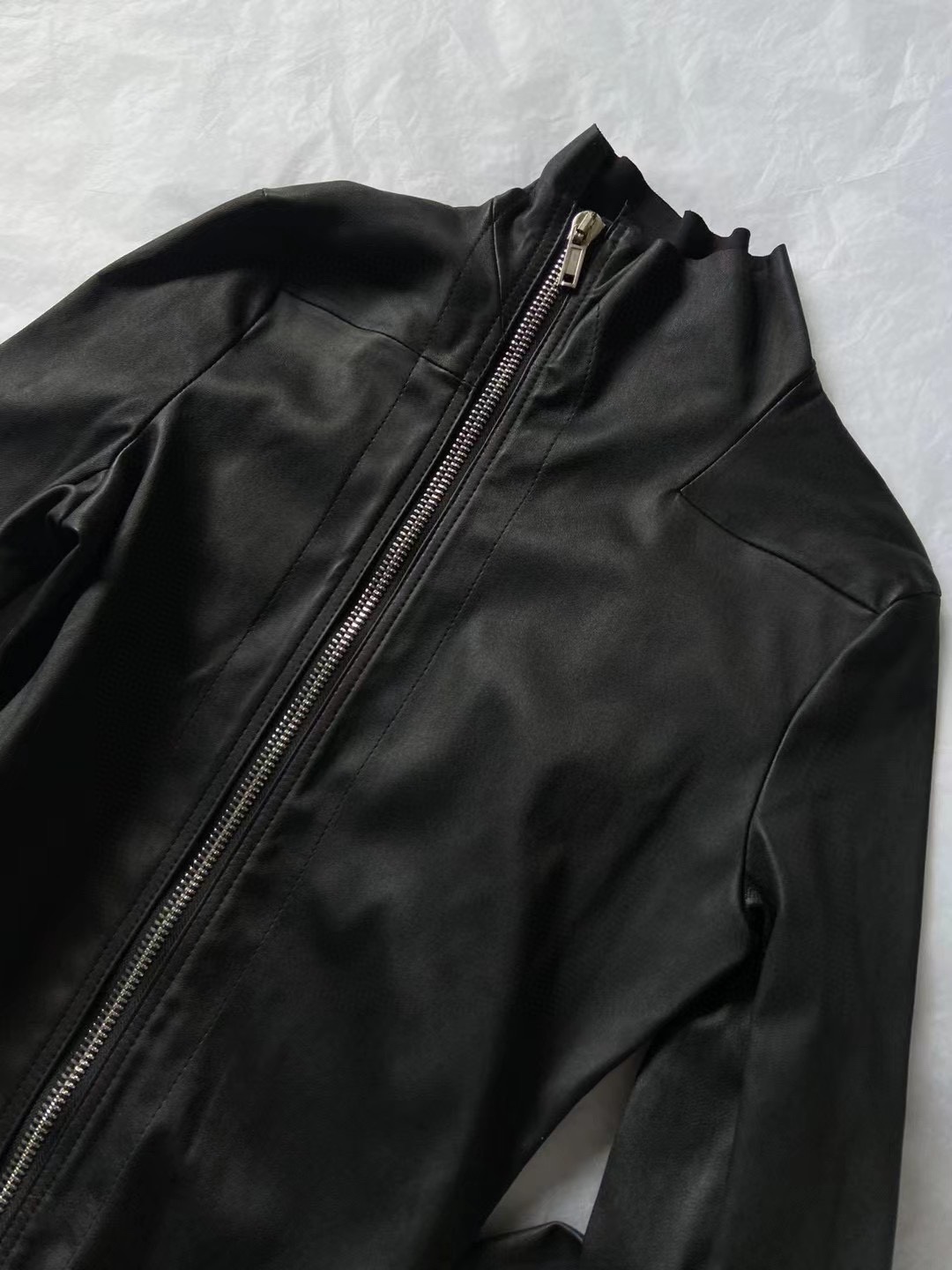 24Fw Dark Ro Style High Collar Diagonal Zipper Pu Leather Stretch Slim Fit Versatile Leather Jacket Motorcycle Jacket for Women