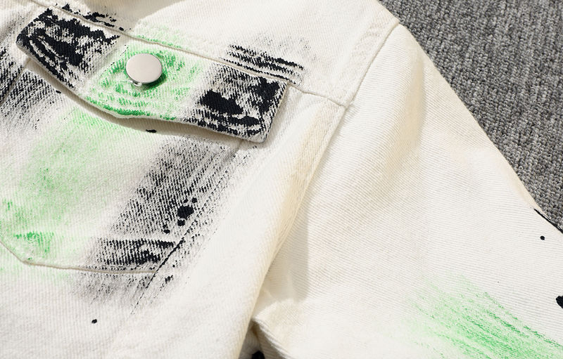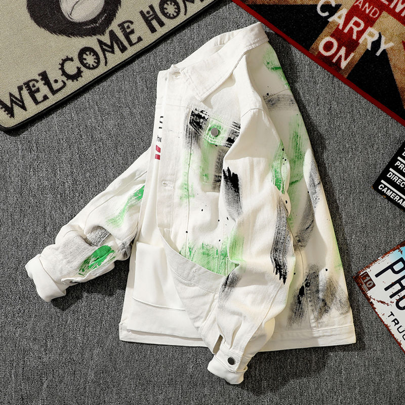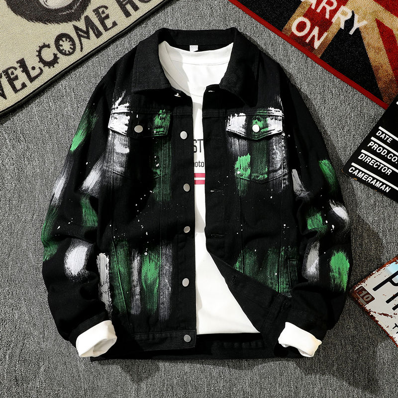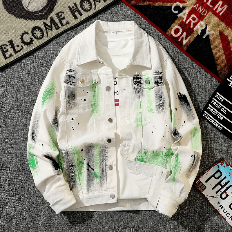 Trendy Retro Hand-Painted Splatter Graffiti Denim Jacket for Men, Spring and Autumn Casual Loose High Street Cool Workwear Jacket