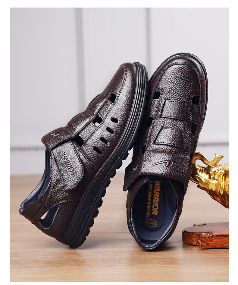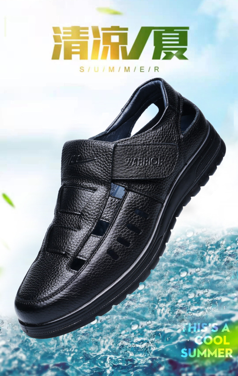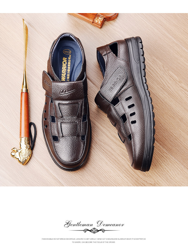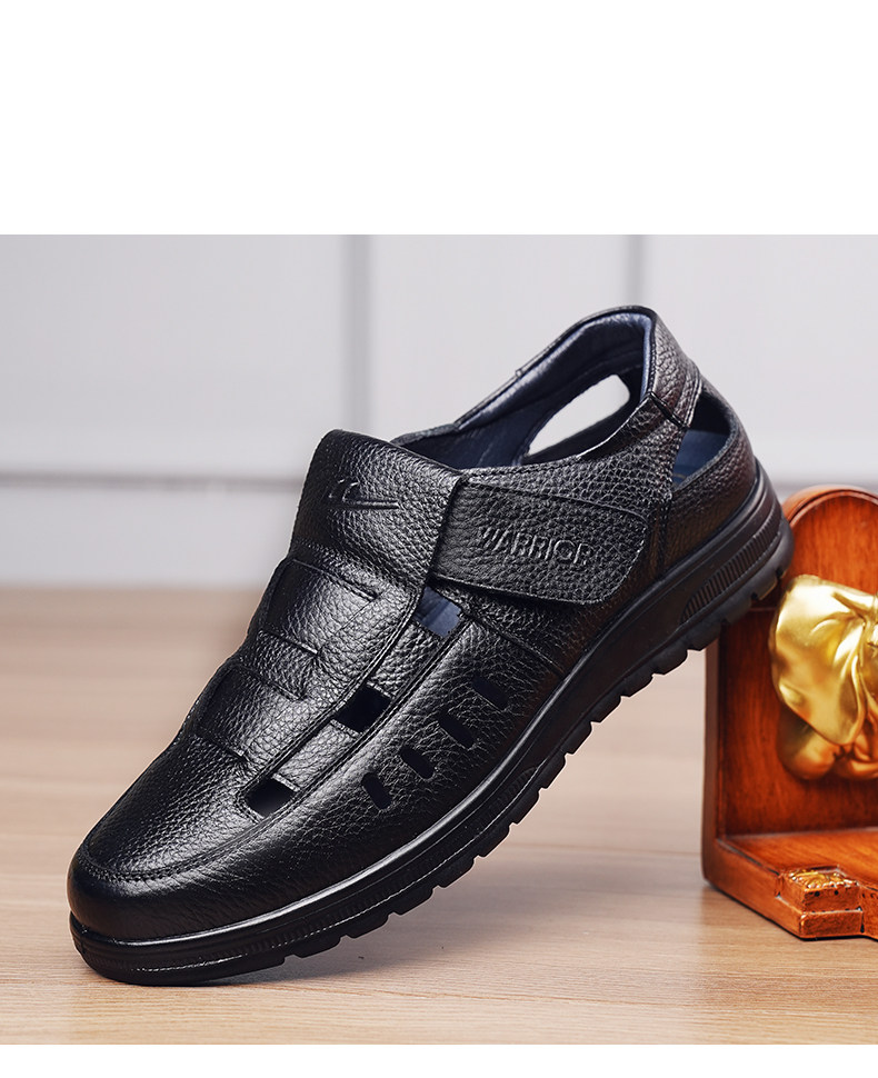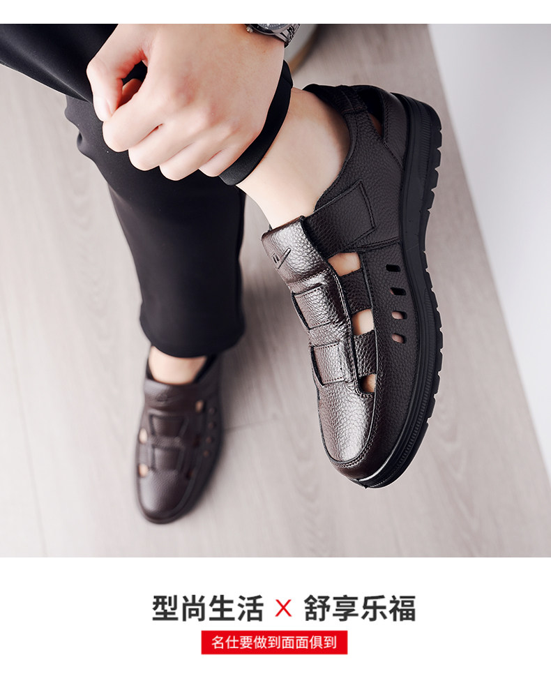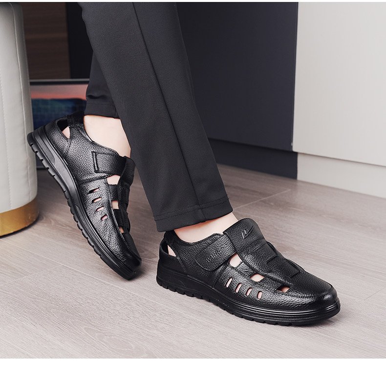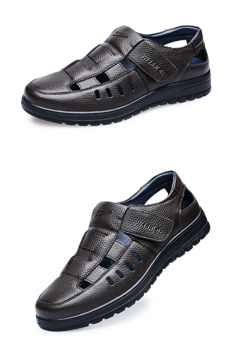 Pull-Back Leather Sandals for Men, Genuine Leather Summer Men's Closed-Toe Soft-Soled Sandals, Breathable Hollow-Out Shoes for Middle-Aged and Elderly Men, Dad Shoes