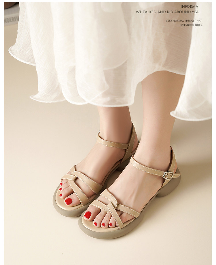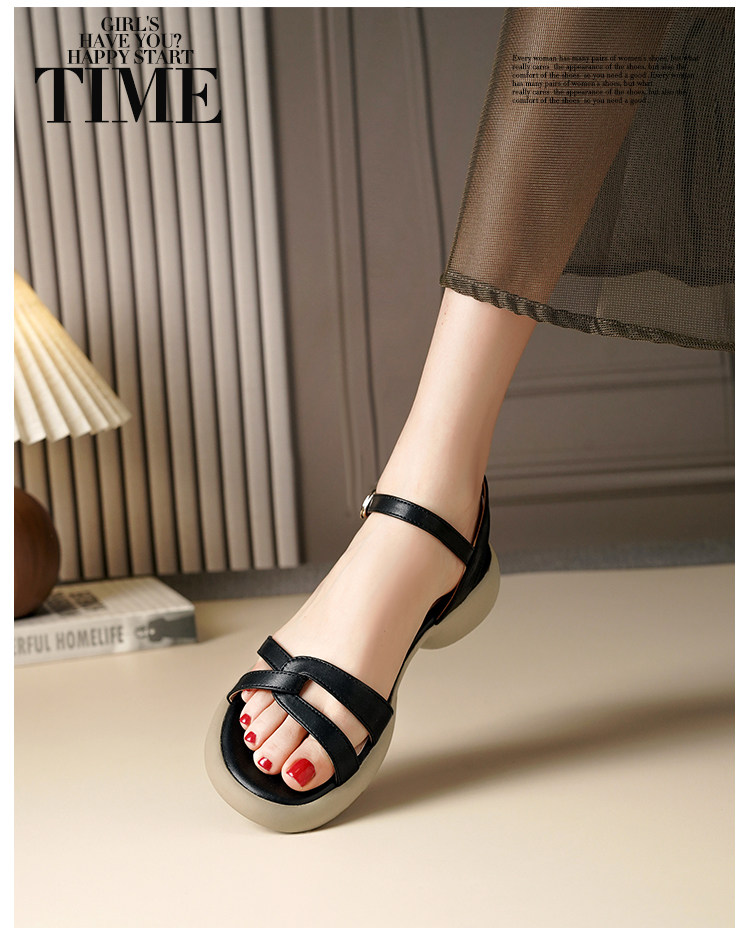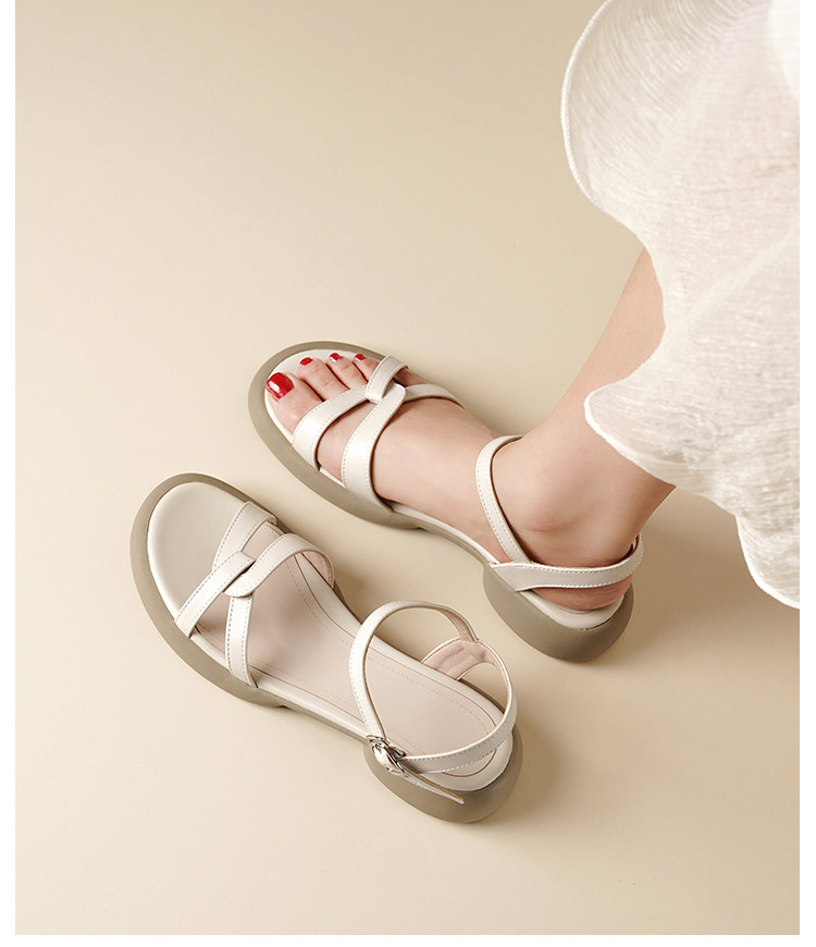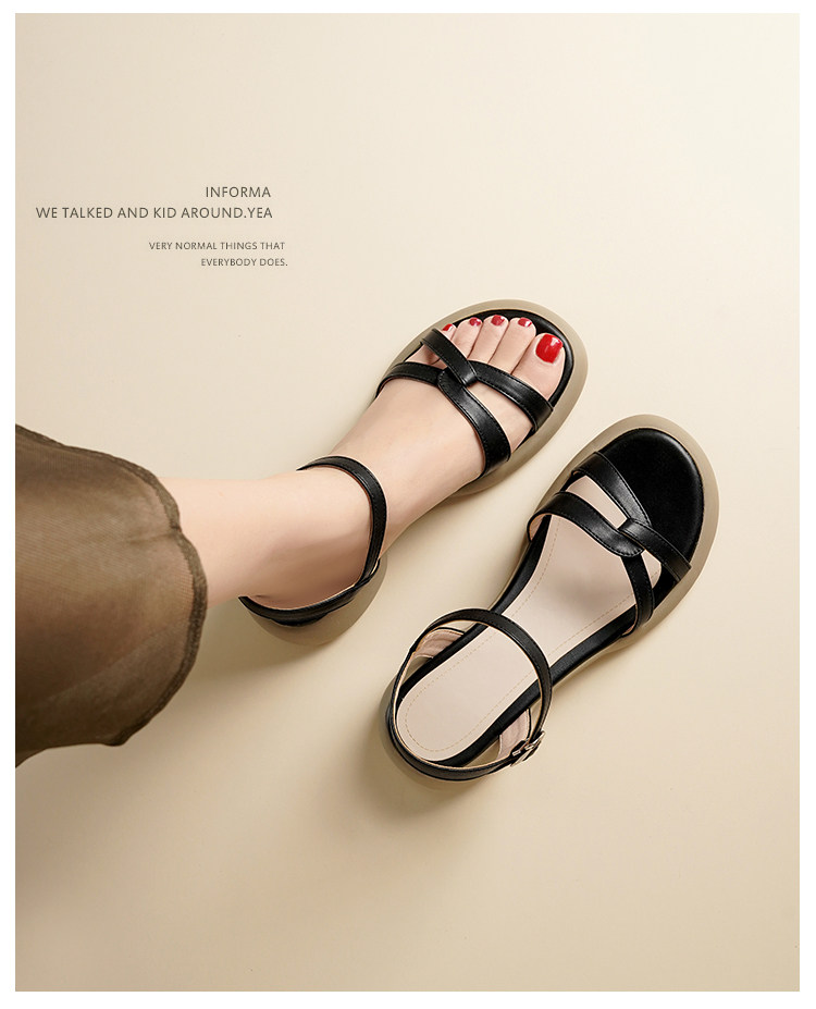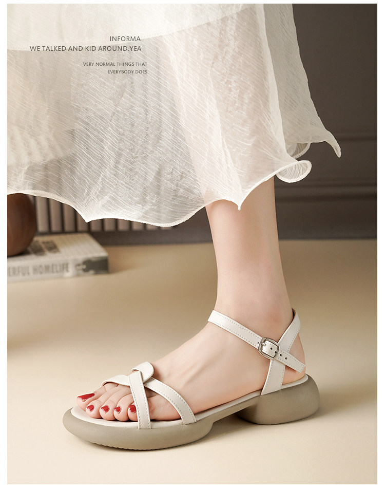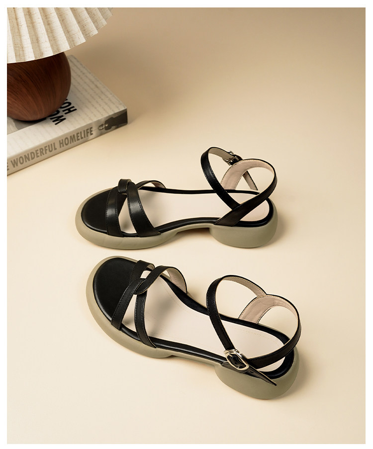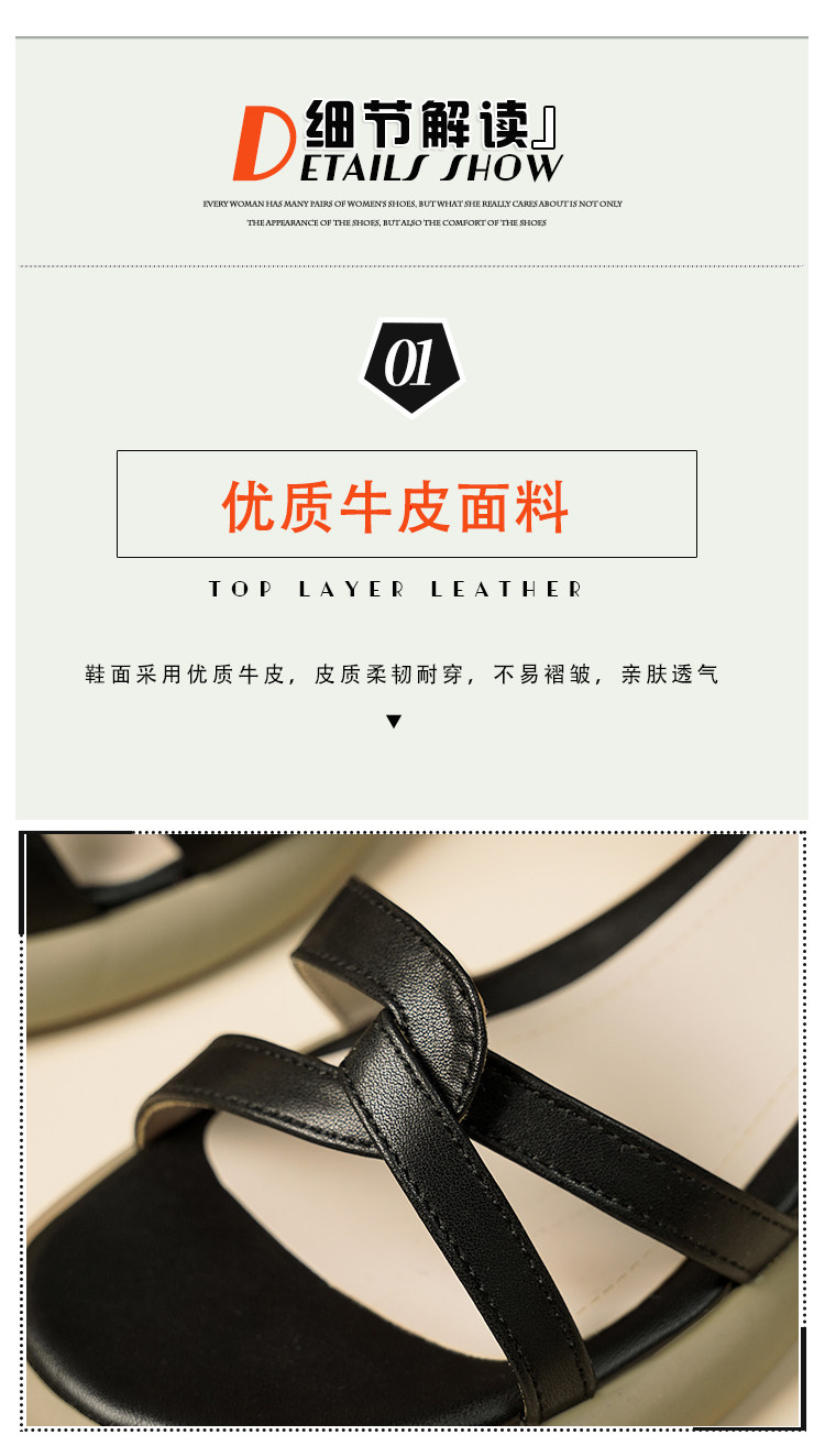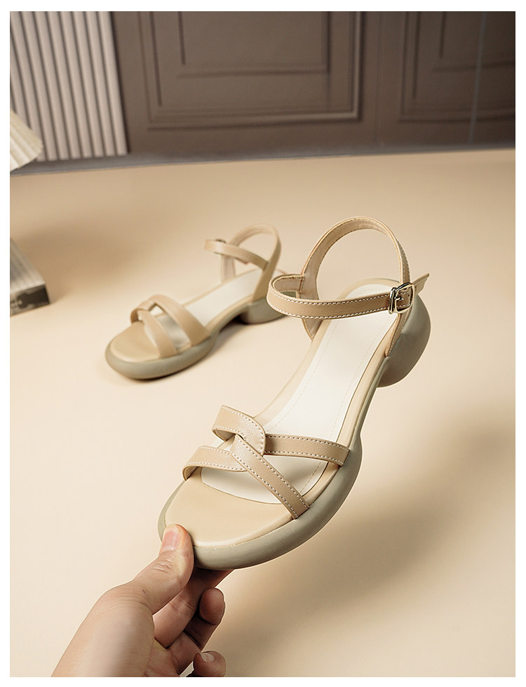 Full Cowhide Genuine Leather Round Toe Open Toe Low Heel Fashionable New Sandals for Women Summer Thick Sole Low Heel Soft Sole Non-Slip Women's Shoes