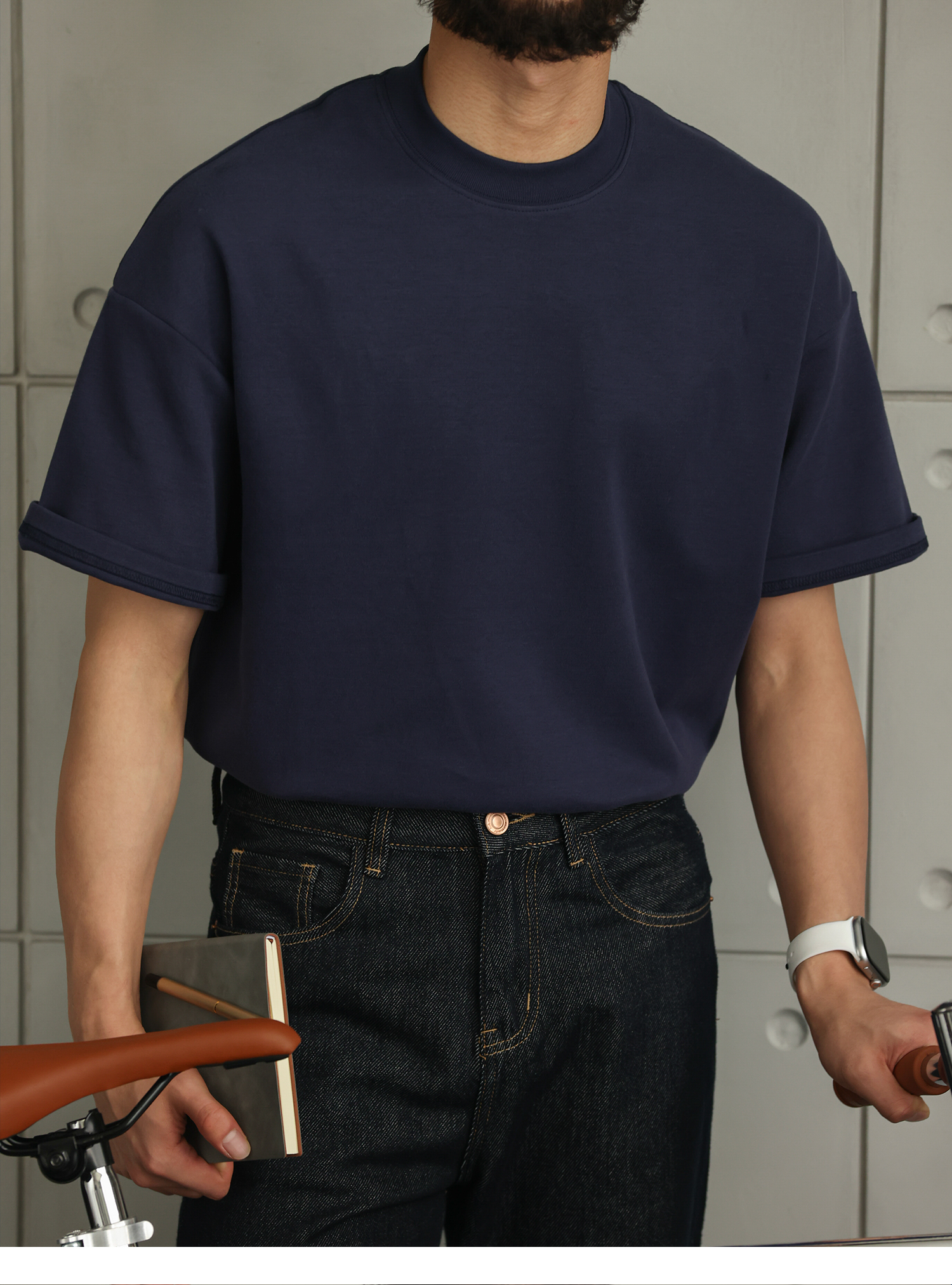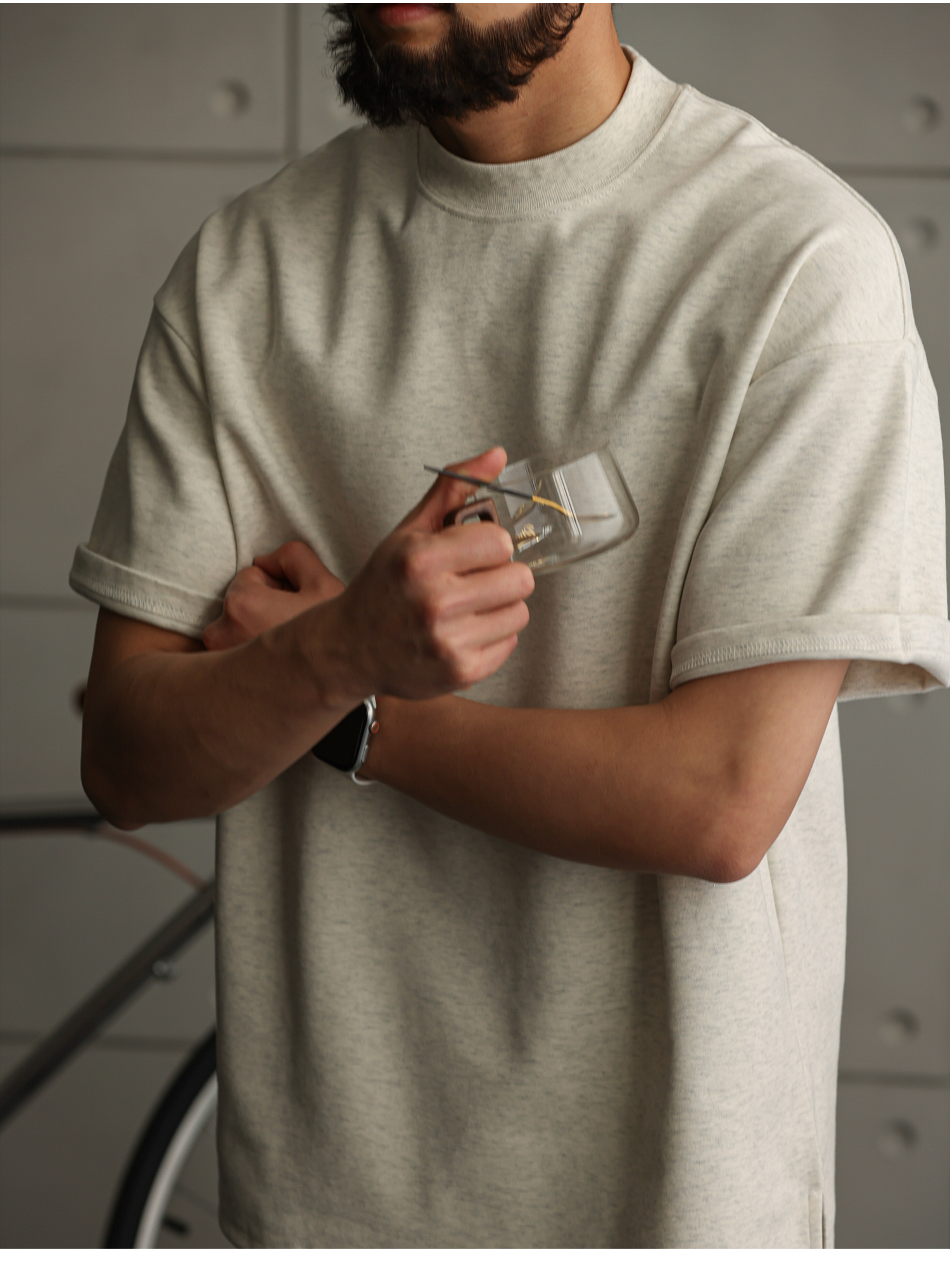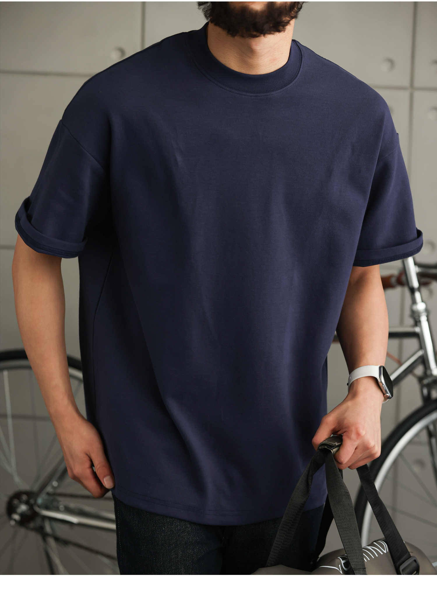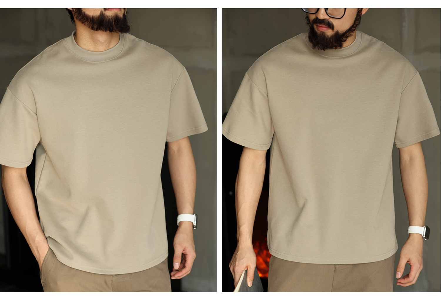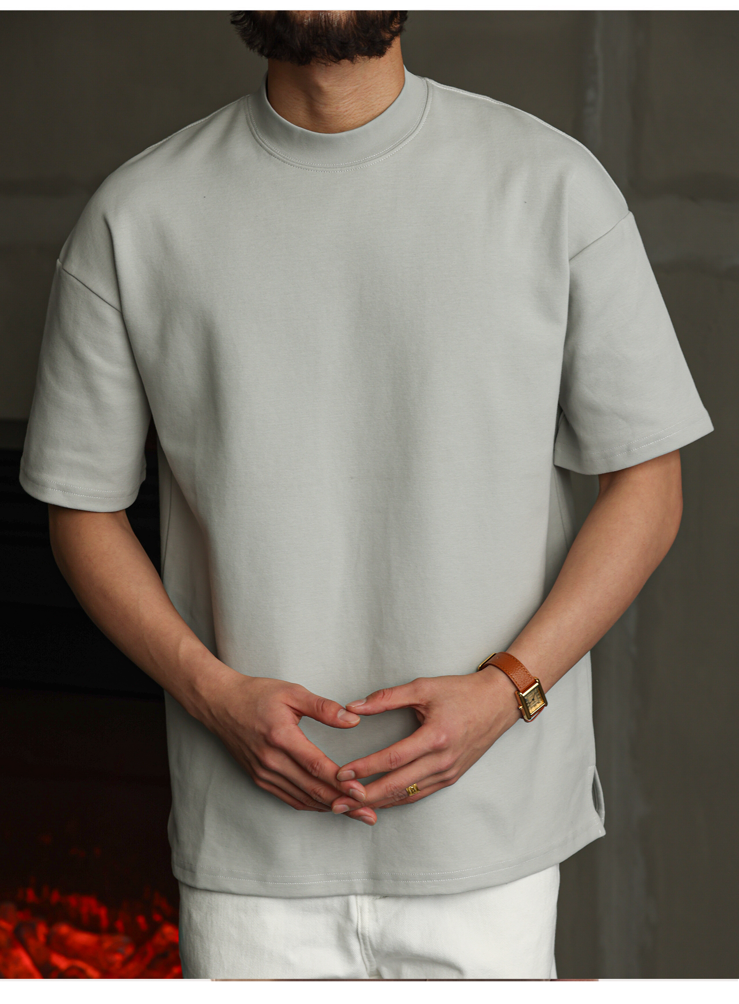 Summer Loose-Fitting Small-Neck Short-Sleeve T-Shirt for Men, Heavyweight 300g Solid Color Wrinkle-Resistant Half-Sleeve Five-Point T-Shirt with a Half-High Collar