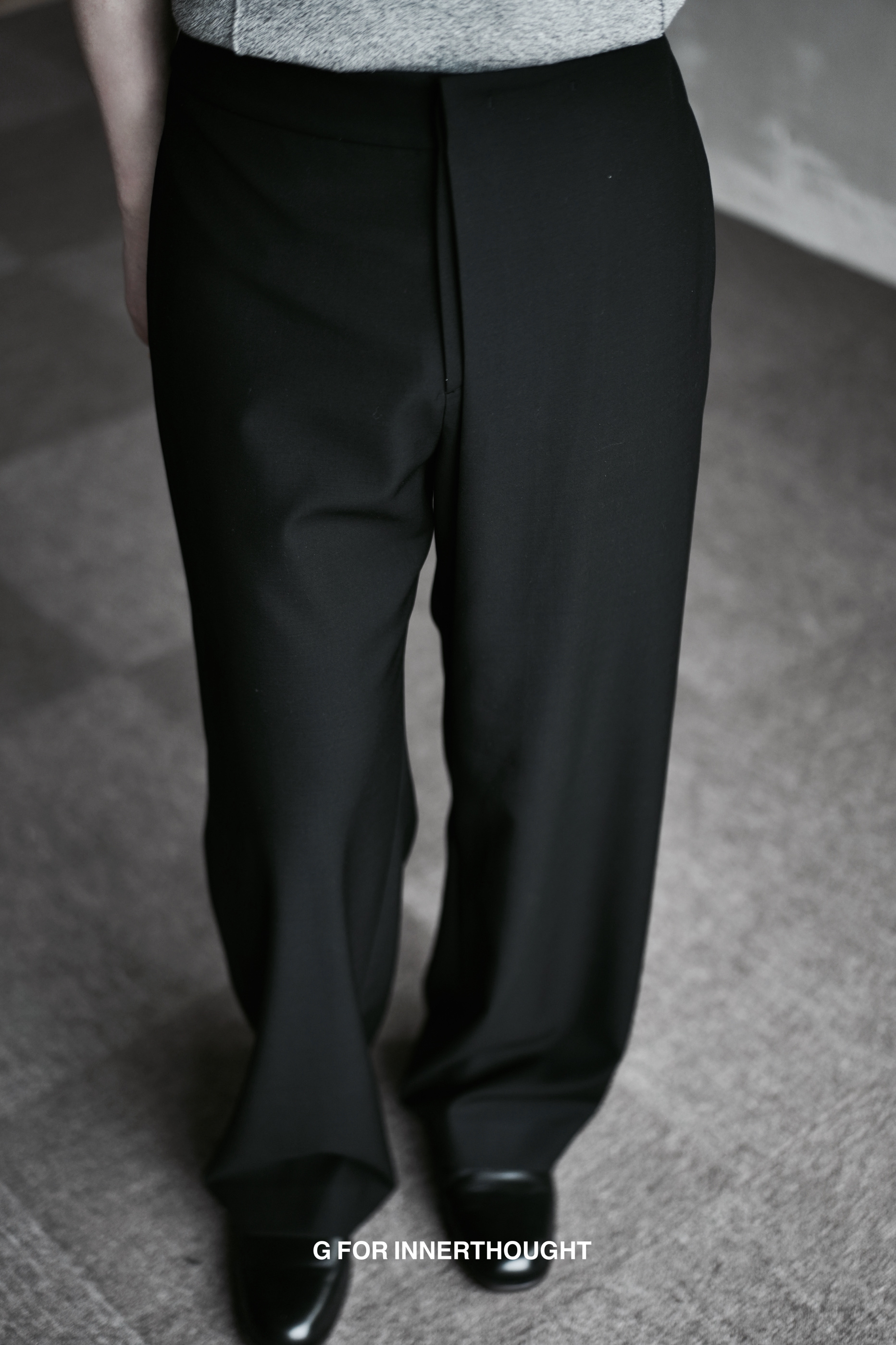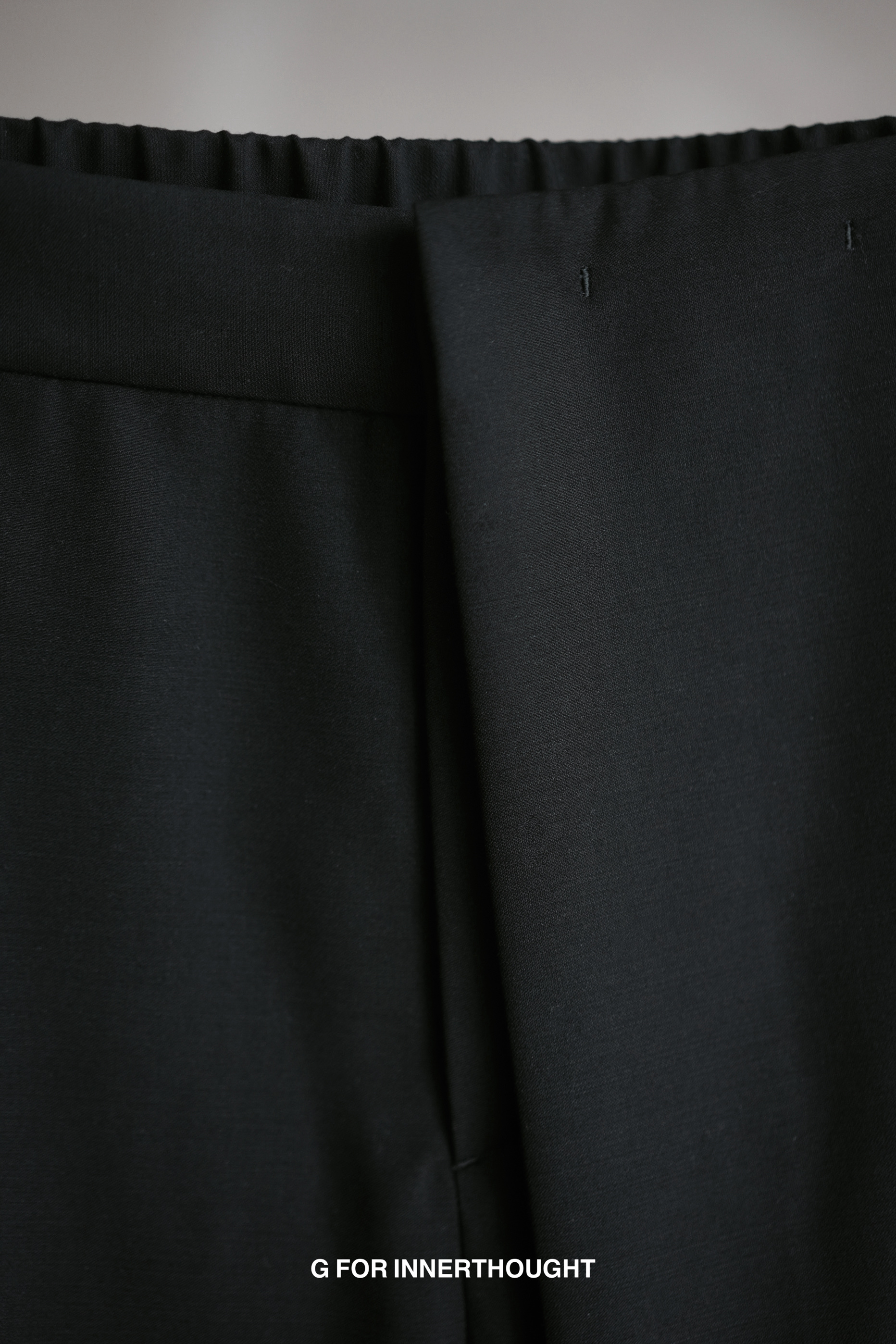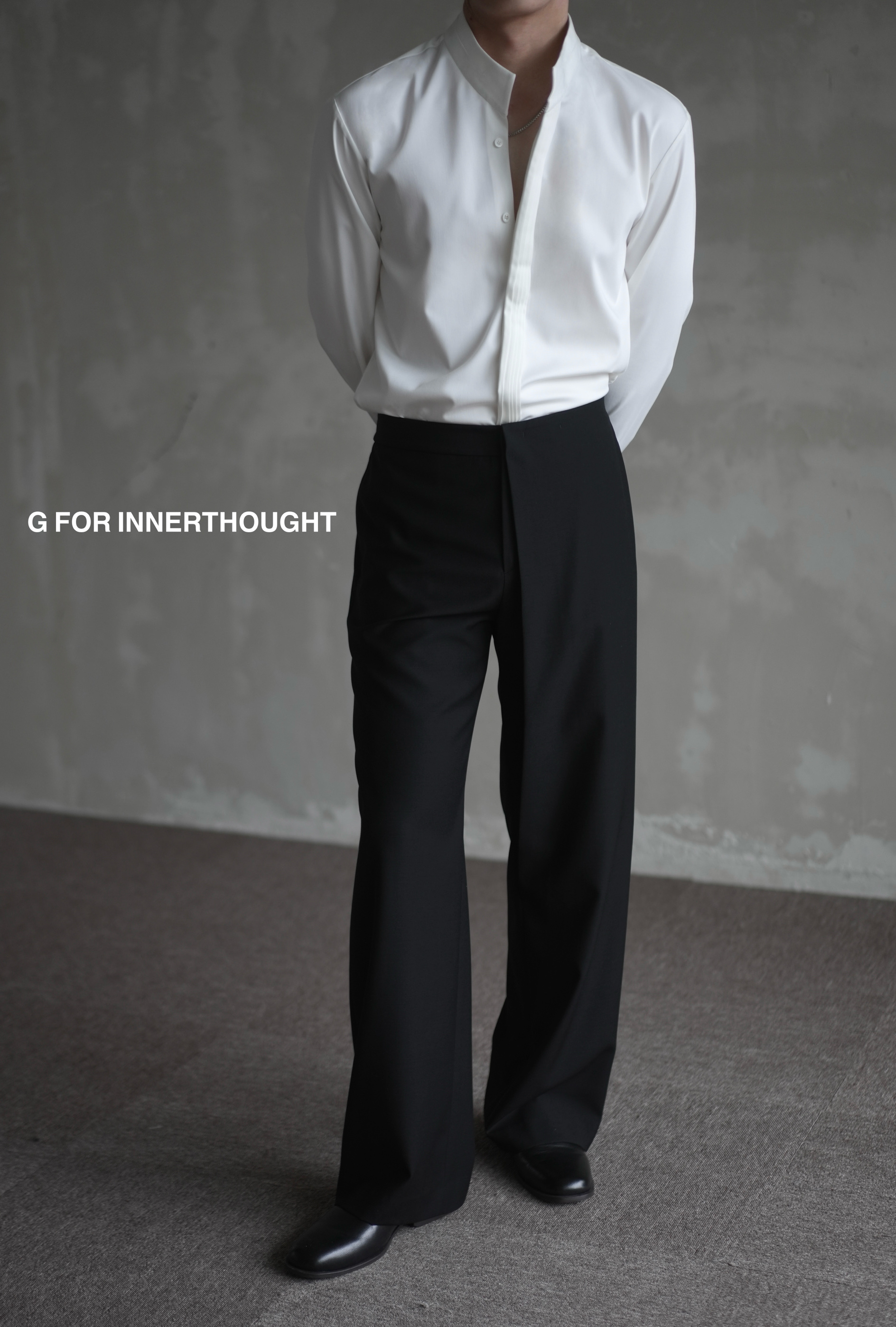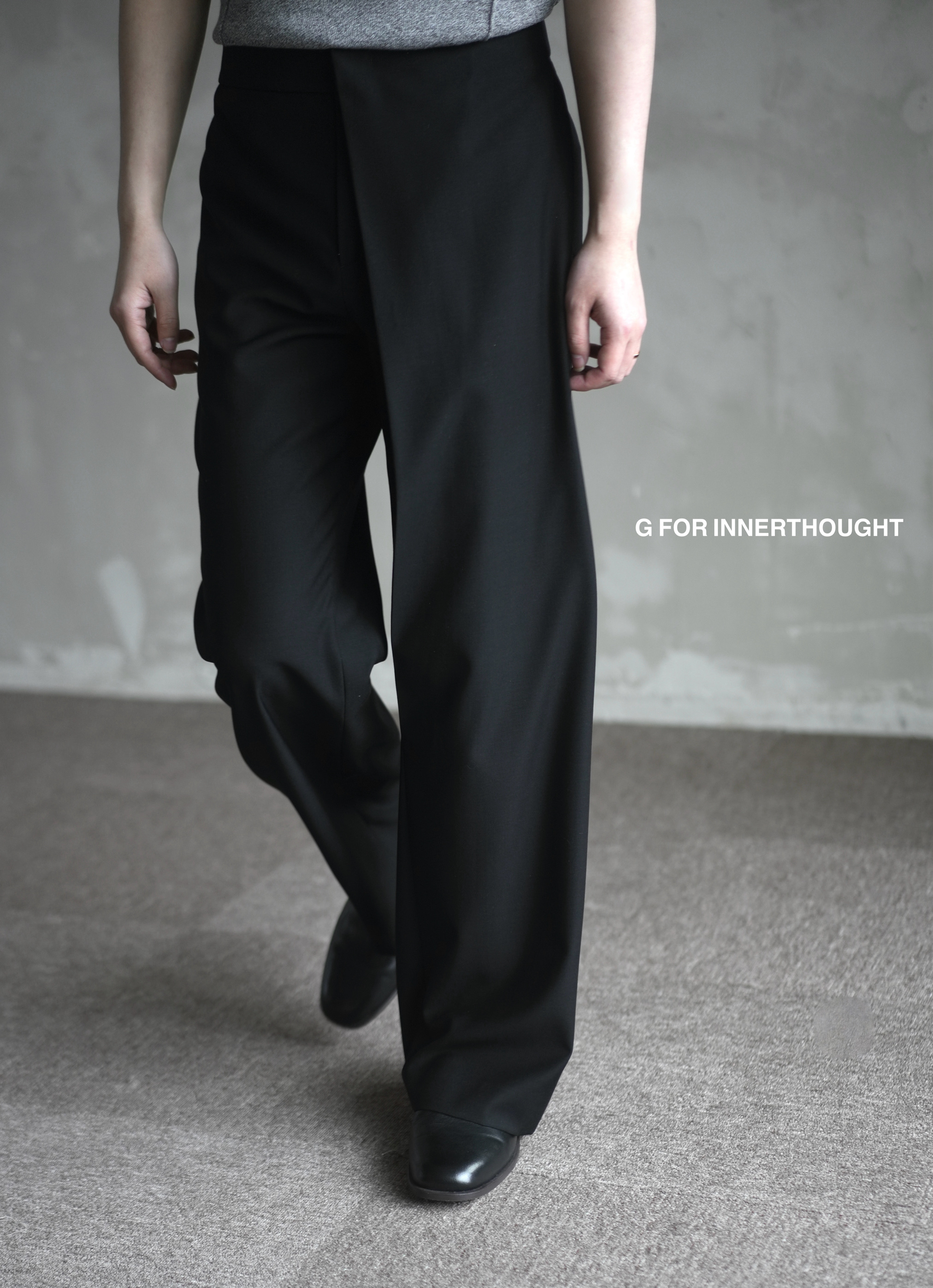 G for Inner Thought | Dingshe 140S High-Density Black Worsted Wool Asymmetric Structure Dress Pants
