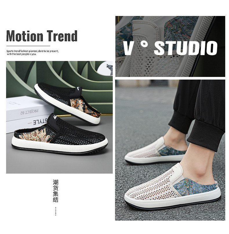 Pull-Back Canvas Half-Slippers for Men, Summer Breathable Casual Old Beijing Cloth Shoes, Slip-On Closed-Toe Sandals Without Heel