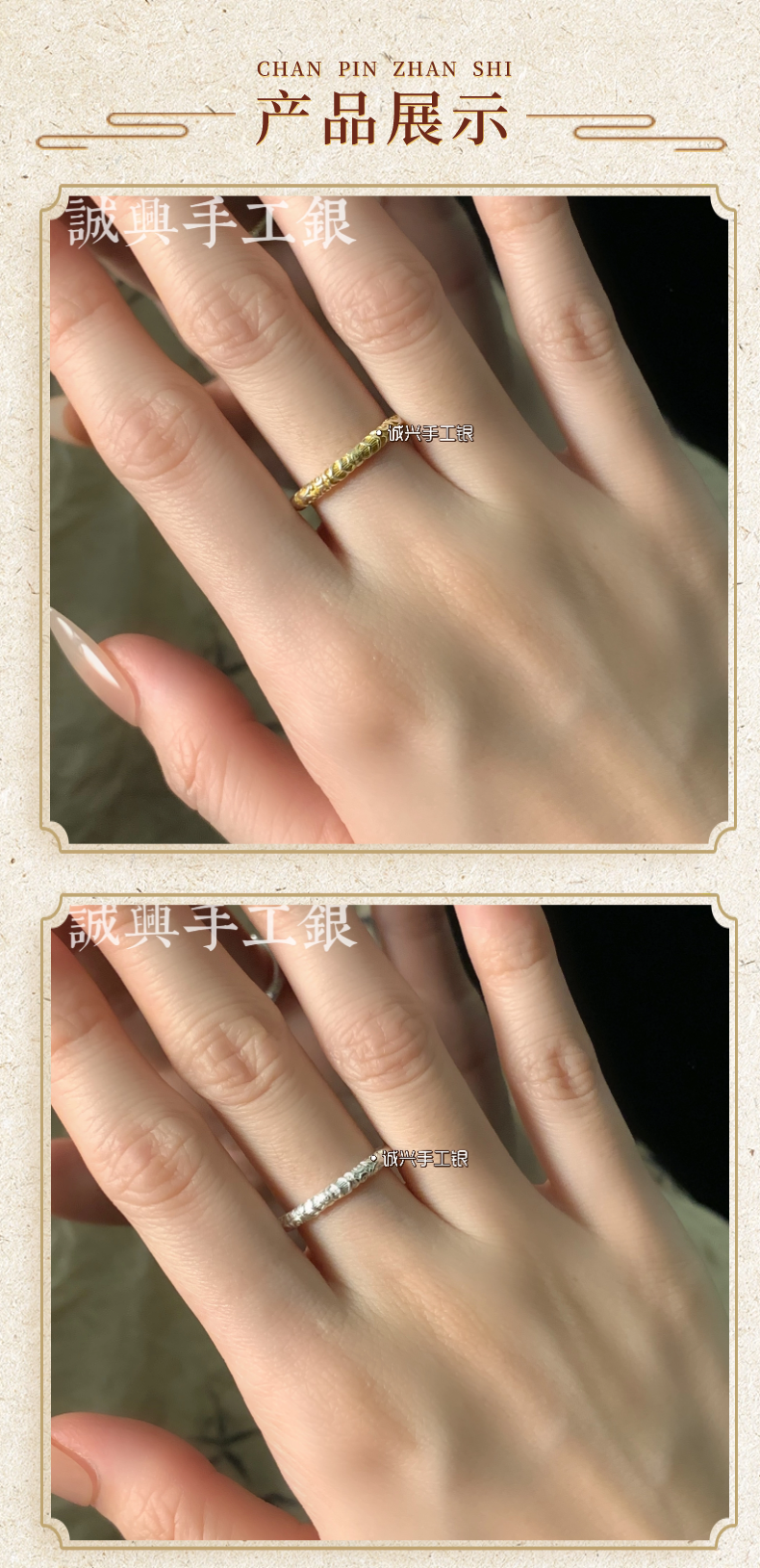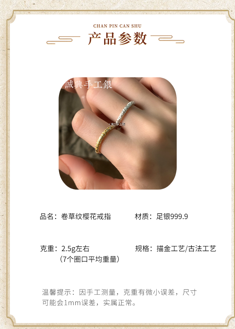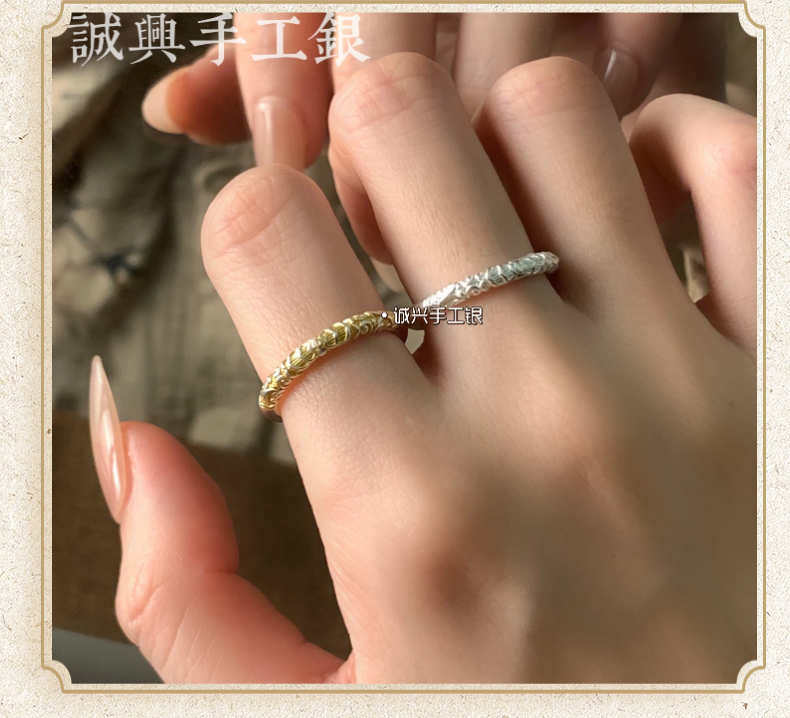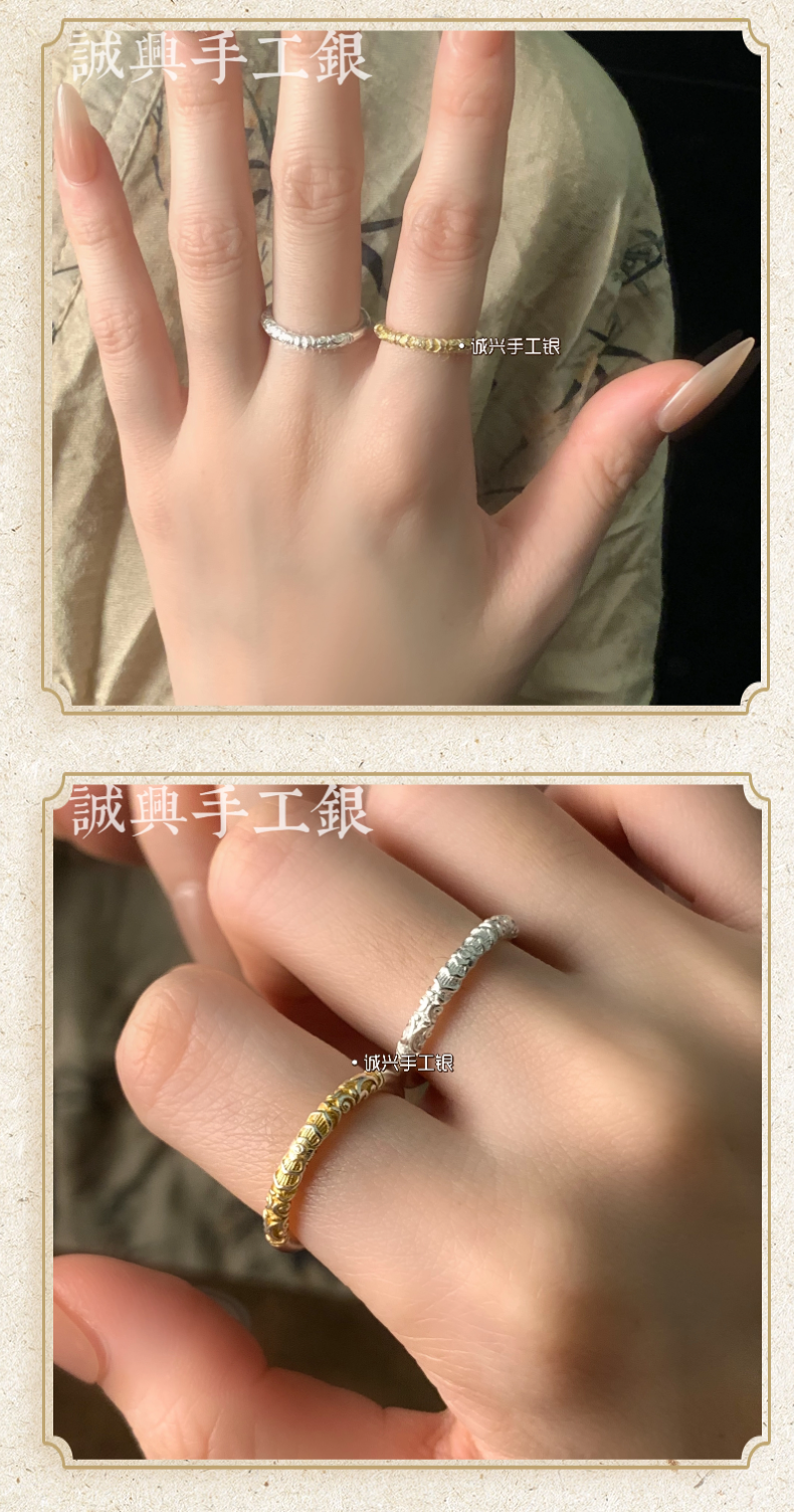 9999 Pure Silver Ring with Scroll Pattern, Double-Sided Cherry Blossom Gold Inlay, Traditional Style, Versatile Solid Pure Silver Ring