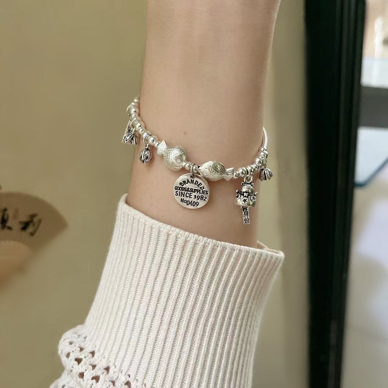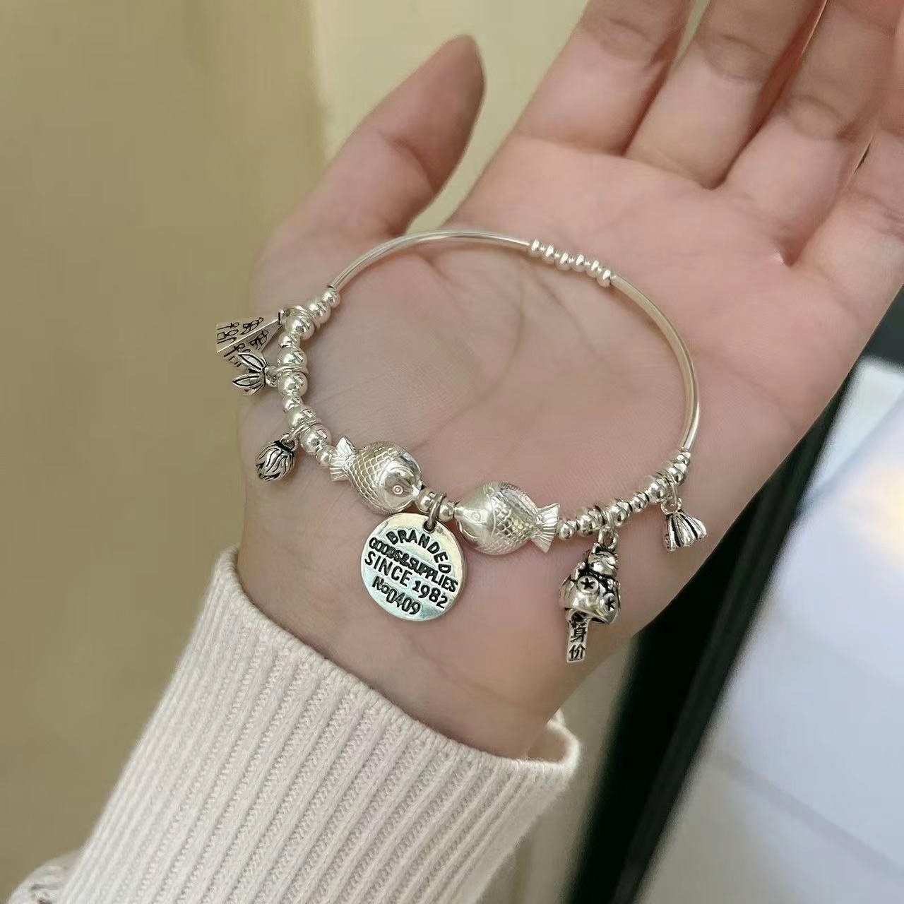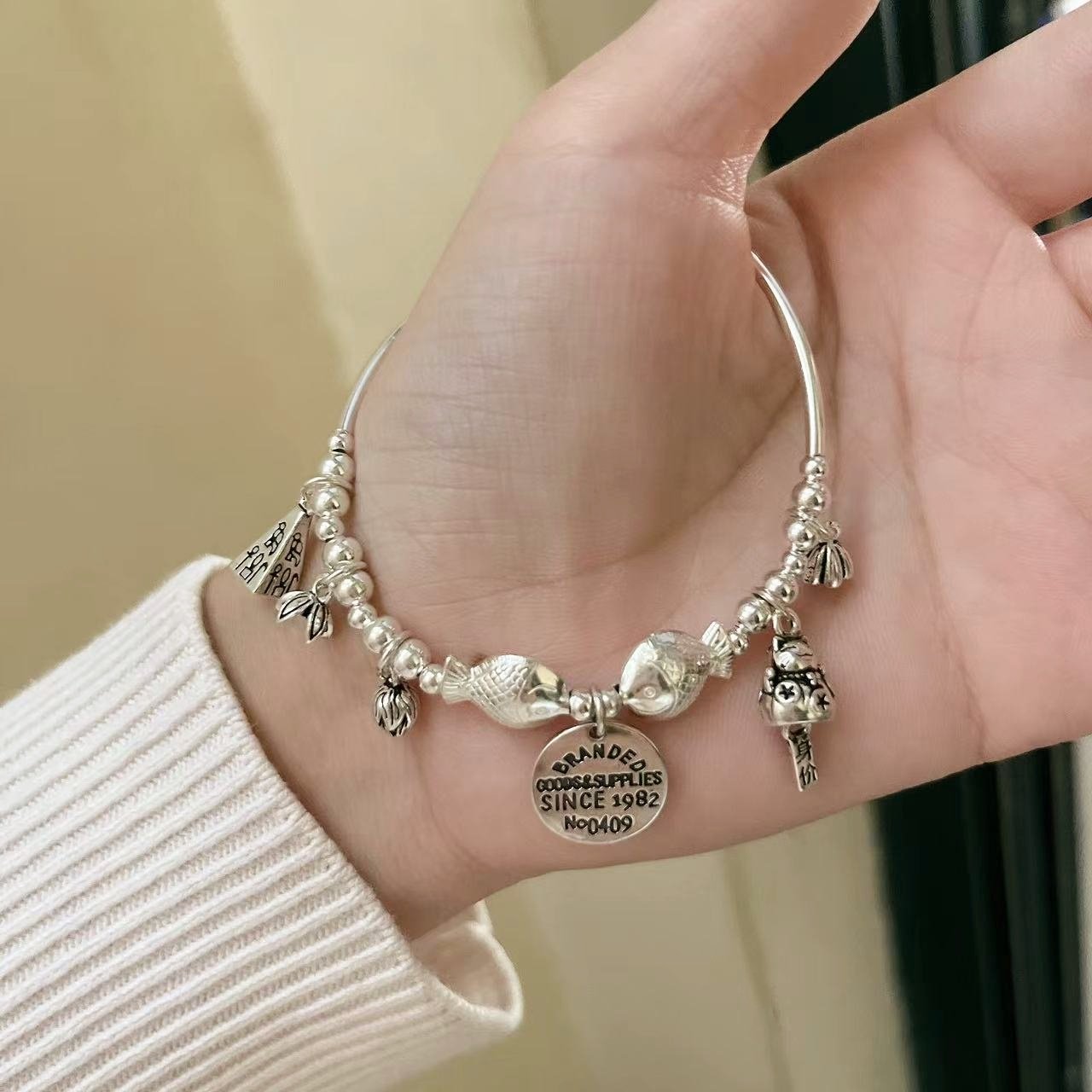 925 Sterling Silver Vintage Lucky Cat Silver Bracelet for Women, Handmade Elastic String Double Fish Bracelet, Niche Design Birthday Gift