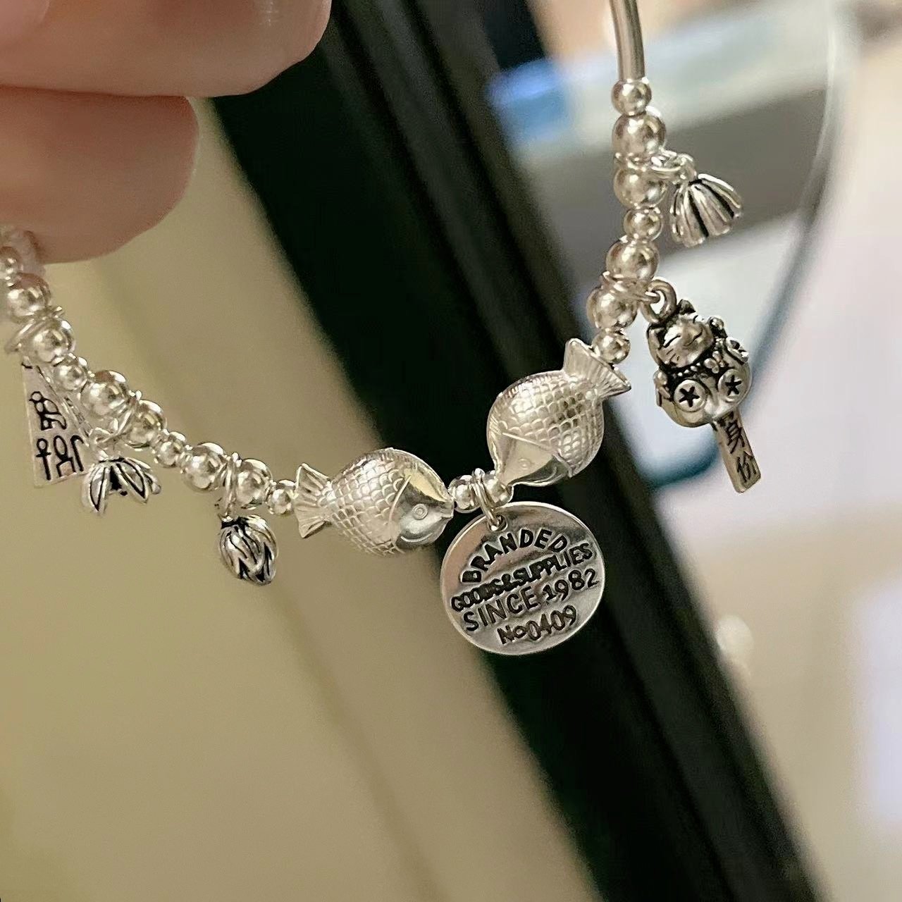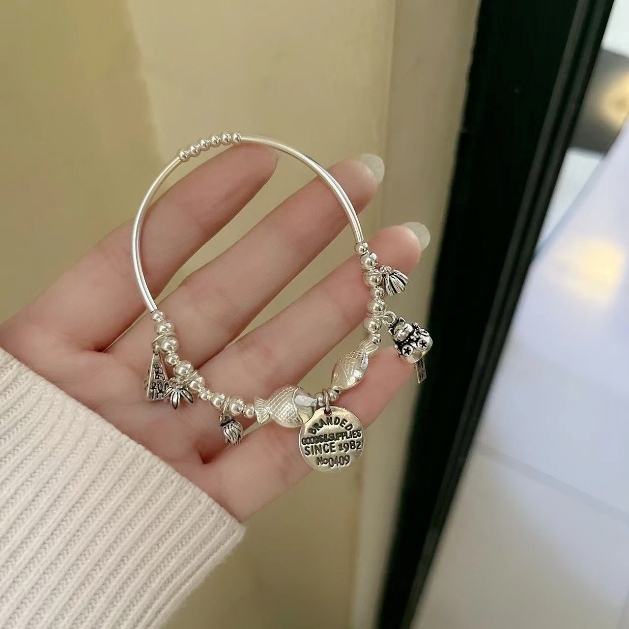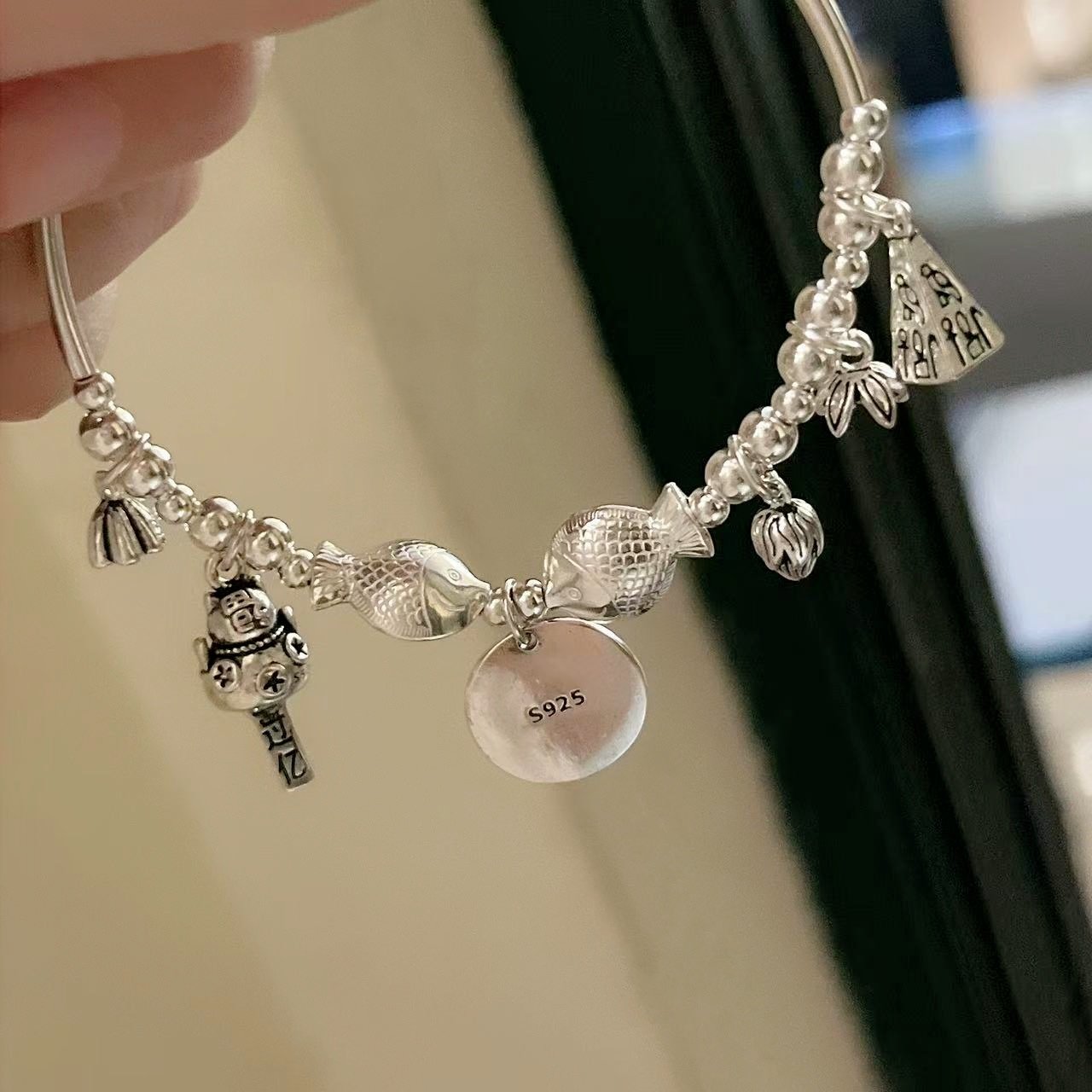 925 Sterling Silver Vintage Lucky Cat Silver Bracelet for Women, Handmade Elastic String Double Fish Bracelet, Niche Design Birthday Gift
