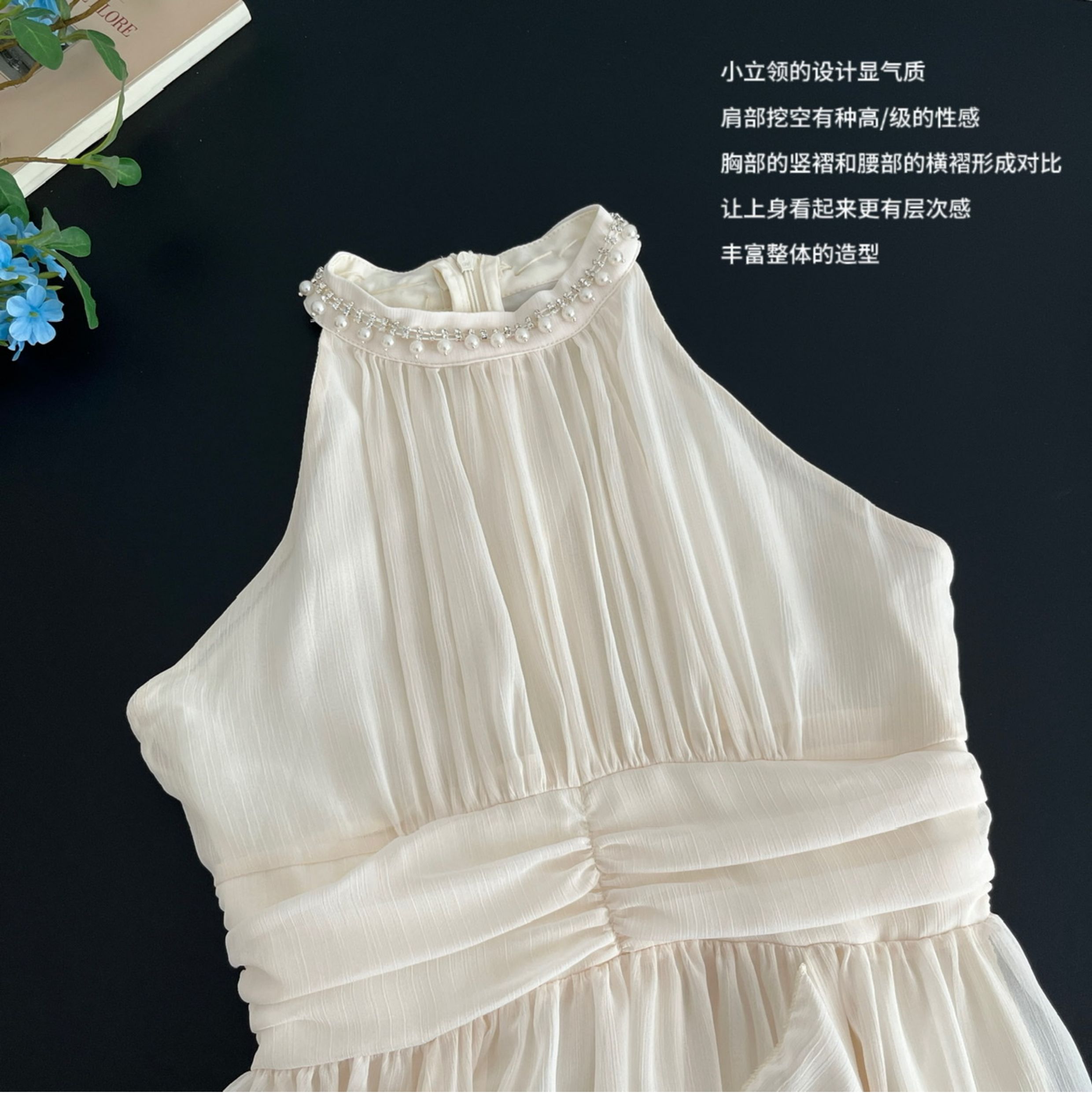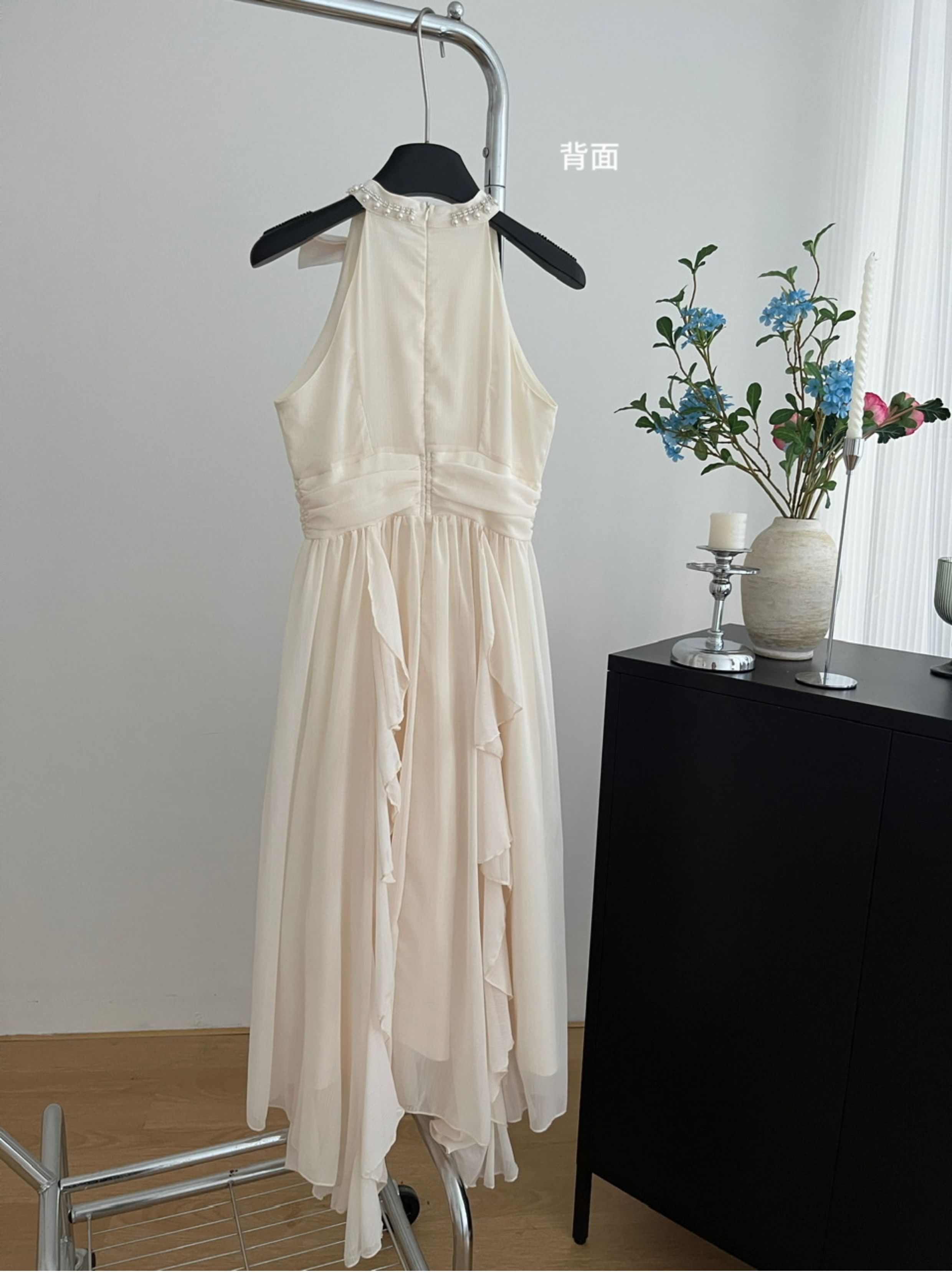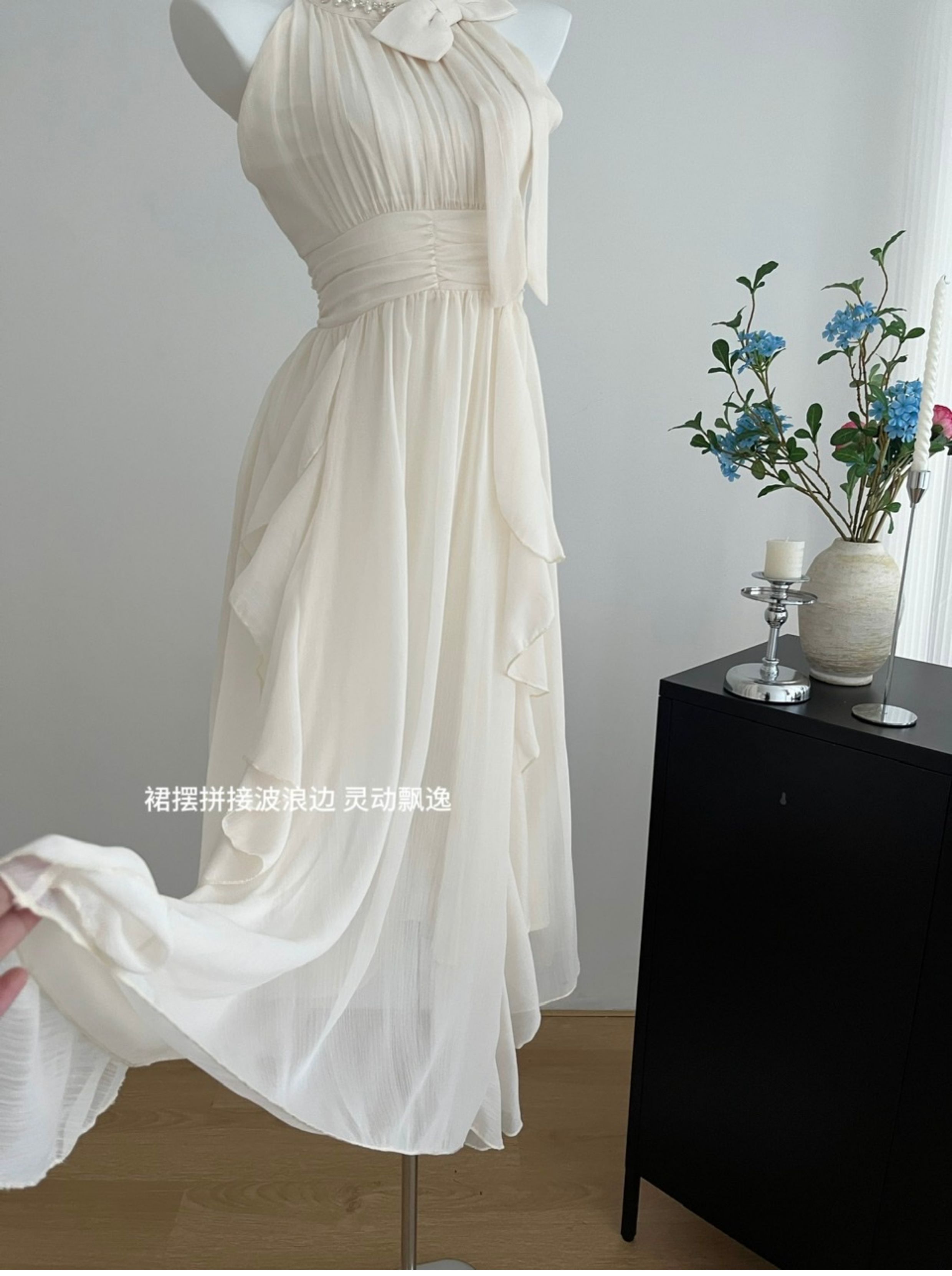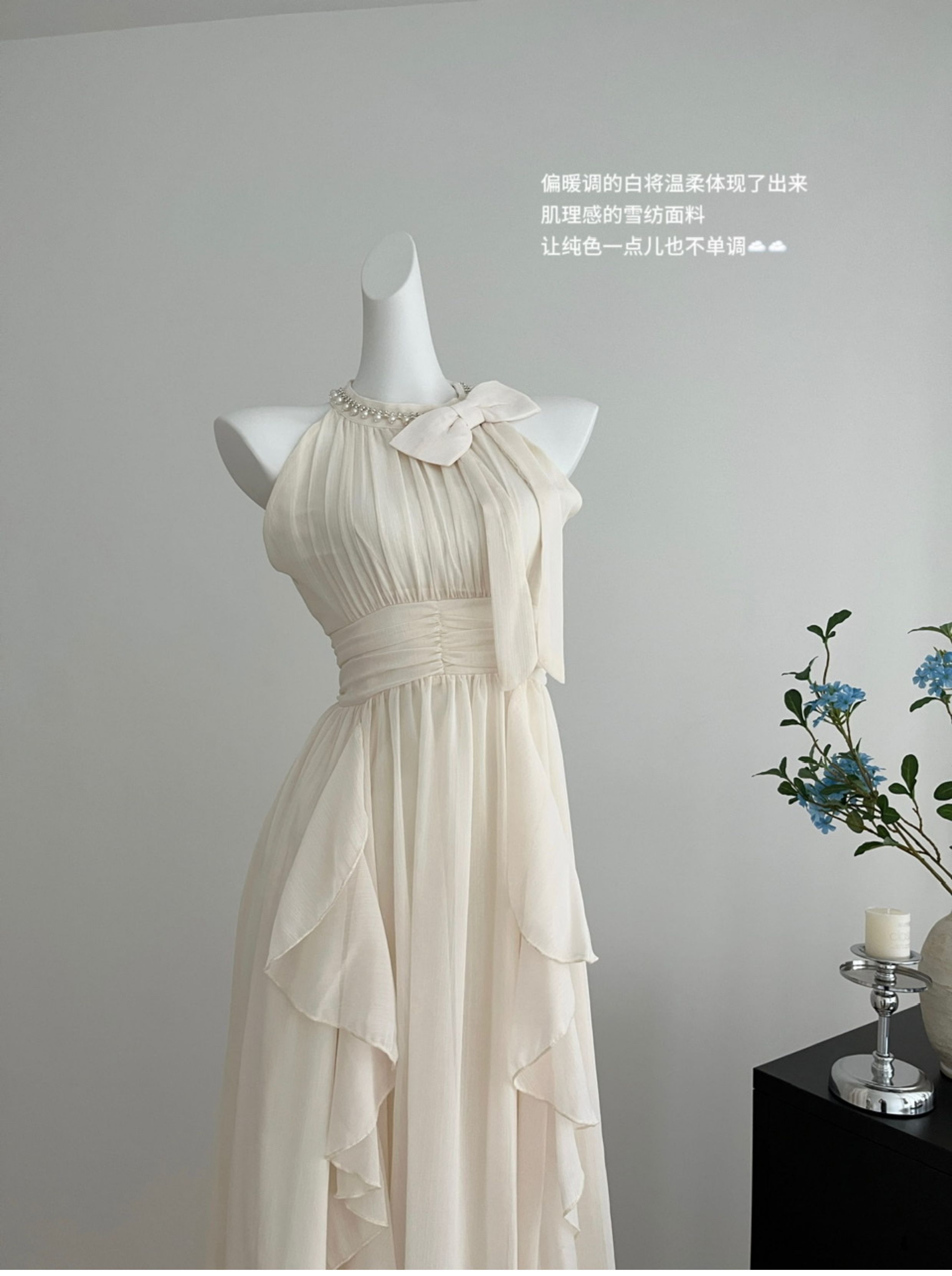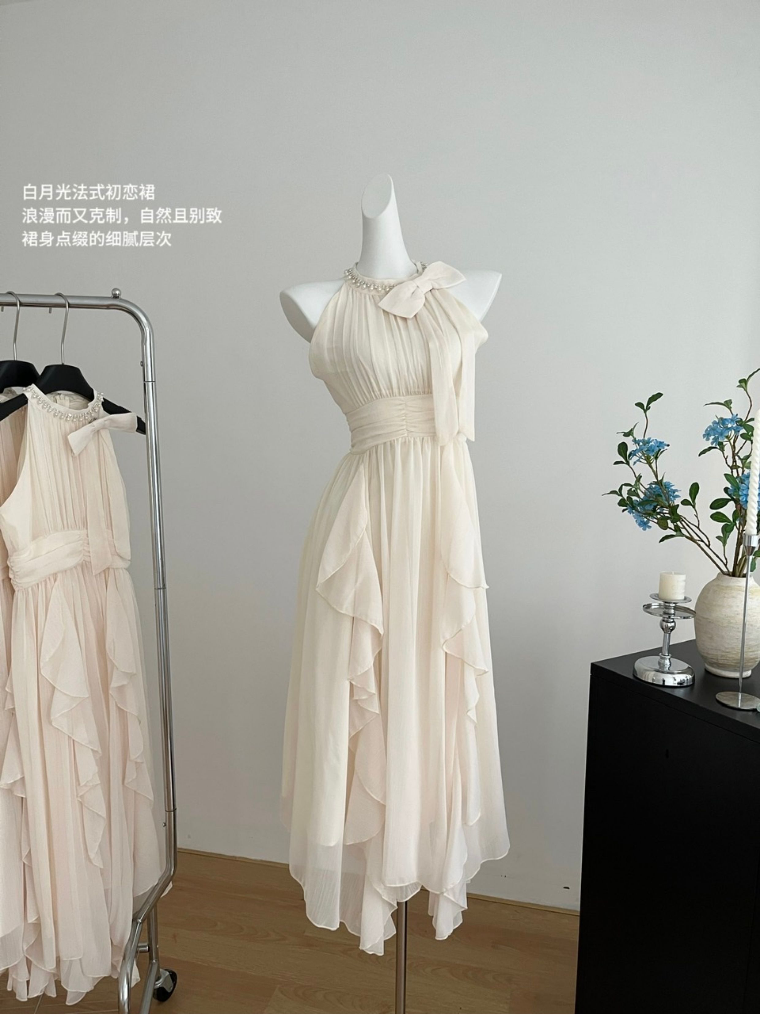 Peach LAOSHU Changdao Fragrance Sleeveless Halter Neck Dress with Waist-Cinching Ruffle French Long Dress