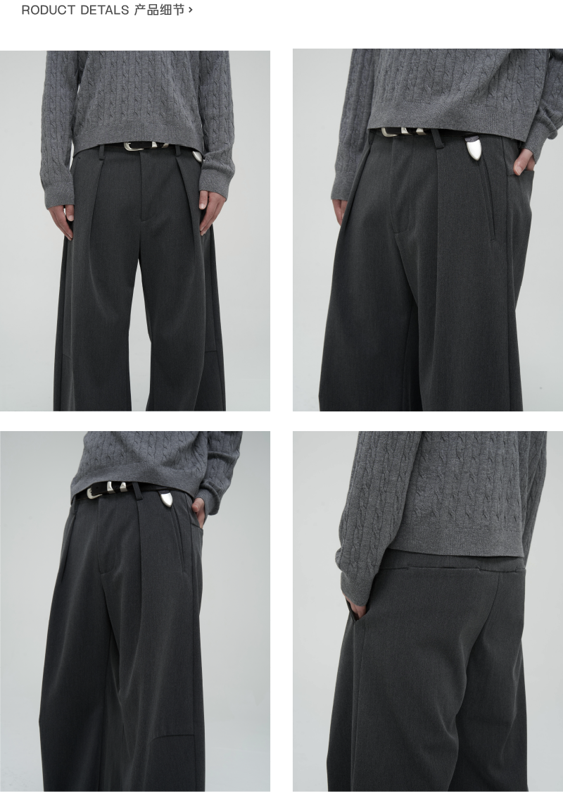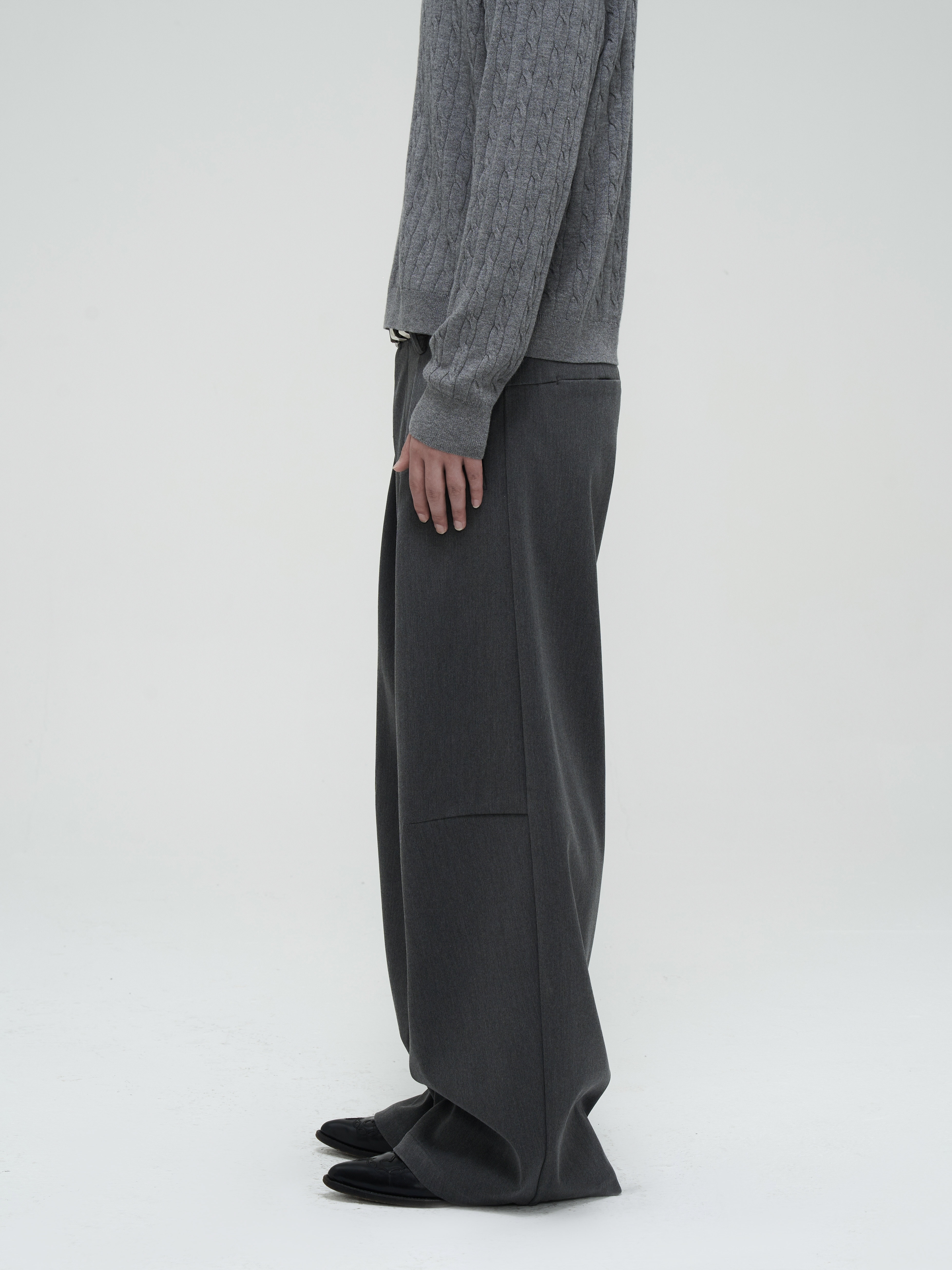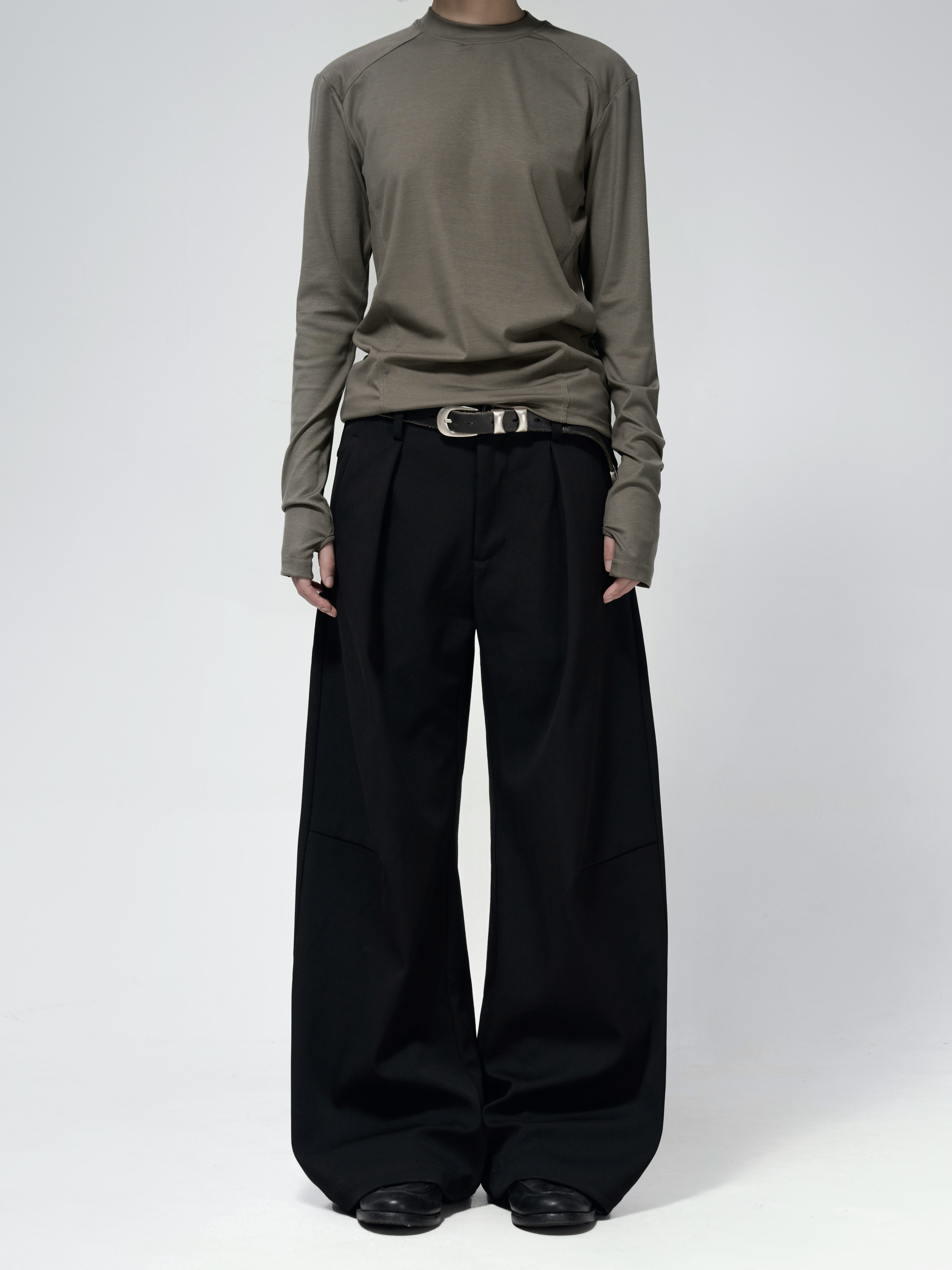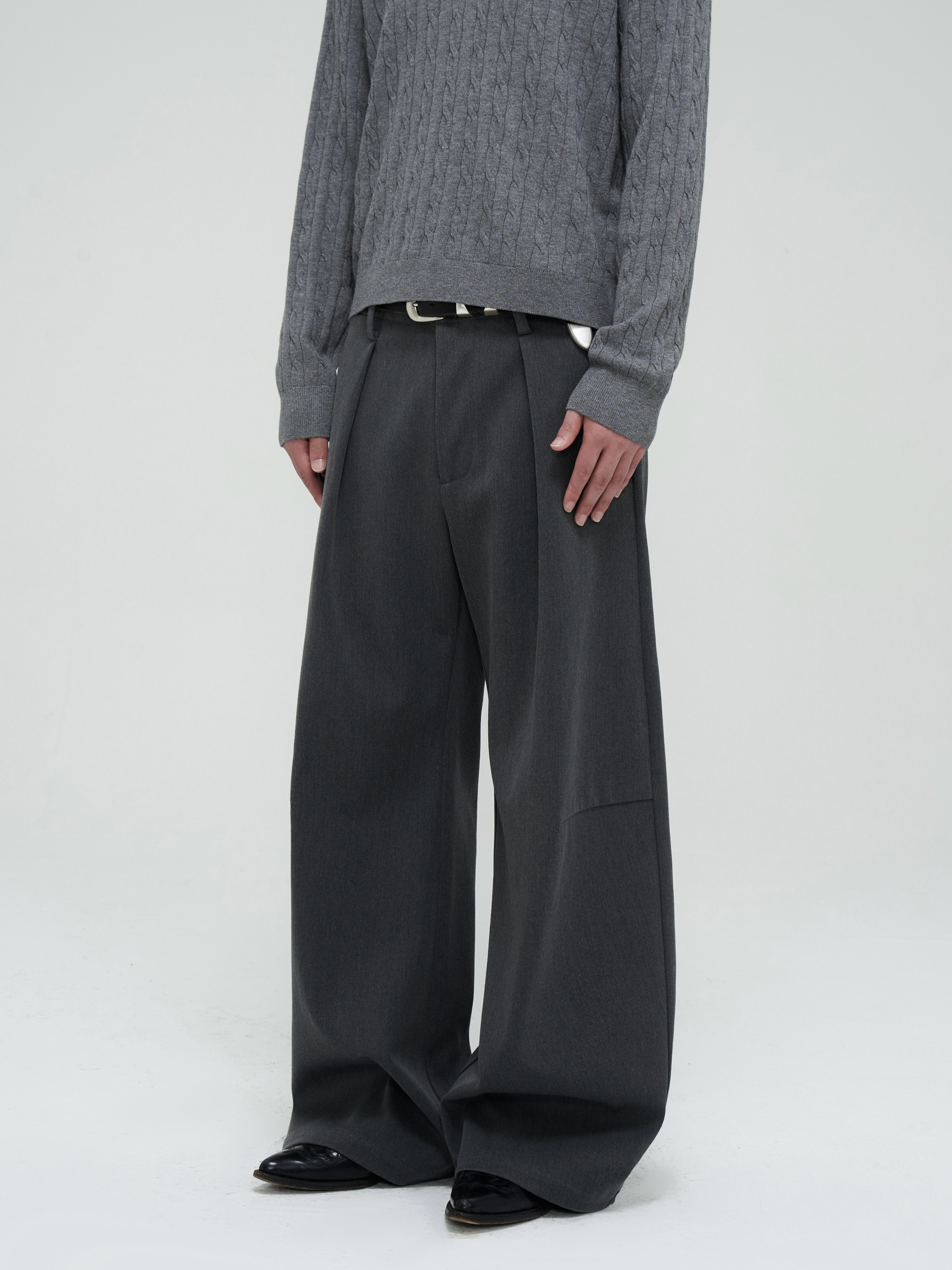 7Hill Curved Silhouette Pleated Trousers with Three-Dimensional Tailoring, Loose Fit, Wide-Leg, Drapey Floor-Length Pants