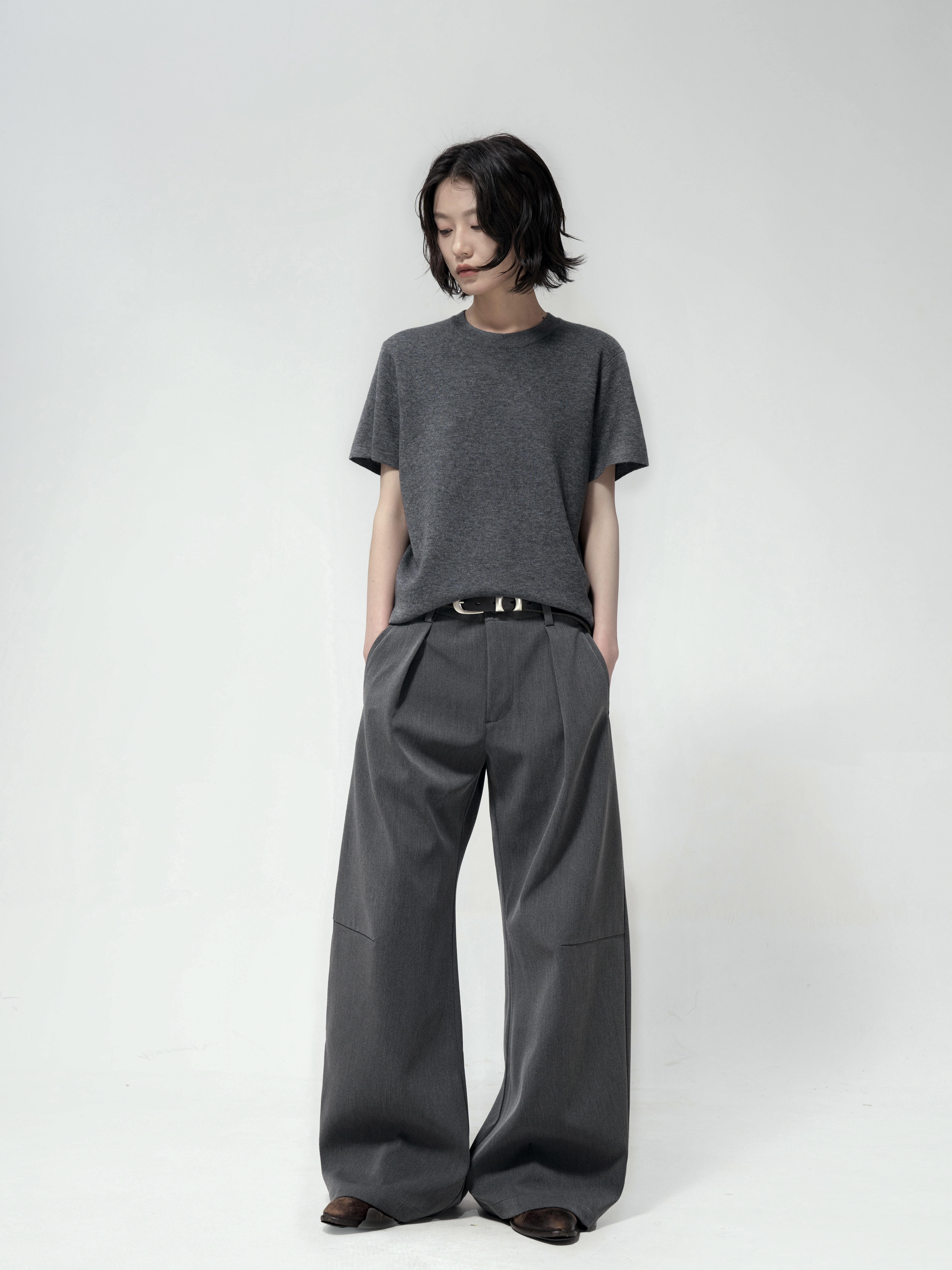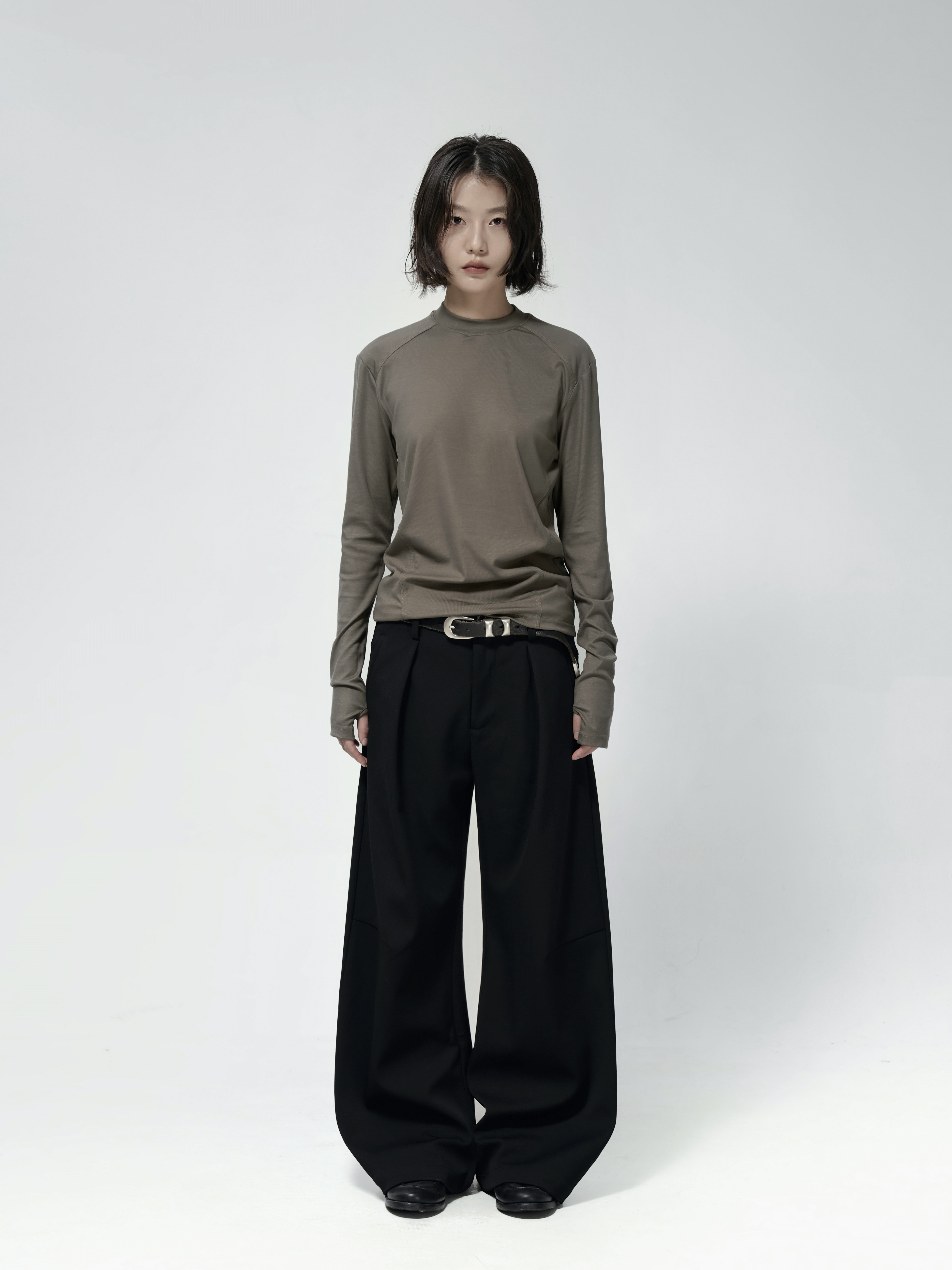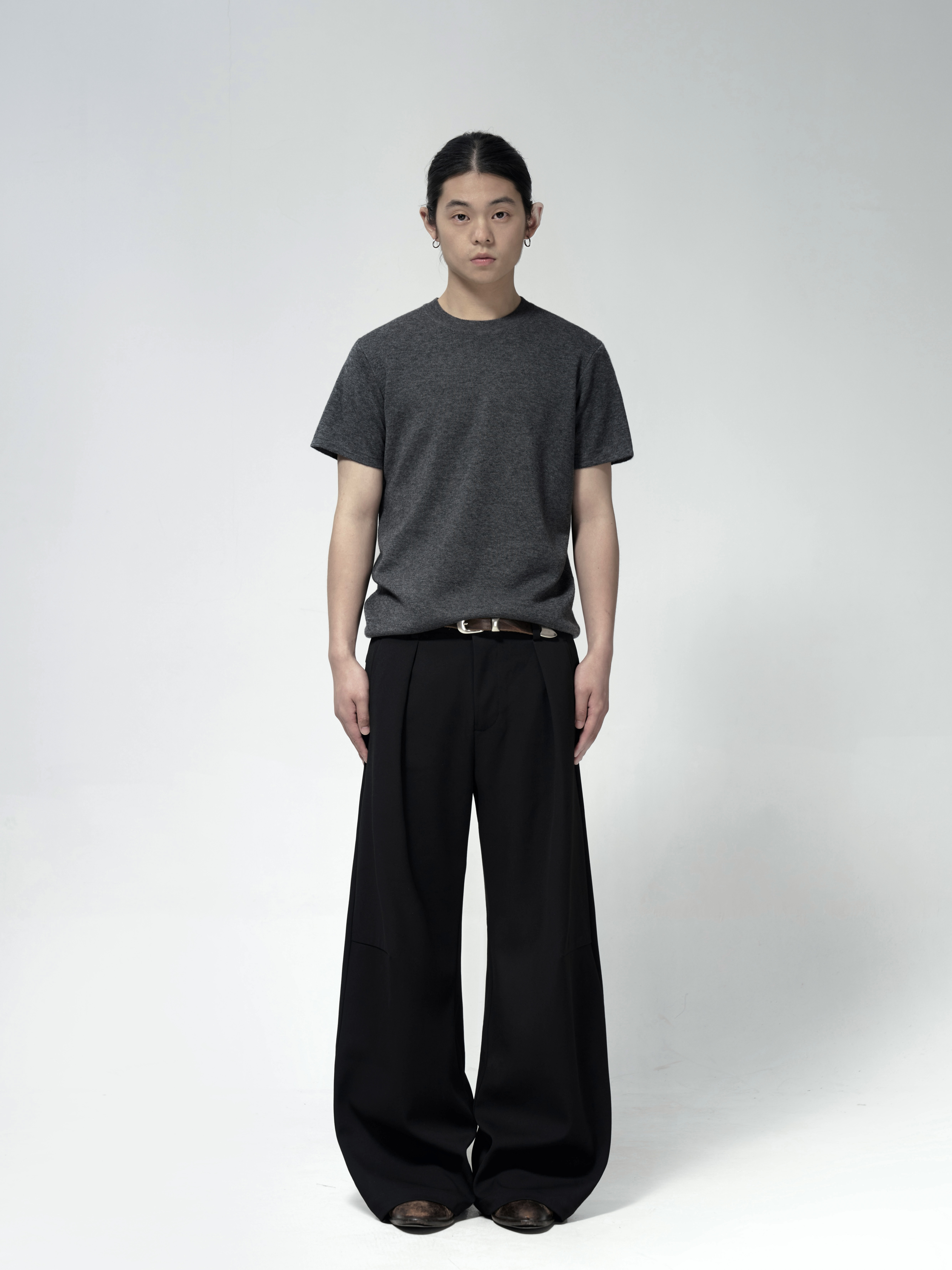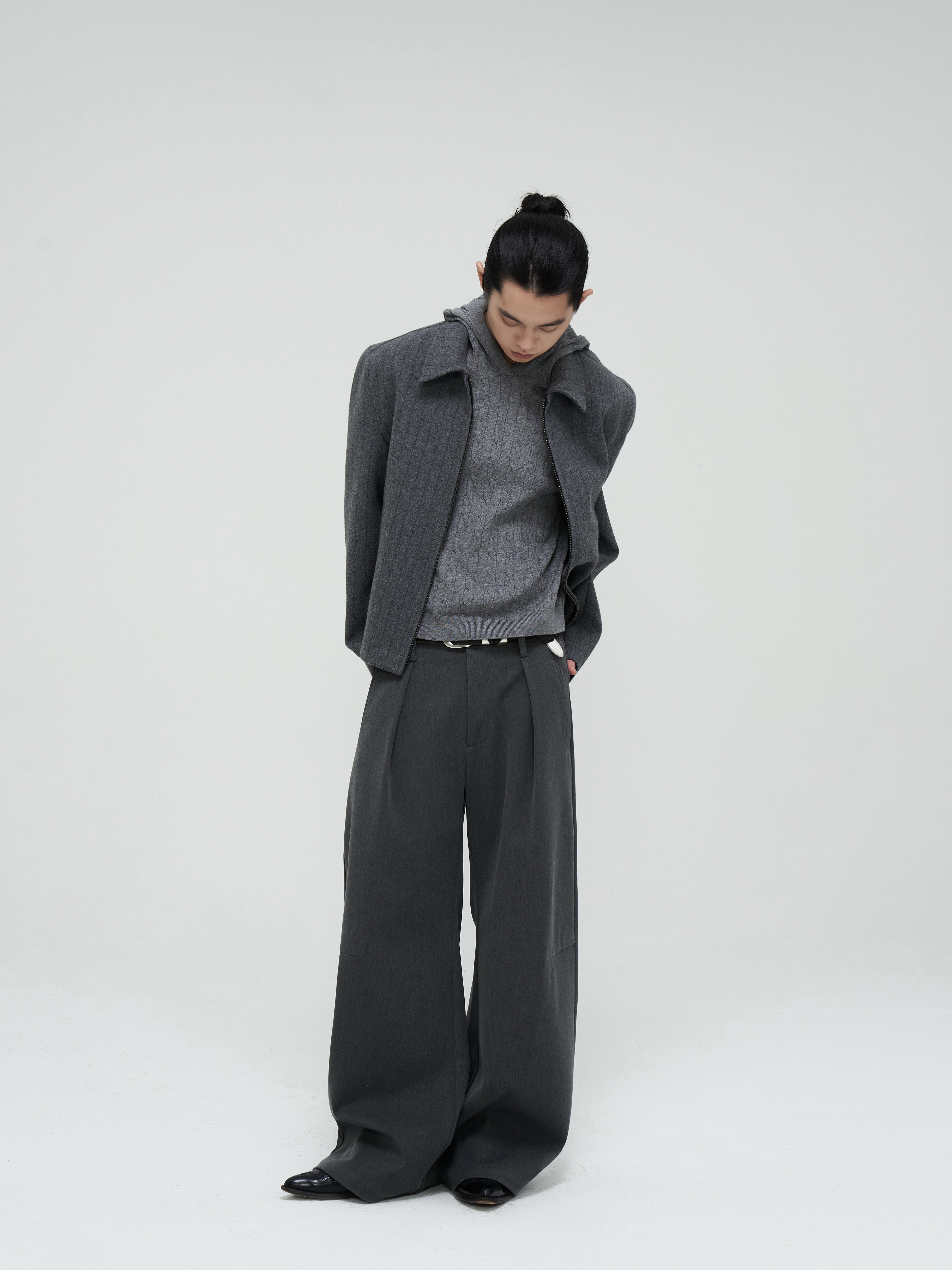 7Hill Curved Silhouette Pleated Trousers with Three-Dimensional Tailoring, Loose Fit, Wide-Leg, Drapey Floor-Length Pants
