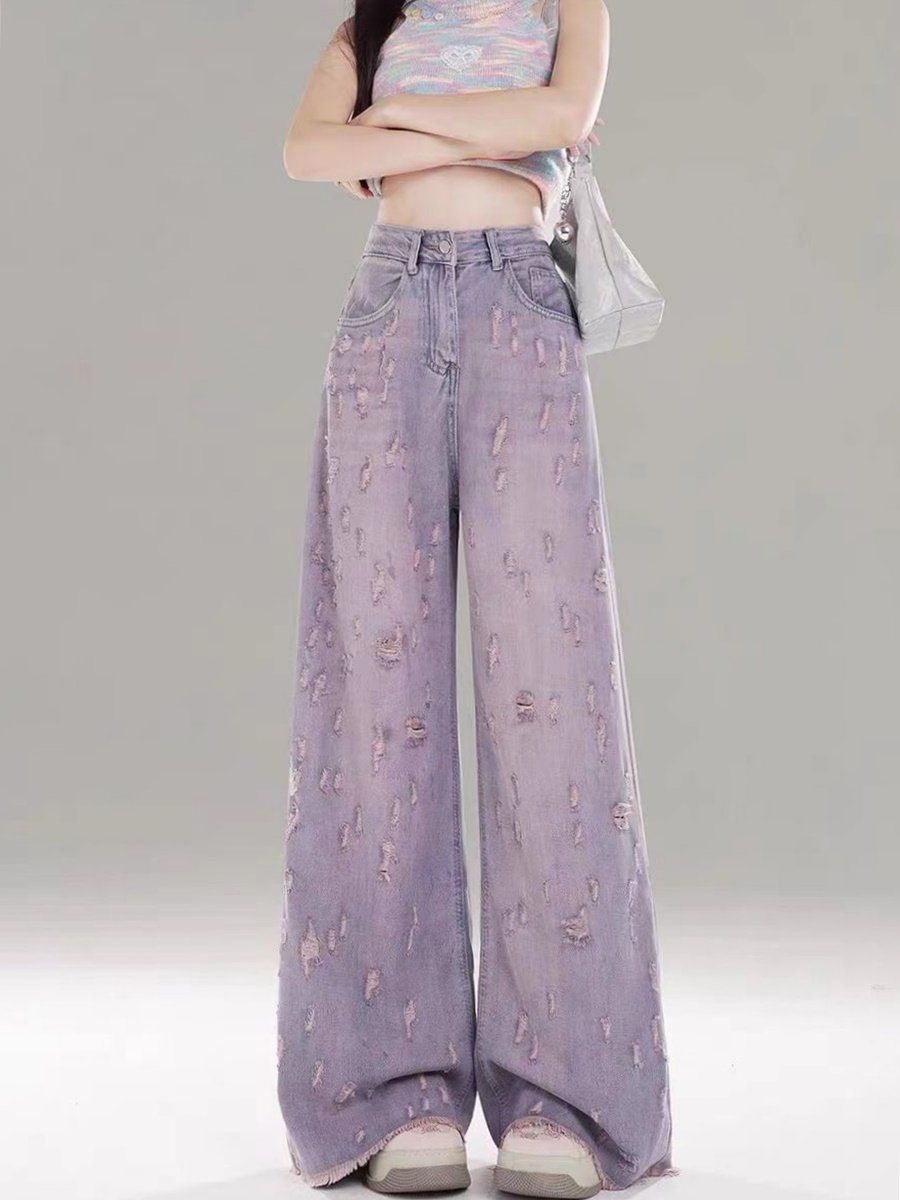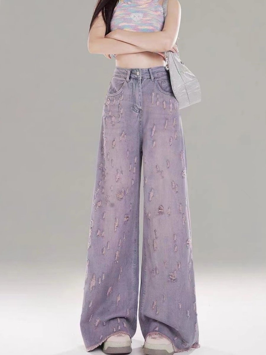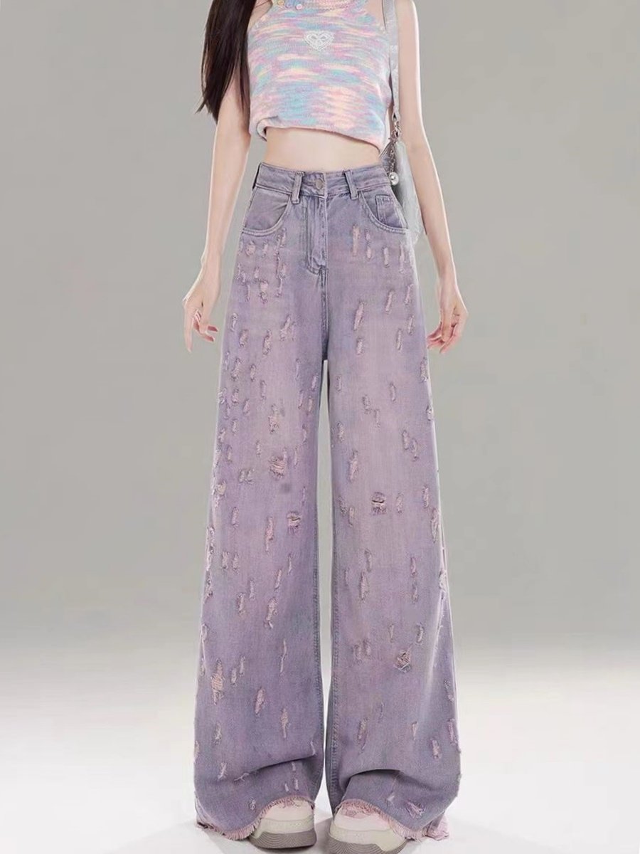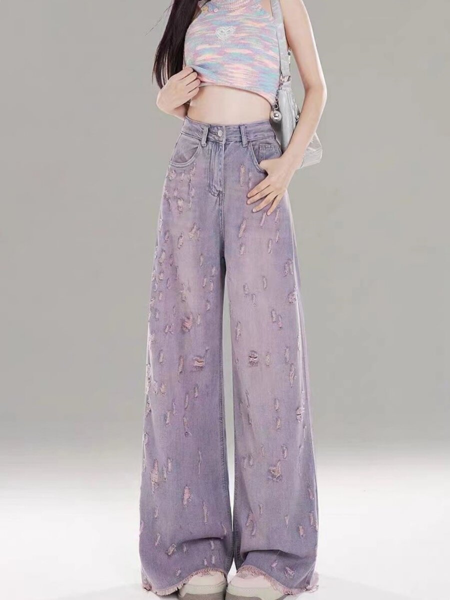 Vintage Pink-Purple High-Waisted Wide-Leg Jeans for Women with a Unique Design, Distressed Frayed Edges, and a Draped Straight-Leg Floor-Length Style