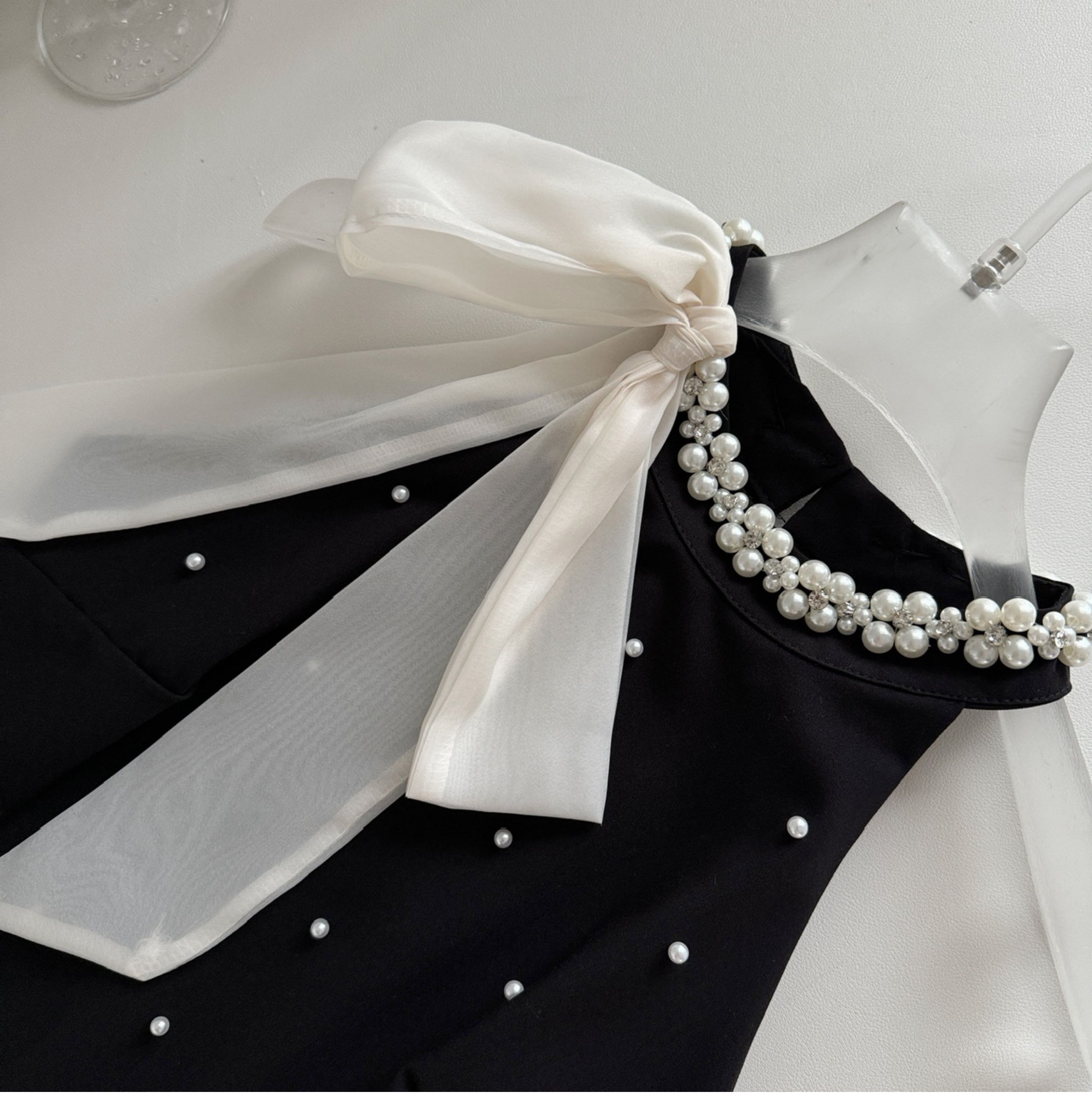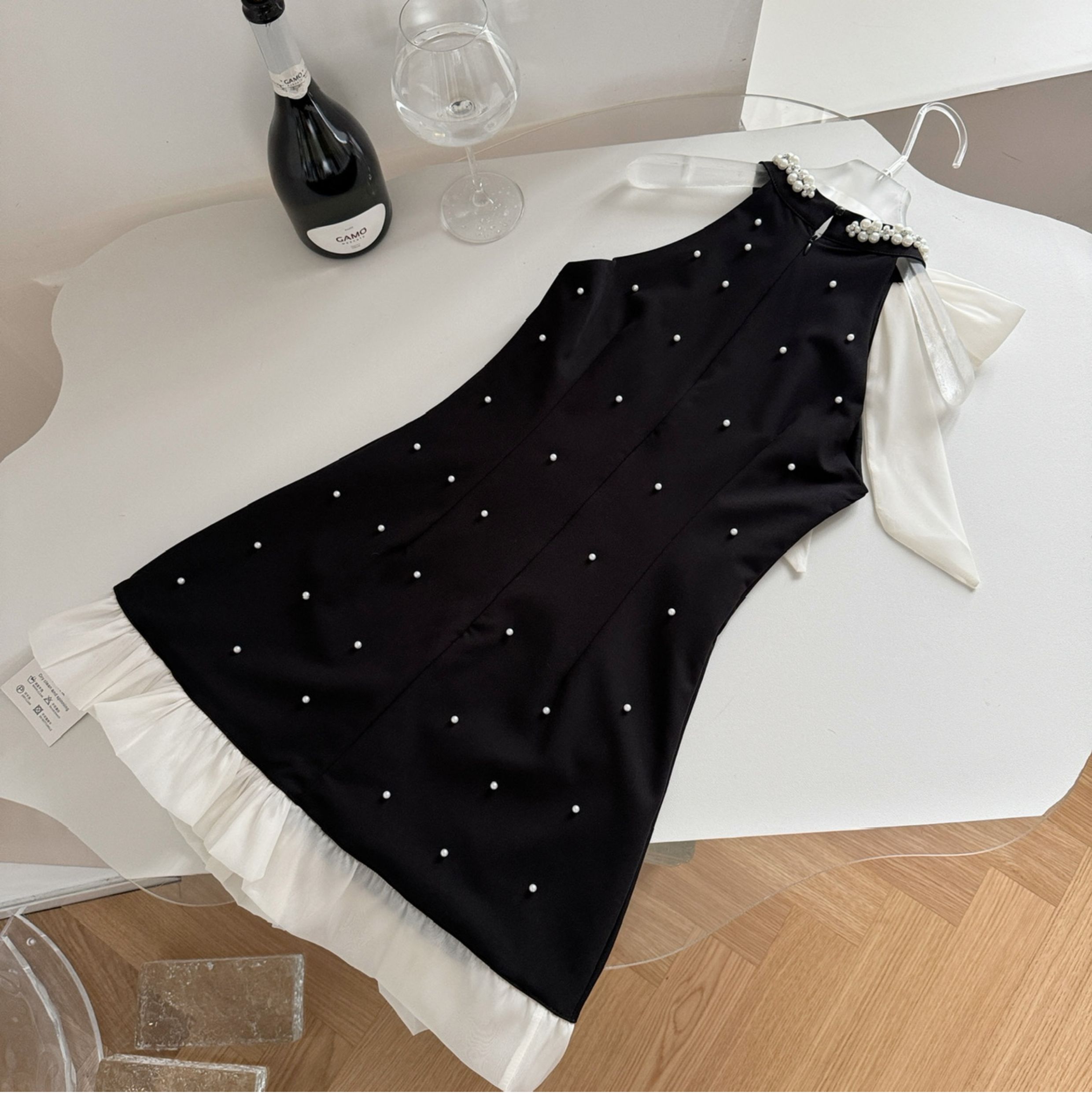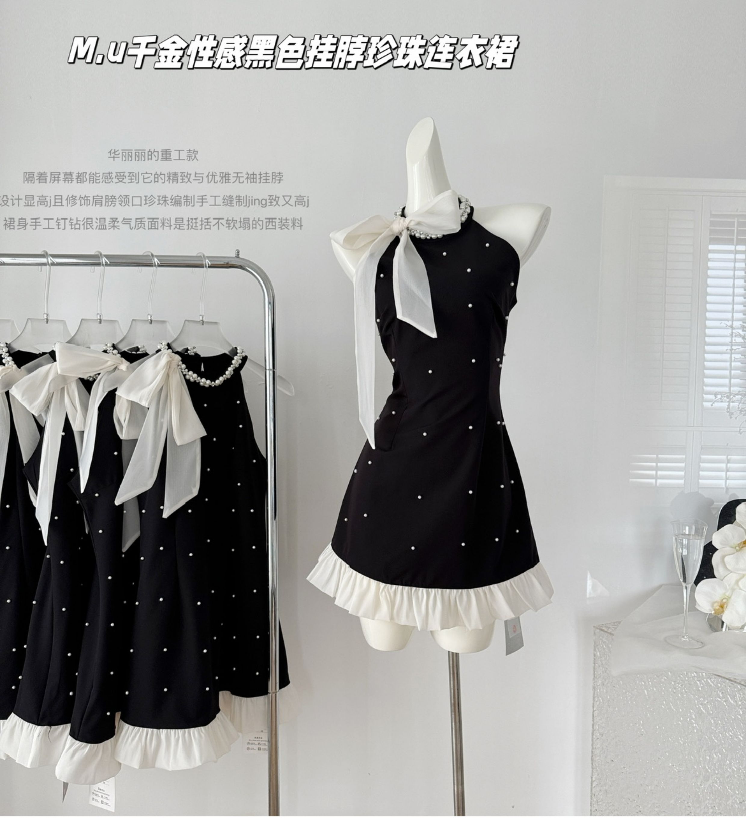 Bow Halter Black Suspbottomer Dress 2024 Spring Loose Slimming Look A-Line Skirt Niche Beaded Diamond Bottoming Skirt