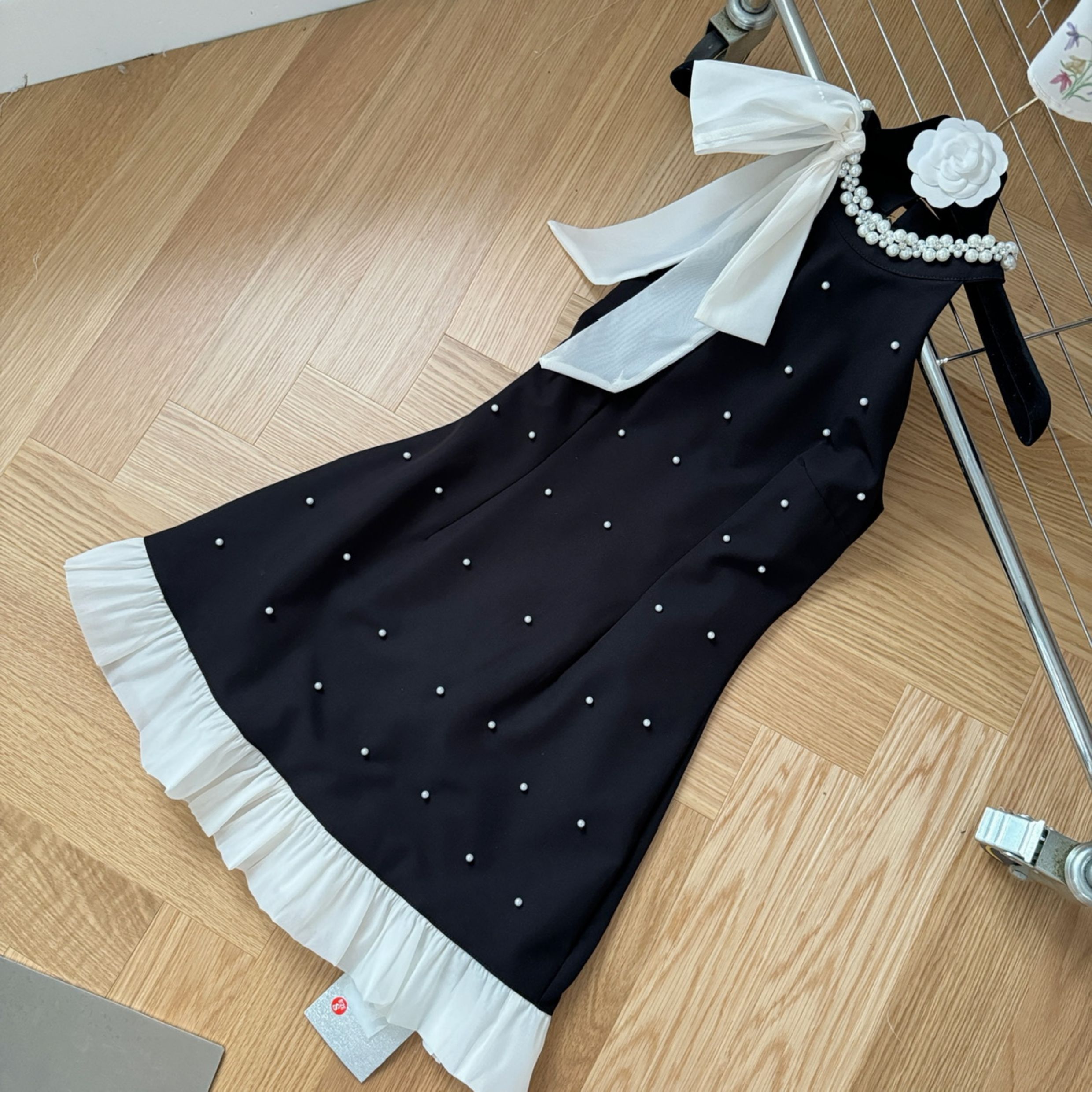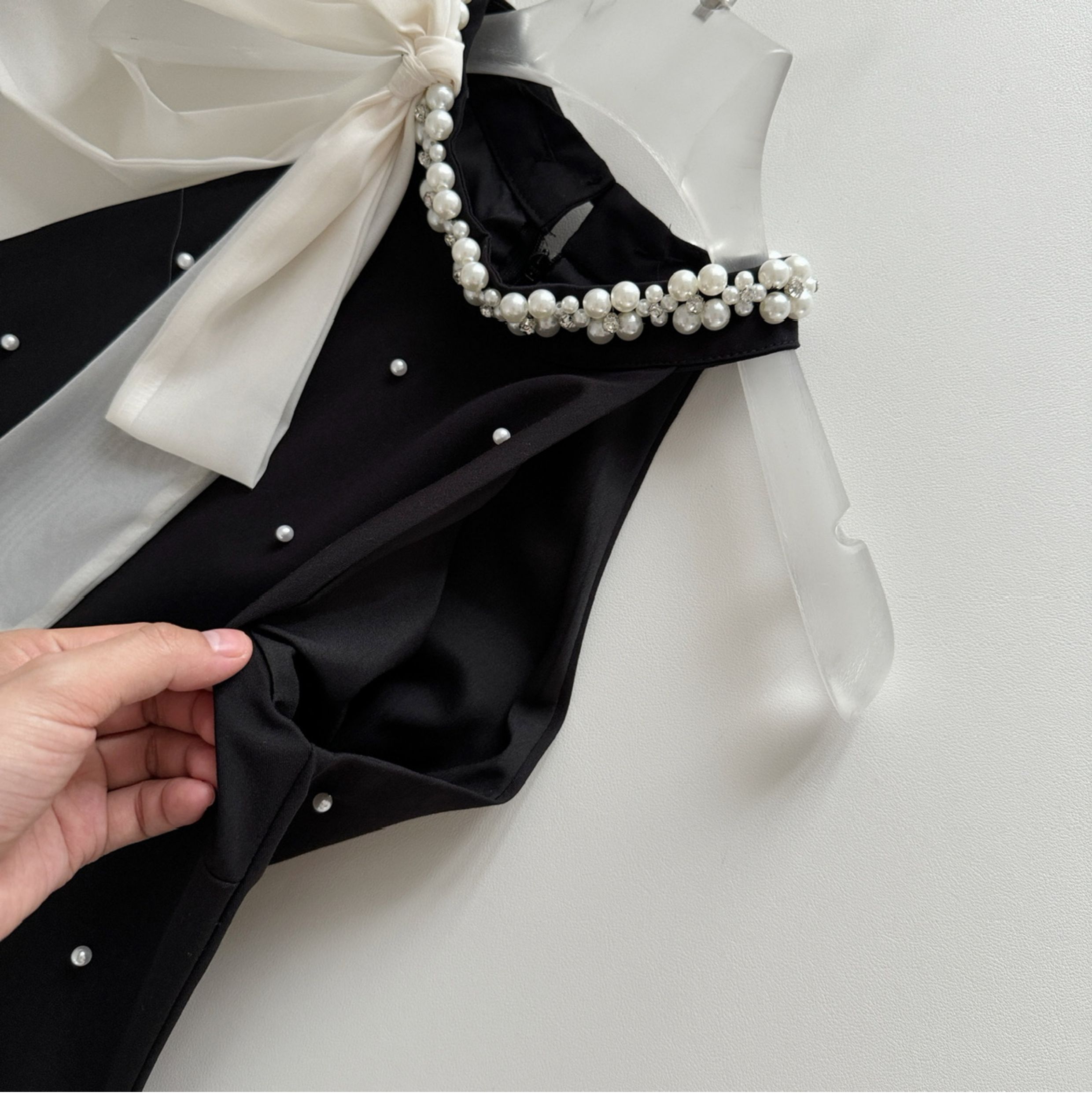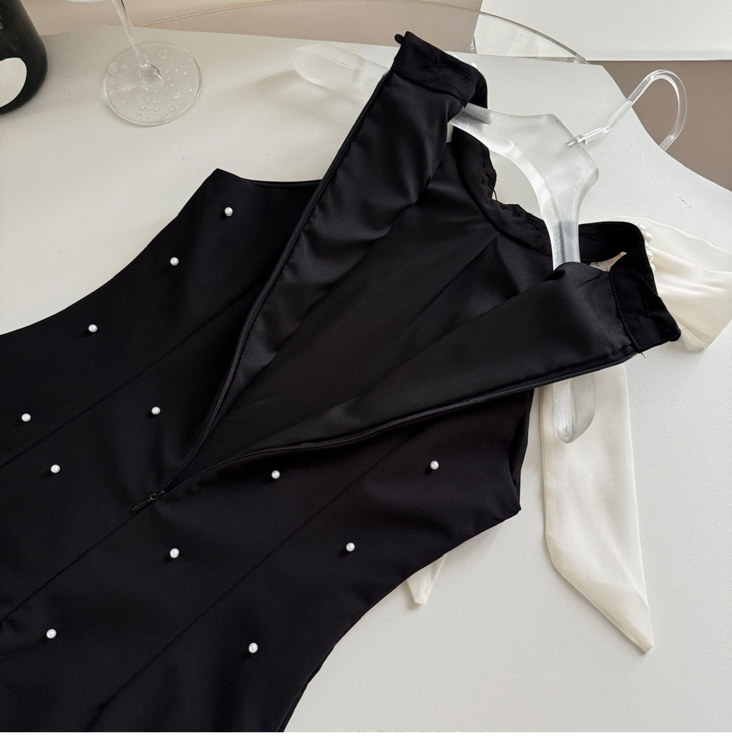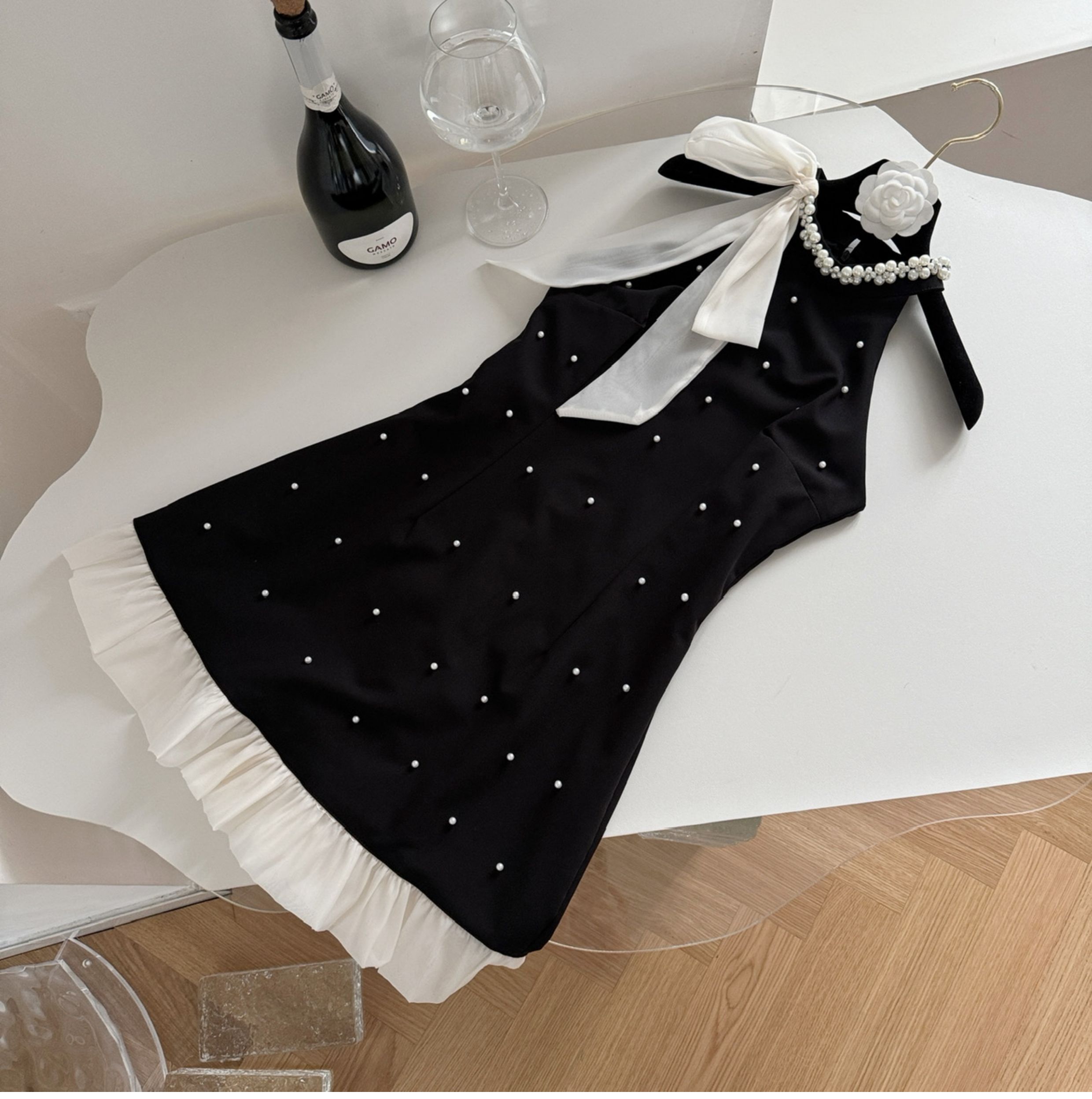 Bow Halter Black Suspbottomer Dress 2024 Spring Loose Slimming Look A-Line Skirt Niche Beaded Diamond Bottoming Skirt