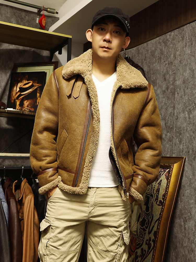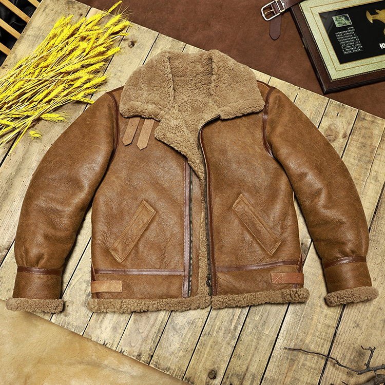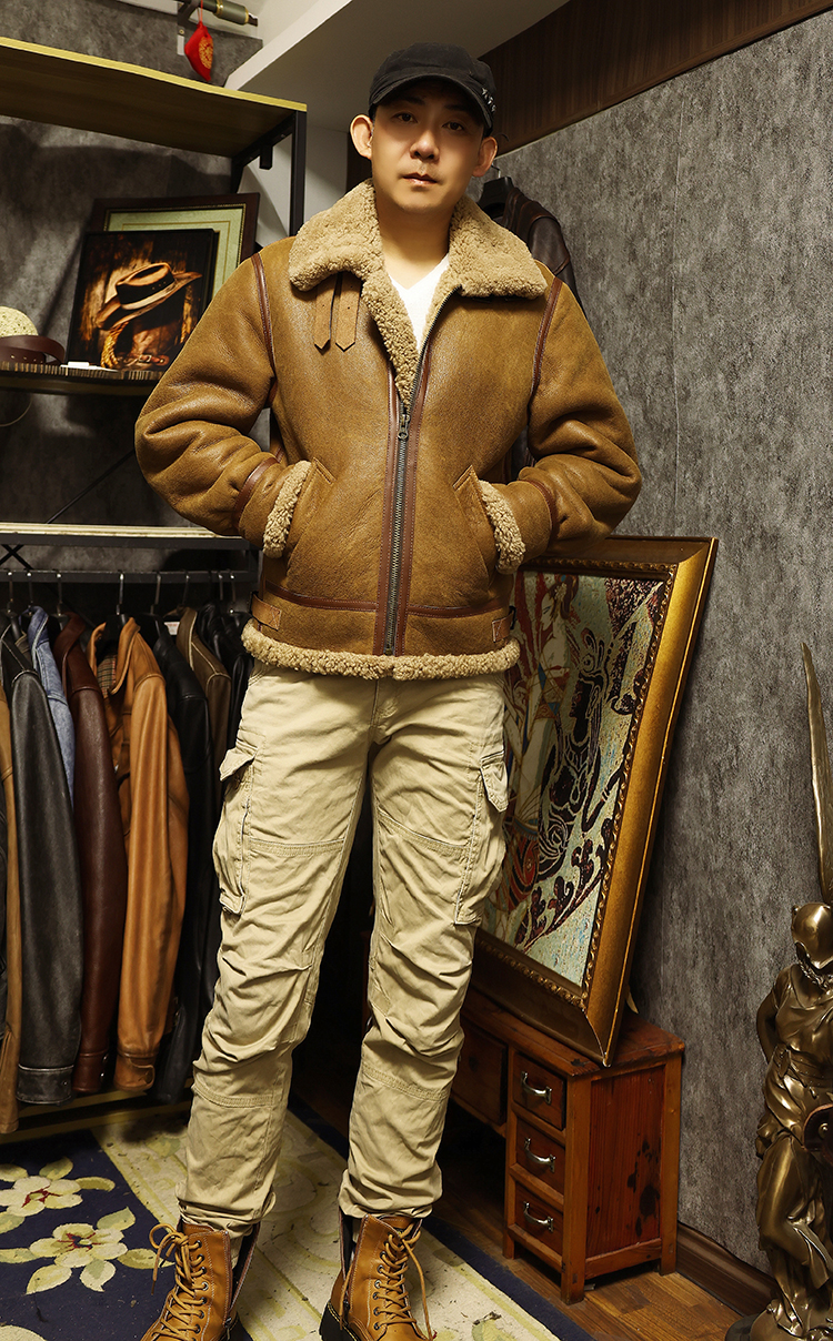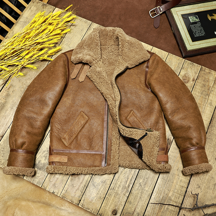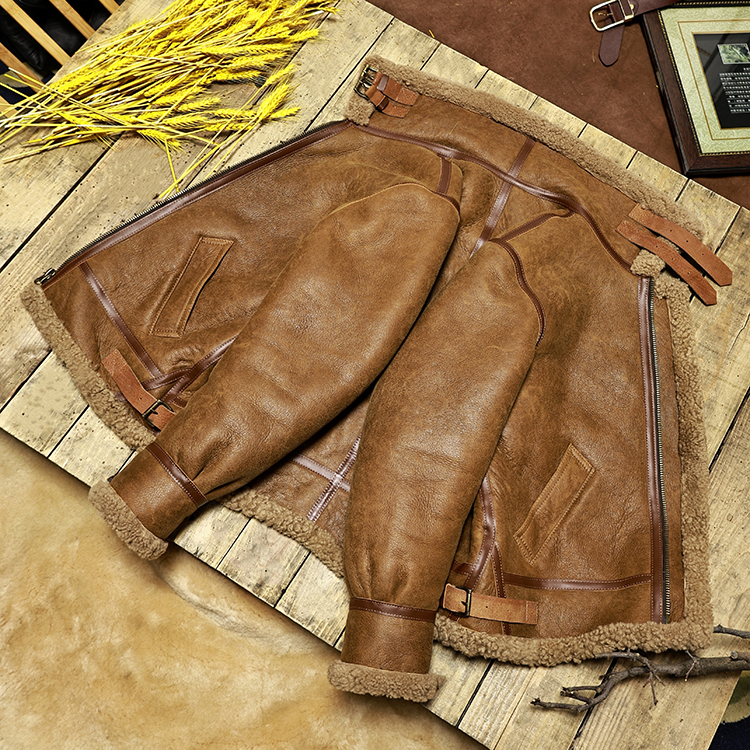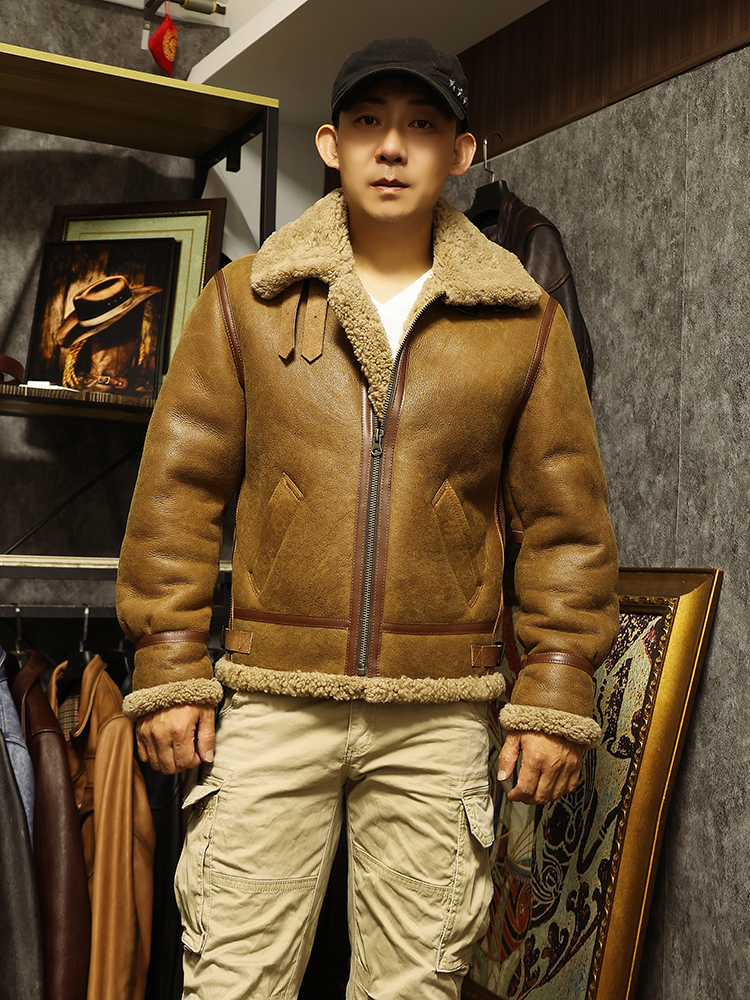 B3 Original Shearling Flight Suit Men's Lambskin Genuine Leather Motorcycle Short Jacket Fur Coat Thick