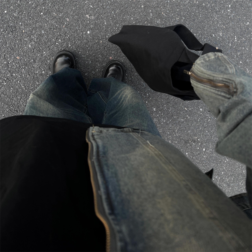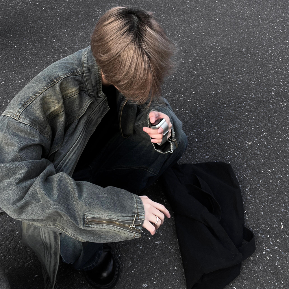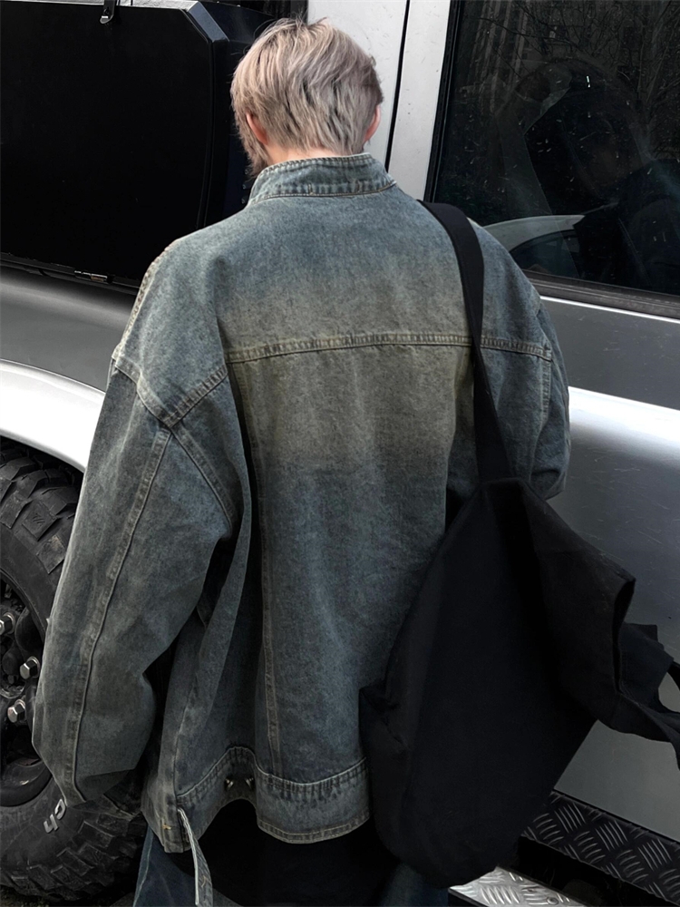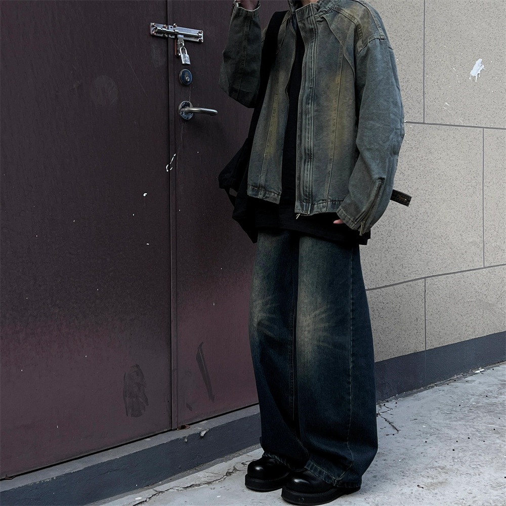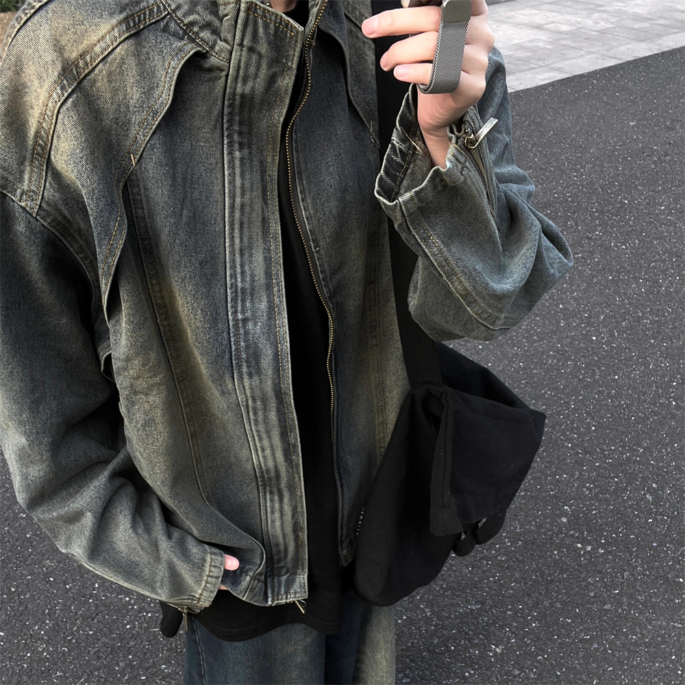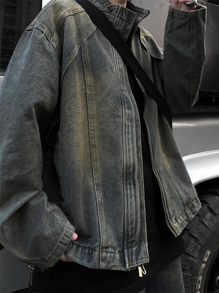 American Retro Washed Yellow Mud-Dyed Blue Stand-Collar Denim Jacket for Men, Cool and Loose-Fitting Zip-Up Outerwear Trendy Top