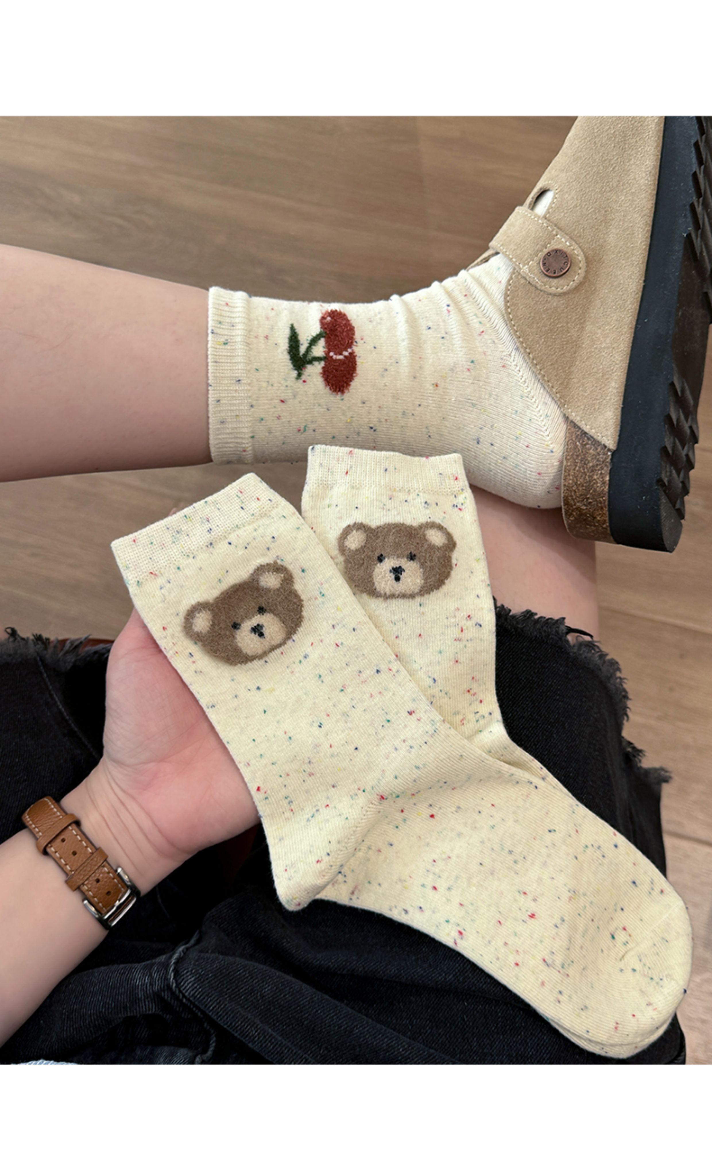 Cute Socks Women's Mid-Calf Socks Yarn Pure Cotton Spring & Fall Bear ins Trendy Korean Cartoon Japanese Style Colorful Dots Winter