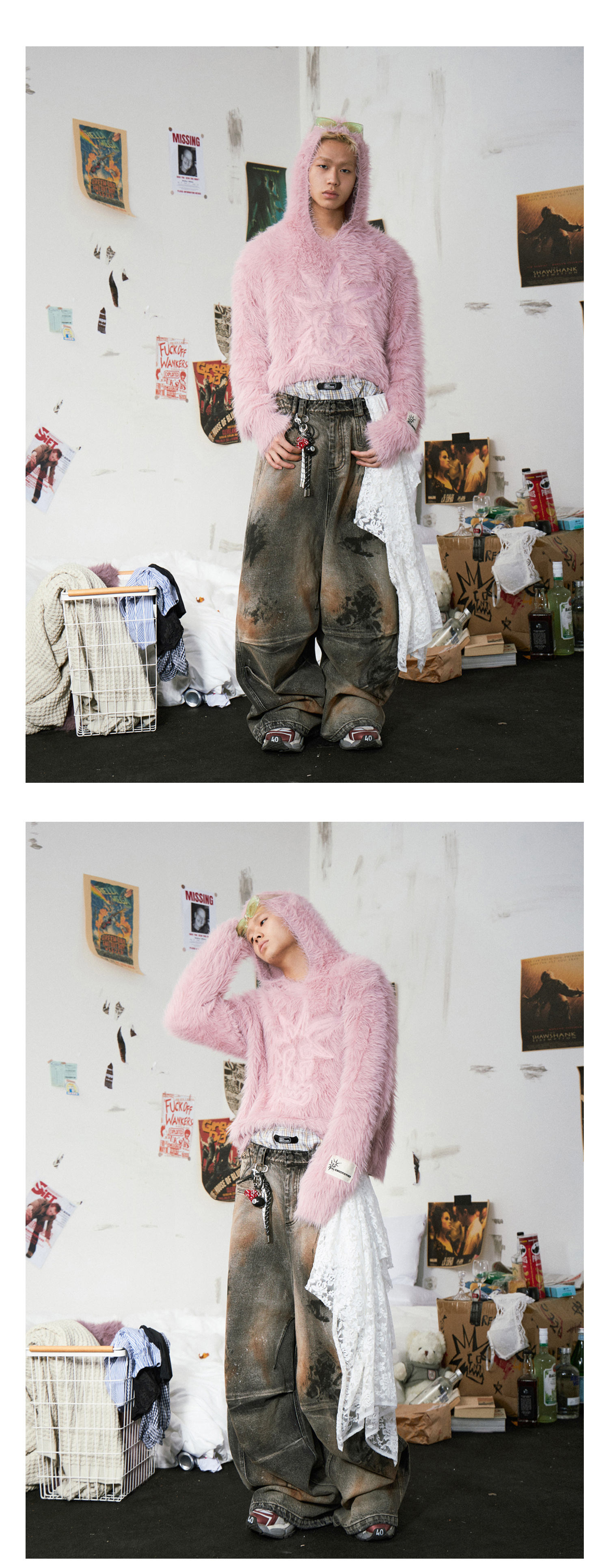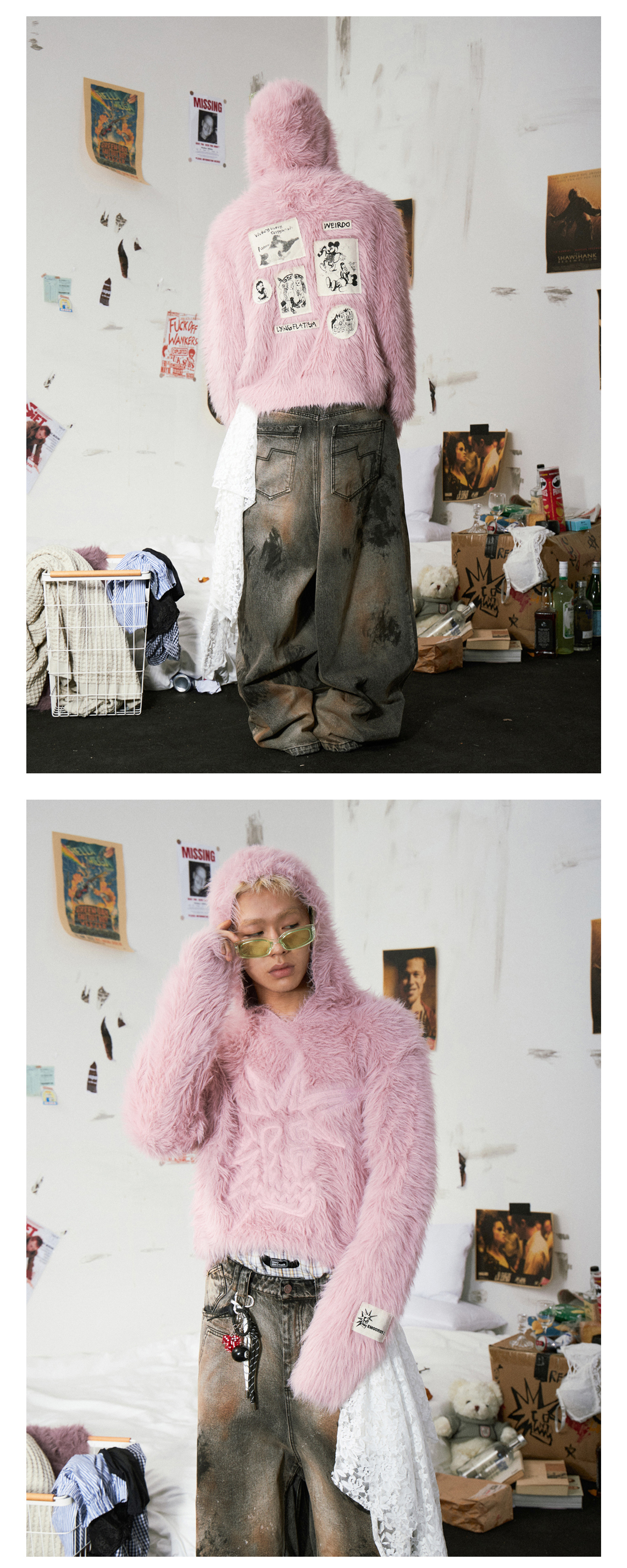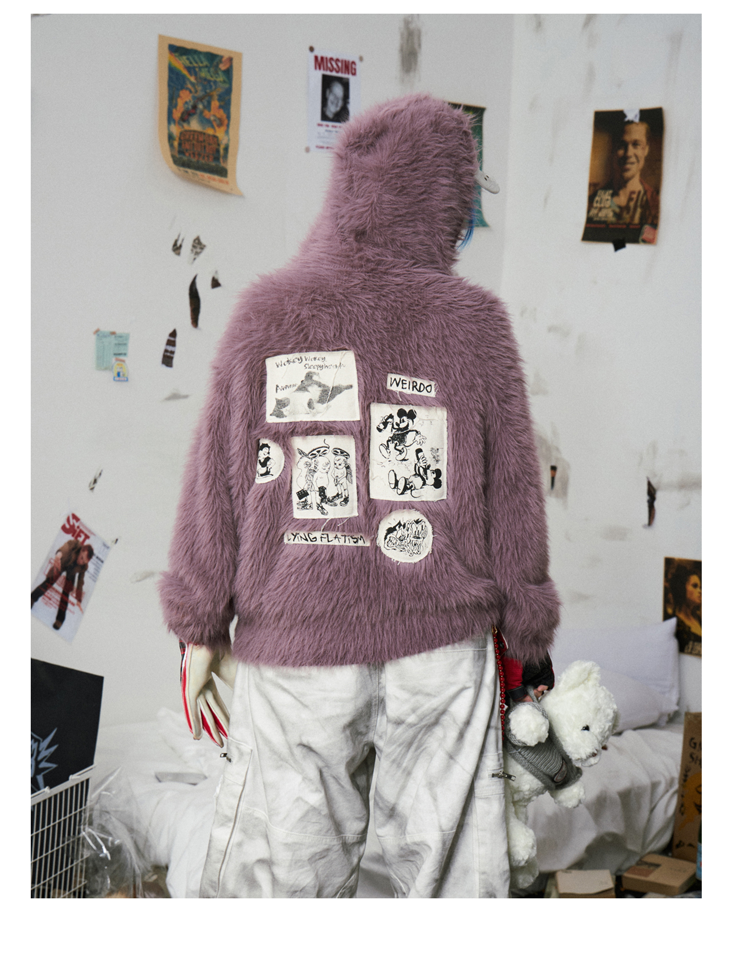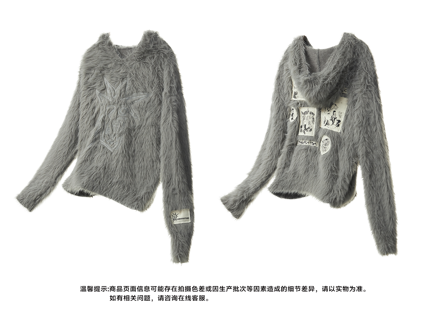 Emobrother* Logo Embroidered Hooded Faux Mink Knit Sweater with Band Patch, Soft and Warm Top