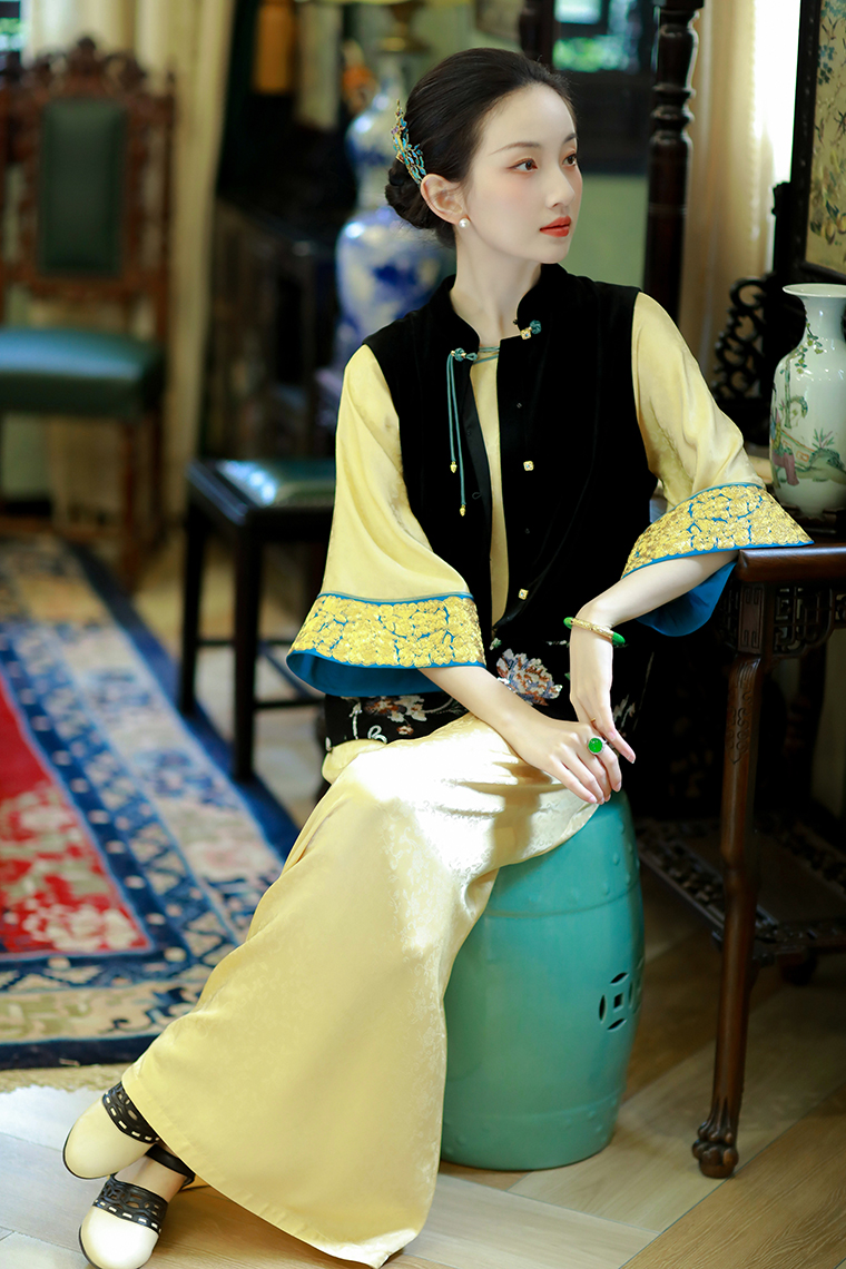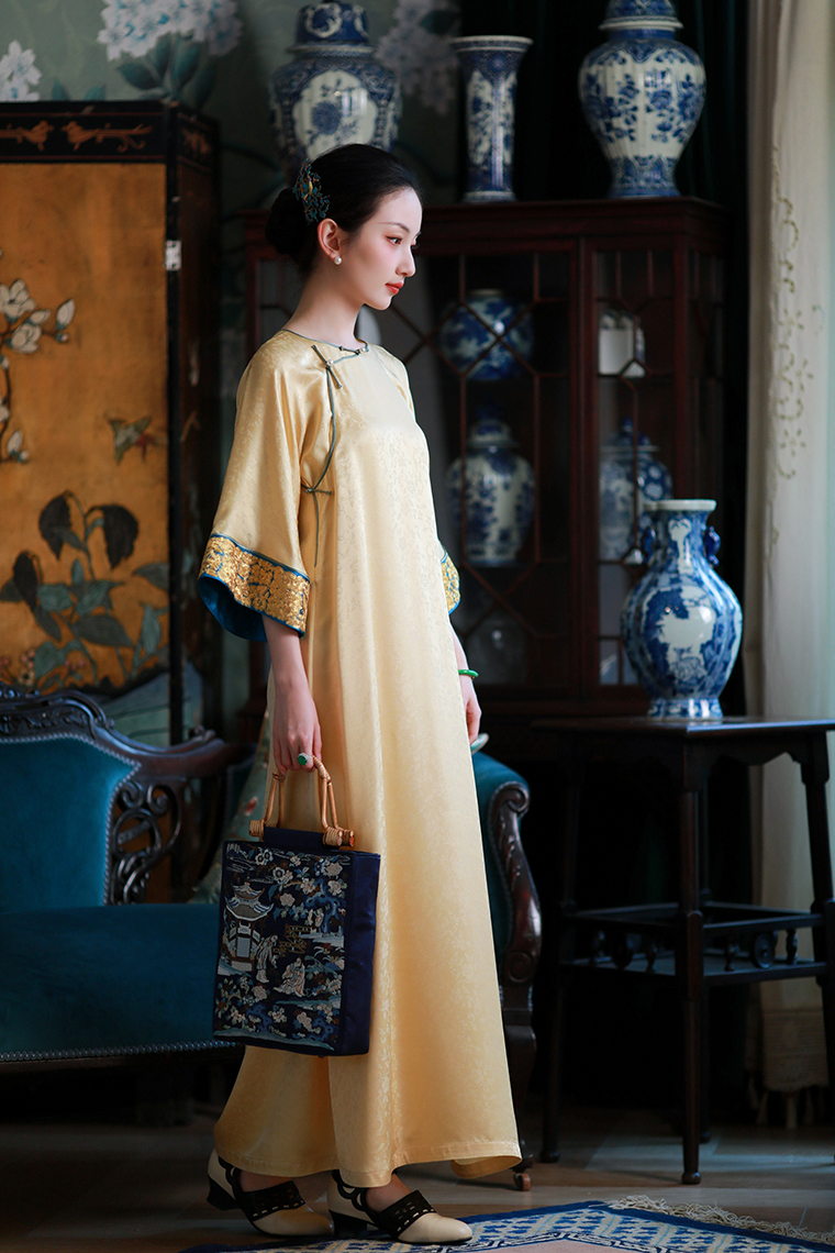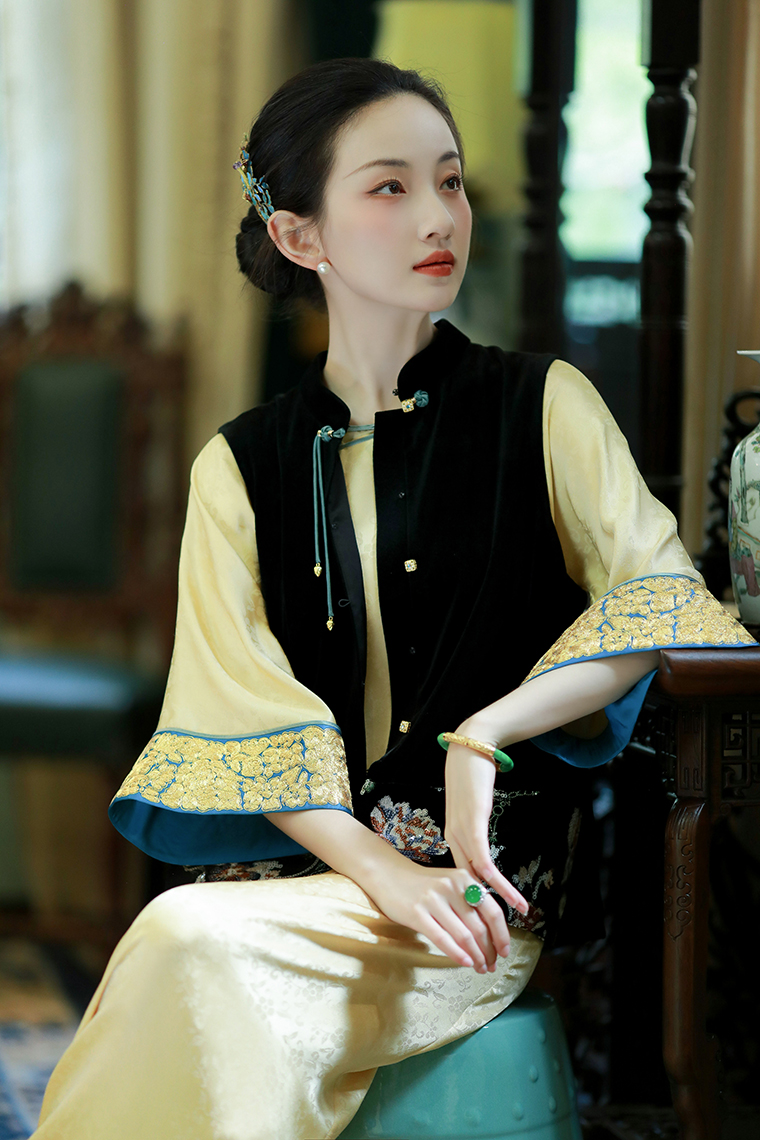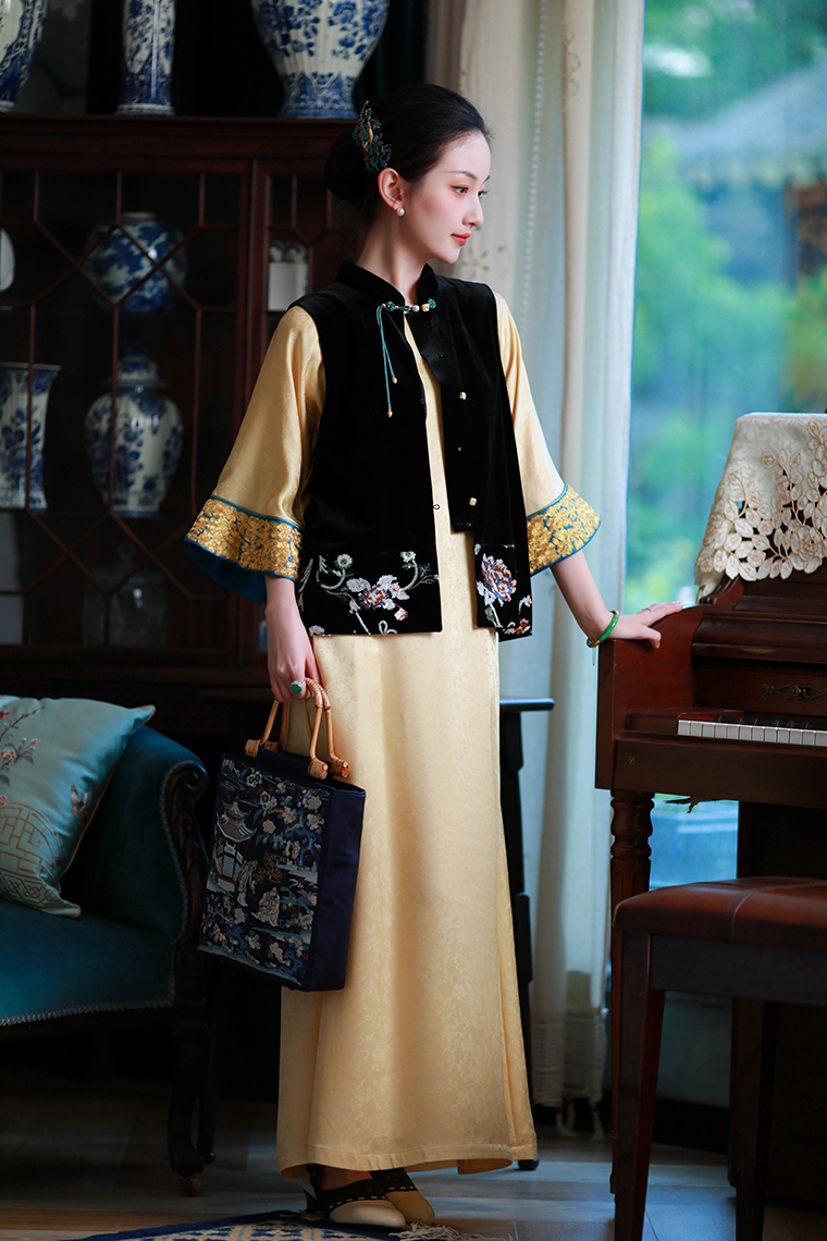 Golden Embroidery on a Silk Jacquard Satin | Spring/Summer Chinese Style Wide Sleeveless Collarless Cheongsam