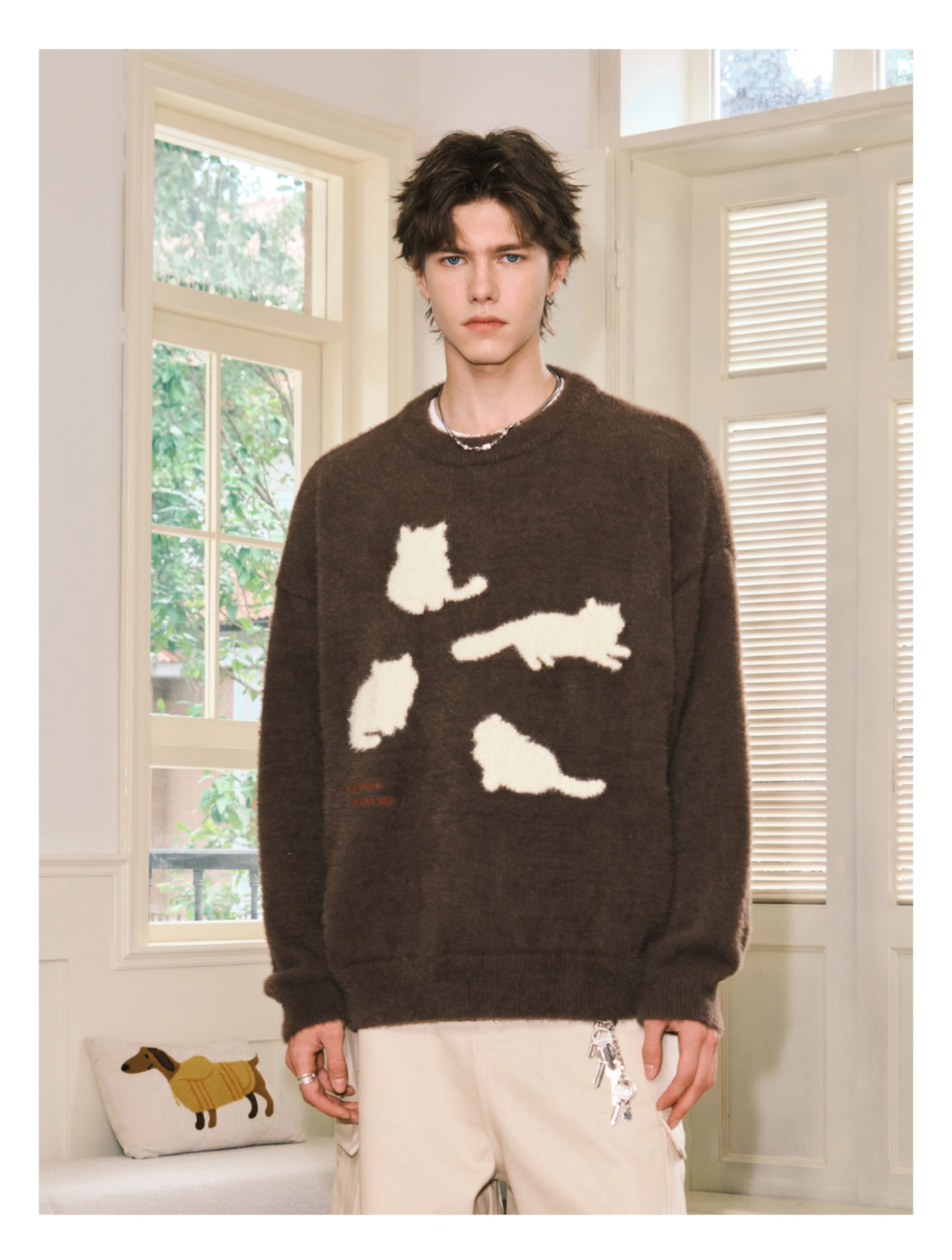 Nartaliy Cat Silhouette Sweater for Men and Women, Autumn and Winter Trendy American Retro Loose Lazy Soft Knitwear