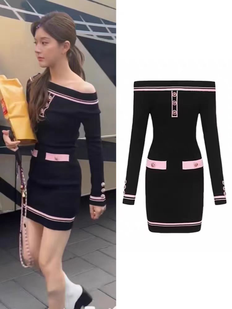Zhao Lusi's Same Style French Niche Black Off-Shoulder Knitted Dress, Feminine, Slim-Fitting, Bodycon Mini Skirt 2025